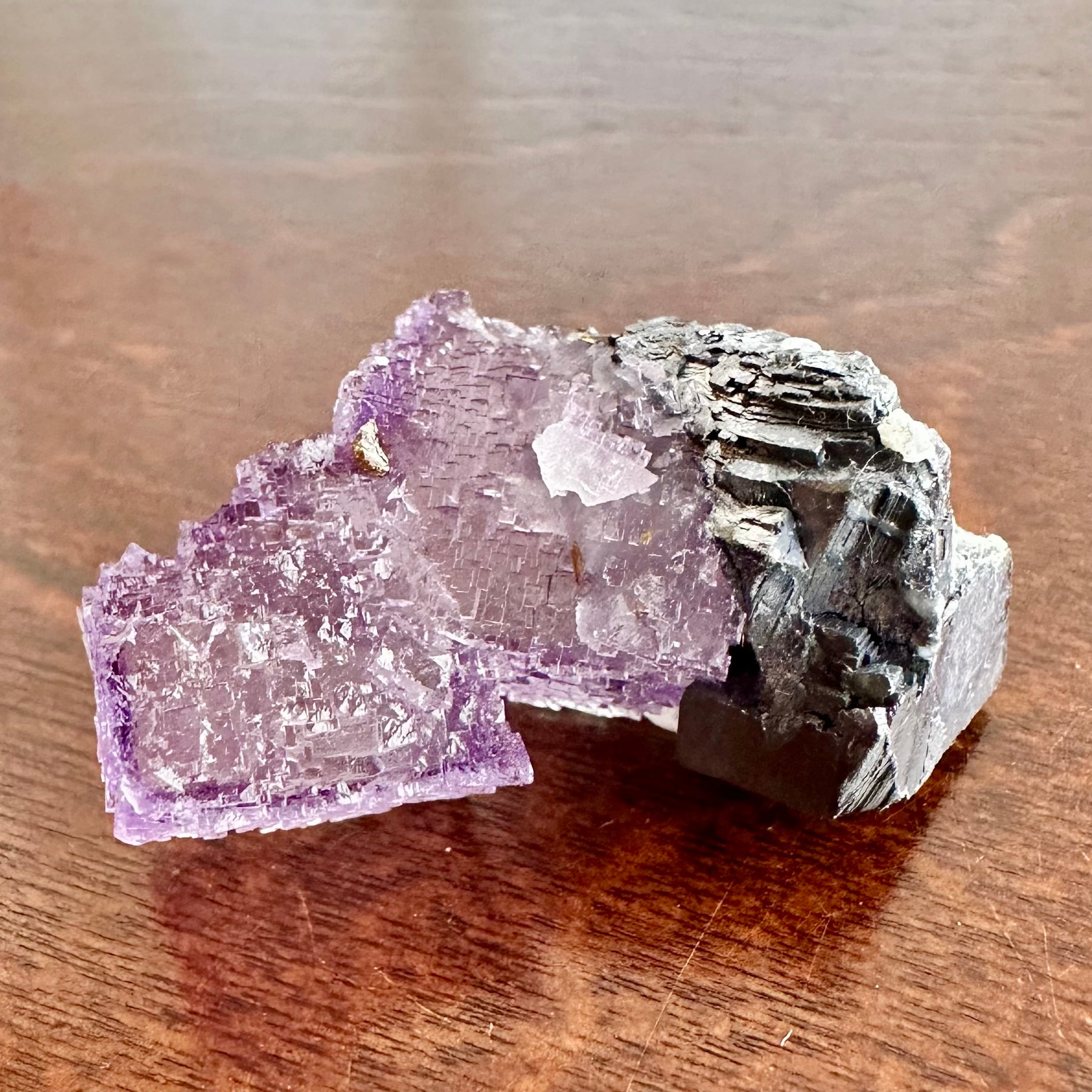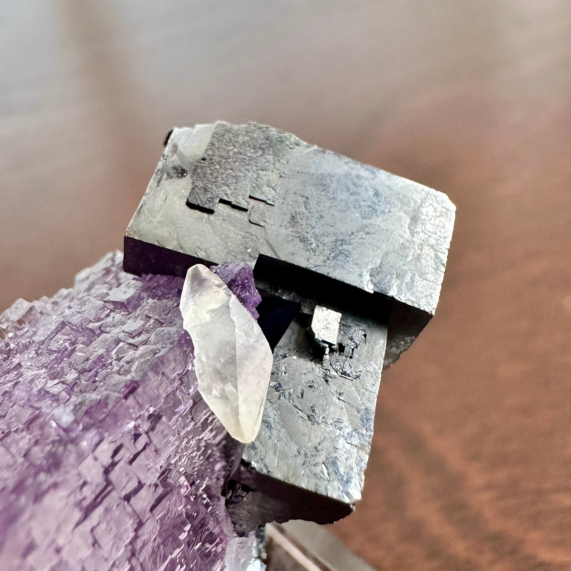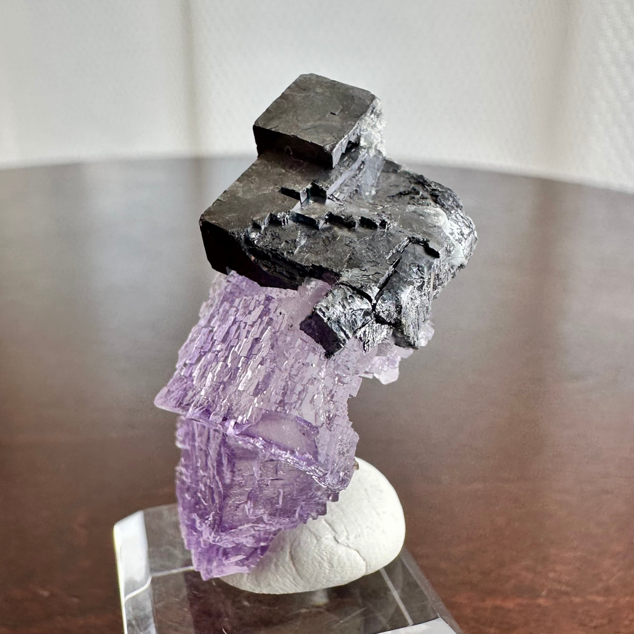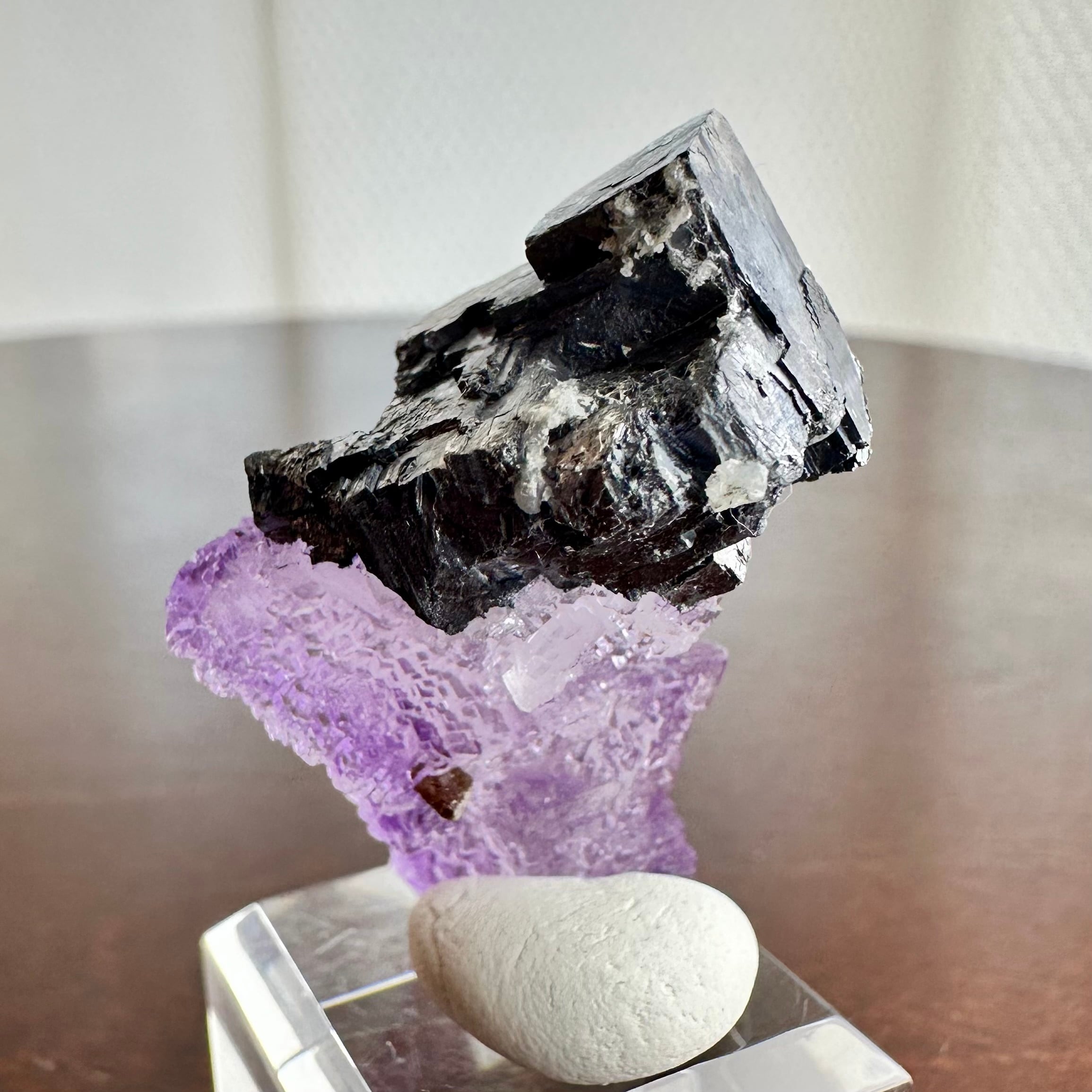 エッジの部分が濃いパープル、内部は淡いパープルのフローライトが連なり、そこに同じようなサイズ感のガレナが組み合わさったフォルムはユニークで、画像のように横向きでも縦長に置いても美しい景色が楽しめます。