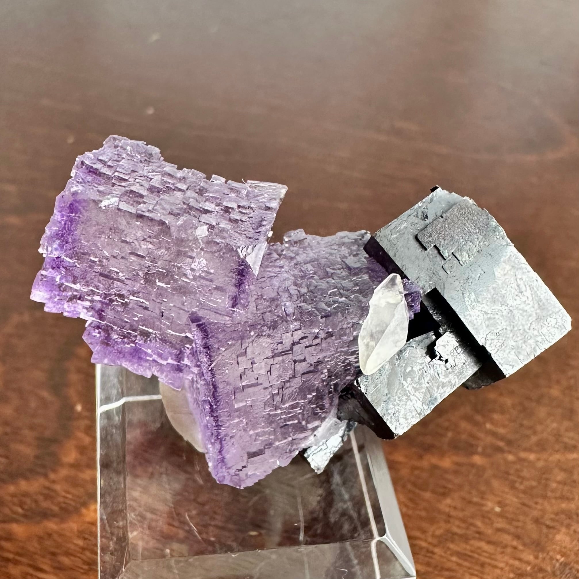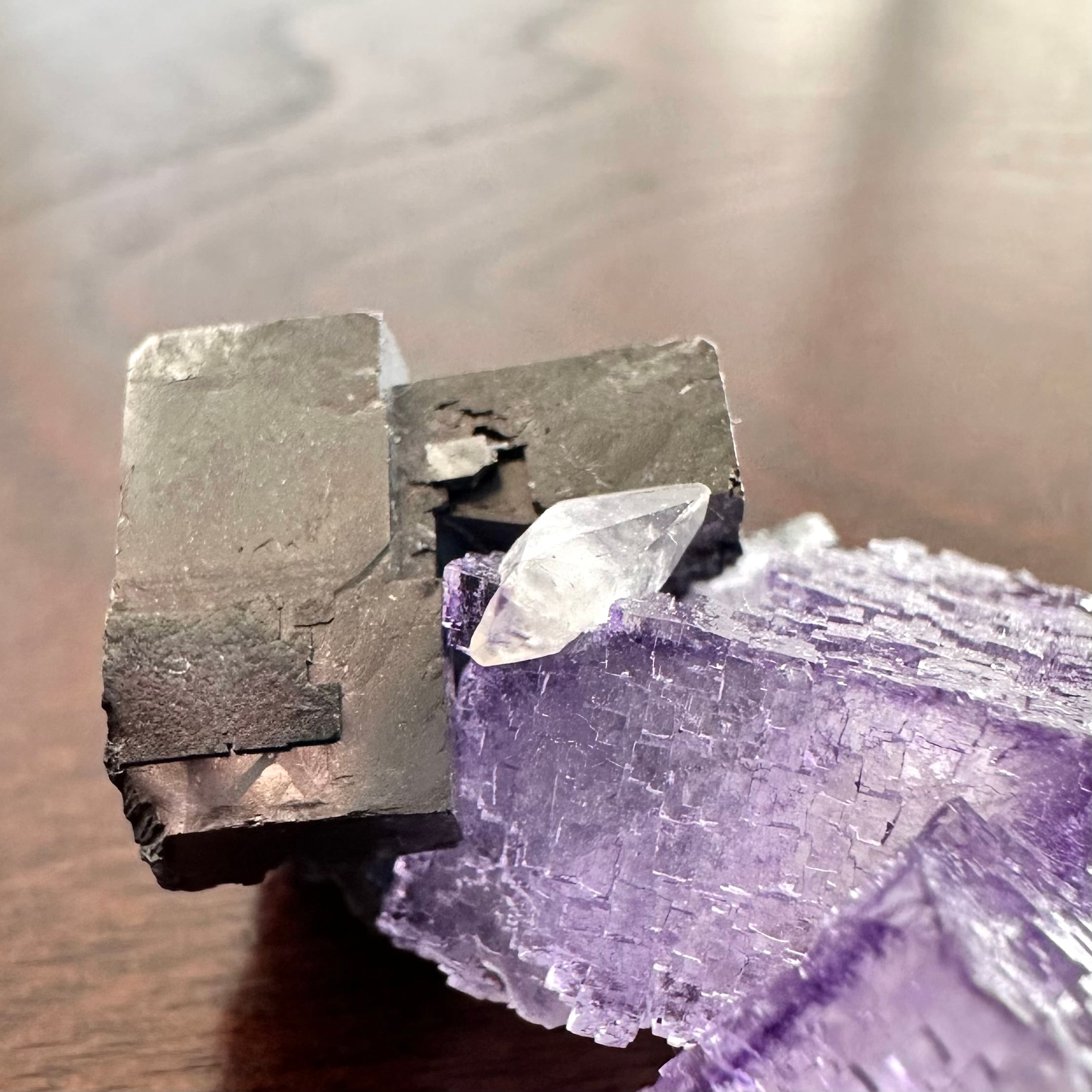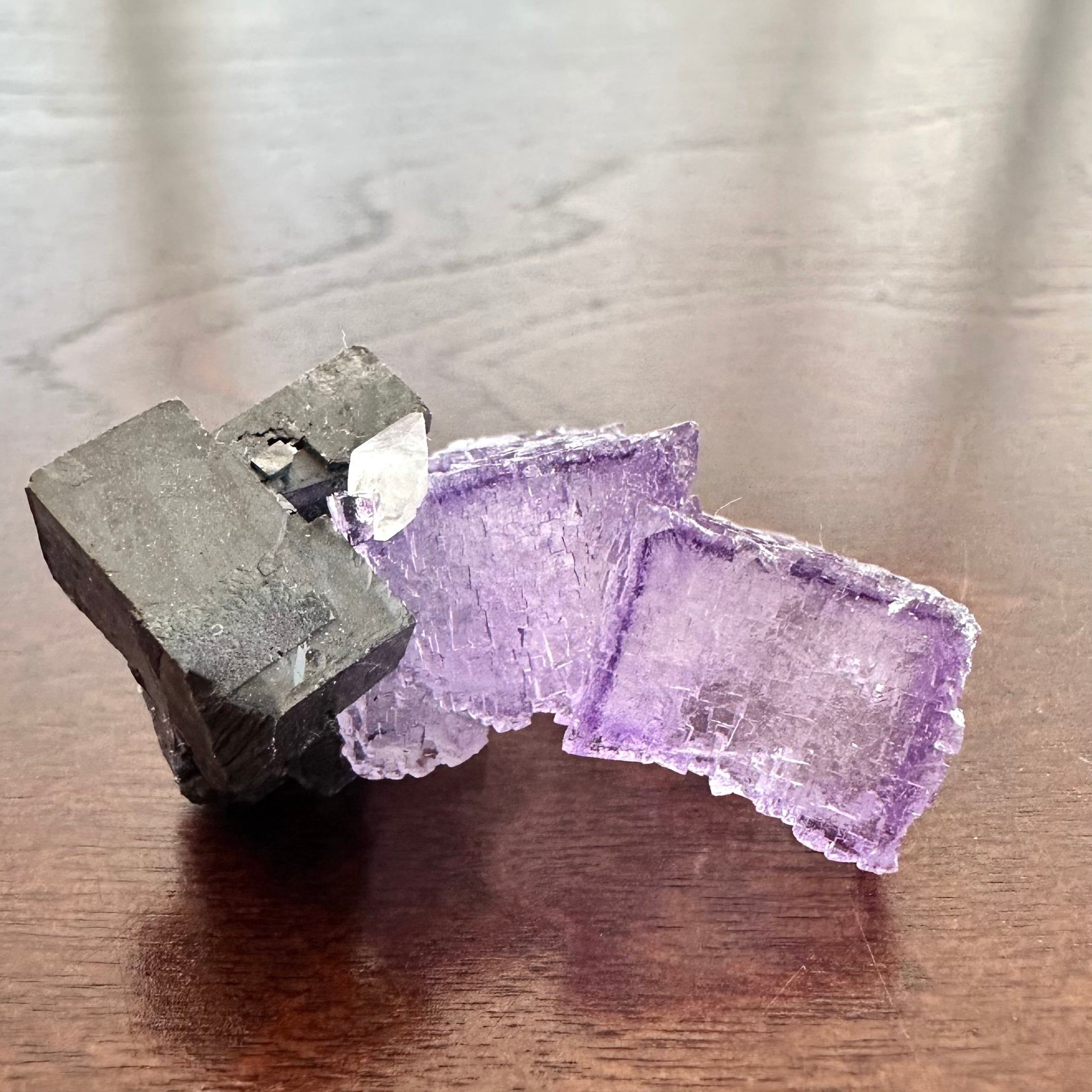 エッジの部分が濃いパープル、内部は淡いパープルのフローライトが連なり、そこに同じようなサイズ感のガレナが組み合わさったフォルムはユニークで、画像のように横向きでも縦長に置いても美しい景色が楽しめます。