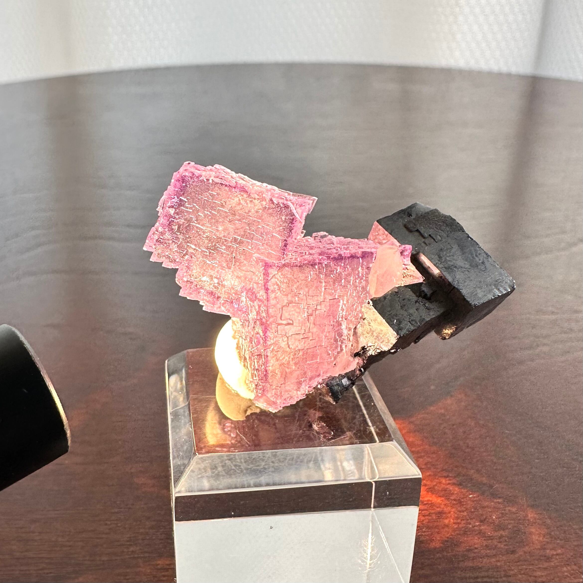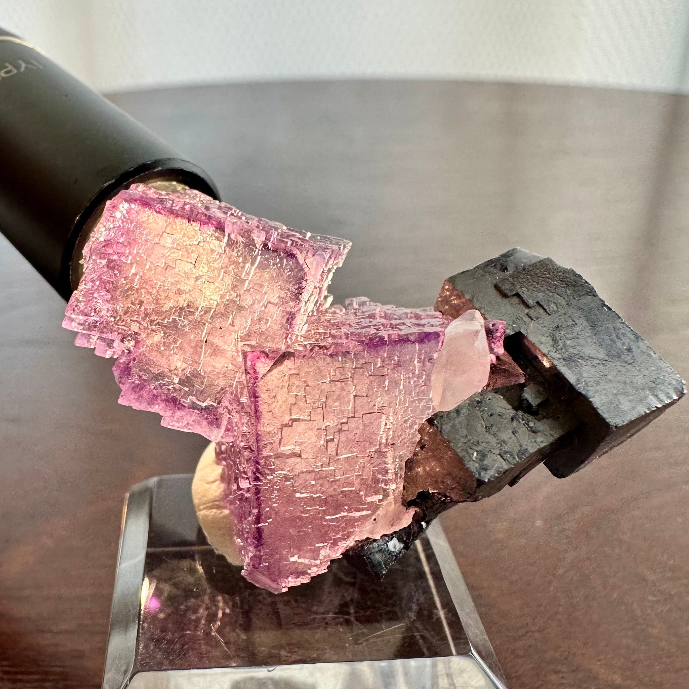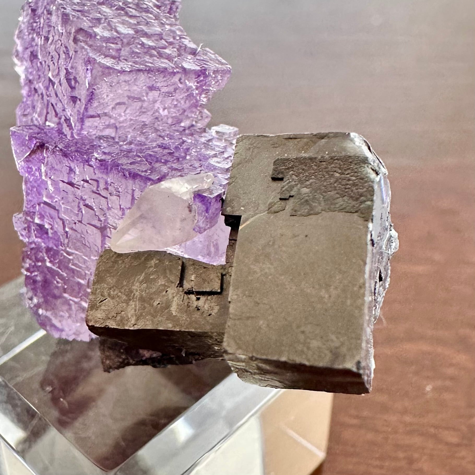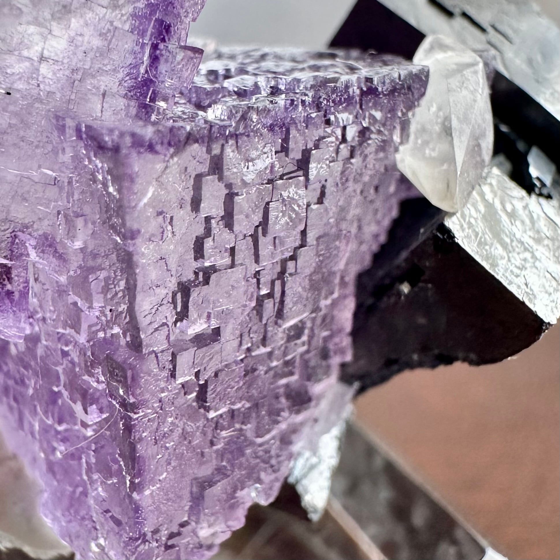 エッジの部分が濃いパープル、内部は淡いパープルのフローライトが連なり、そこに同じようなサイズ感のガレナが組み合わさったフォルムはユニークで、画像のように横向きでも縦長に置いても美しい景色が楽しめます。