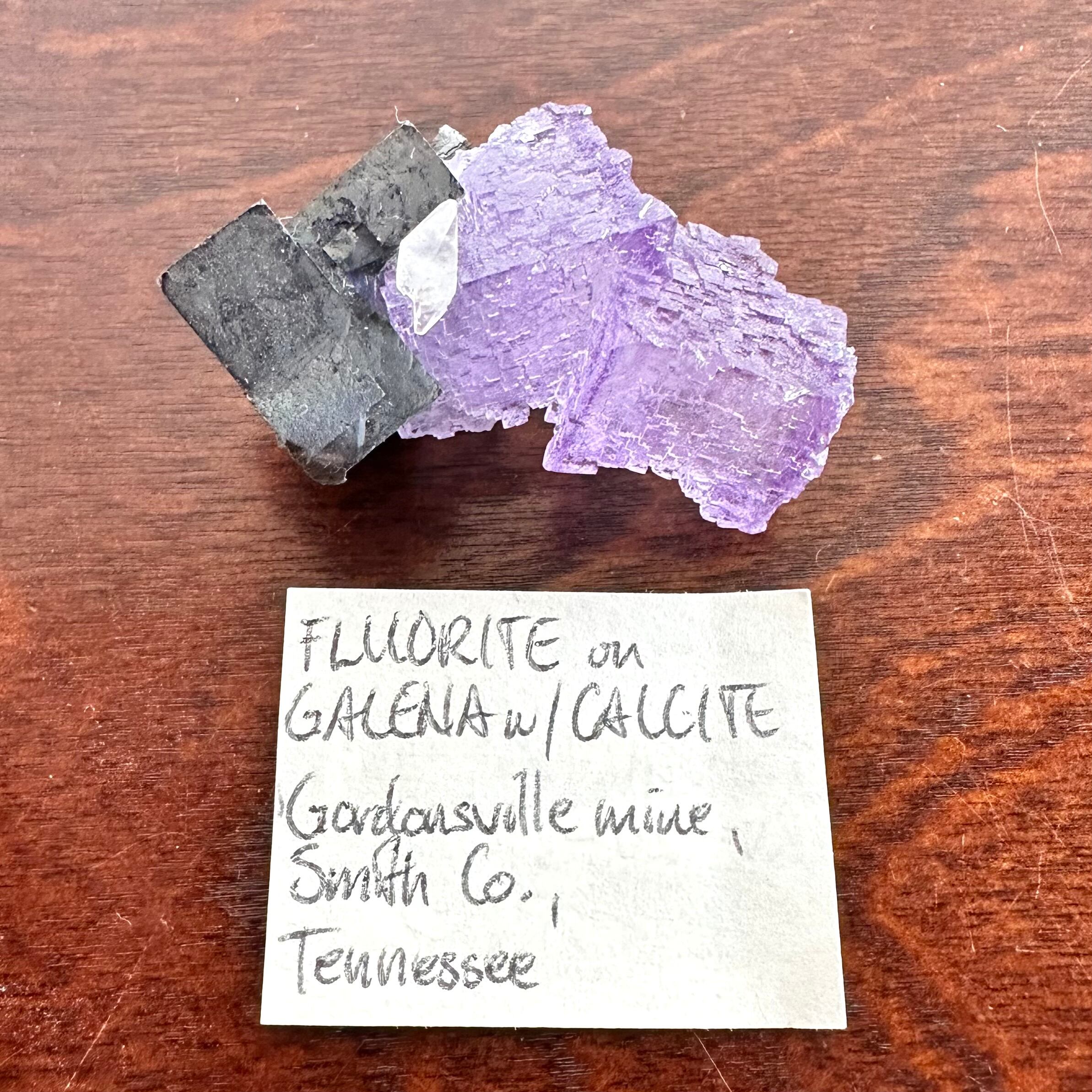 パープルのフローライトとガレナのコンビネーションです、小さく整ったカルサイトも見られます。