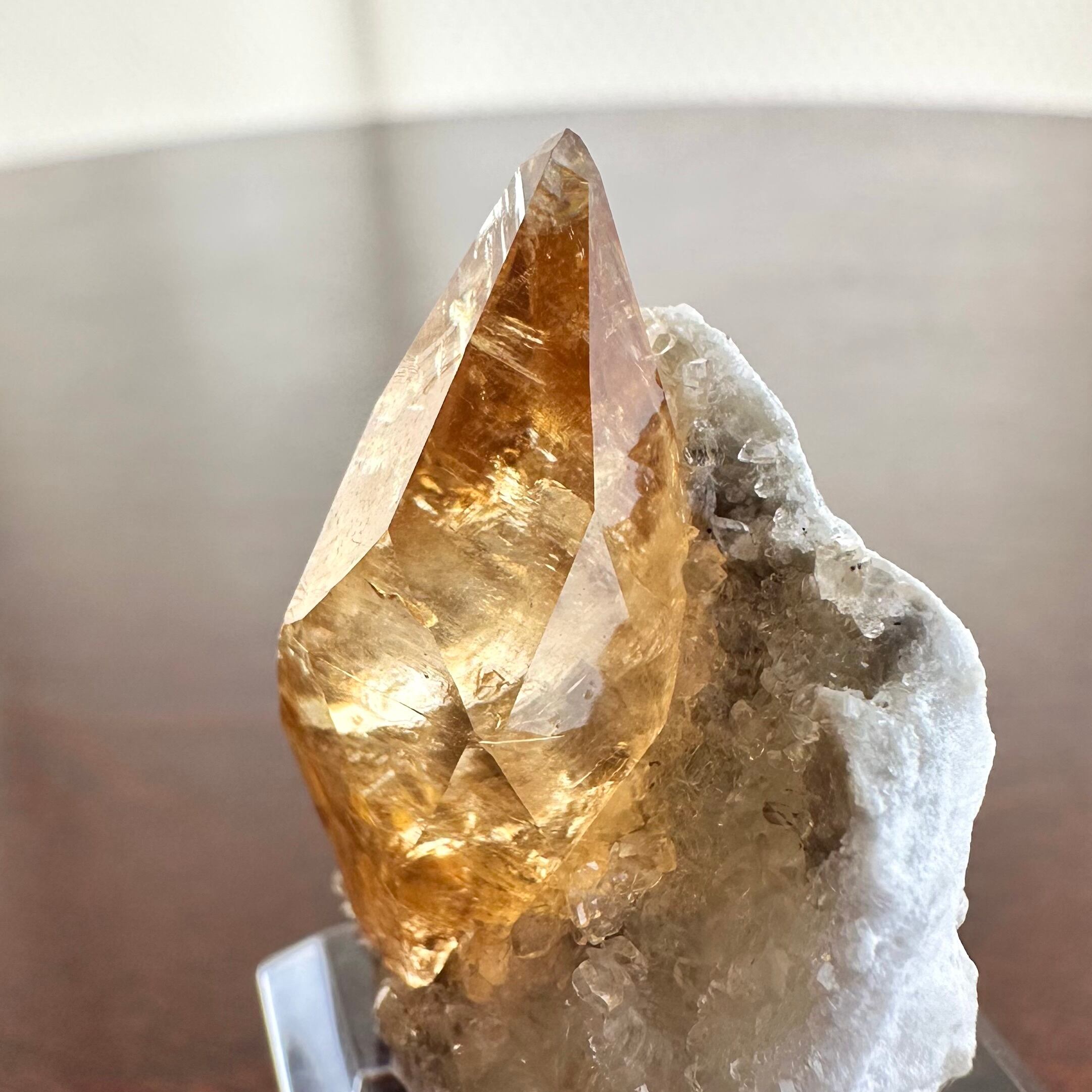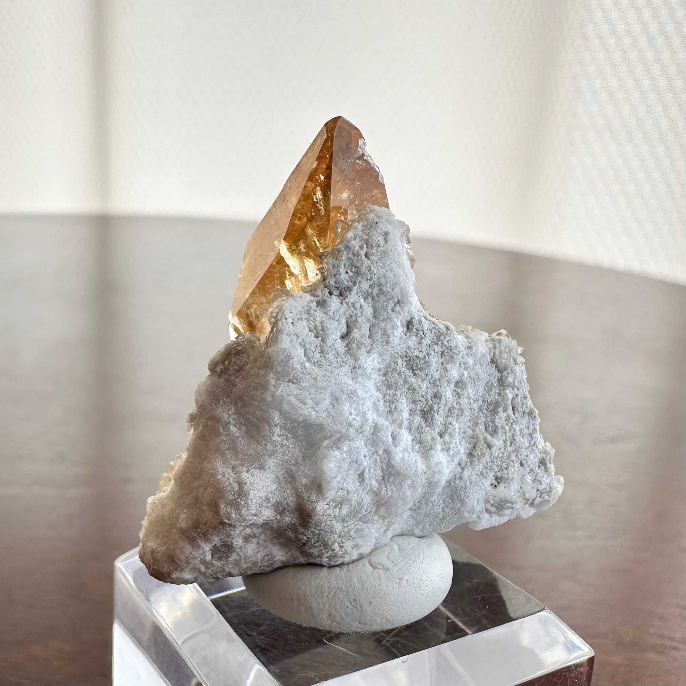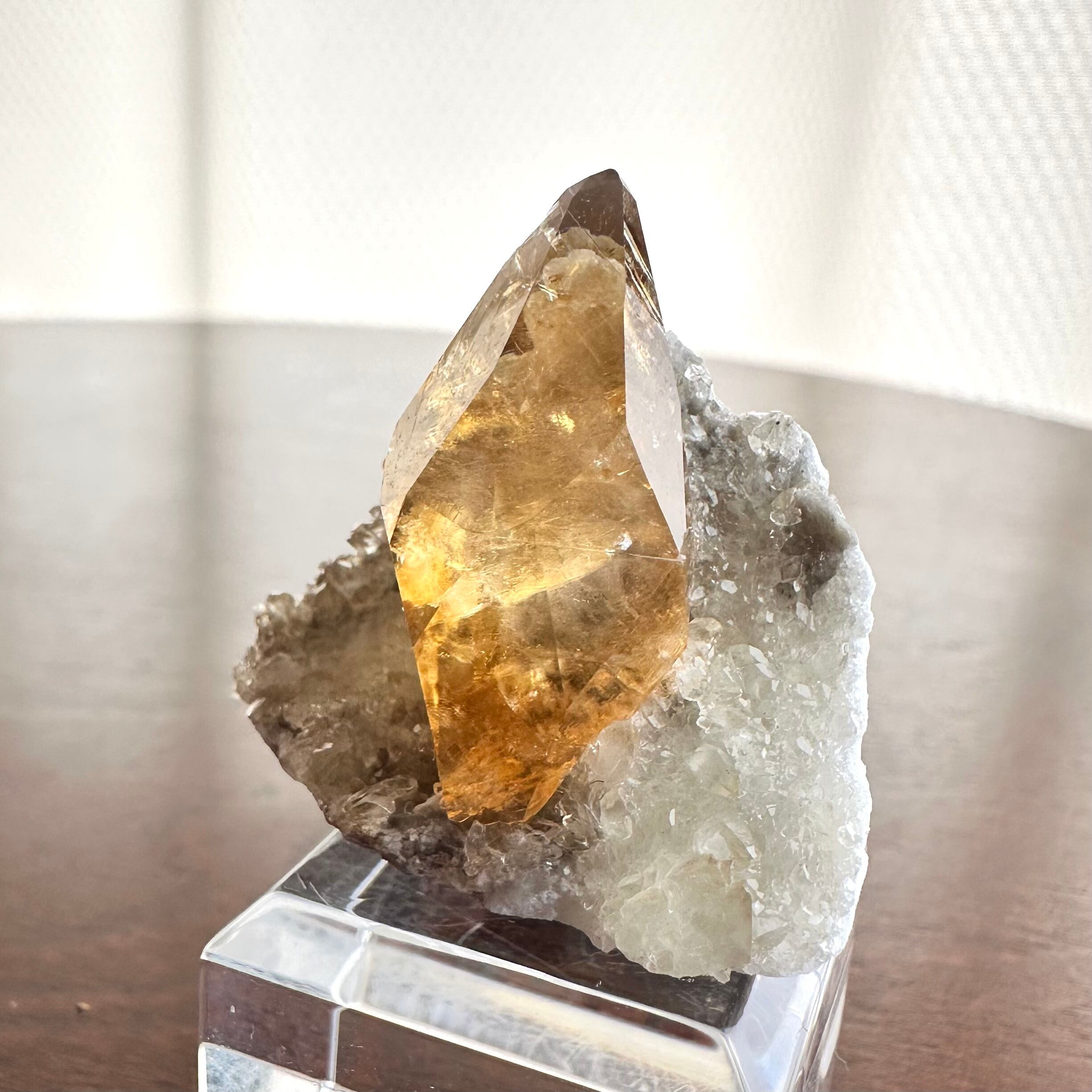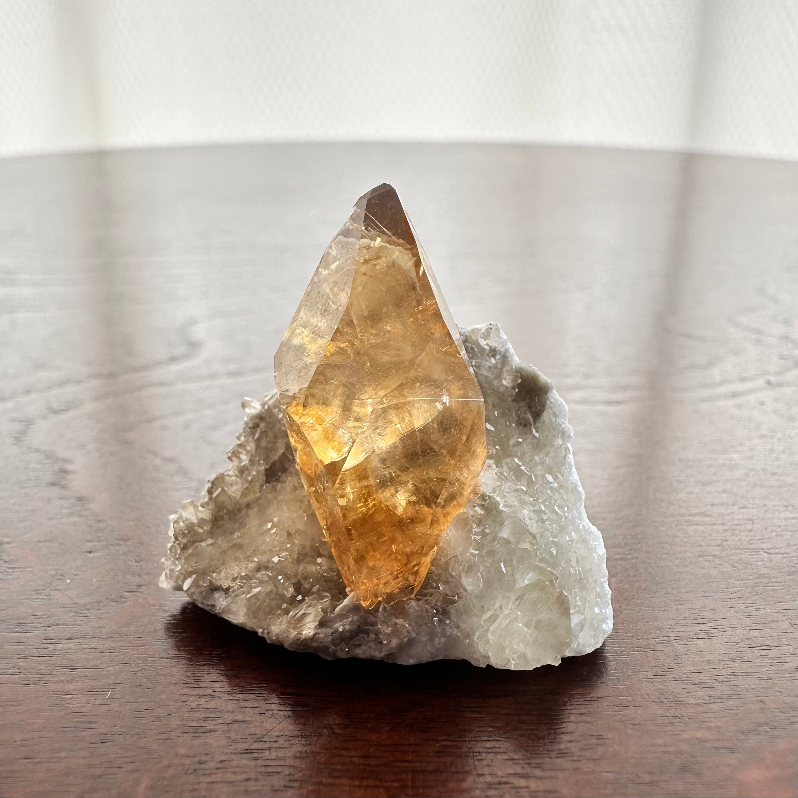 母岩部分を台座にするかの様な標本で、縦にすっと伸びる両錐のカルサイトが美しいフォルムを生み出しています。