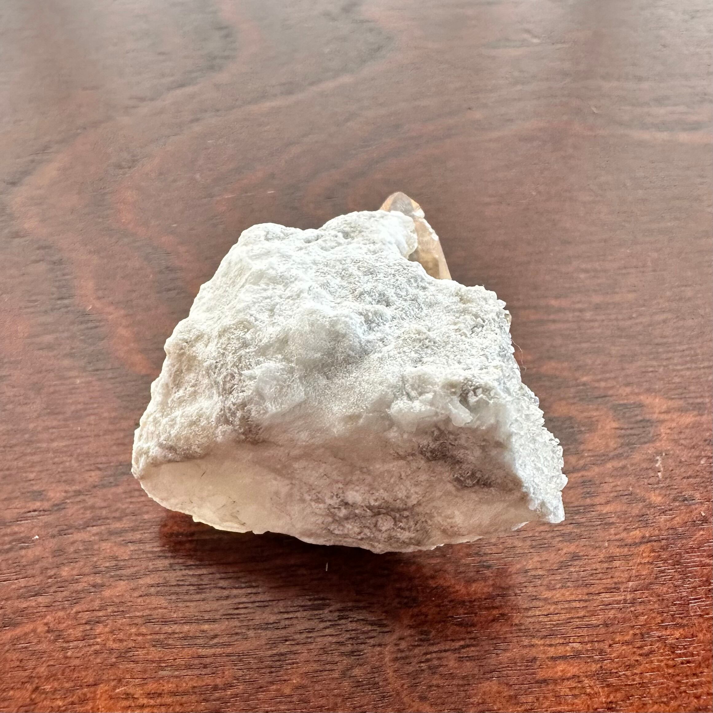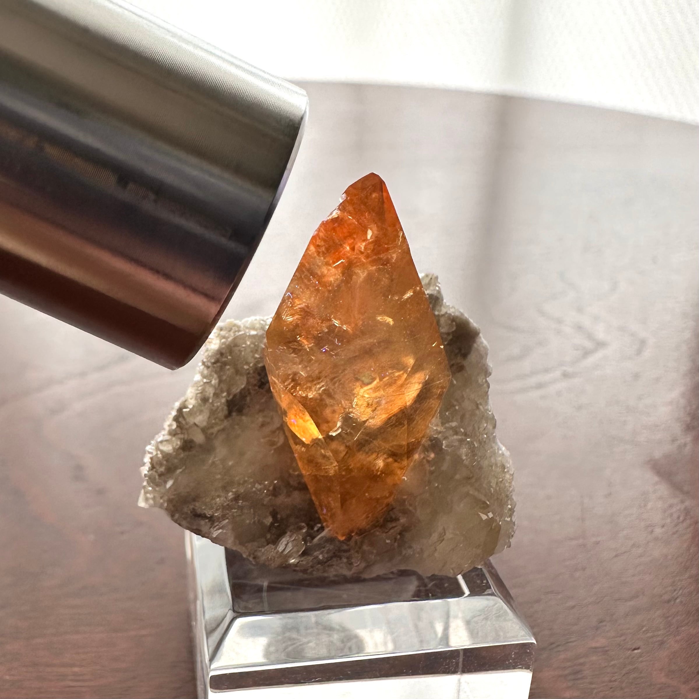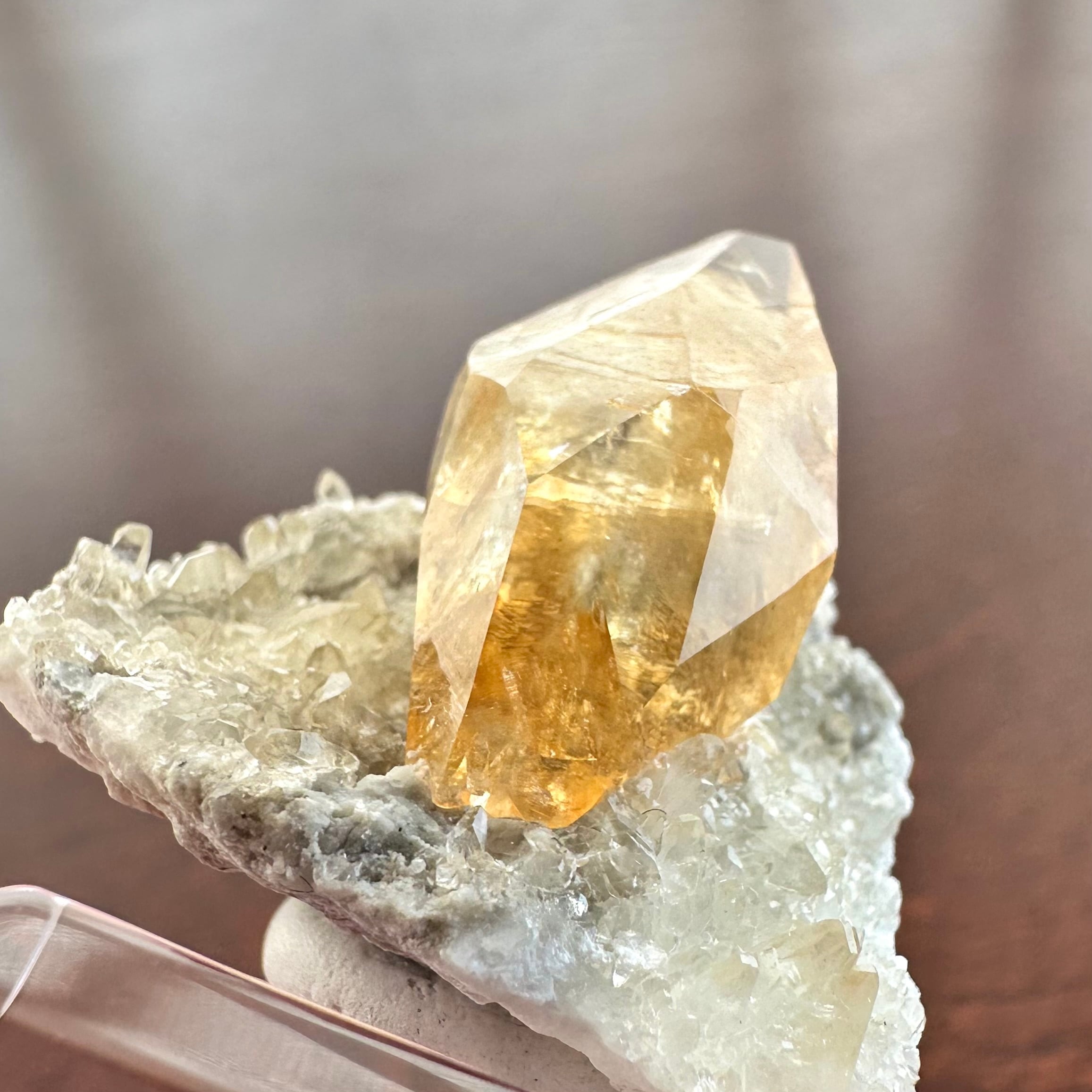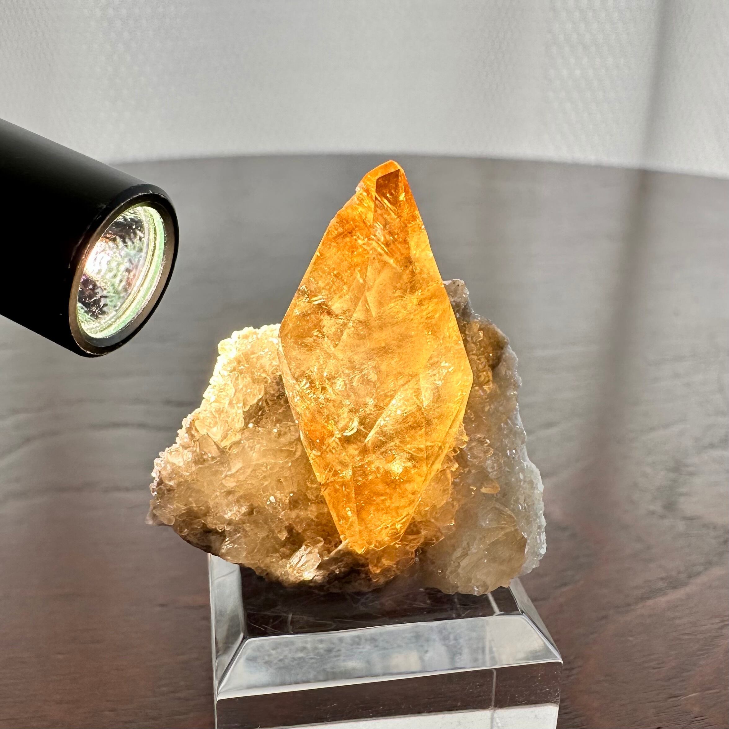 母岩部分を台座にするかの様な標本で、縦にすっと伸びる両錐のカルサイトが美しいフォルムを生み出しています。