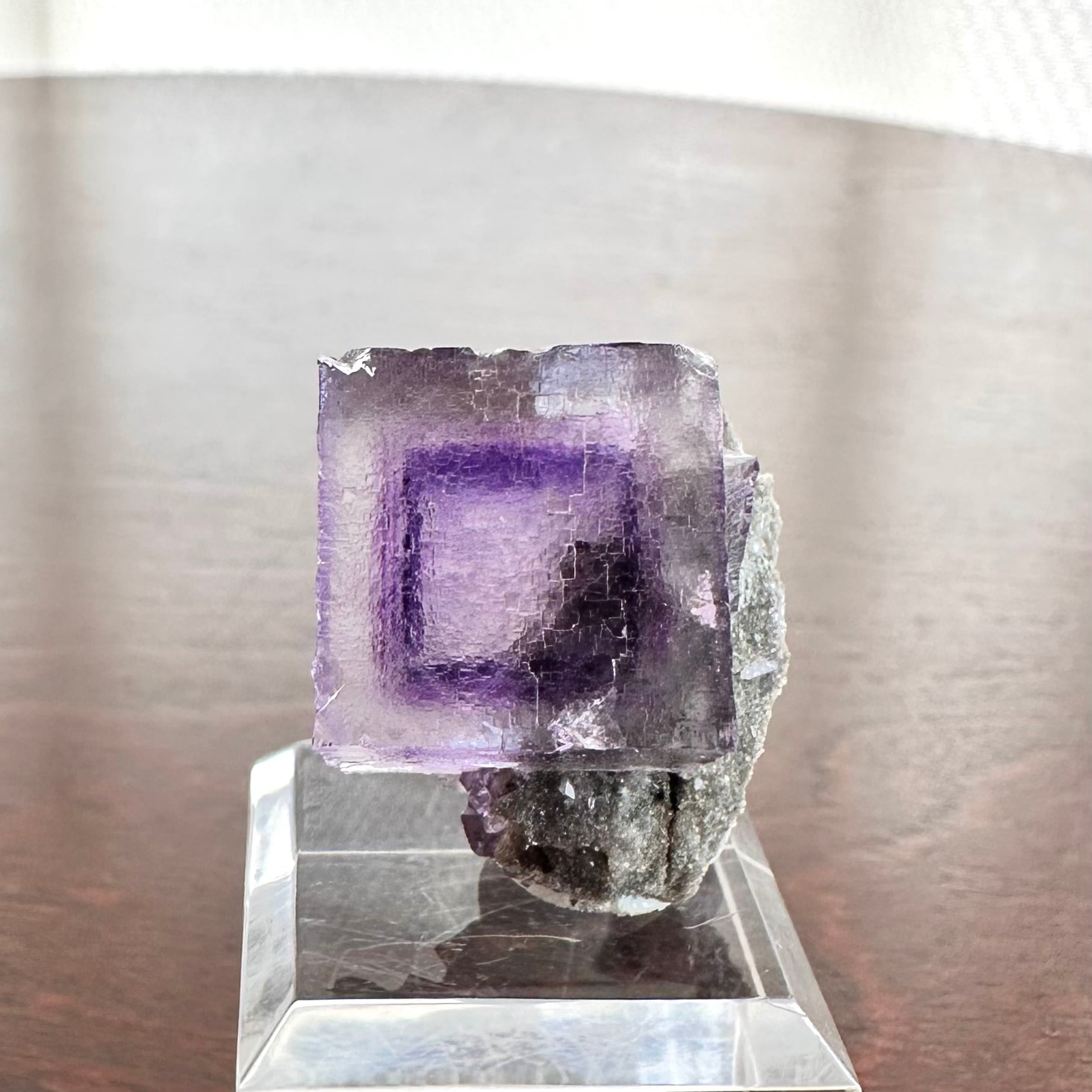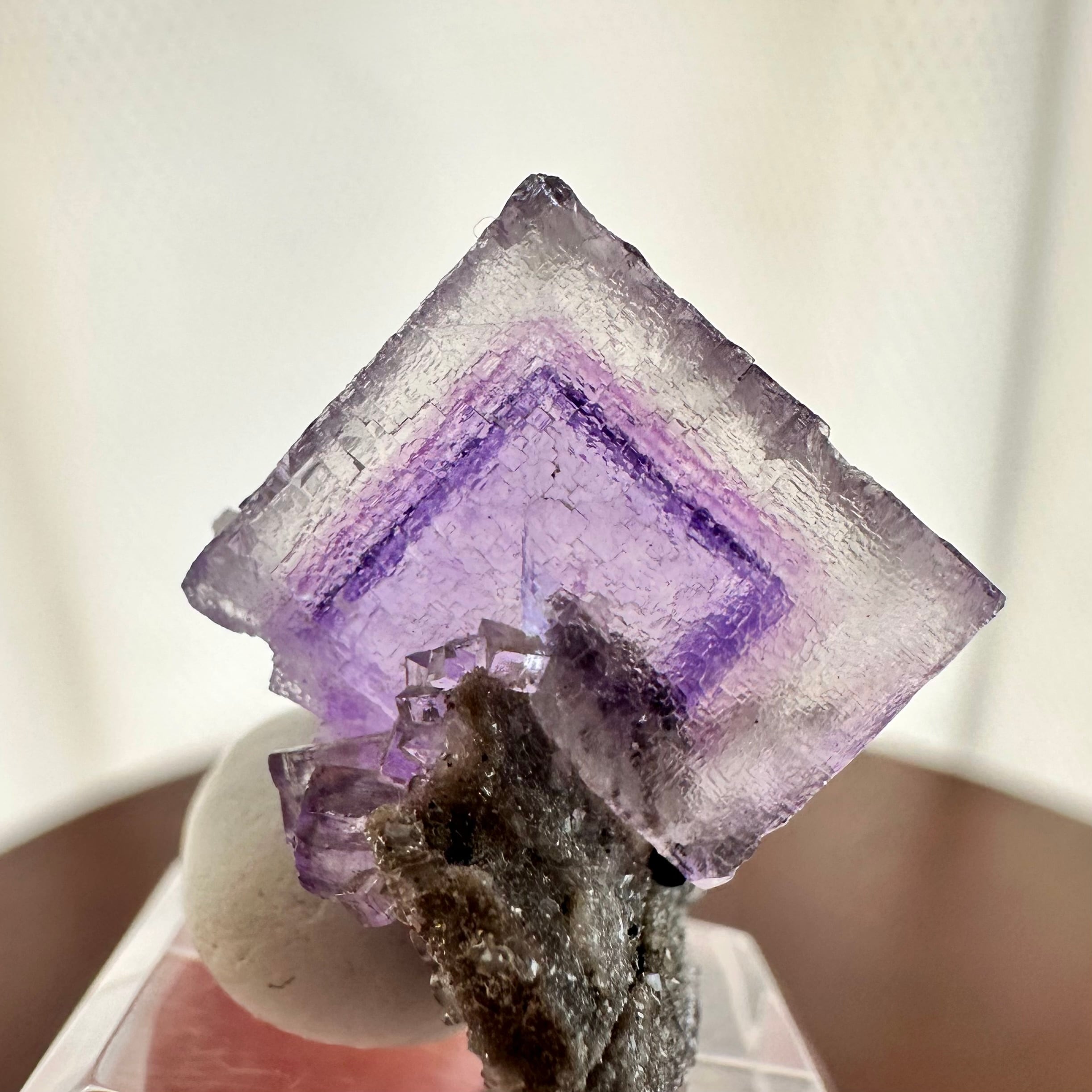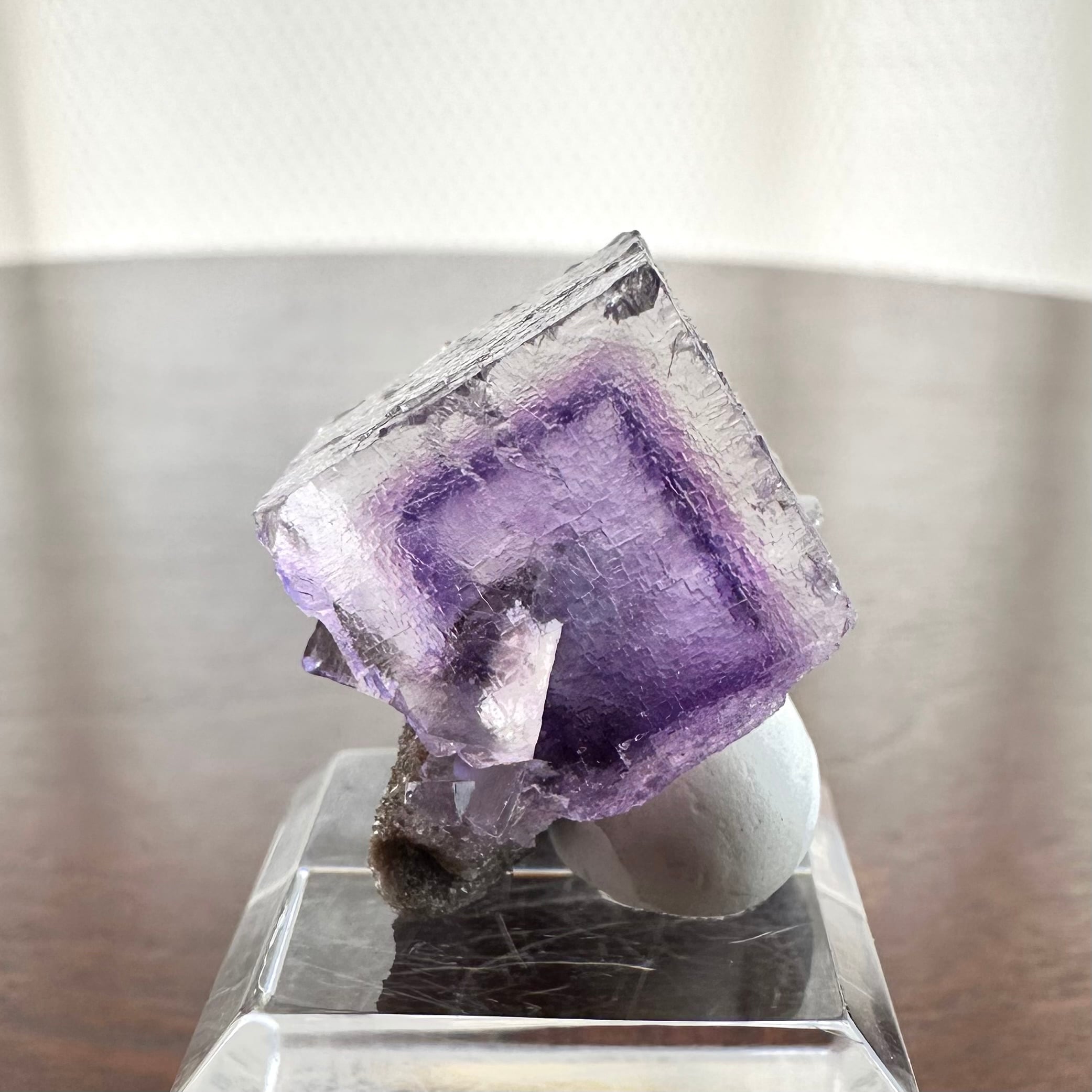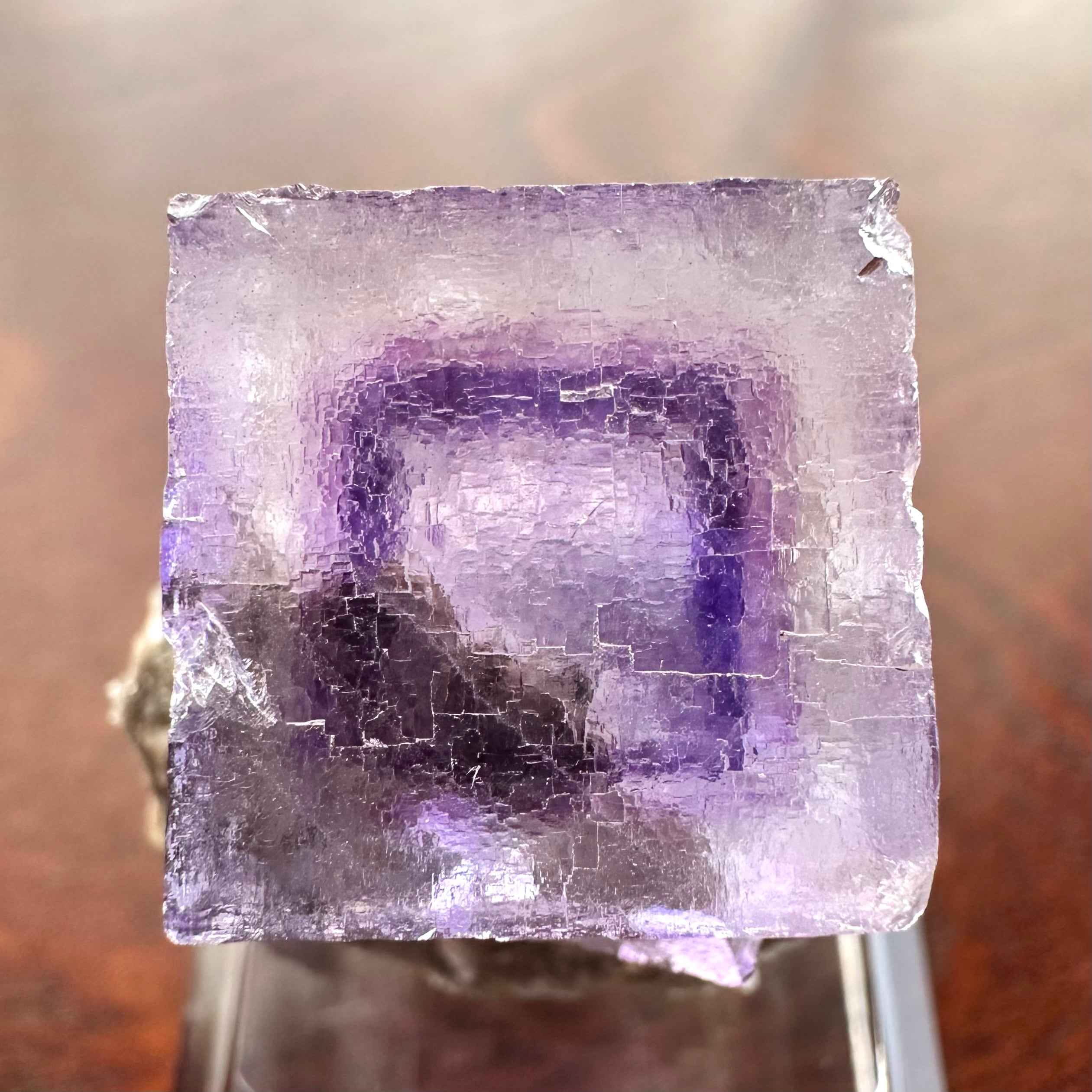 強烈なゾーニングが印象的な、Elmwood Mine産のフローライトです、どの角度から覗き込んでもハッキリと見えます。