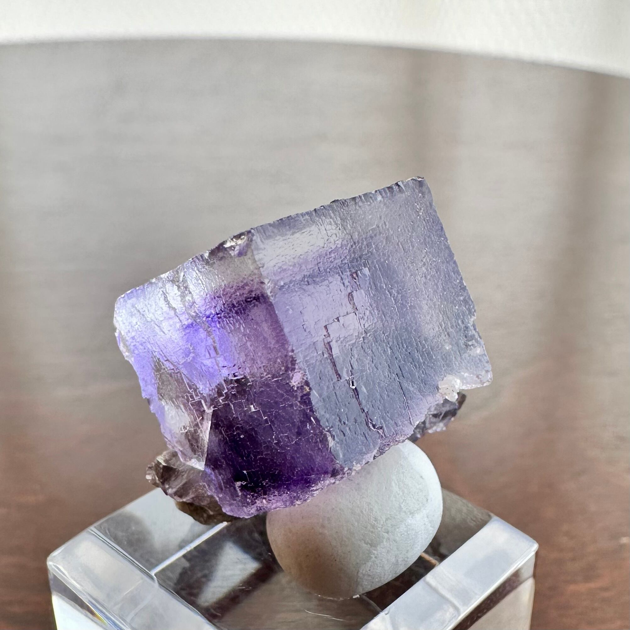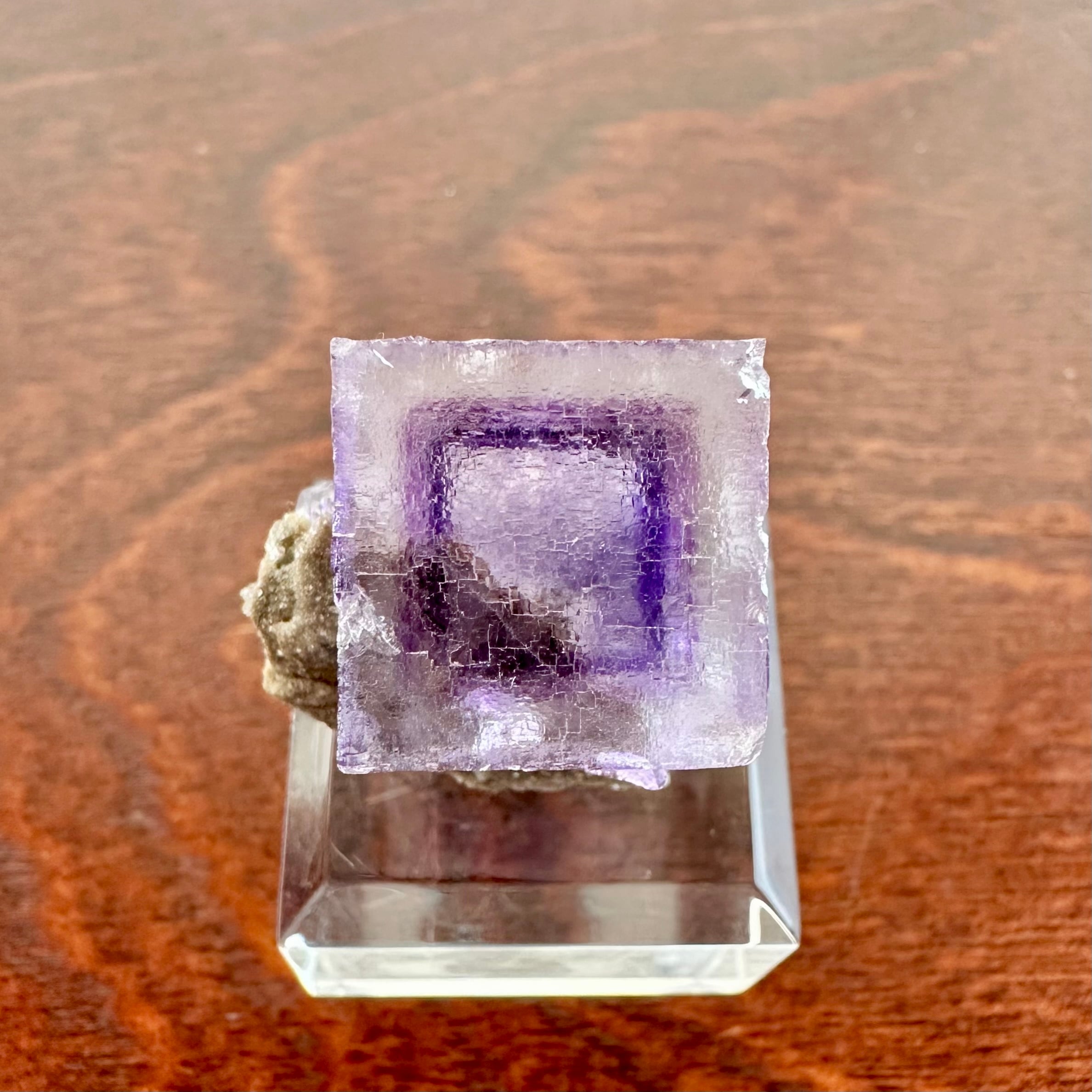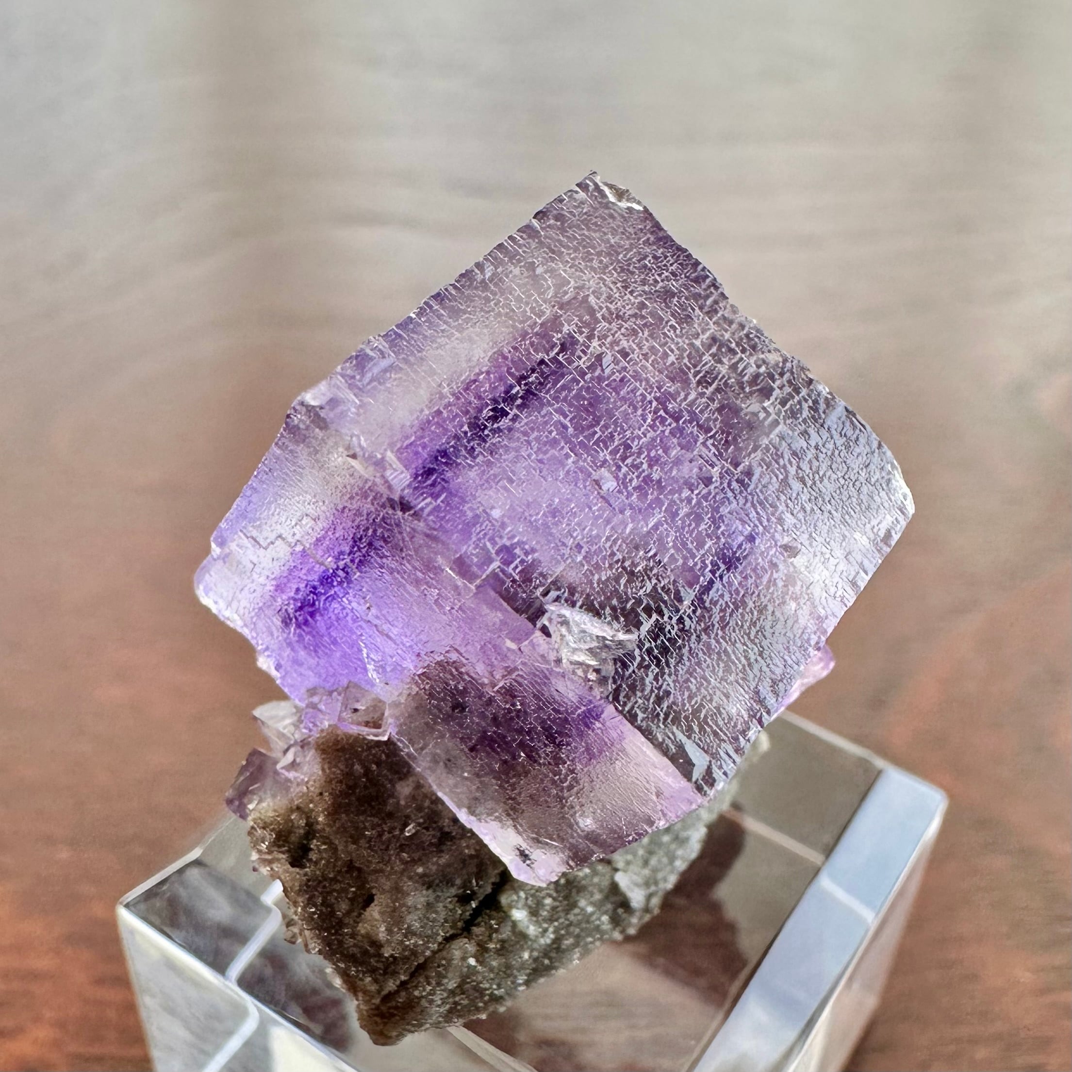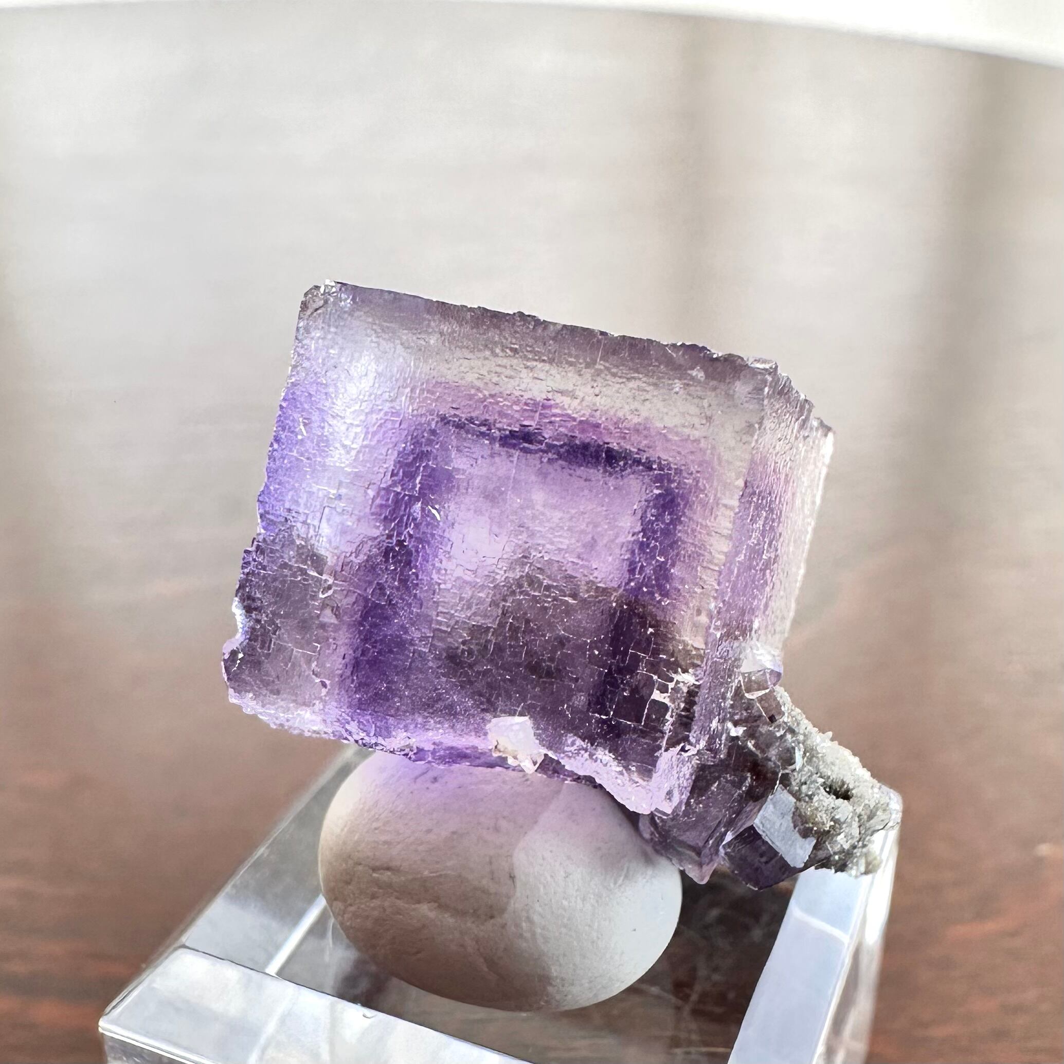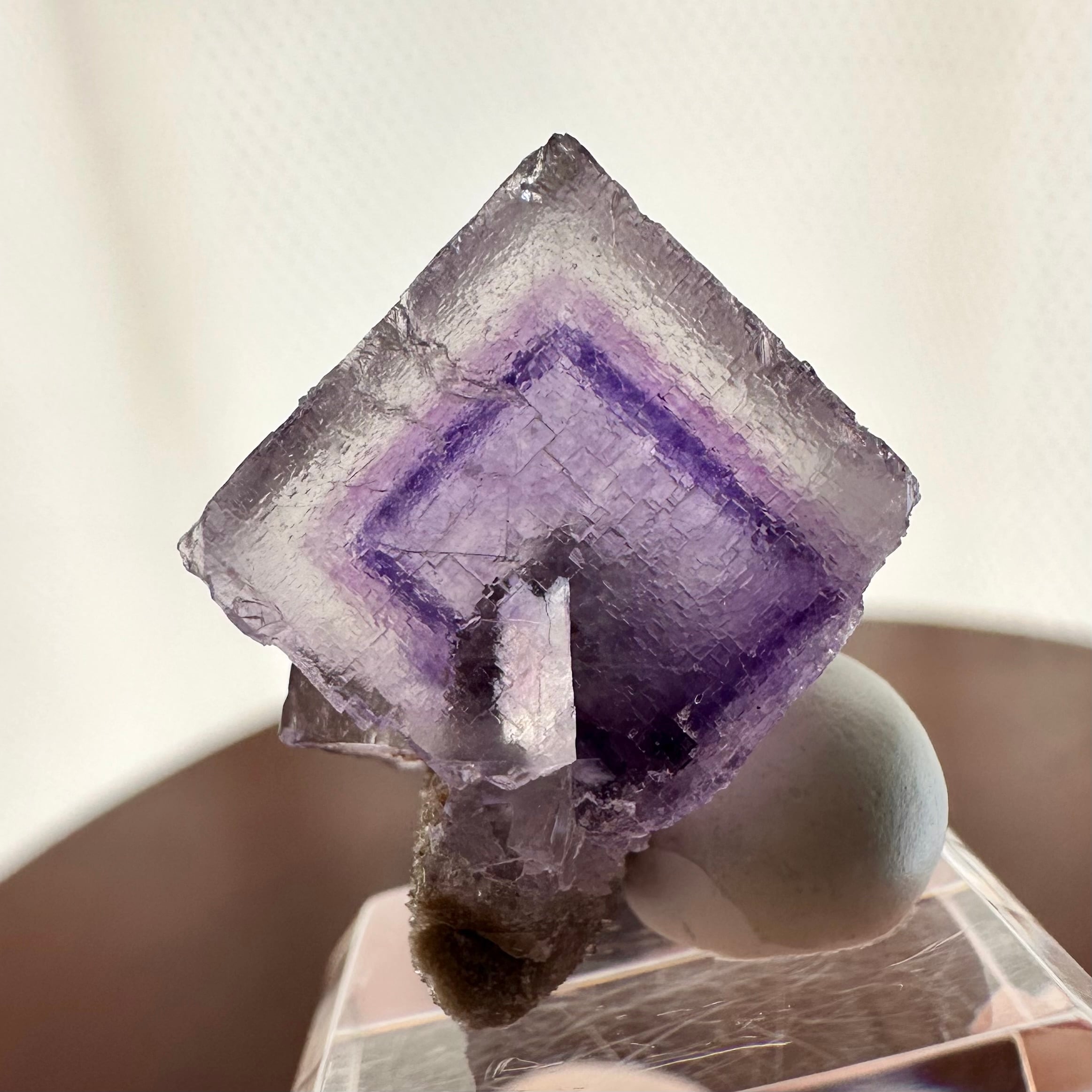 強烈なゾーニングが印象的な、Elmwood Mine産のフローライトです、どの角度から覗き込んでもハッキリと見えます。