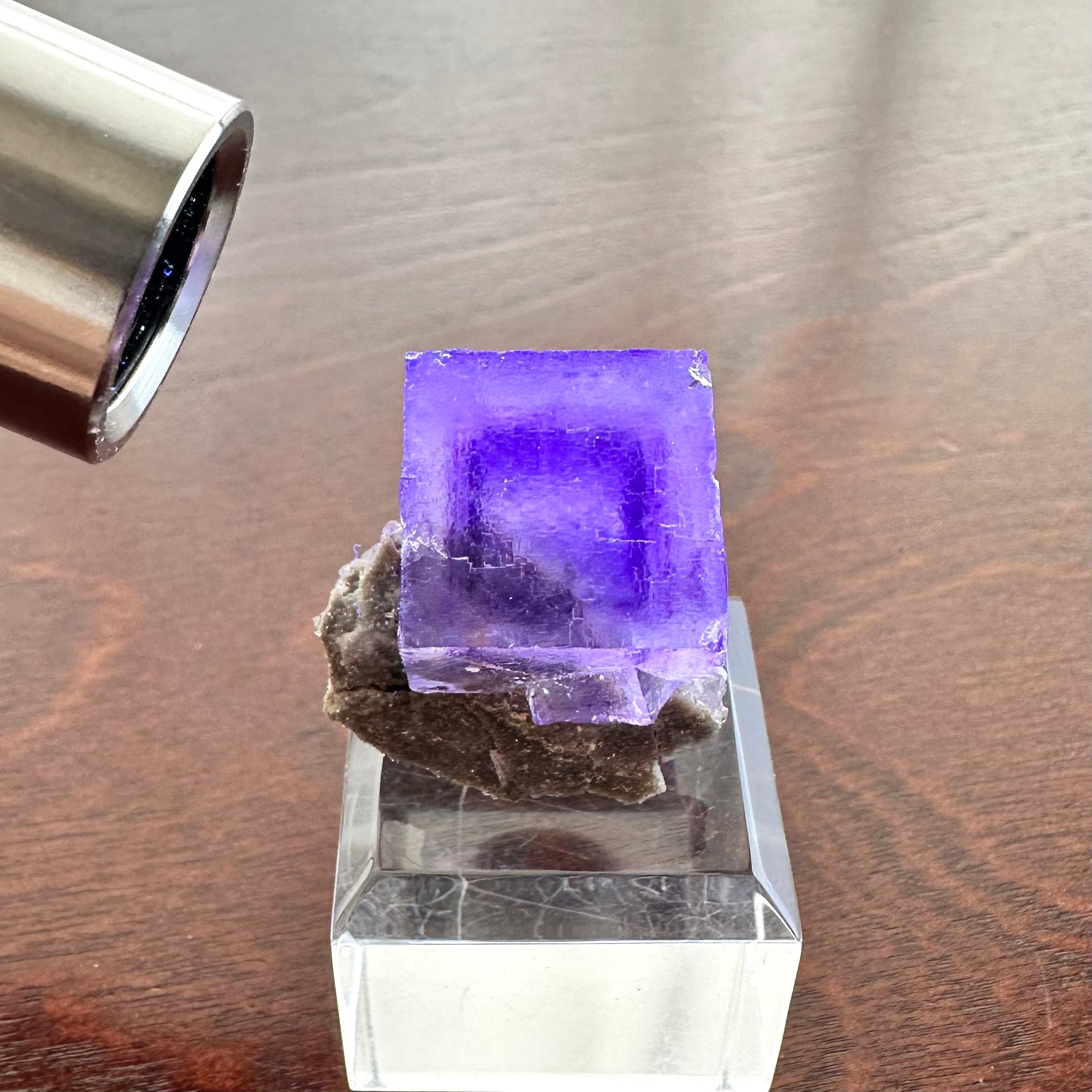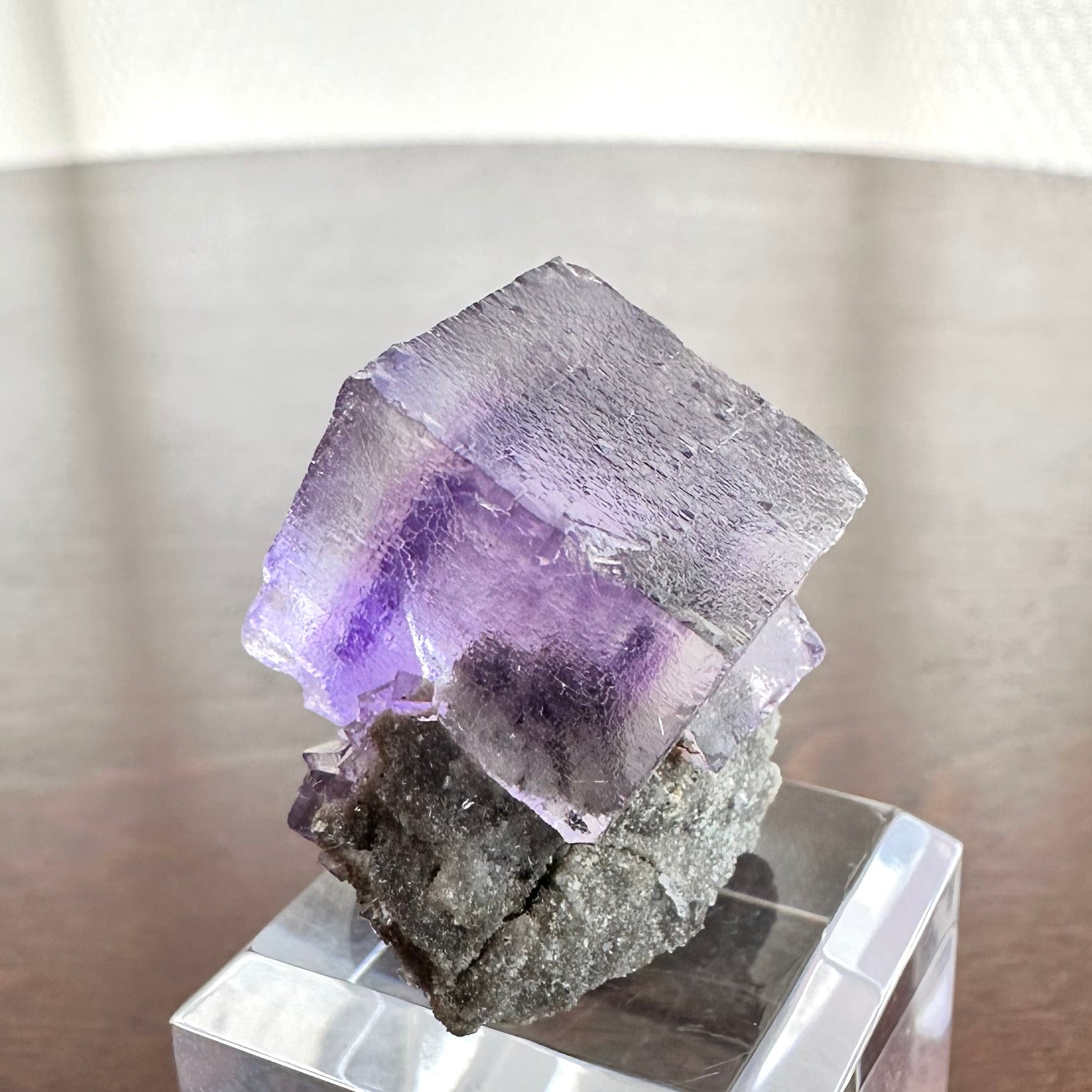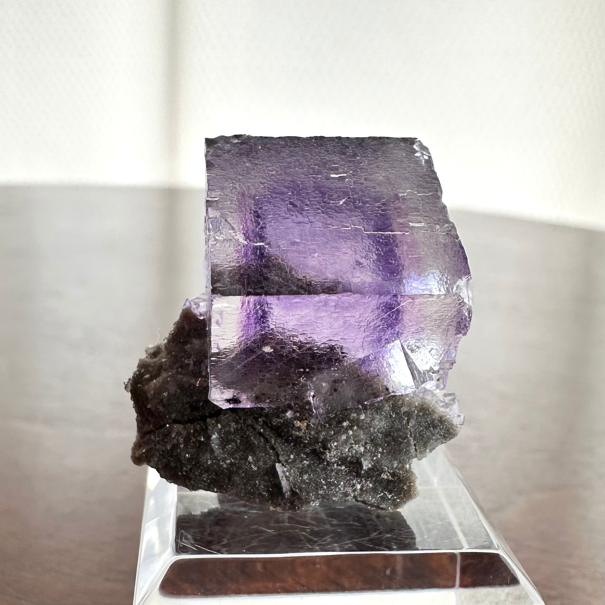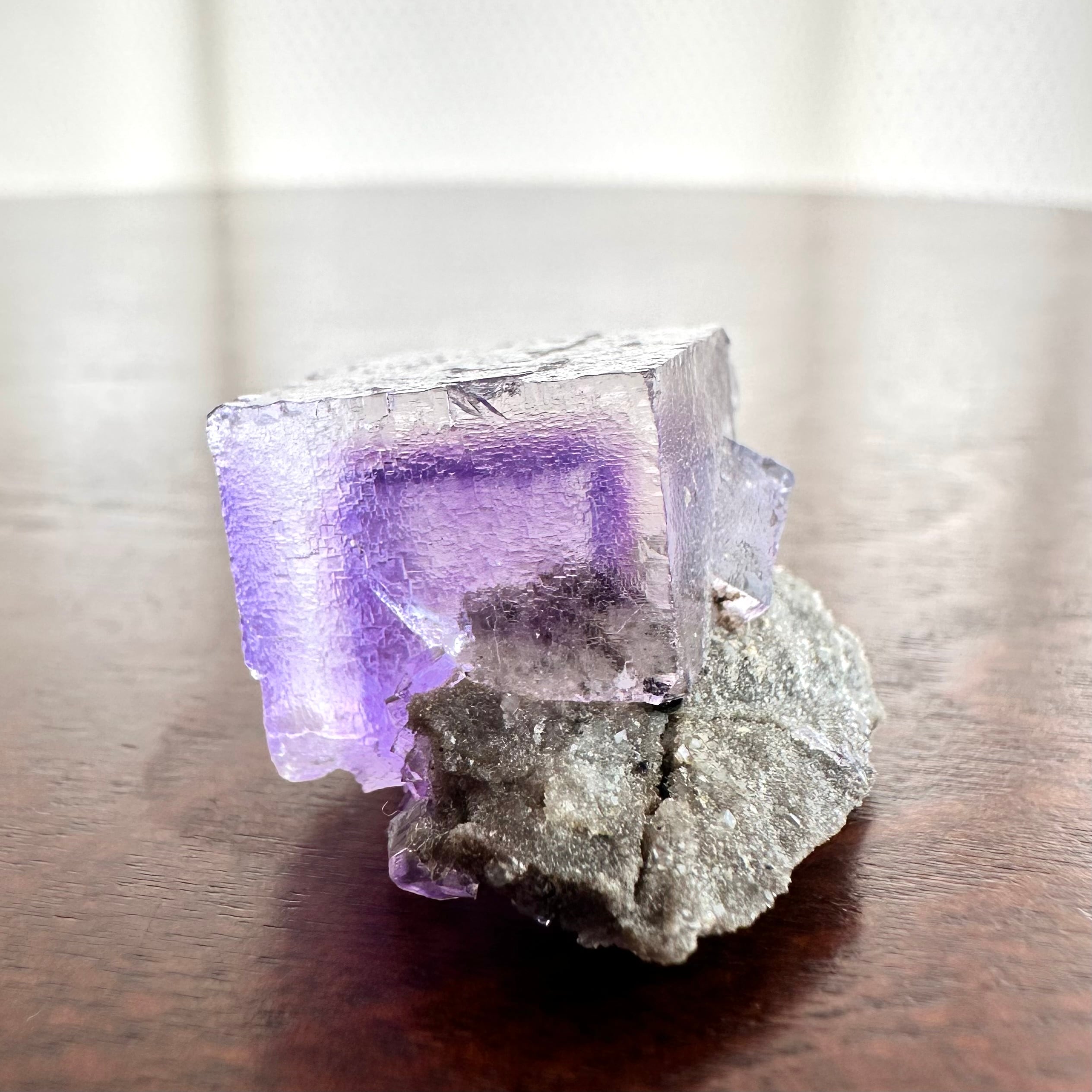 強烈なゾーニングが印象的な、Elmwood Mine産のフローライトです、どの角度から覗き込んでもハッキリと見えます。