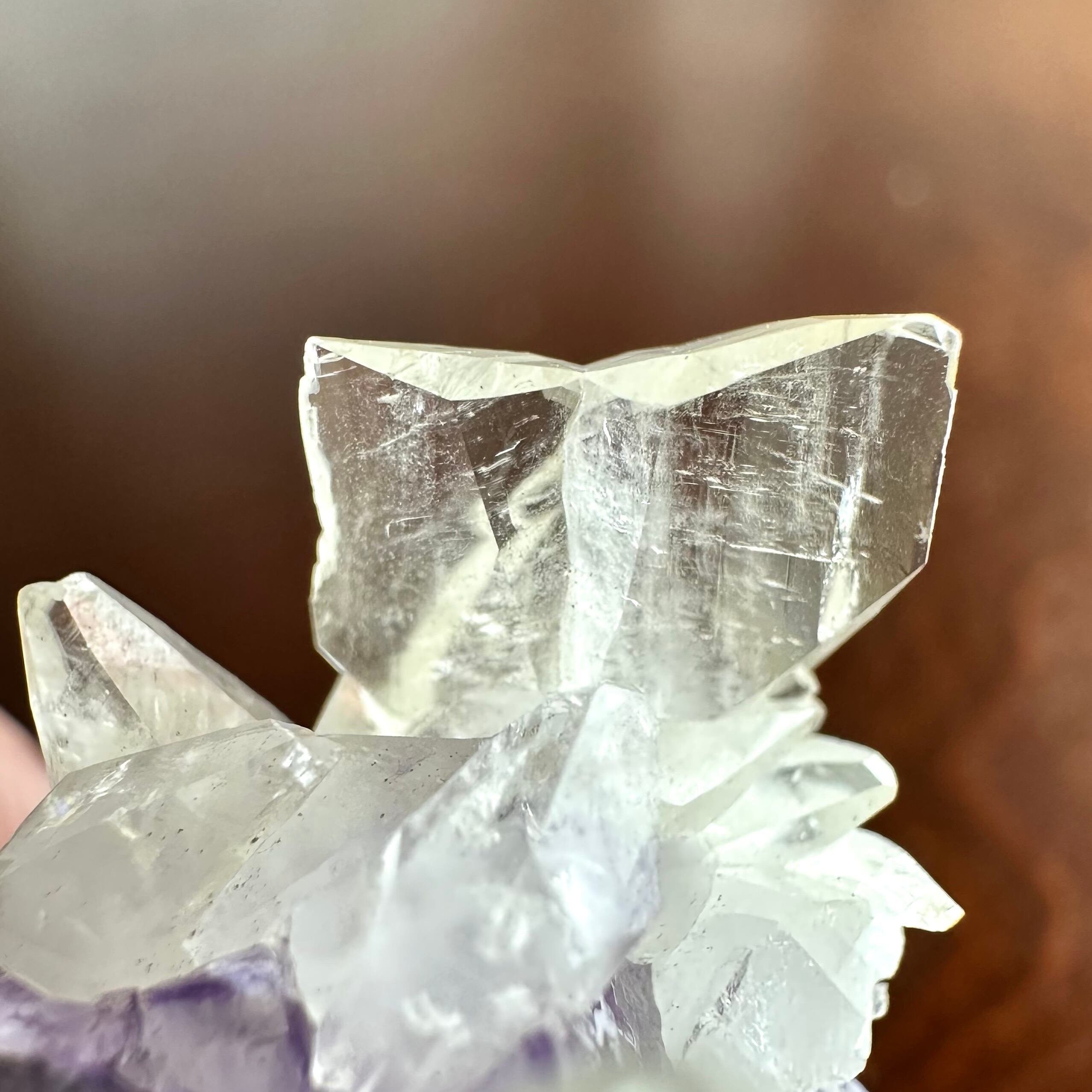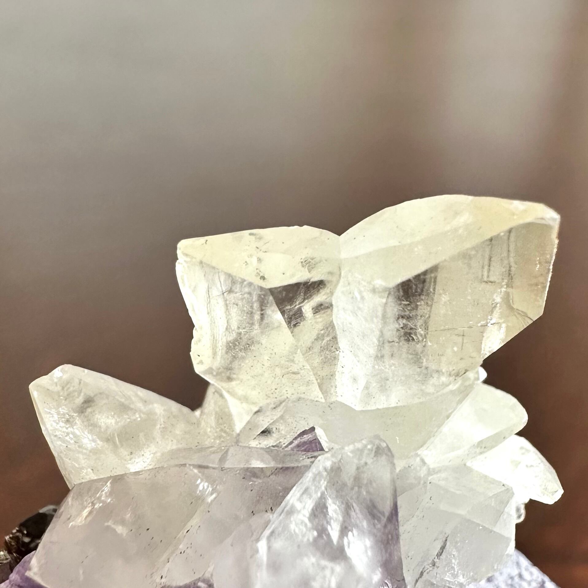 特筆すべきはエルムウッドらしいステラビームと共に、エルムウッド産としては非常に珍しいバタフライツインとも呼ばれるタイプの双晶のカルサイトが同一標本上に見られる点で、ユニークさが際立っていて正にコレクターピース的な標本です。