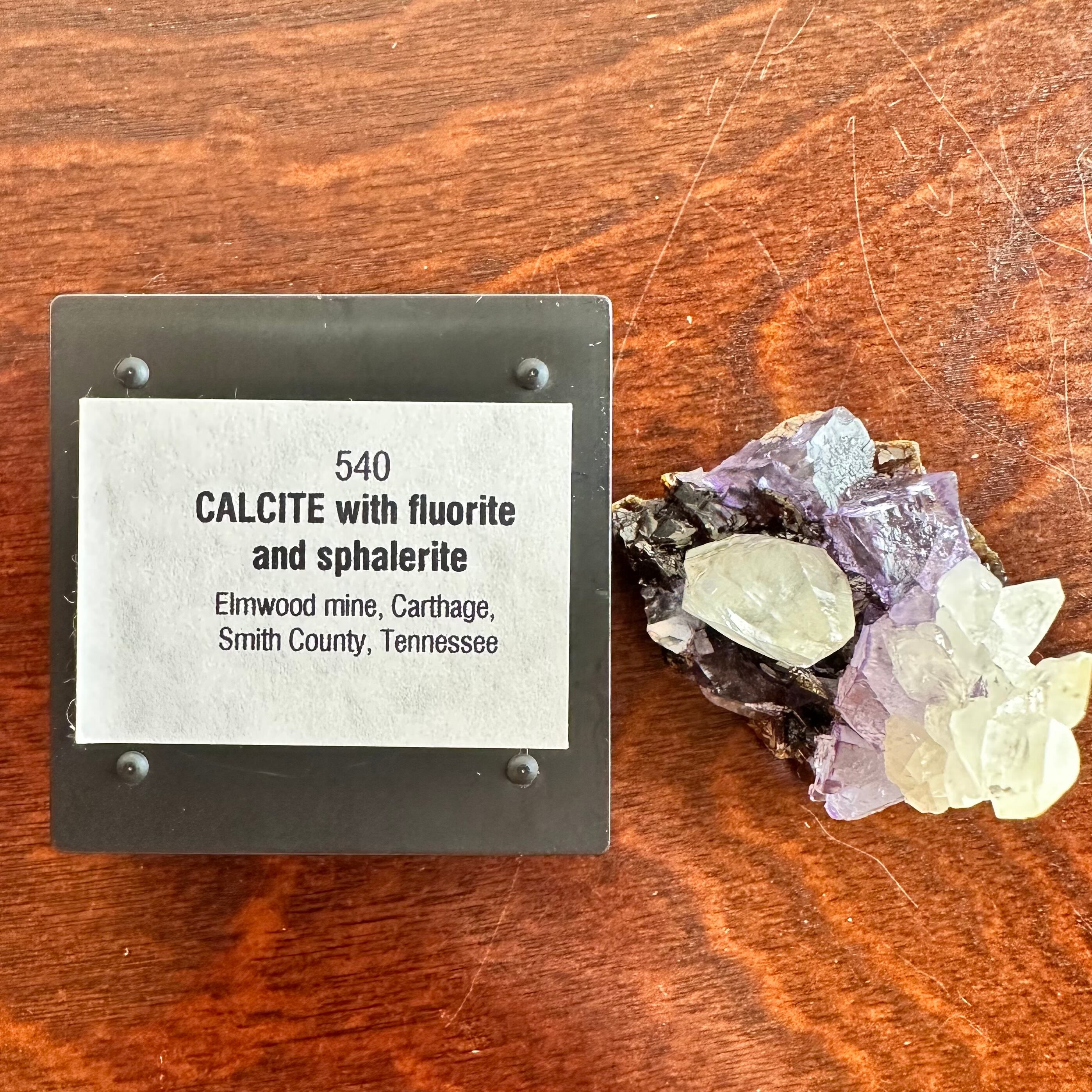 Elmwood Mine産のカルサイトとフローライト、スファレライトとのコンビネーションです。