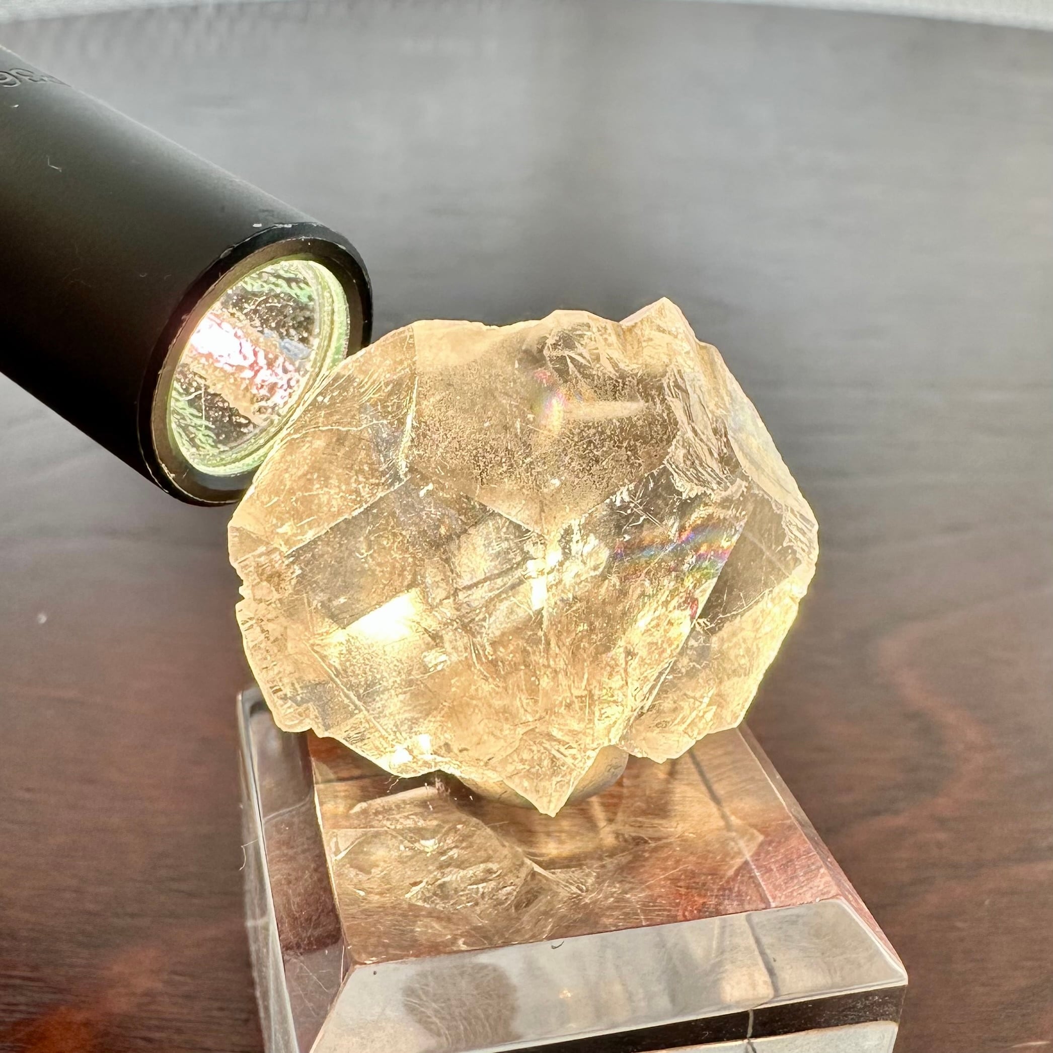 肉眼ではクリアに見える双晶のカルサイトですが、その結晶内部をよく見ると、糸のような部分やそれが固まったかのような部分があり、そちらがポリジム鉱とのことです。
