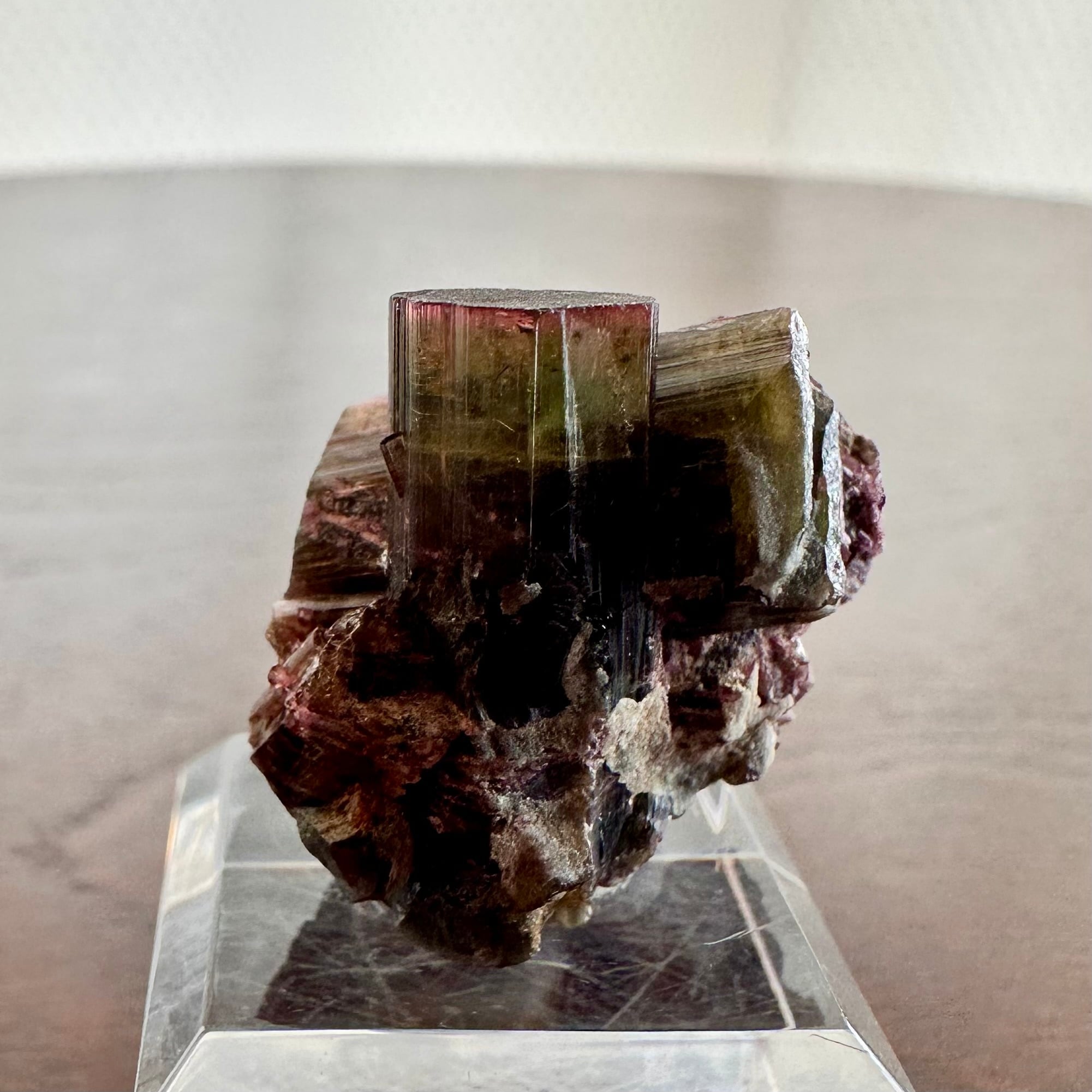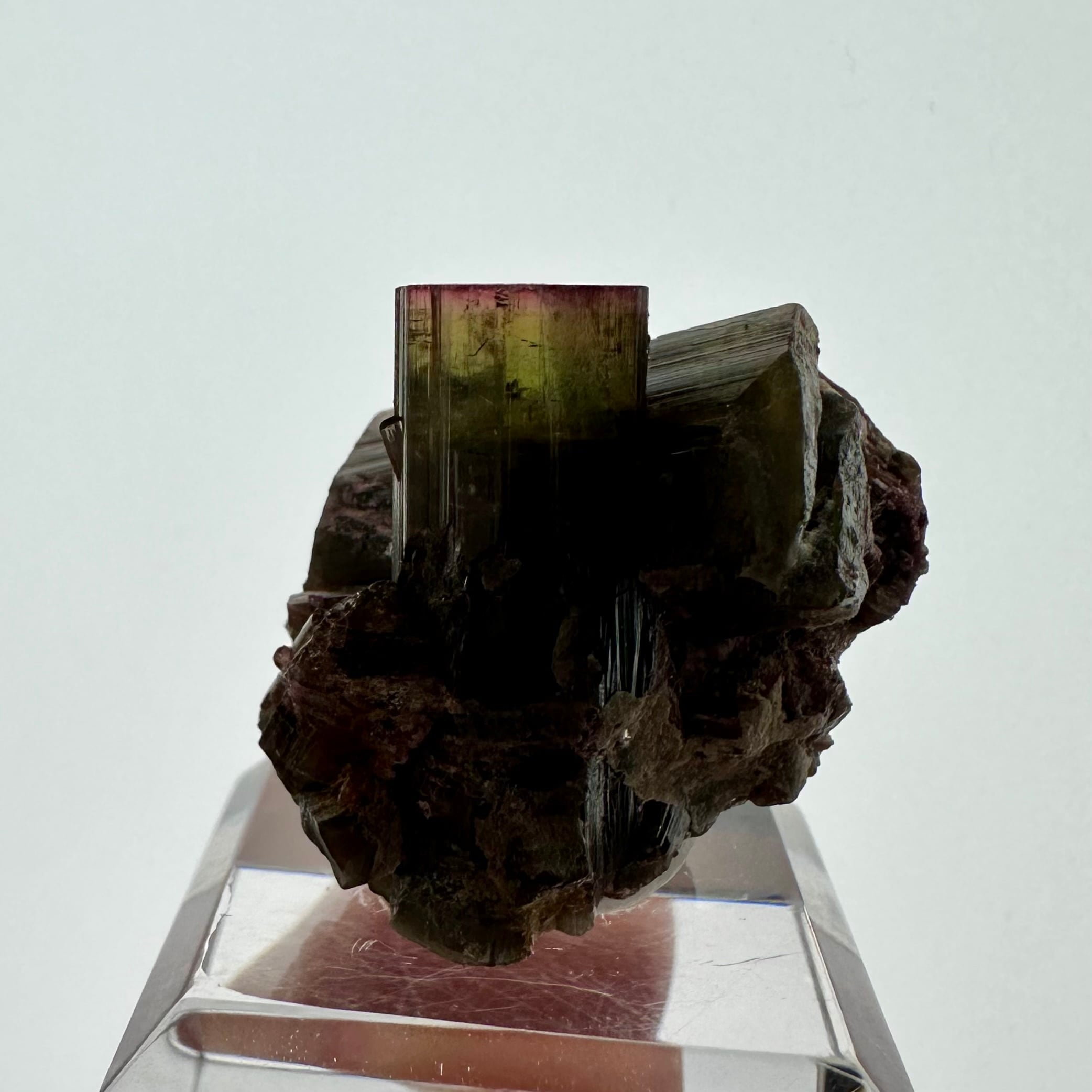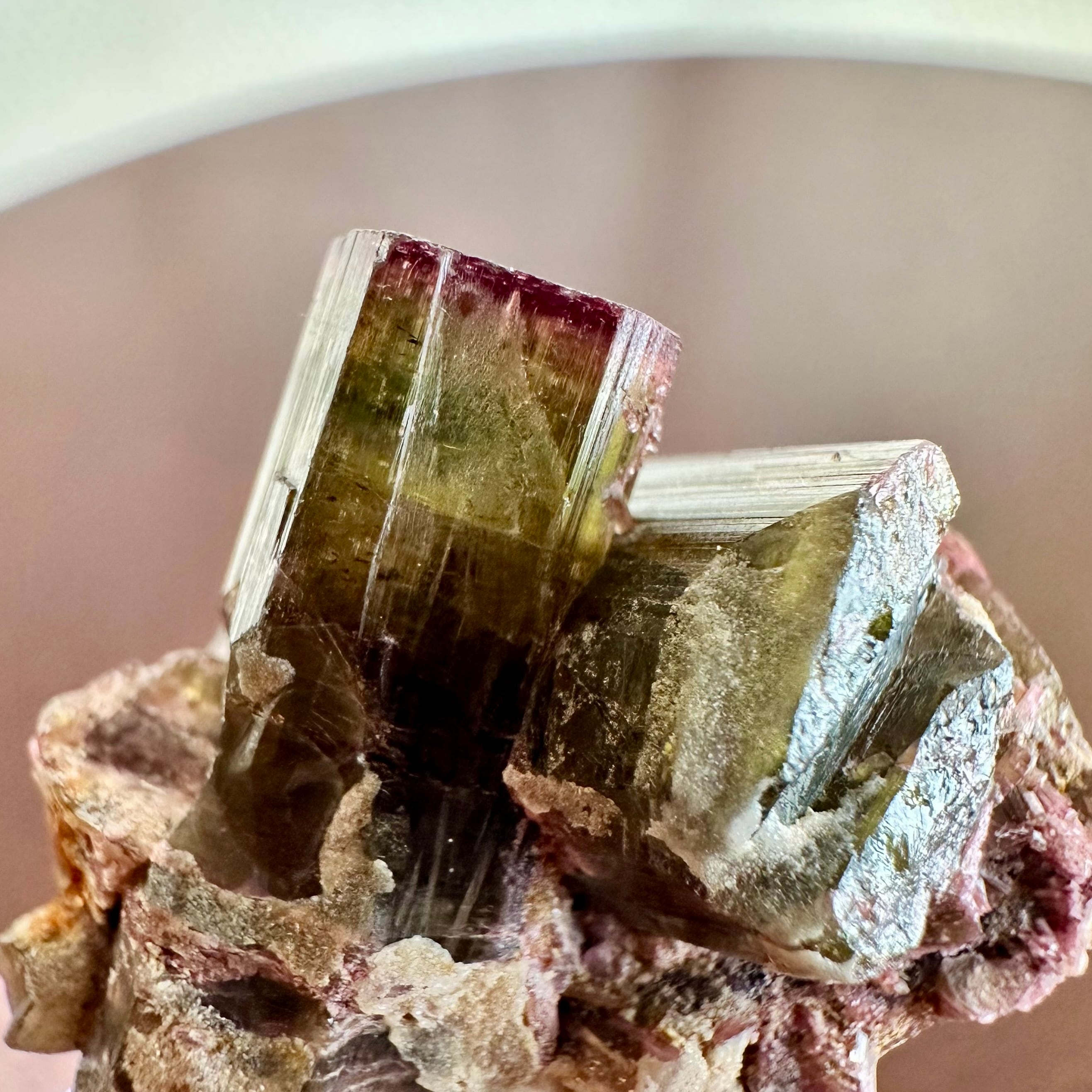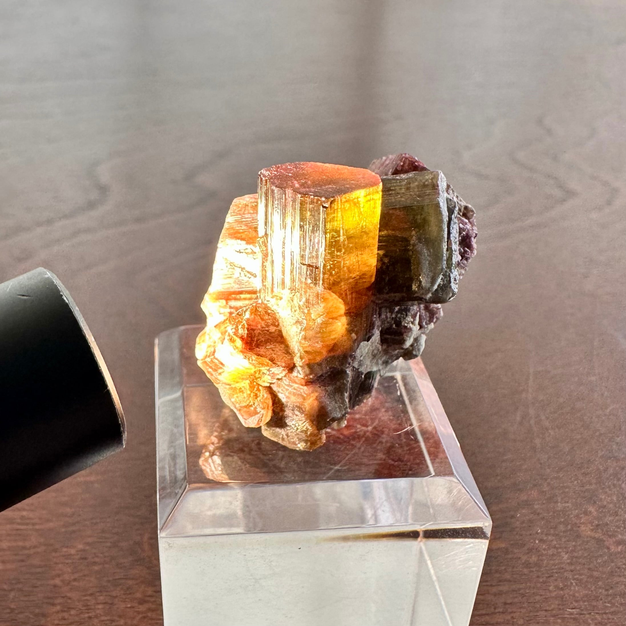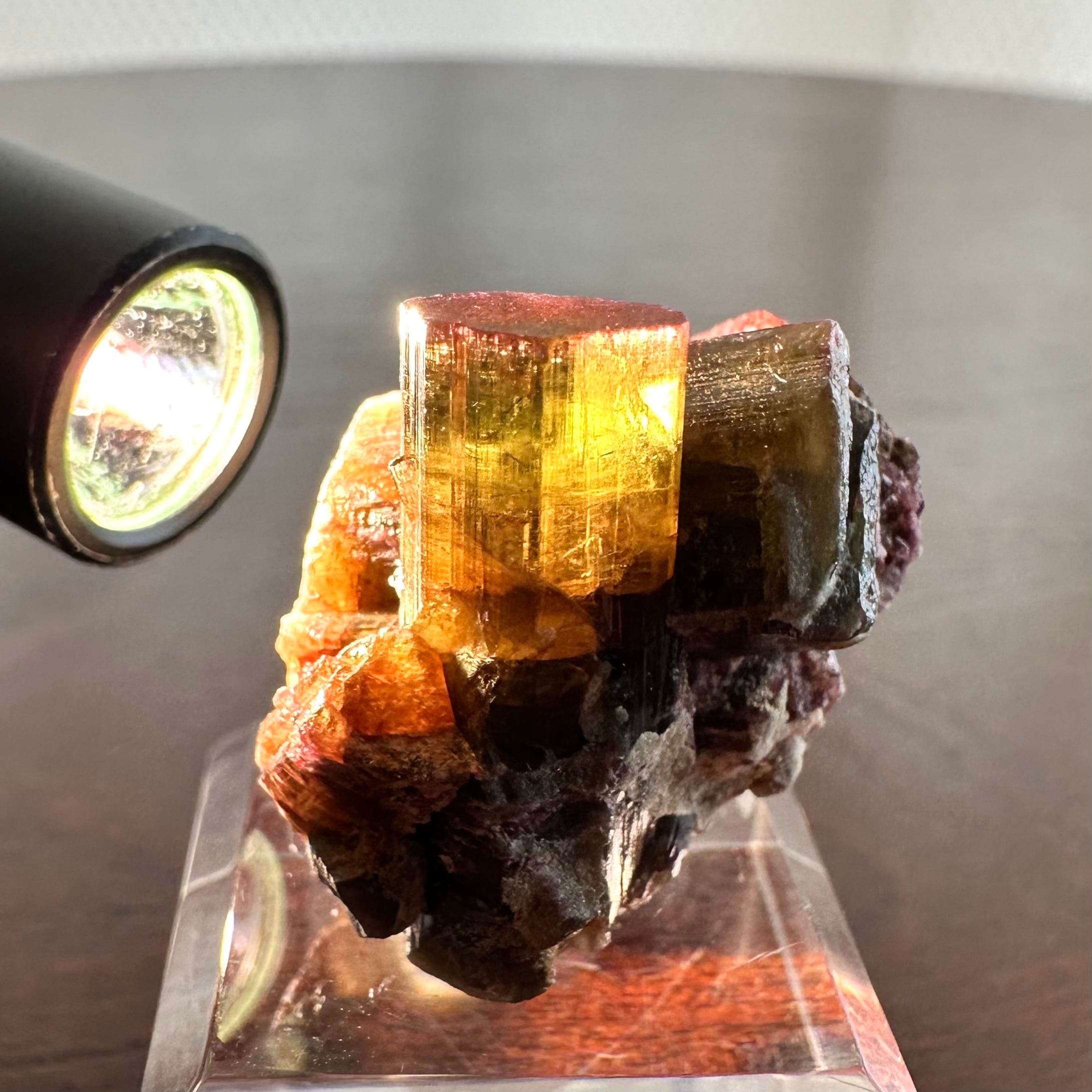 メイン結晶は透過光が必要ながら、透明感とオレンジ混じりのユニークな色味が楽しめます。
