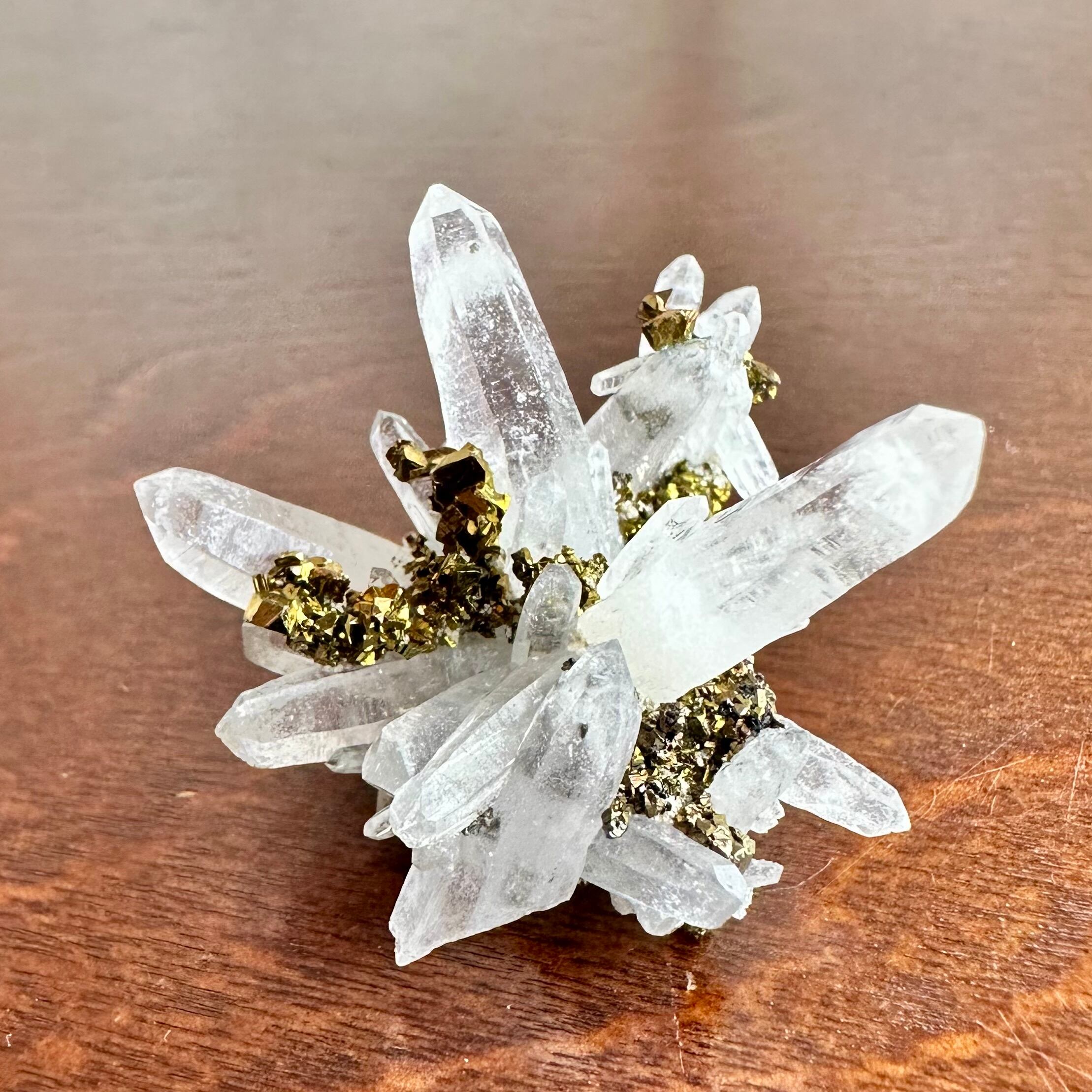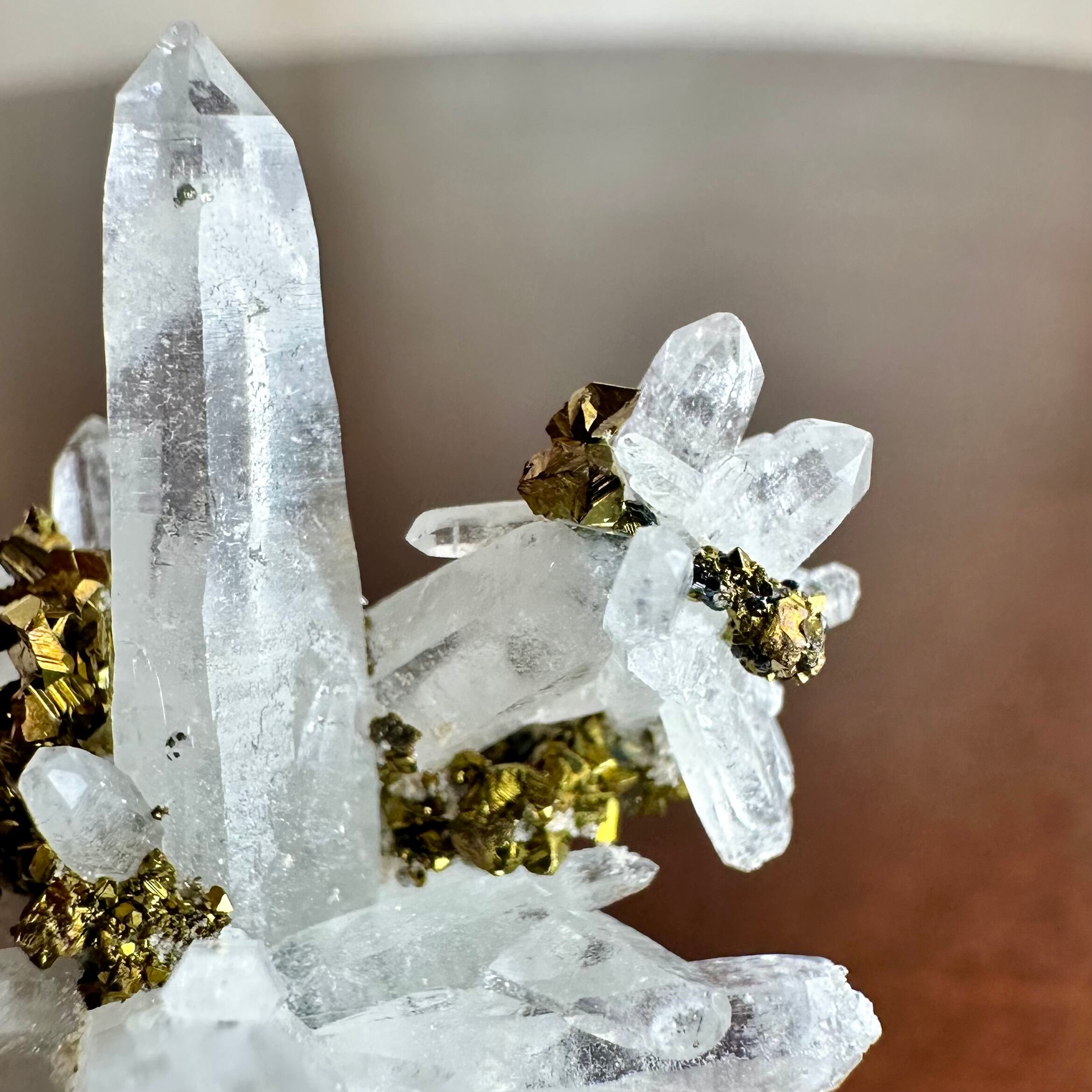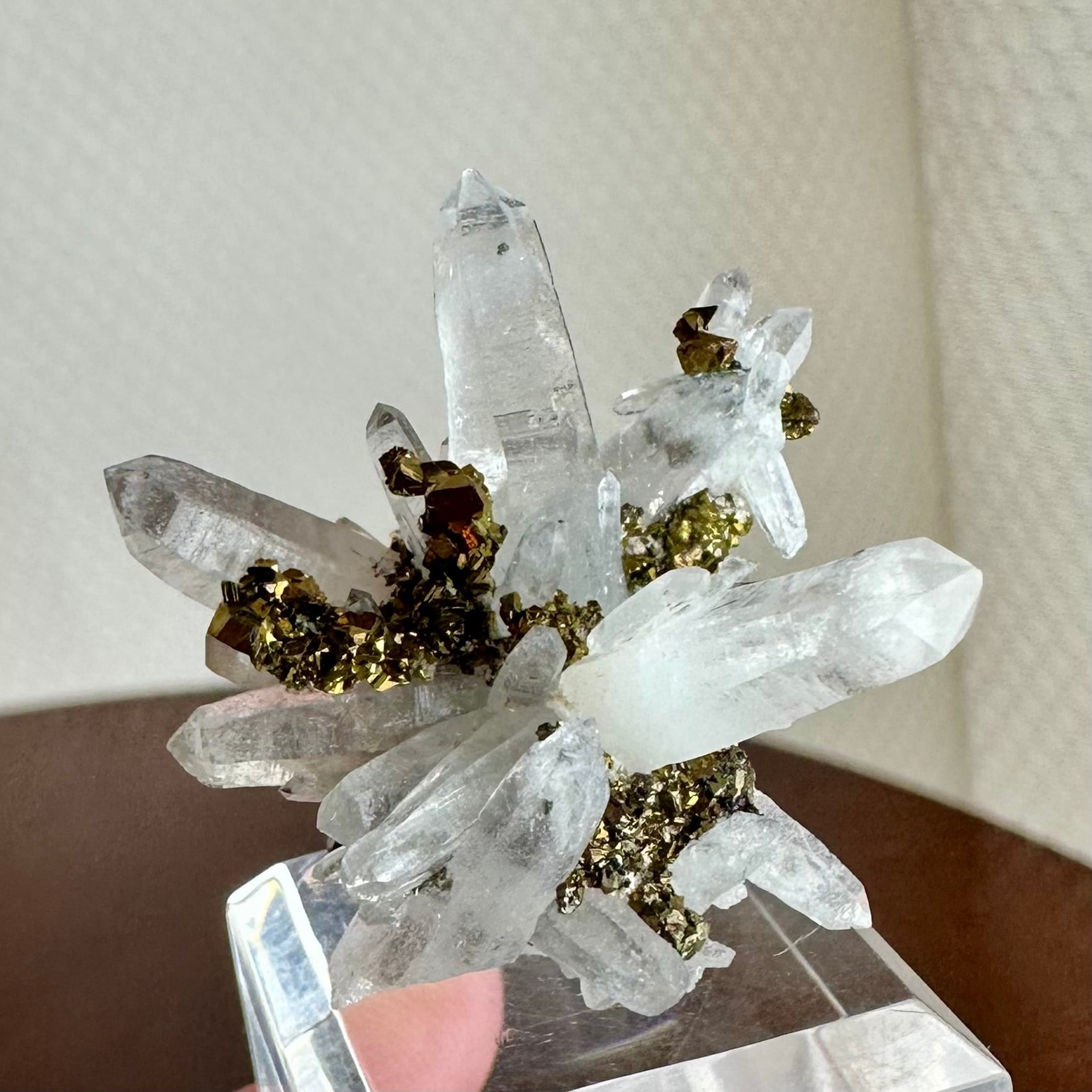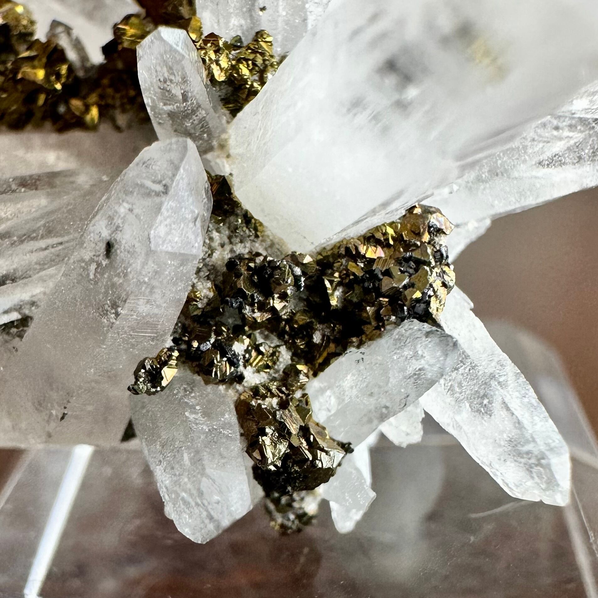 放射状に広がるクォーツと、キャルコパイライトをその周りに纏うような景色が美しく、シンプルなコンビネーションながらそれぞれの状態の良さや共生のバランスが良好な標本です。