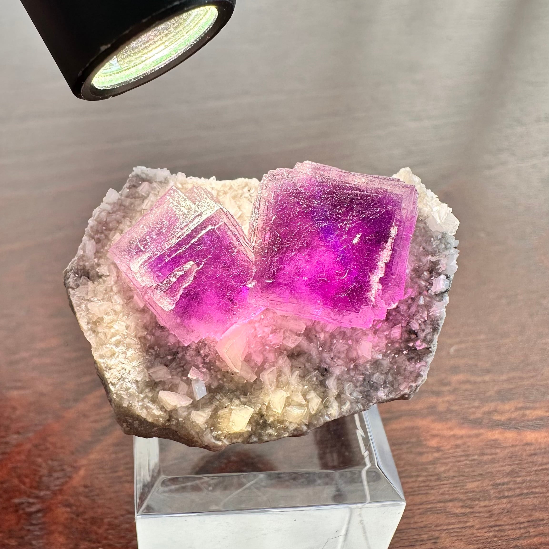 透過光下で鮮やかなラズベリーカラーに近い発色が見られ、蛍光はあまり見られません。