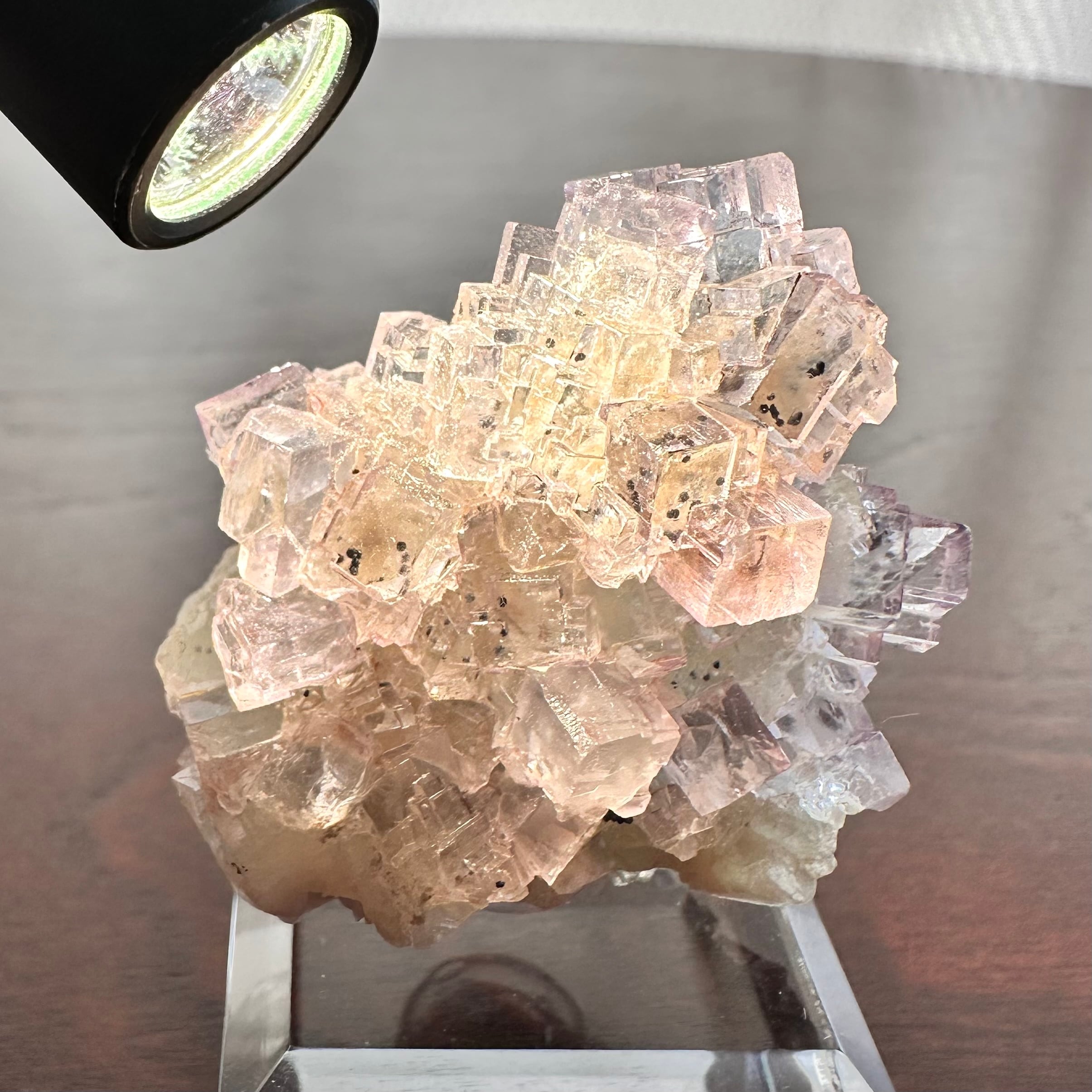 黒い内包物はヘマタイトのようですが不明で、紫外線光下では結晶を縁取るかのようなユニークな景色が見られます。