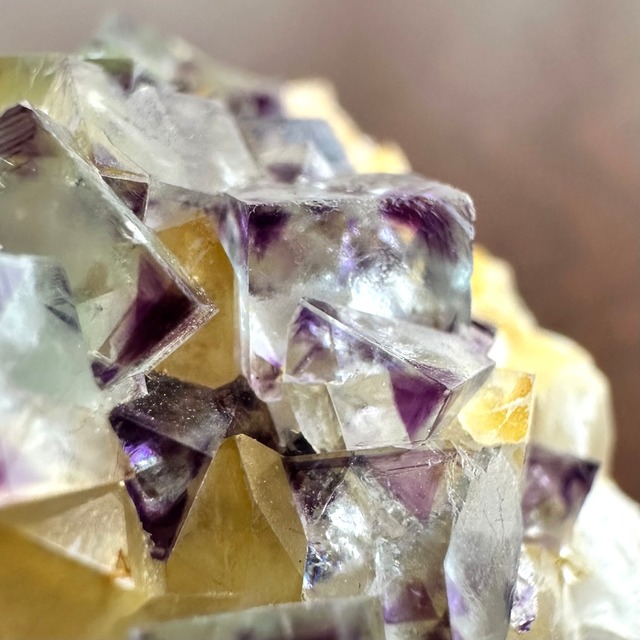 グリーンをメインとした結晶は、その四隅の部分に三角形のパープルのファントムが入る独特な景色が印象的で、サイズ以上の存在感を放ちます。