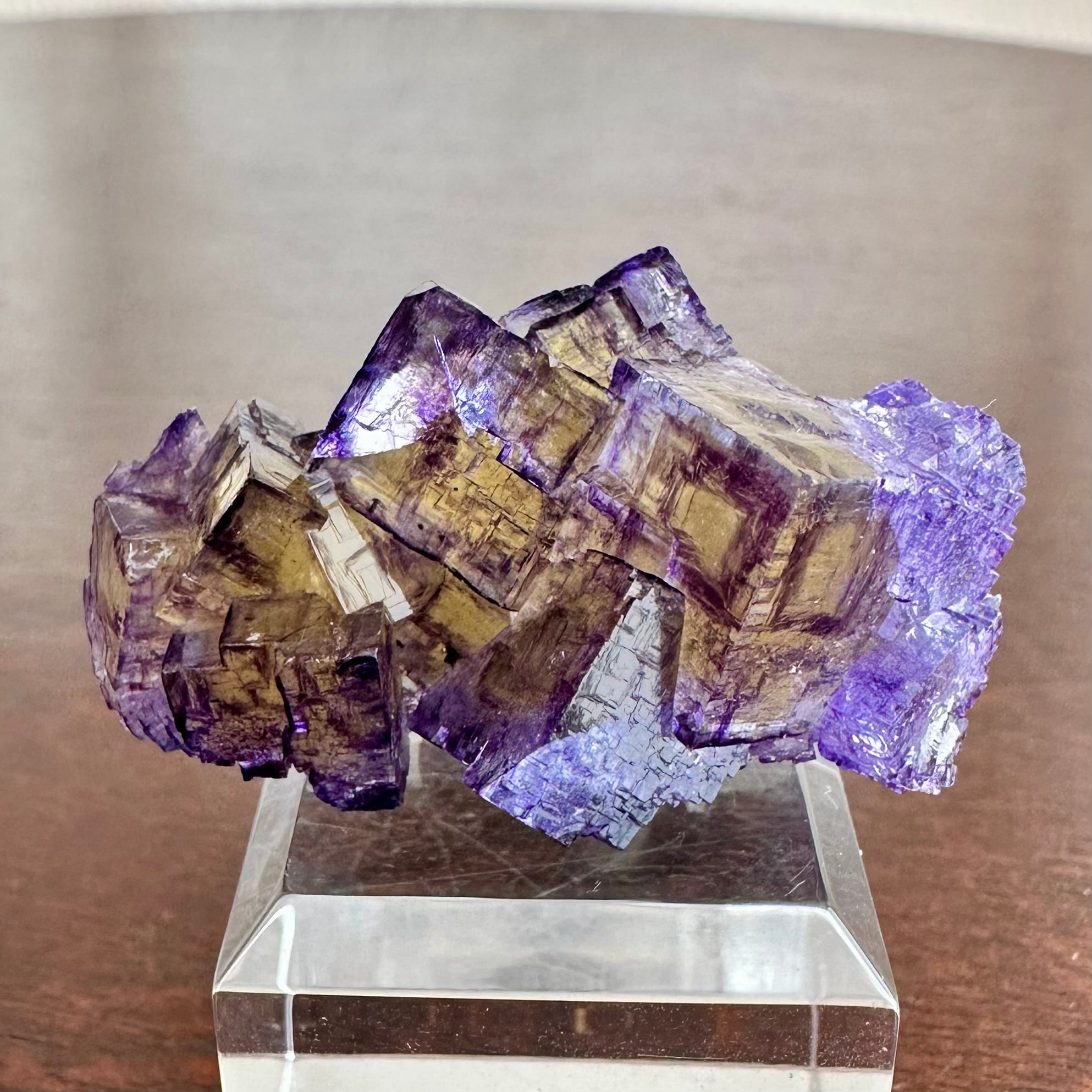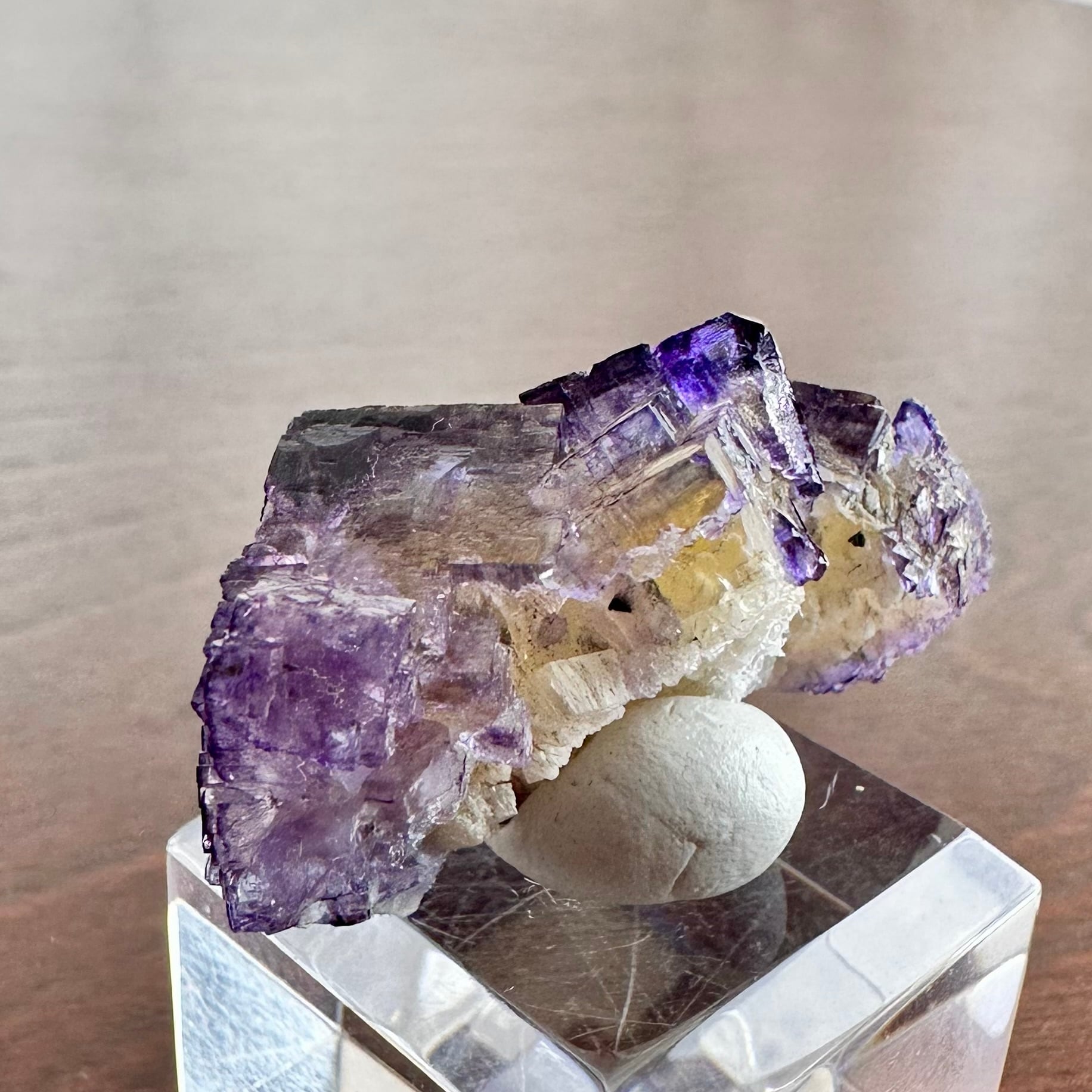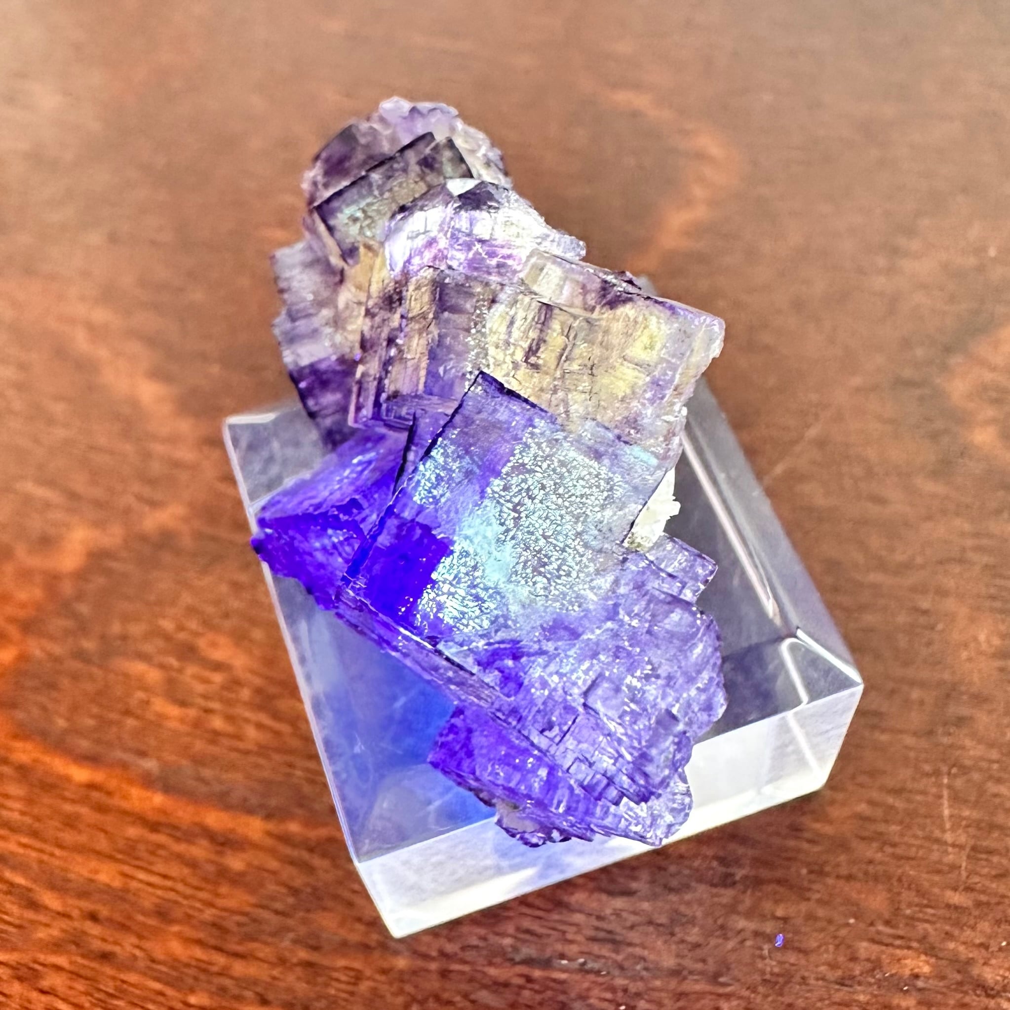 結晶裏面には接着剤が少し残り、画像14・15枚目のように白い跡と蛍光が見られますが肉眼で見る分にはそこまで気にならないかと思います。