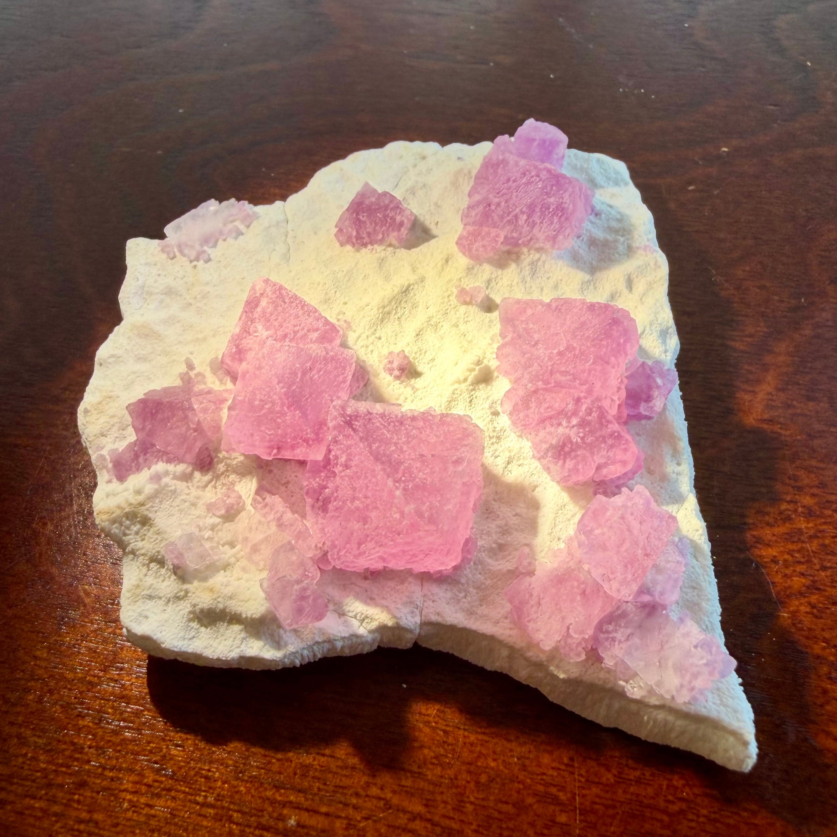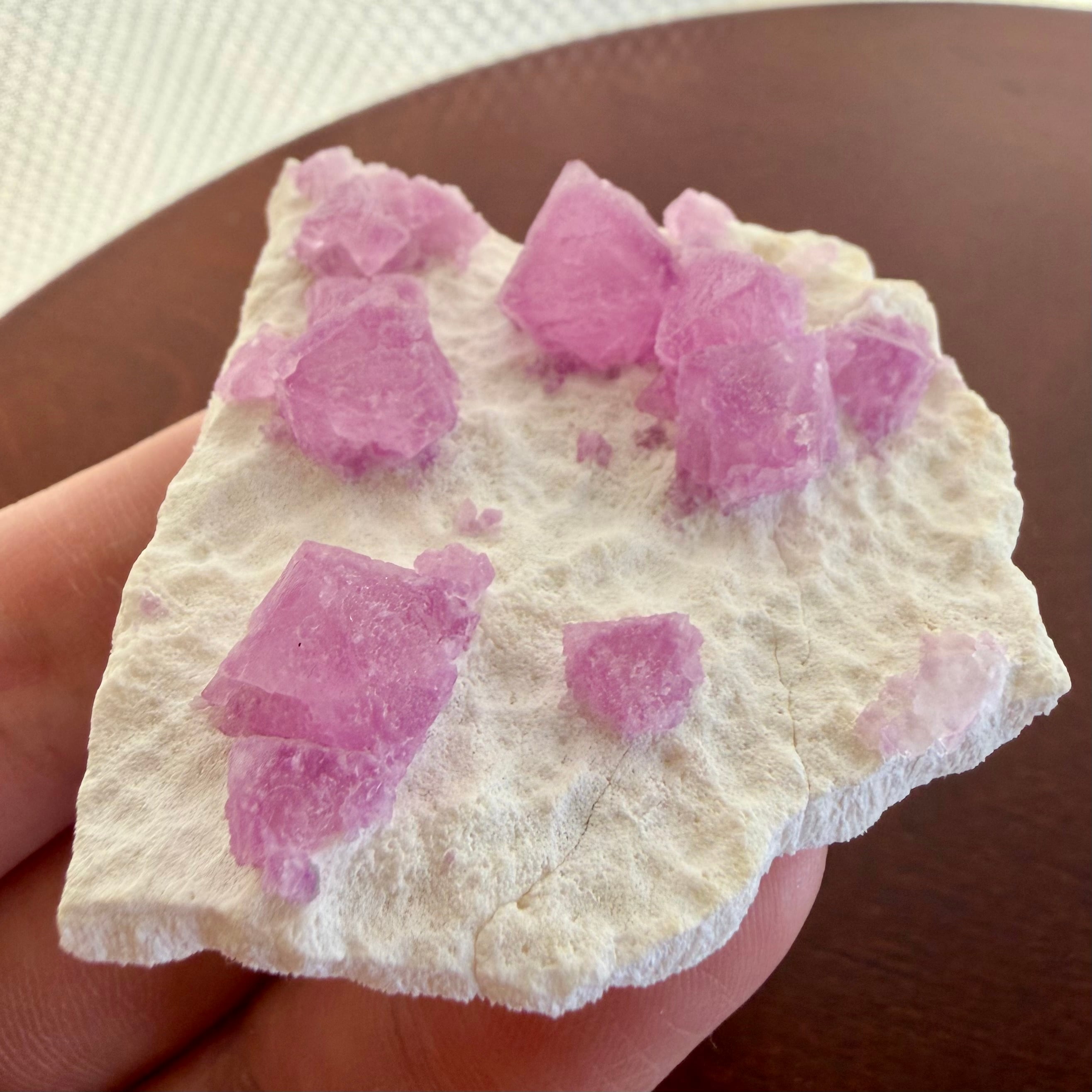 光源によっては更に明るいピンクに見えたり、パープルが強めの発色にも見えますが、透明感が残り、結晶の状態が良好で、かつ多くの標本が散らばった状態にあるからこそ楽しめるものだと思います。