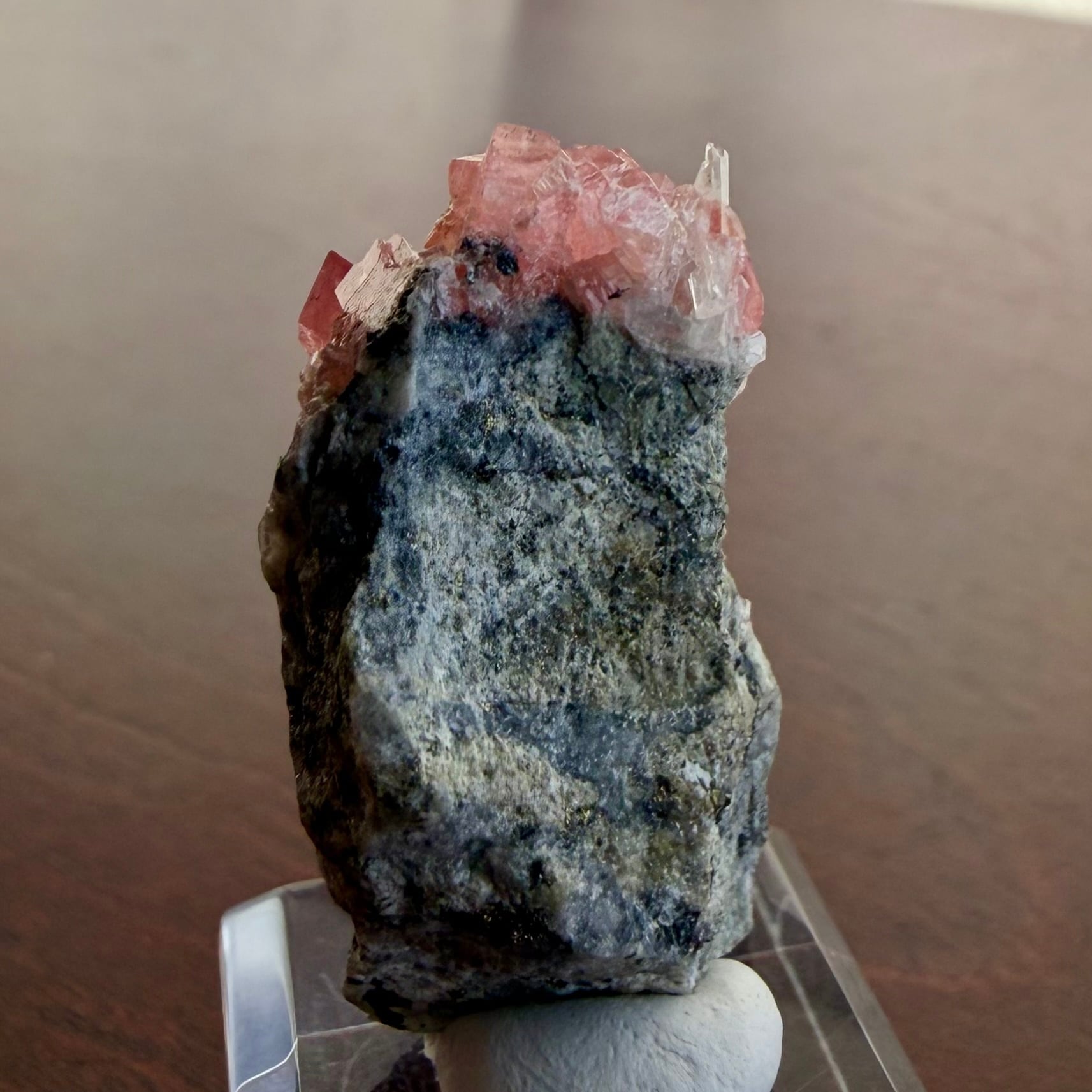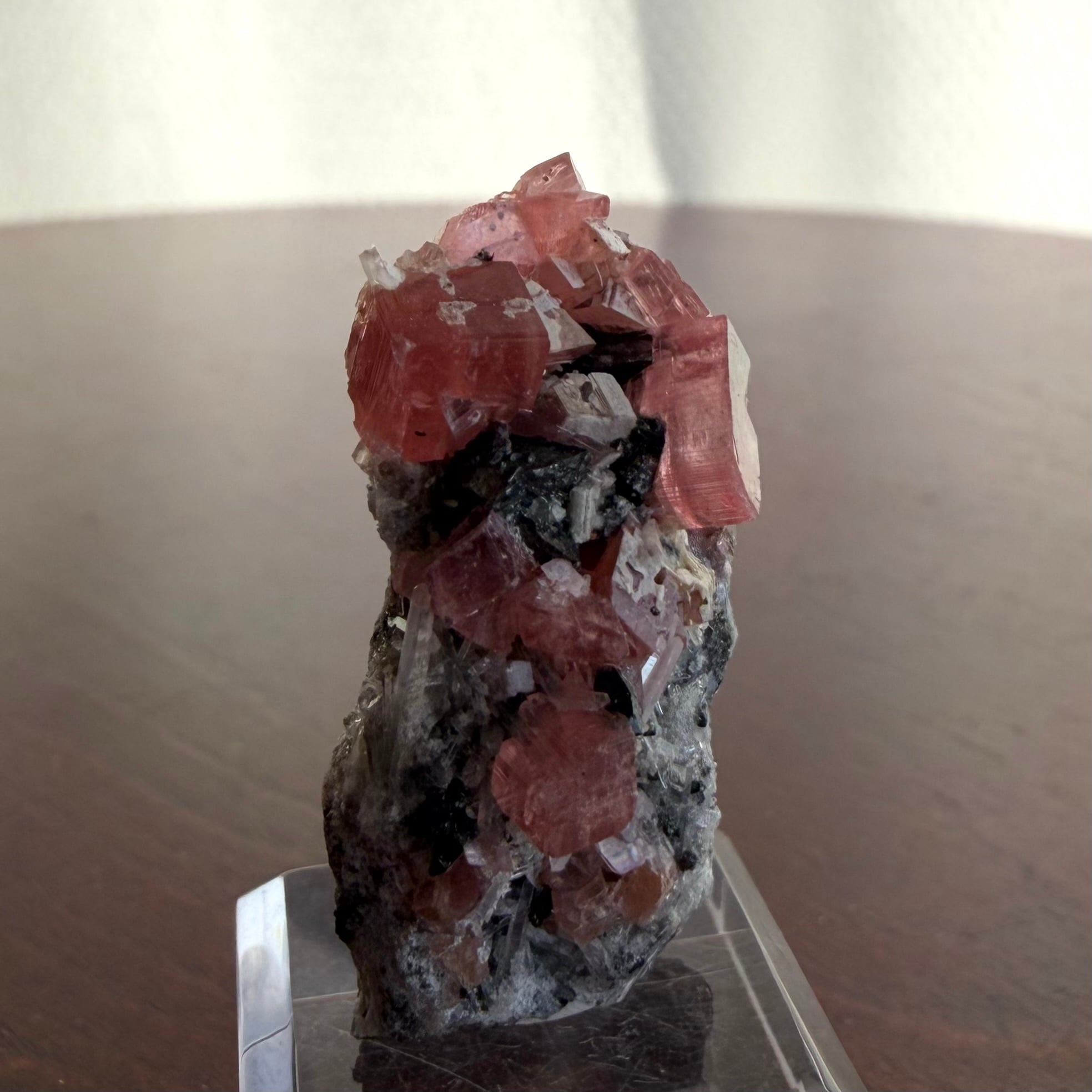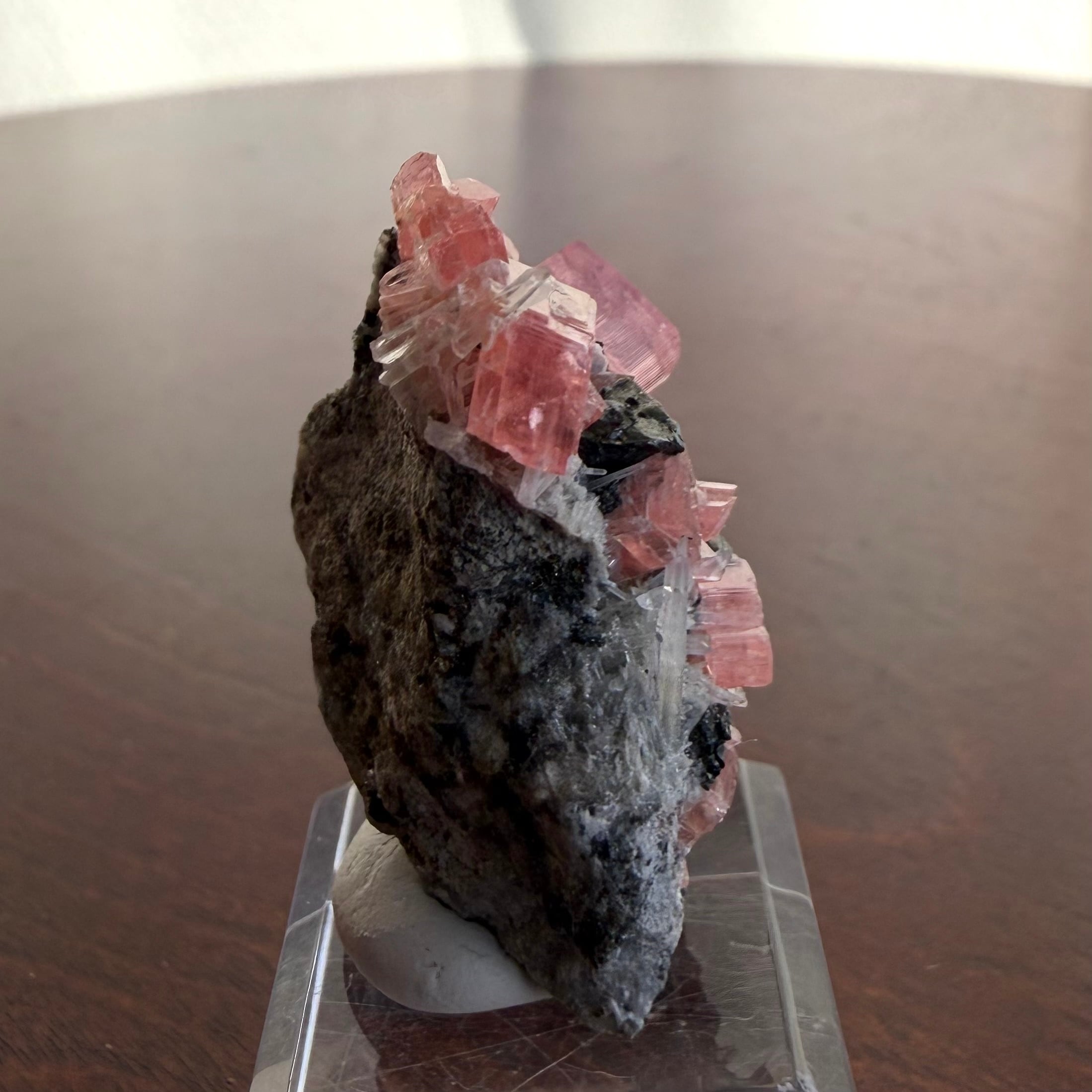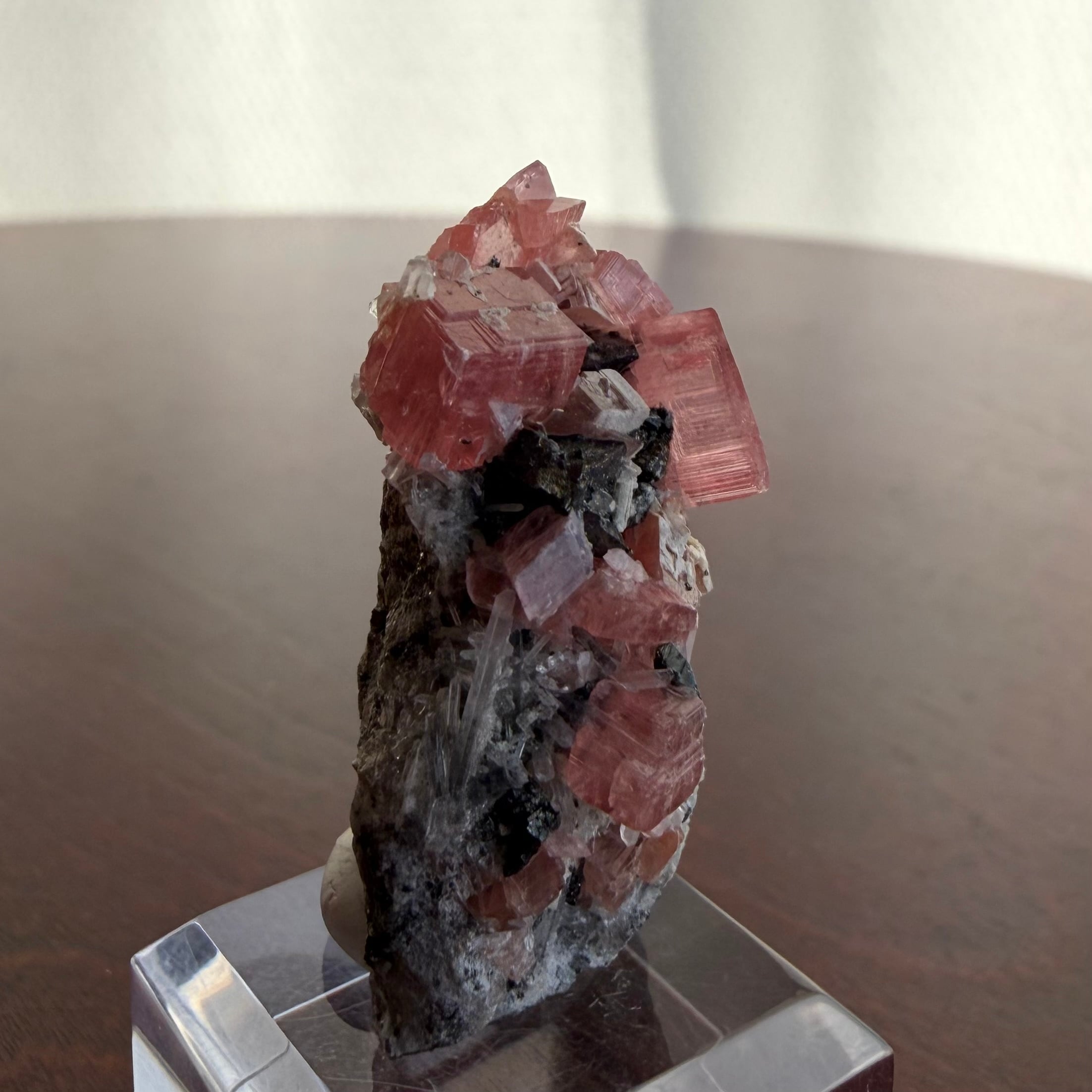 結晶のサイズが小さめのためレッドの発色はどちらかというとピンク寄りの色味に見えますが、その分透明感がしっかりと楽しめ、全体的に多くの結晶が広がる見応えのある標本です。