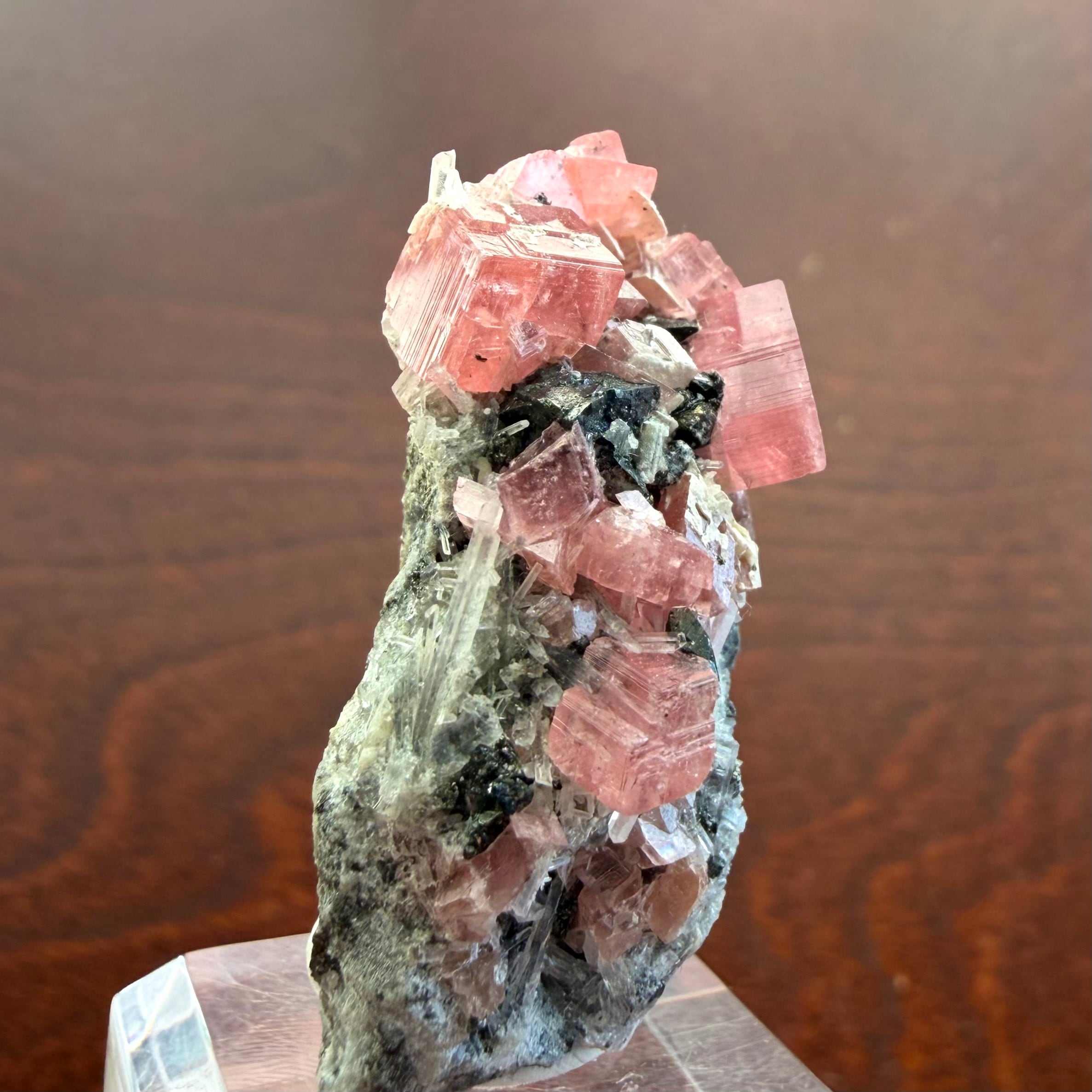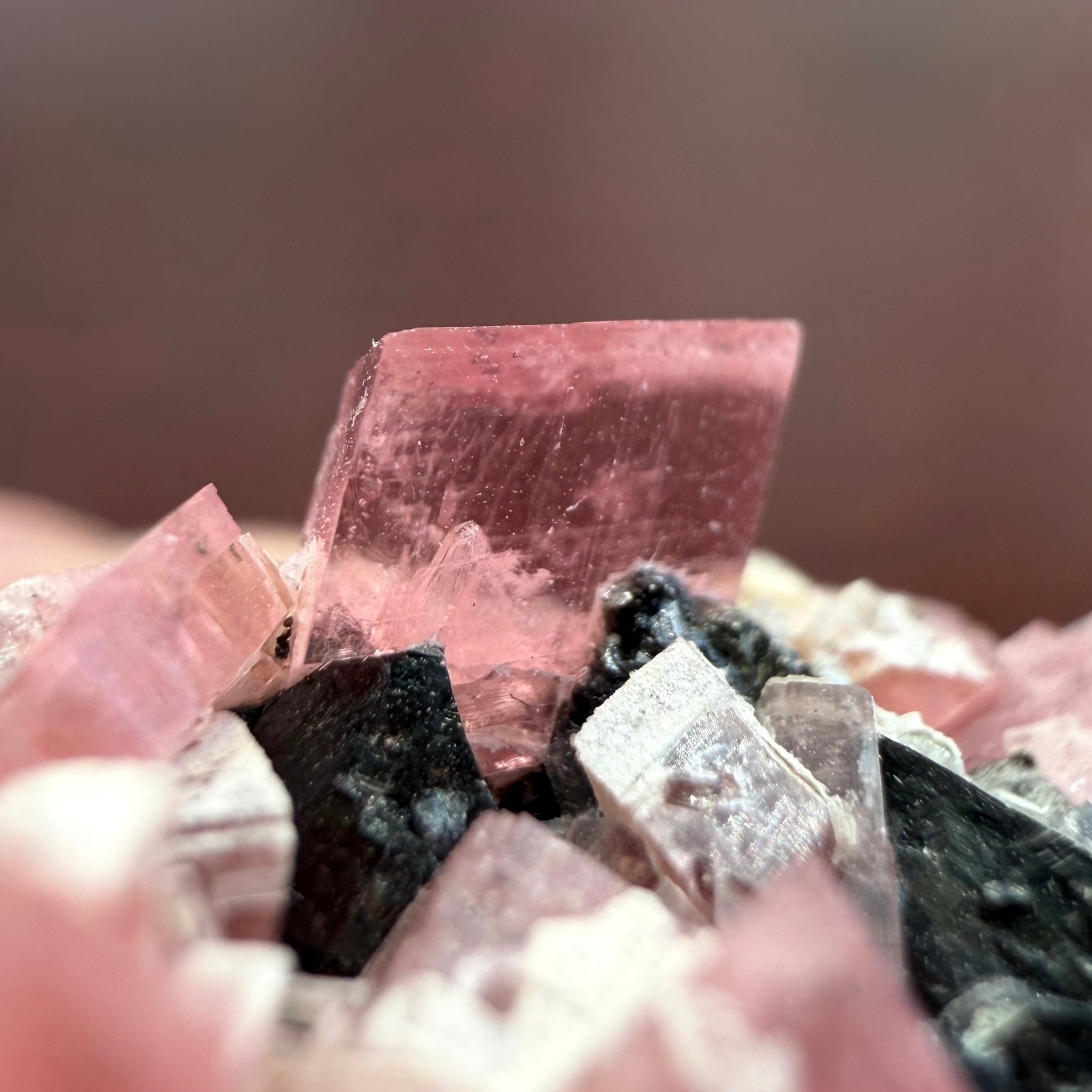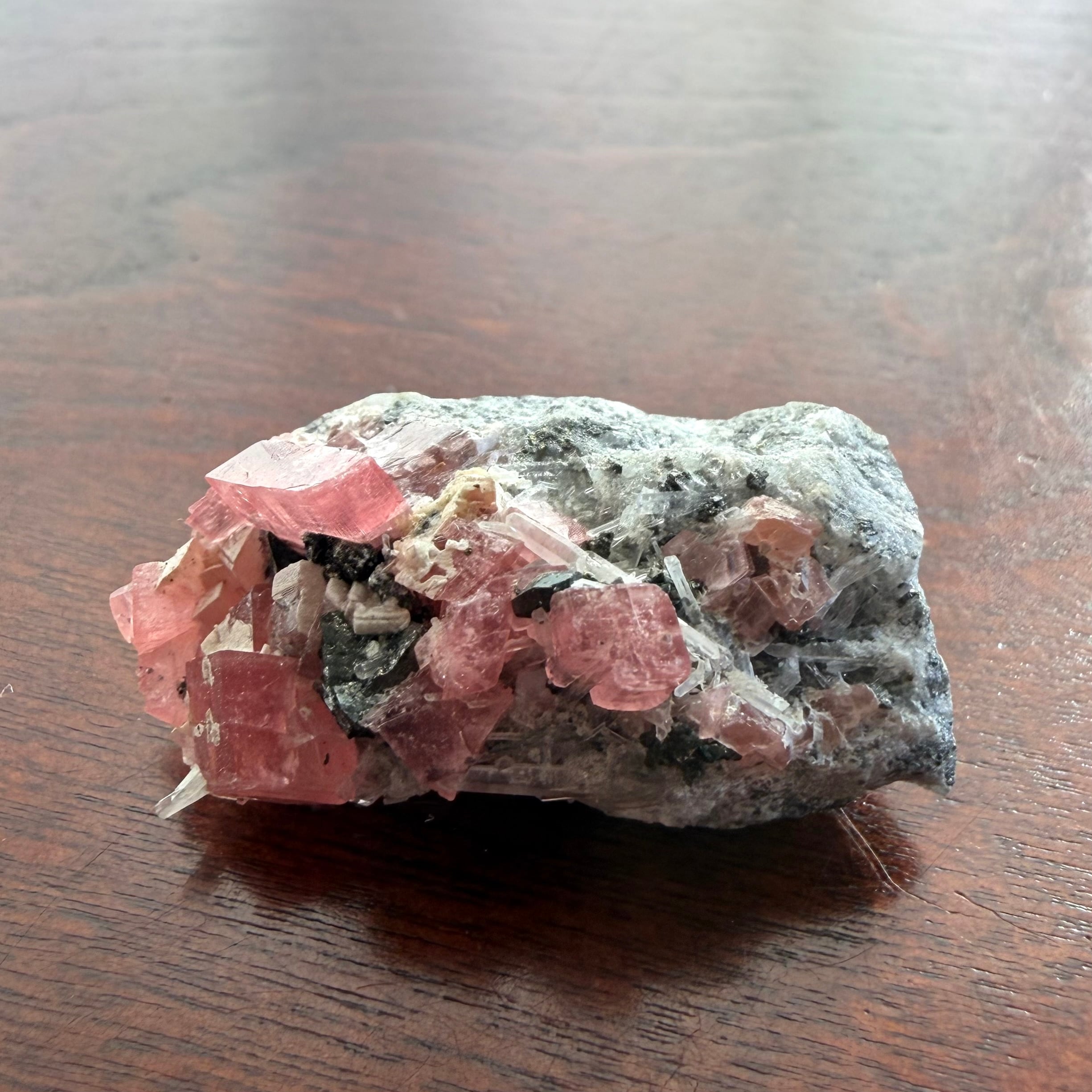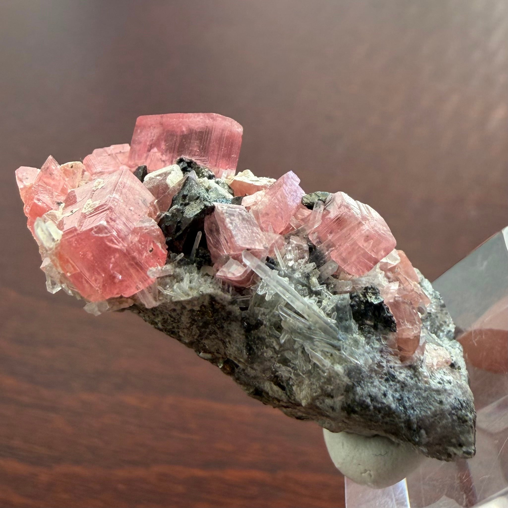 結晶のサイズが小さめのためレッドの発色はどちらかというとピンク寄りの色味に見えますが、その分透明感がしっかりと楽しめ、全体的に多くの結晶が広がる見応えのある標本です。
