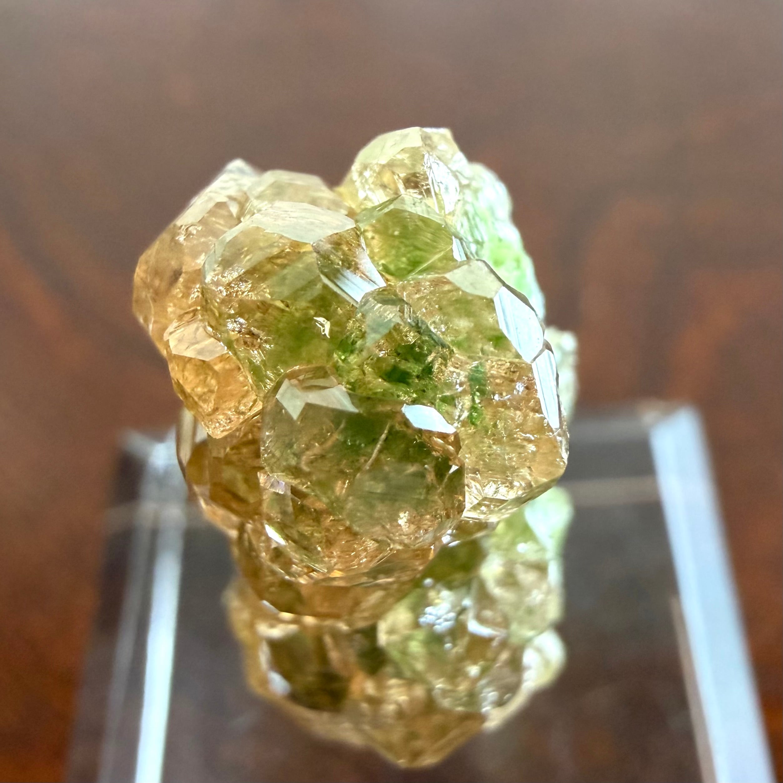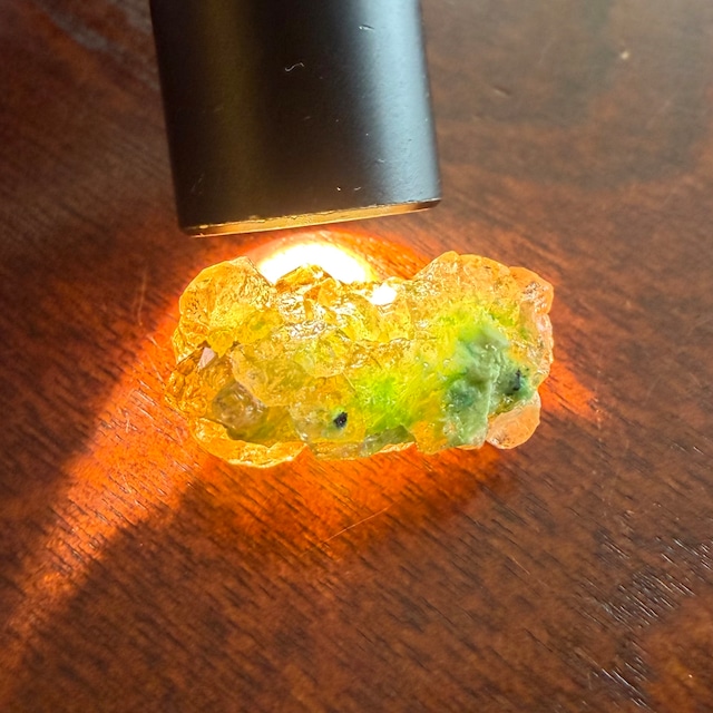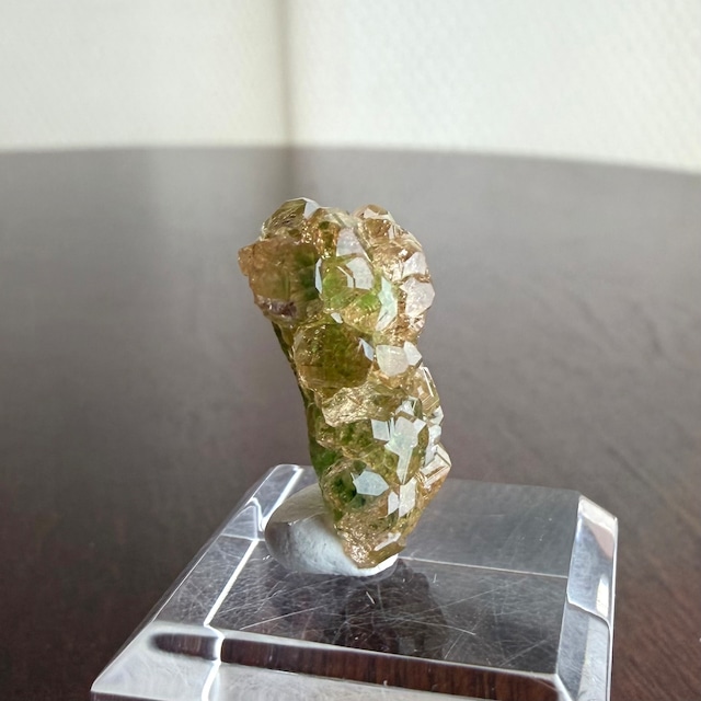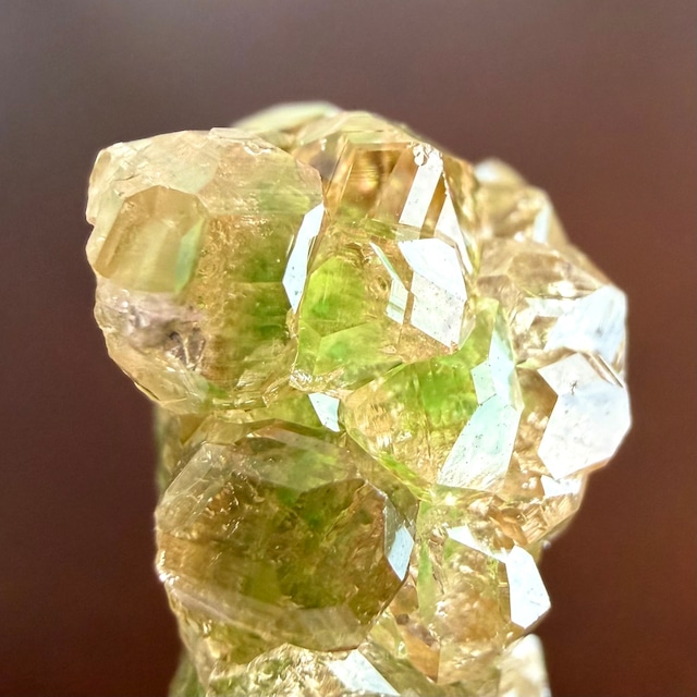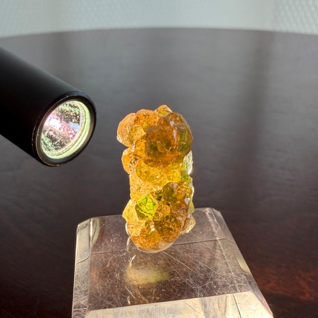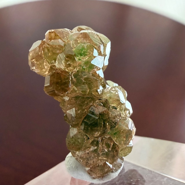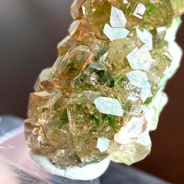 シャンパンカラーのガーネットの内部にグリーンのコアが入るものが複数見られ、通称フロッグエッグタイプとも呼ばれる当該産地で得られるガーネットの中でも珍しい部類に入る結晶です。