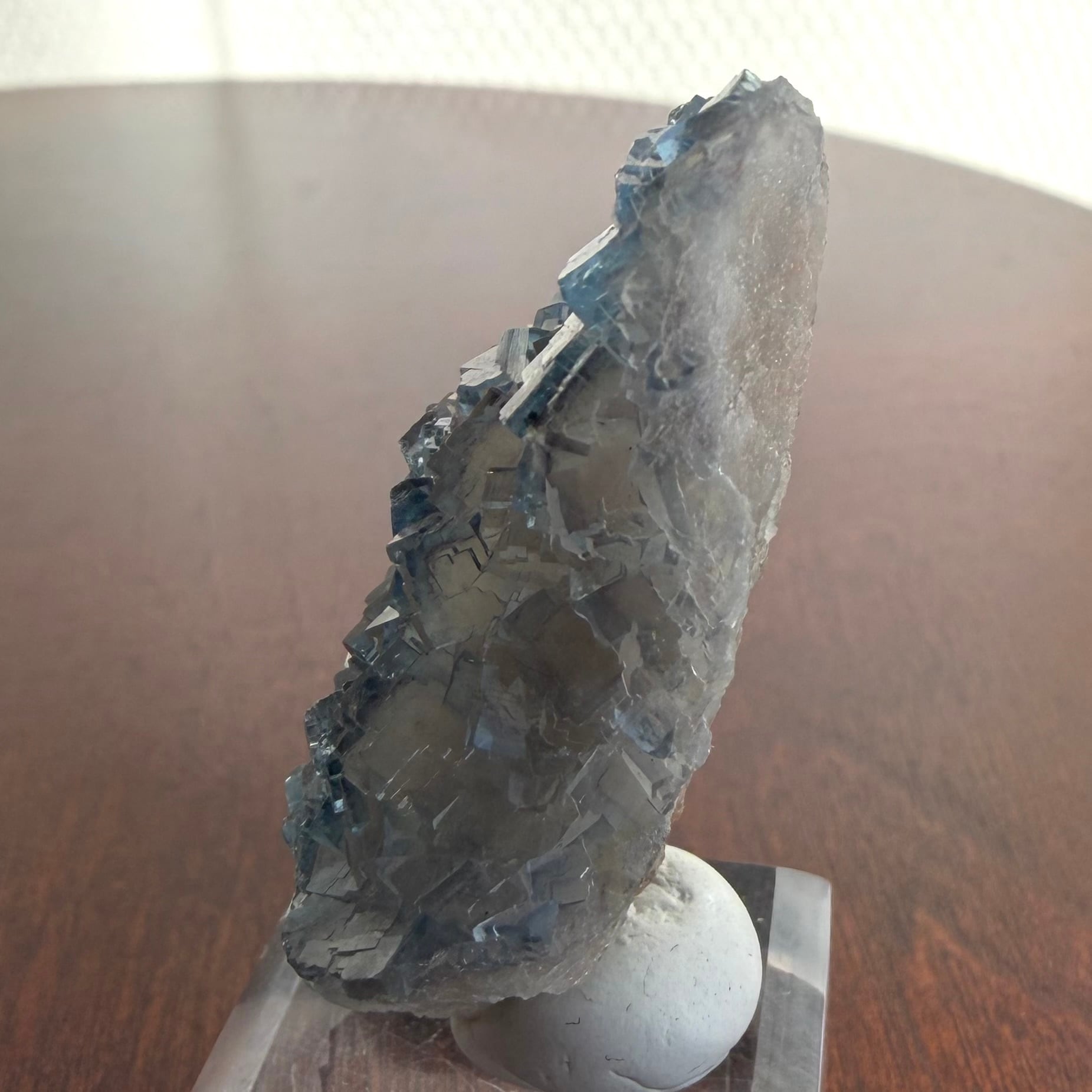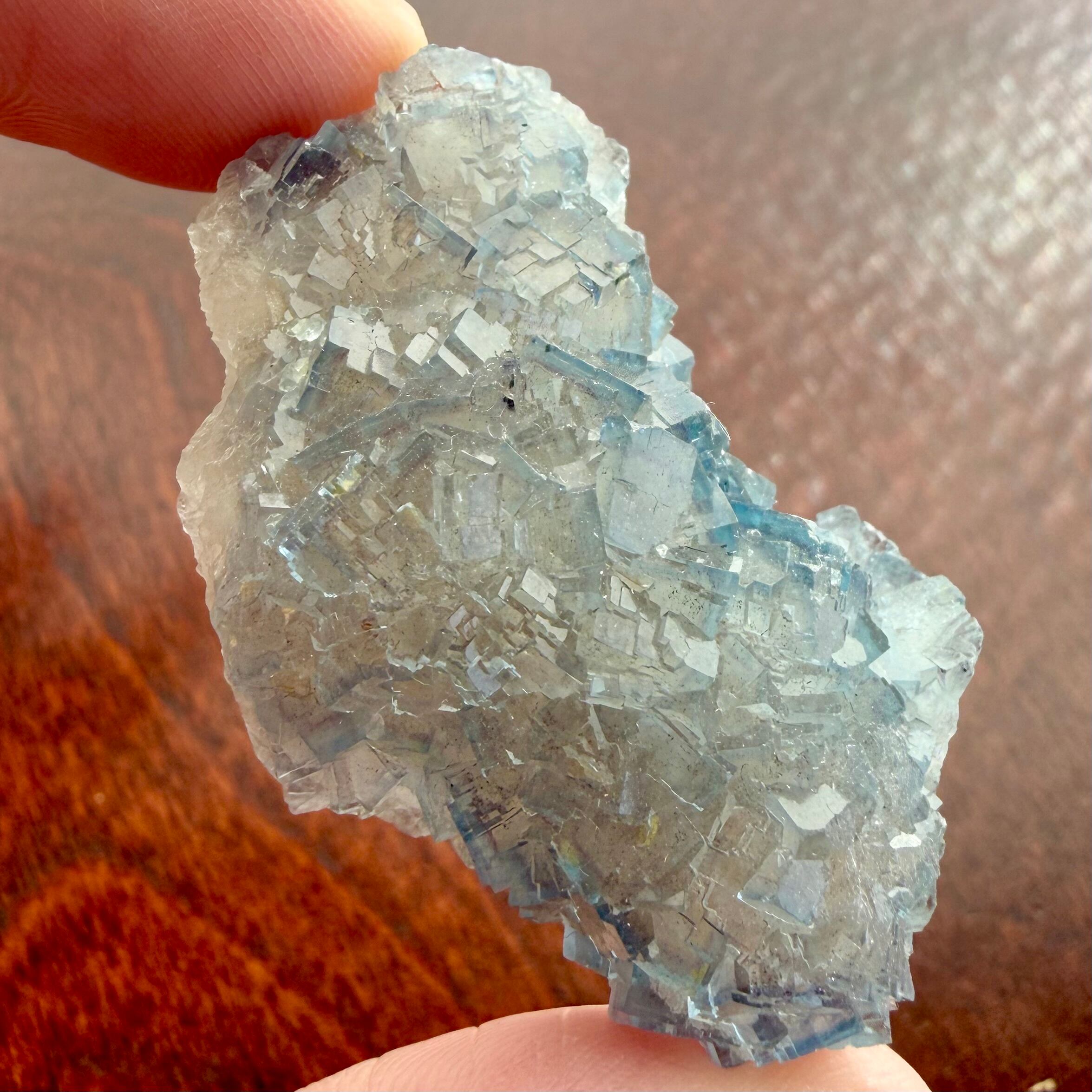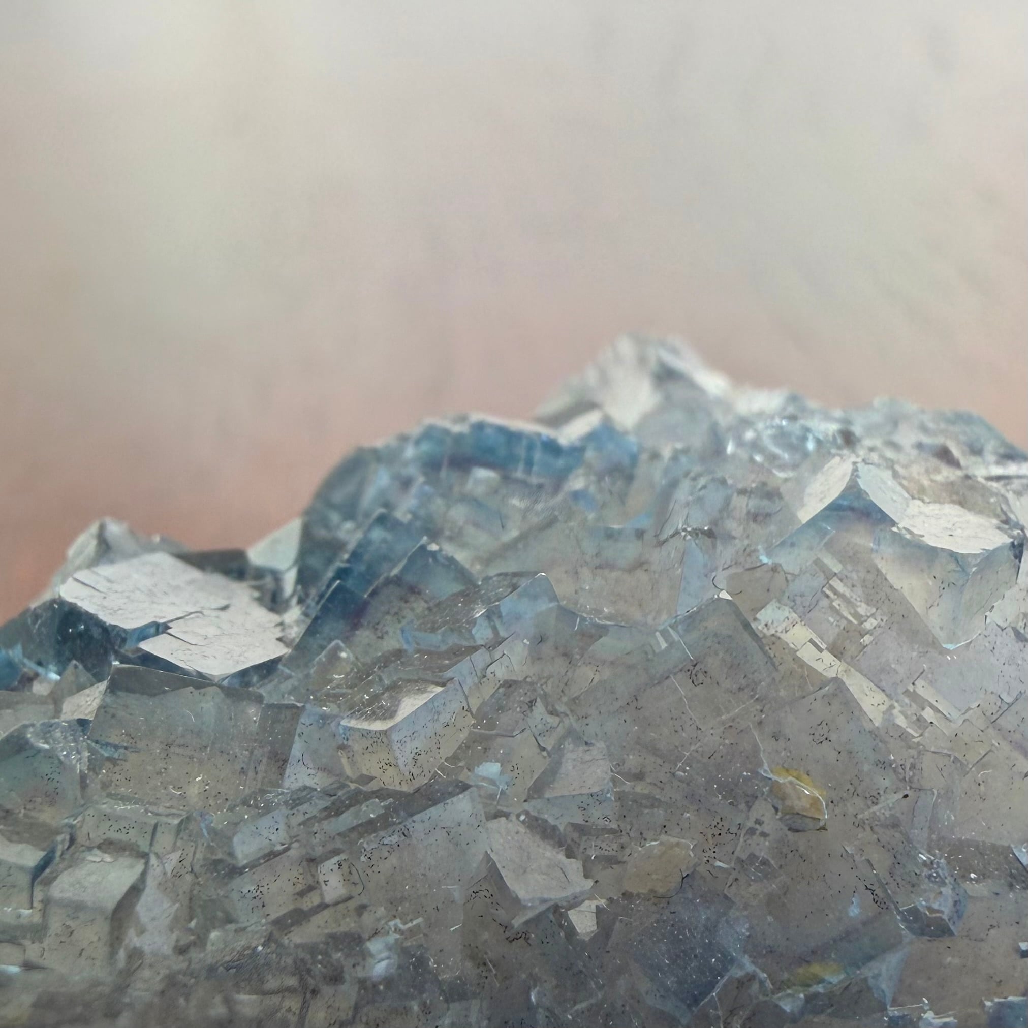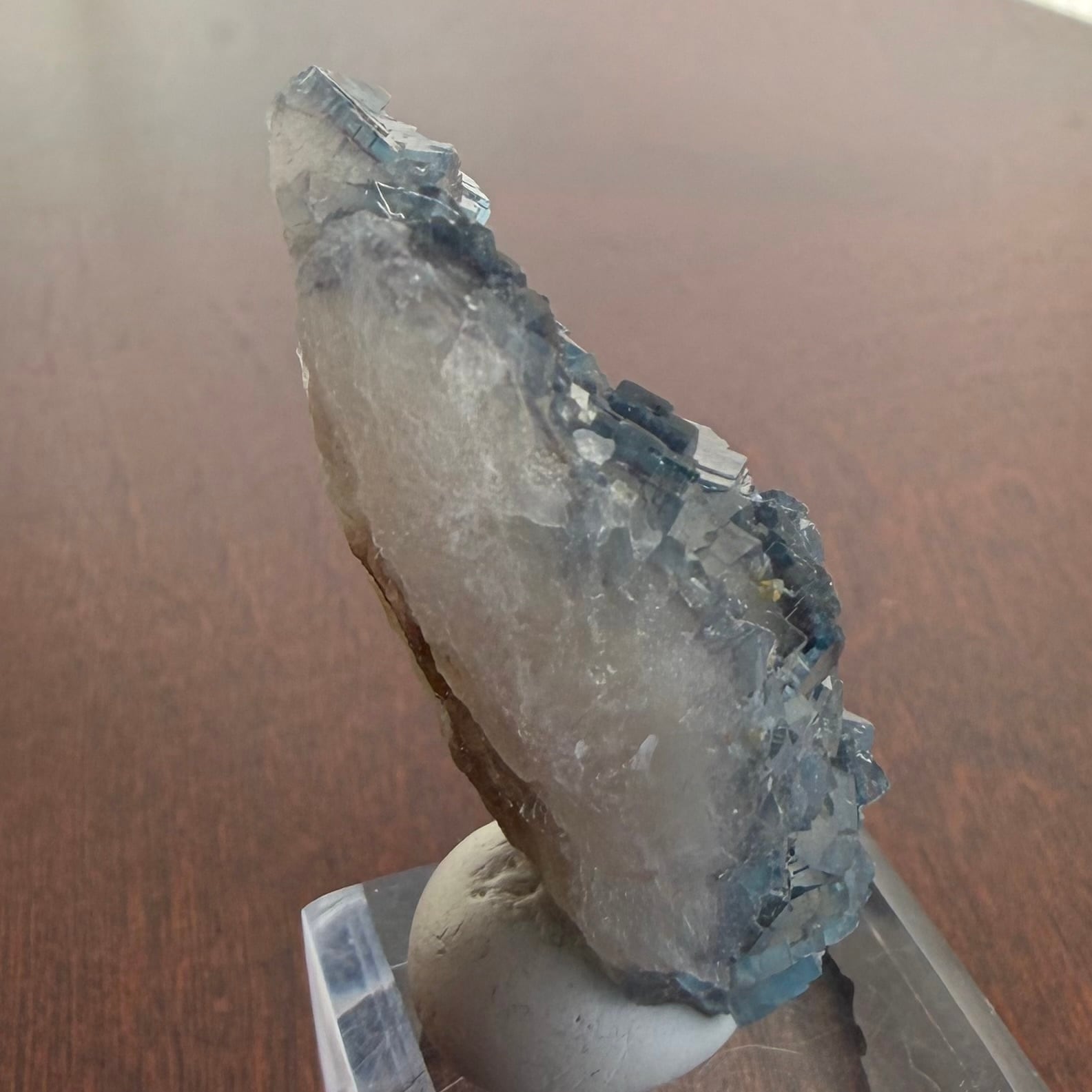 ブルーの発色は淡く、中心部の白っぽい部分がその多くを占めるものの、結晶のエッジ部分は比較的濃いブルーを残す箇所も多く、角度によってはブルーのゾーニングも確認できます。