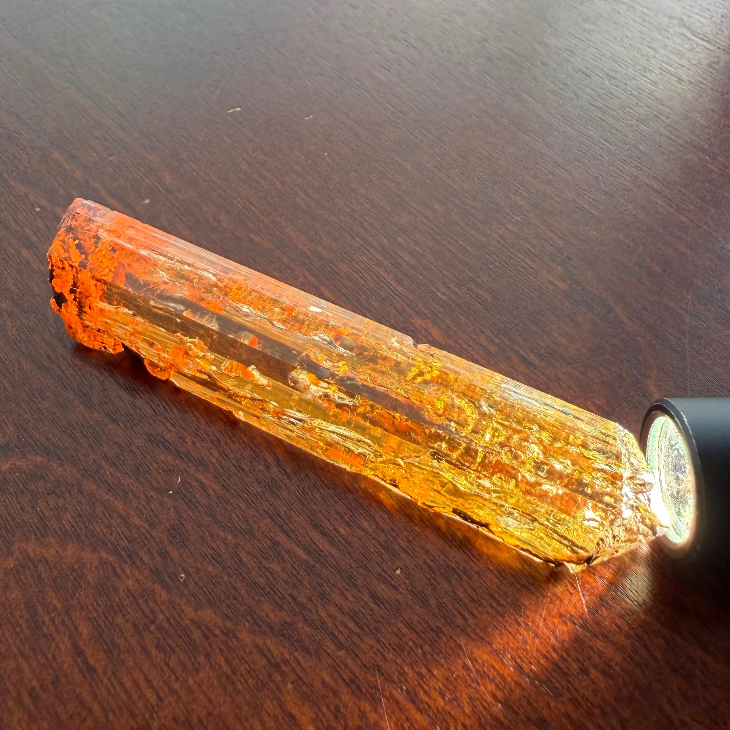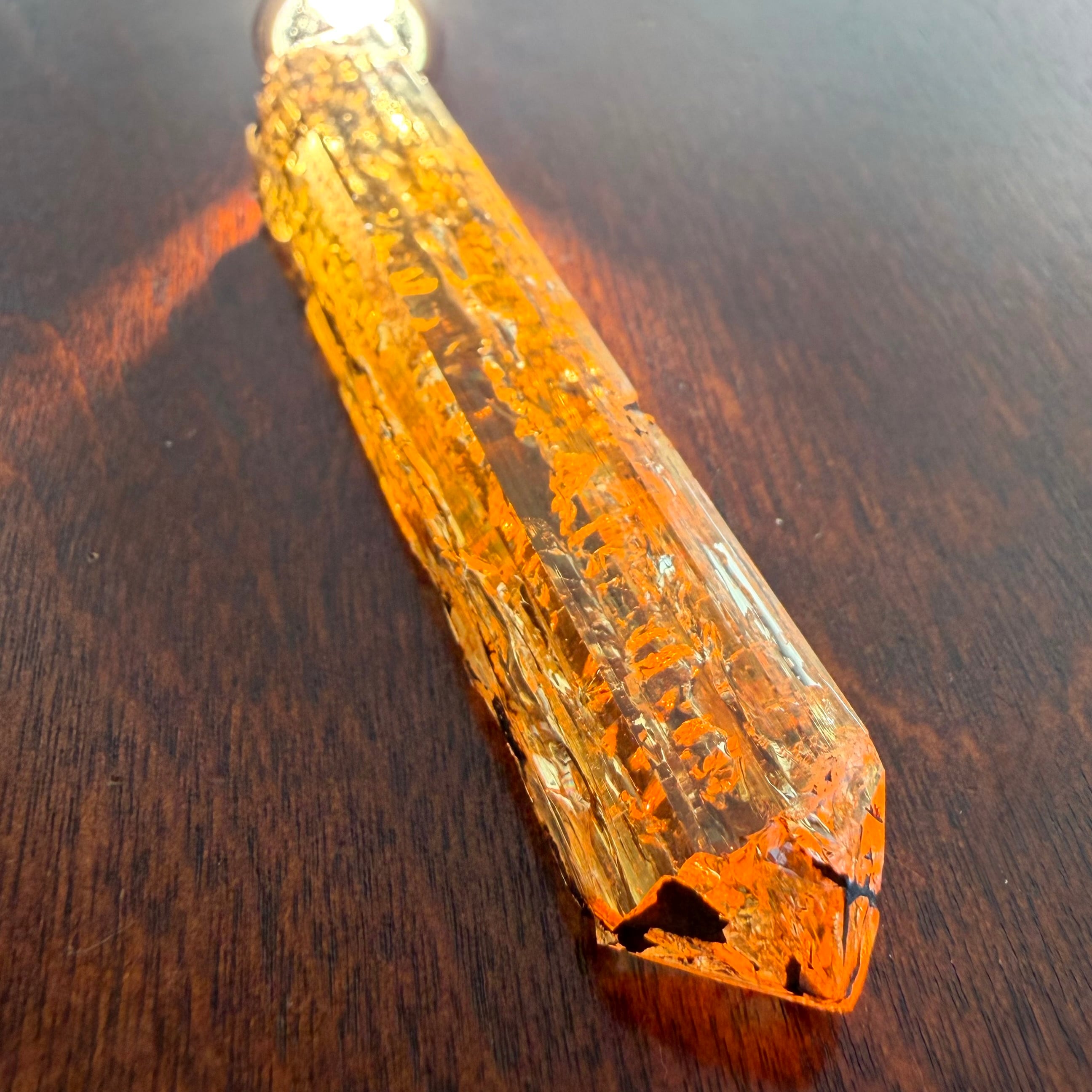 透過光下では強いオレンジの発色が、自然光下ではすっきりとしたオレンジの発色が見られ、クラックが当然ながら入るものの宝石質な結晶であることは間違いありません。