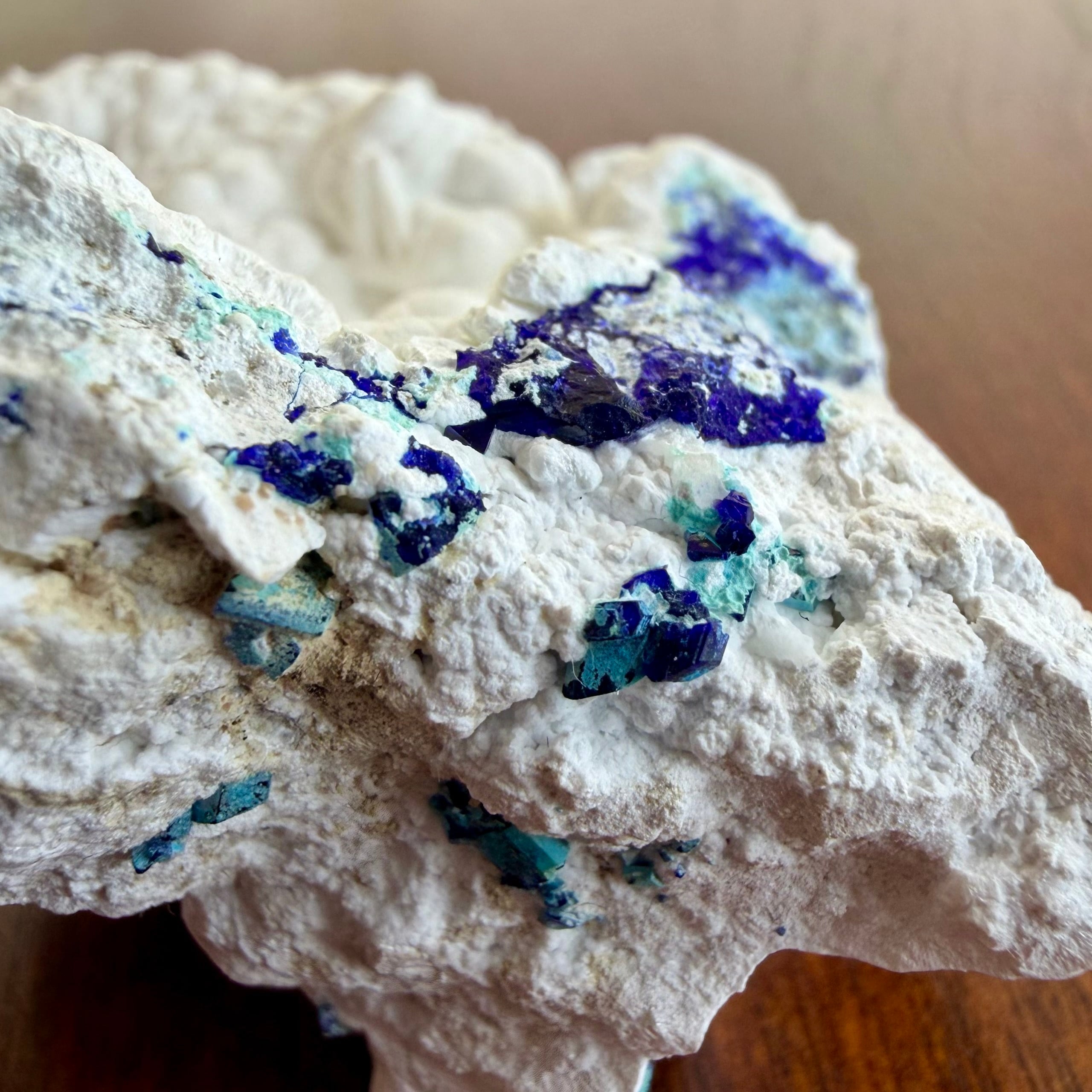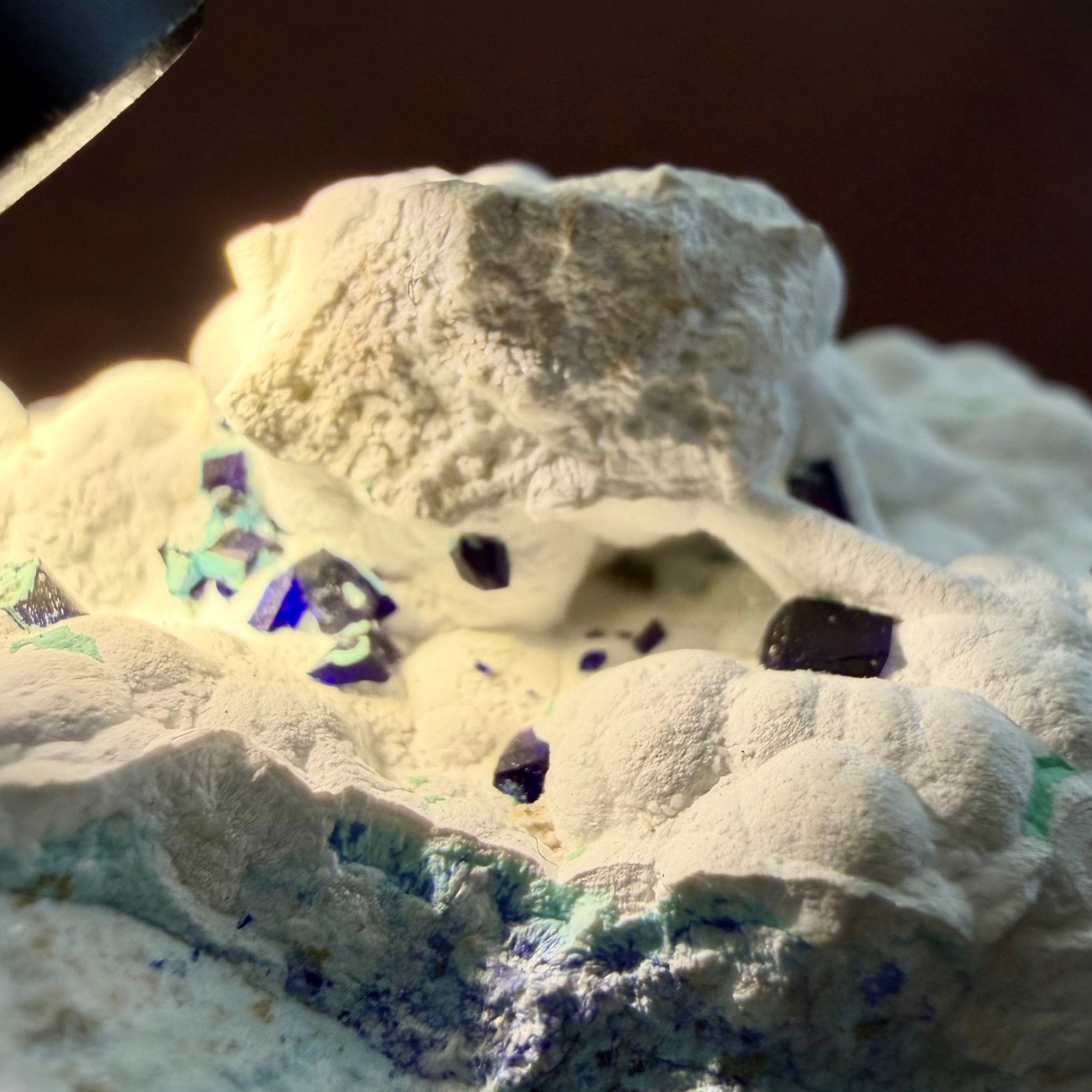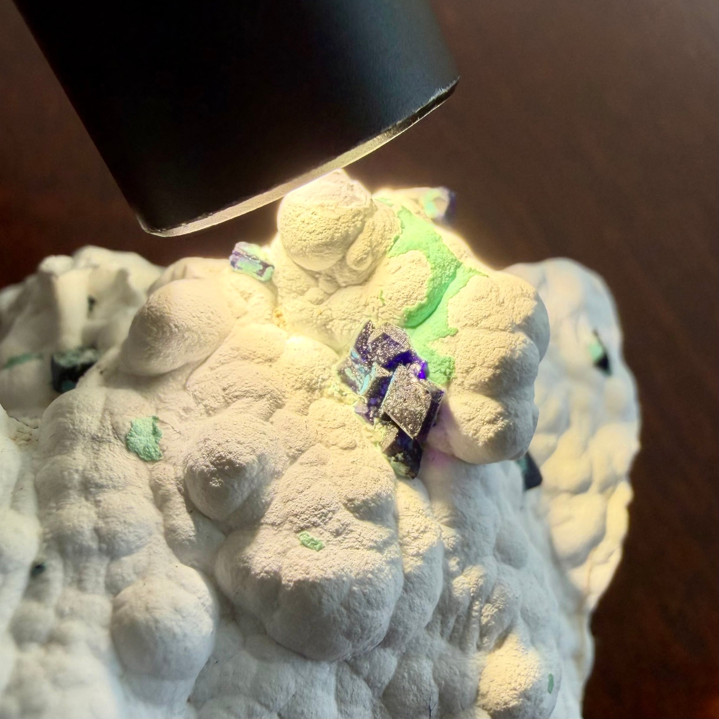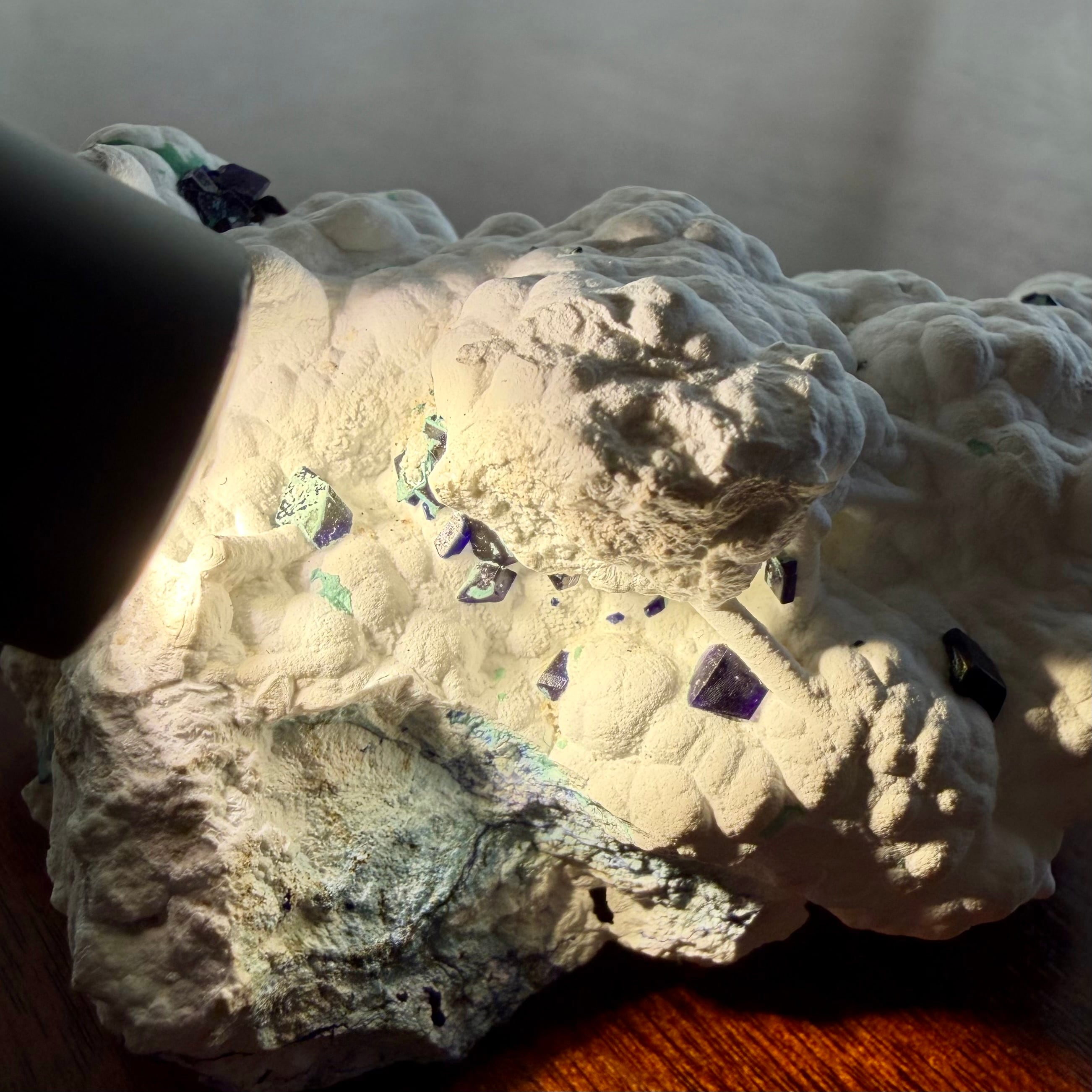 強い透過光下で美しいブルーの発色が確認できますが、自然光下でも結晶表面には微かに青みを感じられます。
