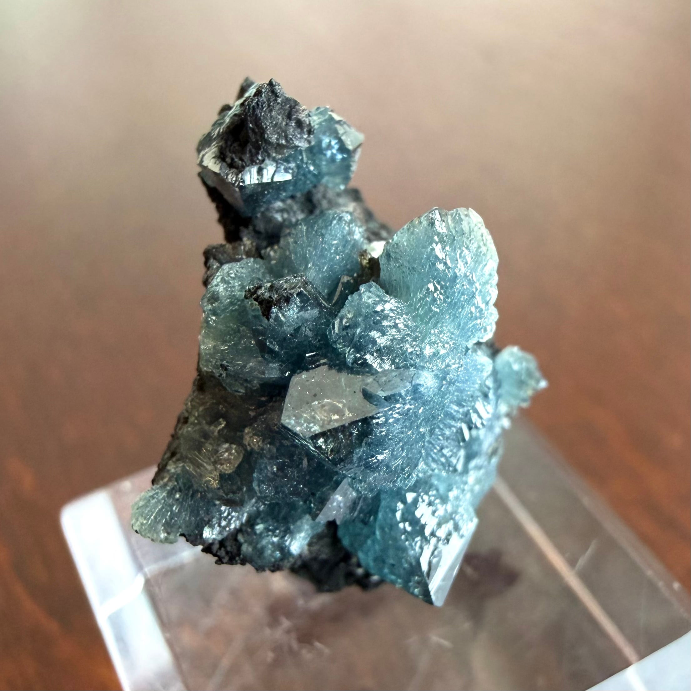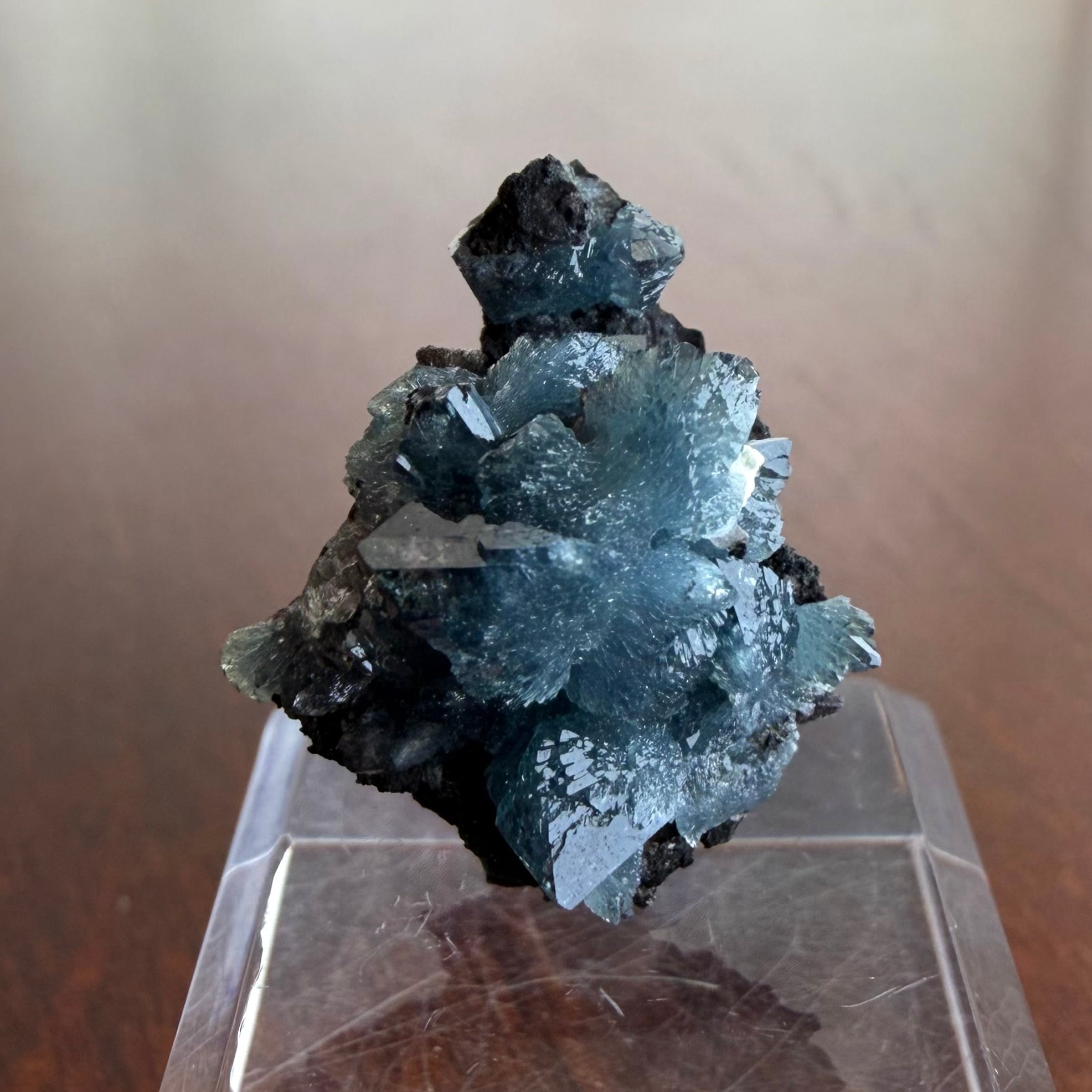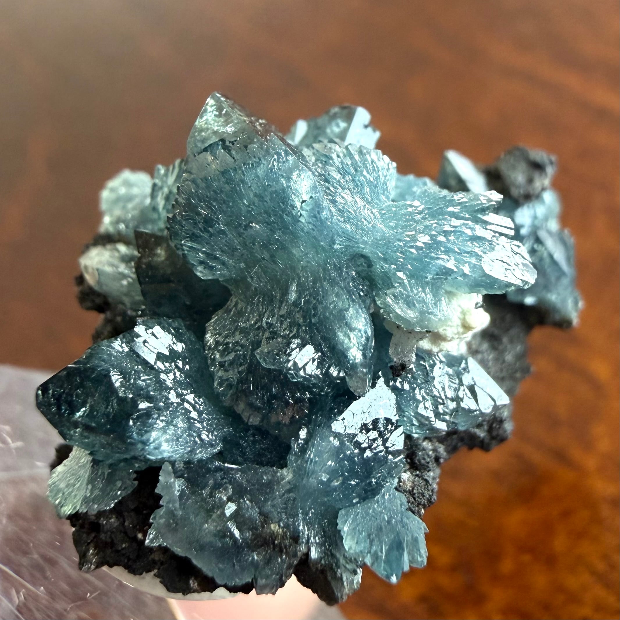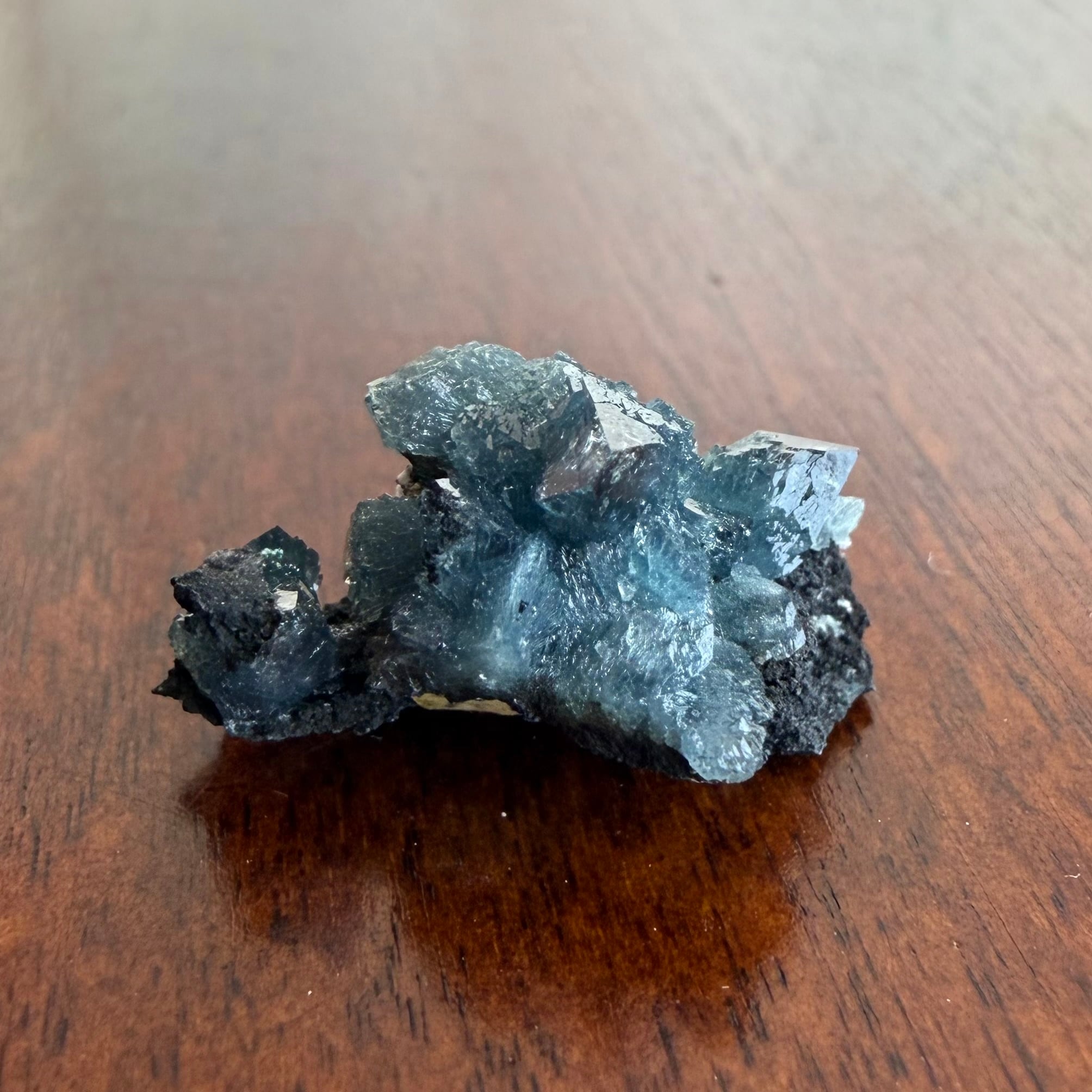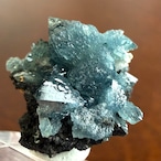 放射状に広がった結晶や、厚みがあって濃いブルーの発色が印象的な部分、母岩が入り組んだ部分と、その小さなサイズ感の中で様々な景色を楽しめる標本です。
