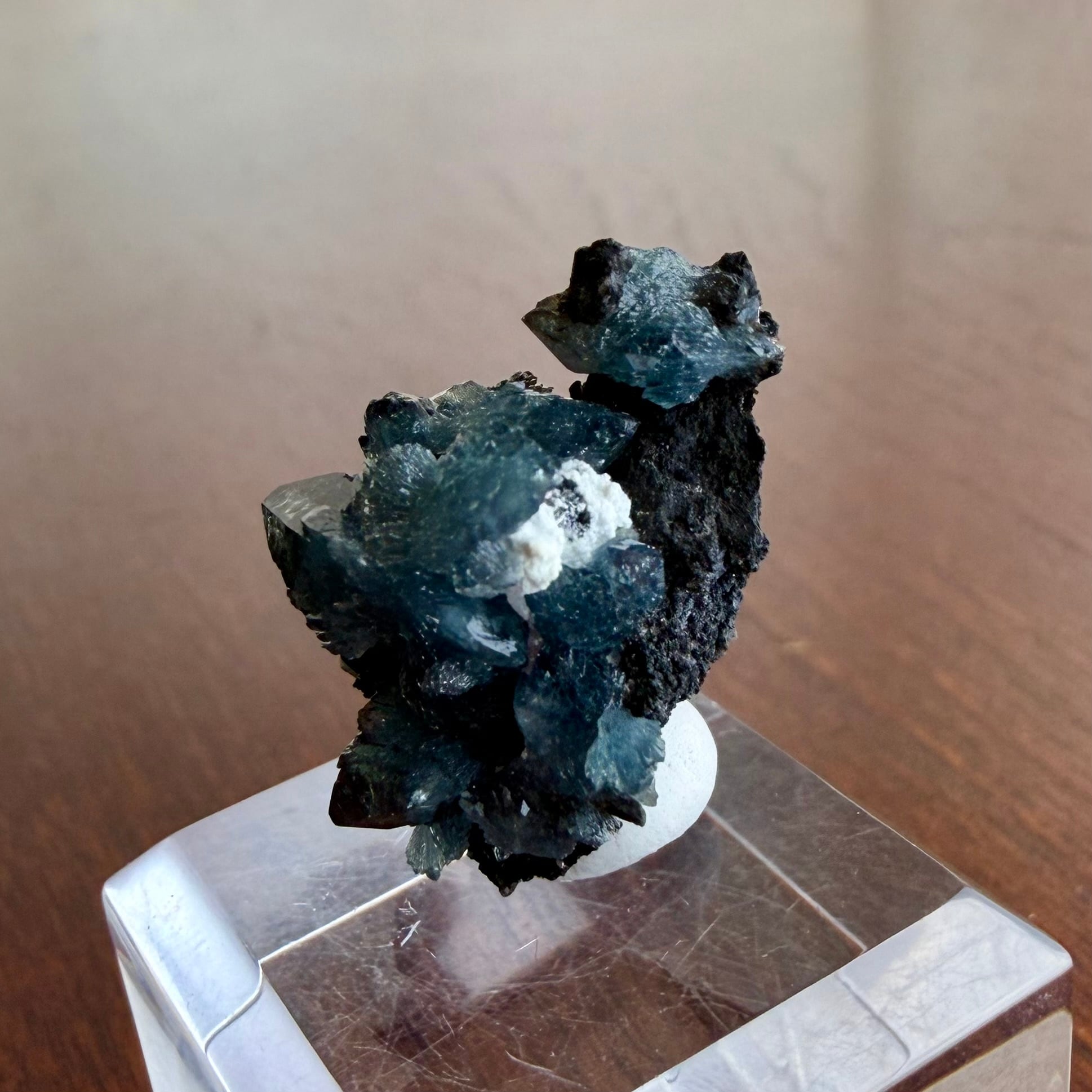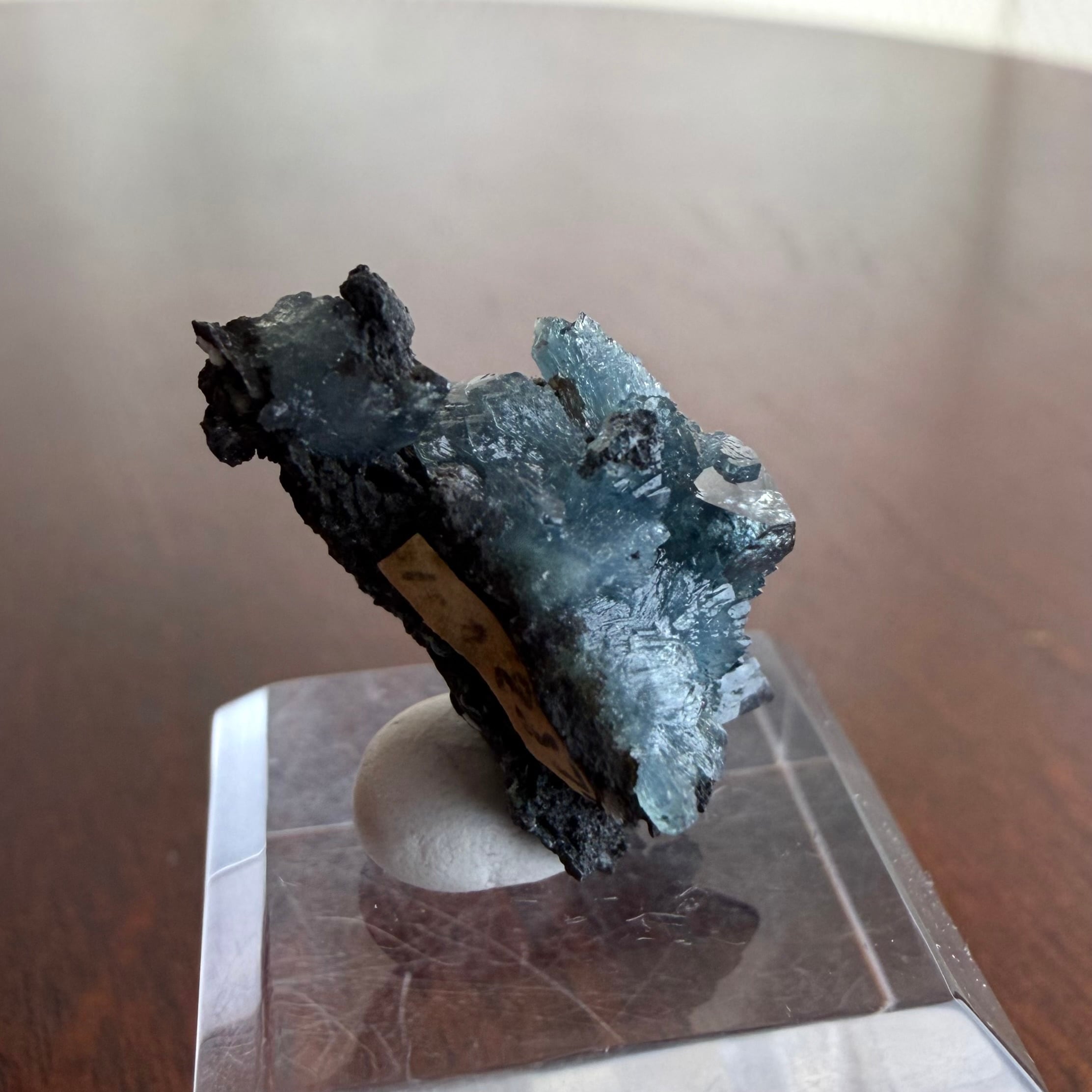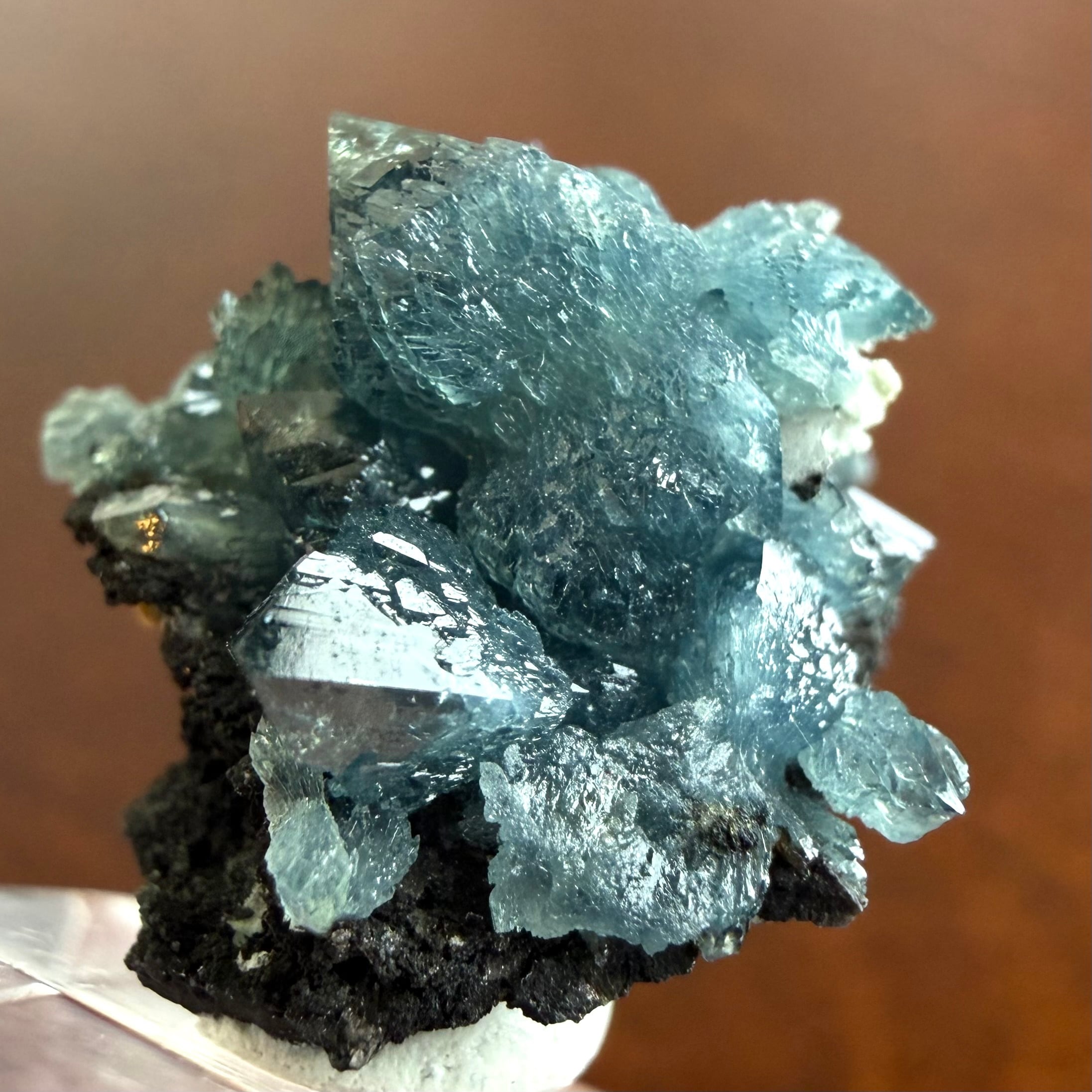 放射状に広がった結晶や、厚みがあって濃いブルーの発色が印象的な部分、母岩が入り組んだ部分と、その小さなサイズ感の中で様々な景色を楽しめる標本です。