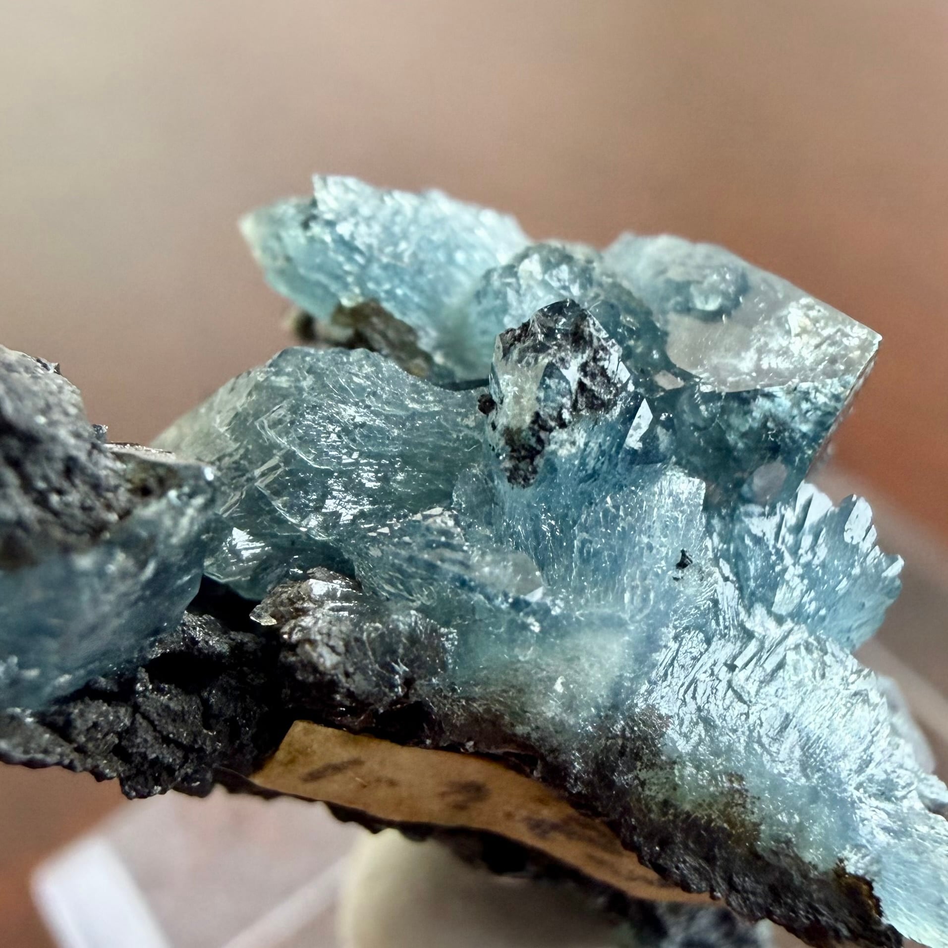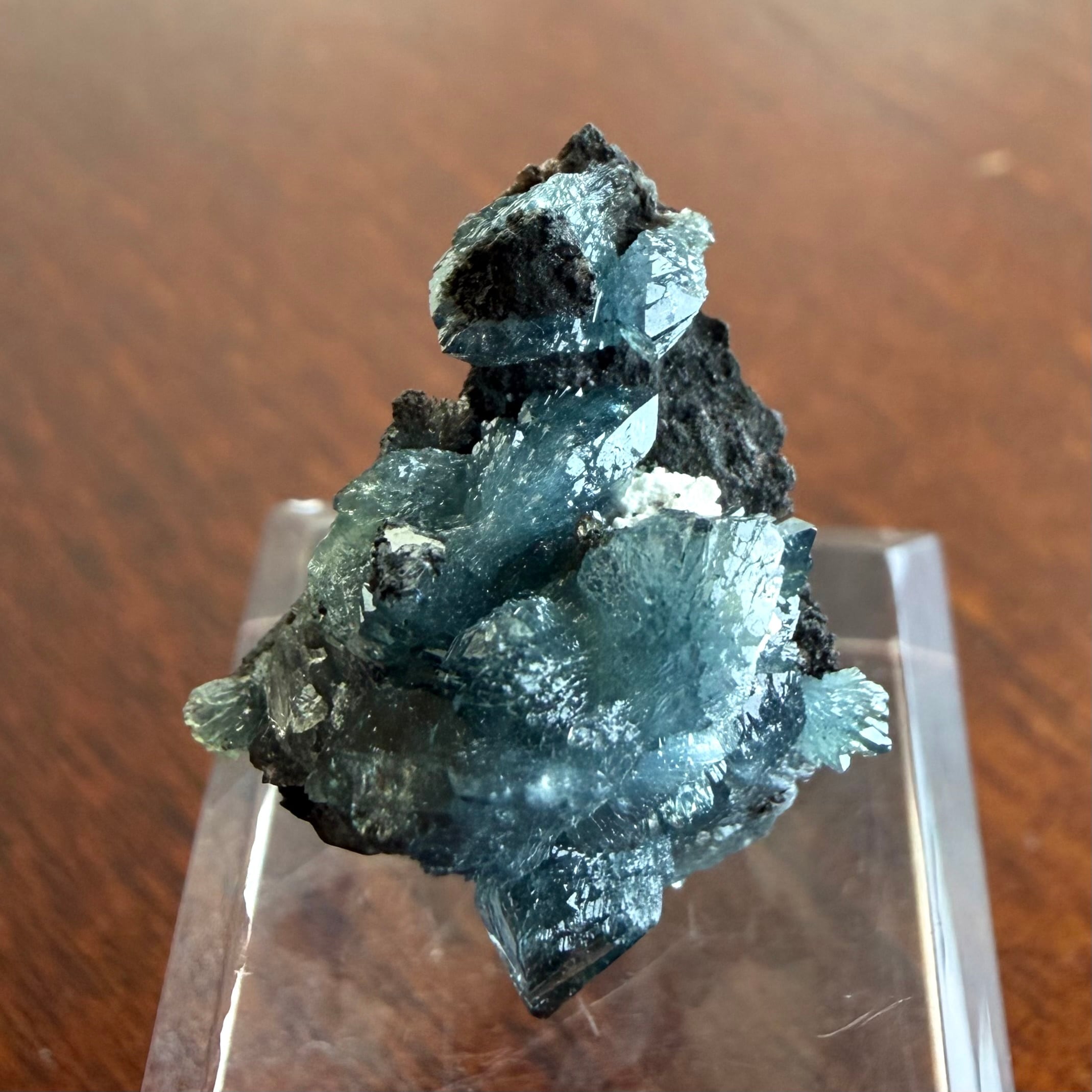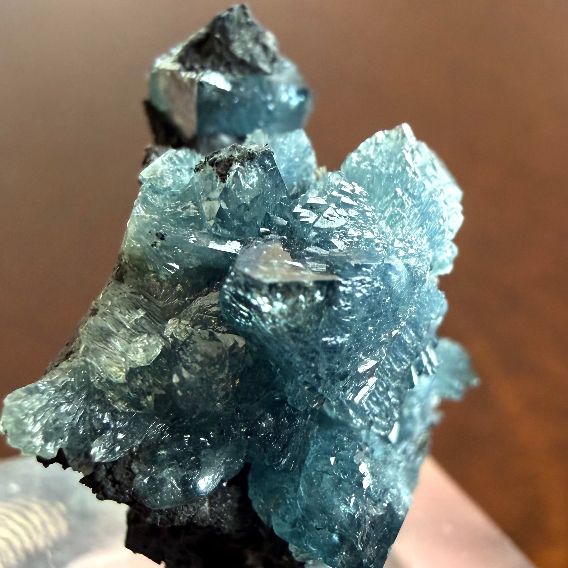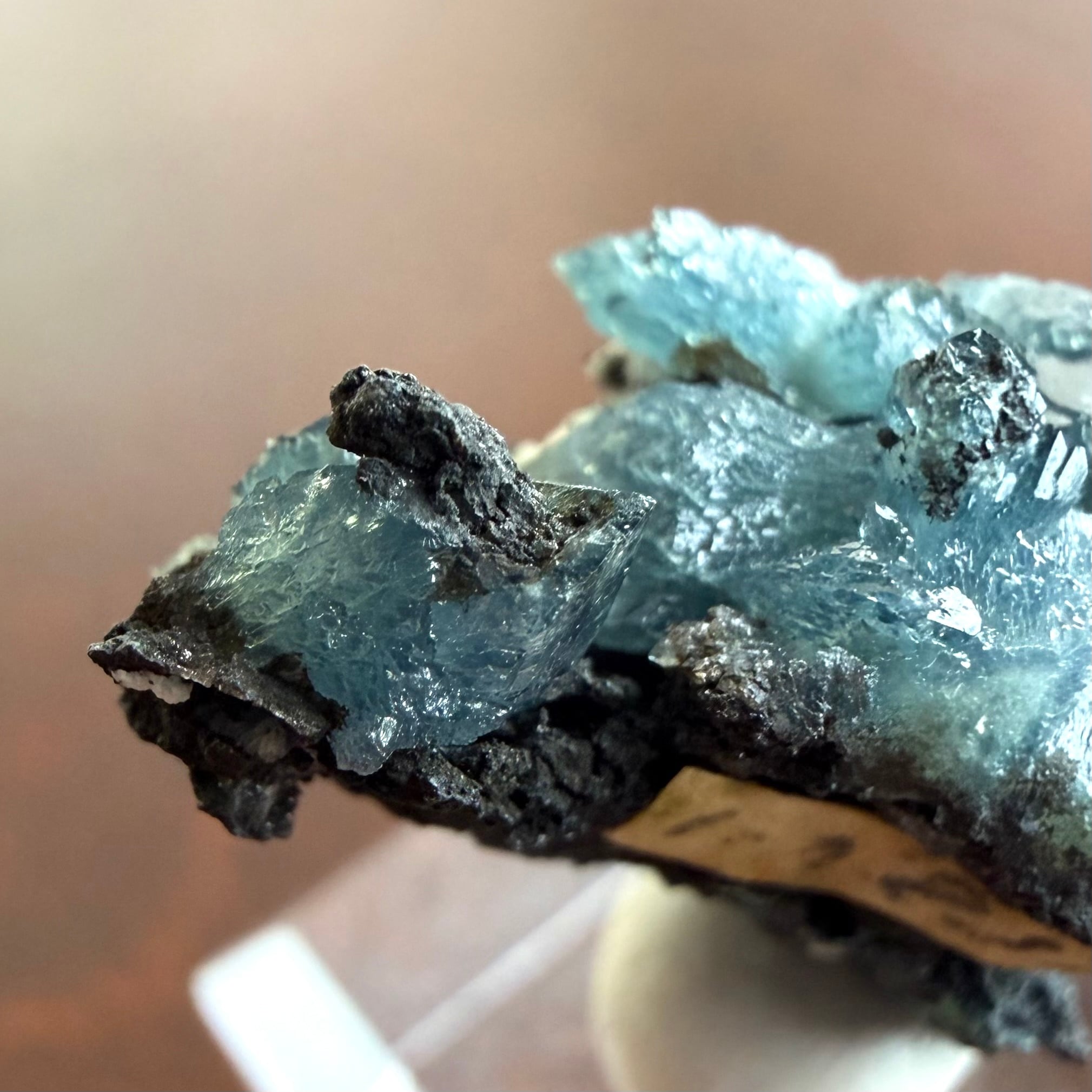 放射状に広がった結晶や、厚みがあって濃いブルーの発色が印象的な部分、母岩が入り組んだ部分と、その小さなサイズ感の中で様々な景色を楽しめる標本です。