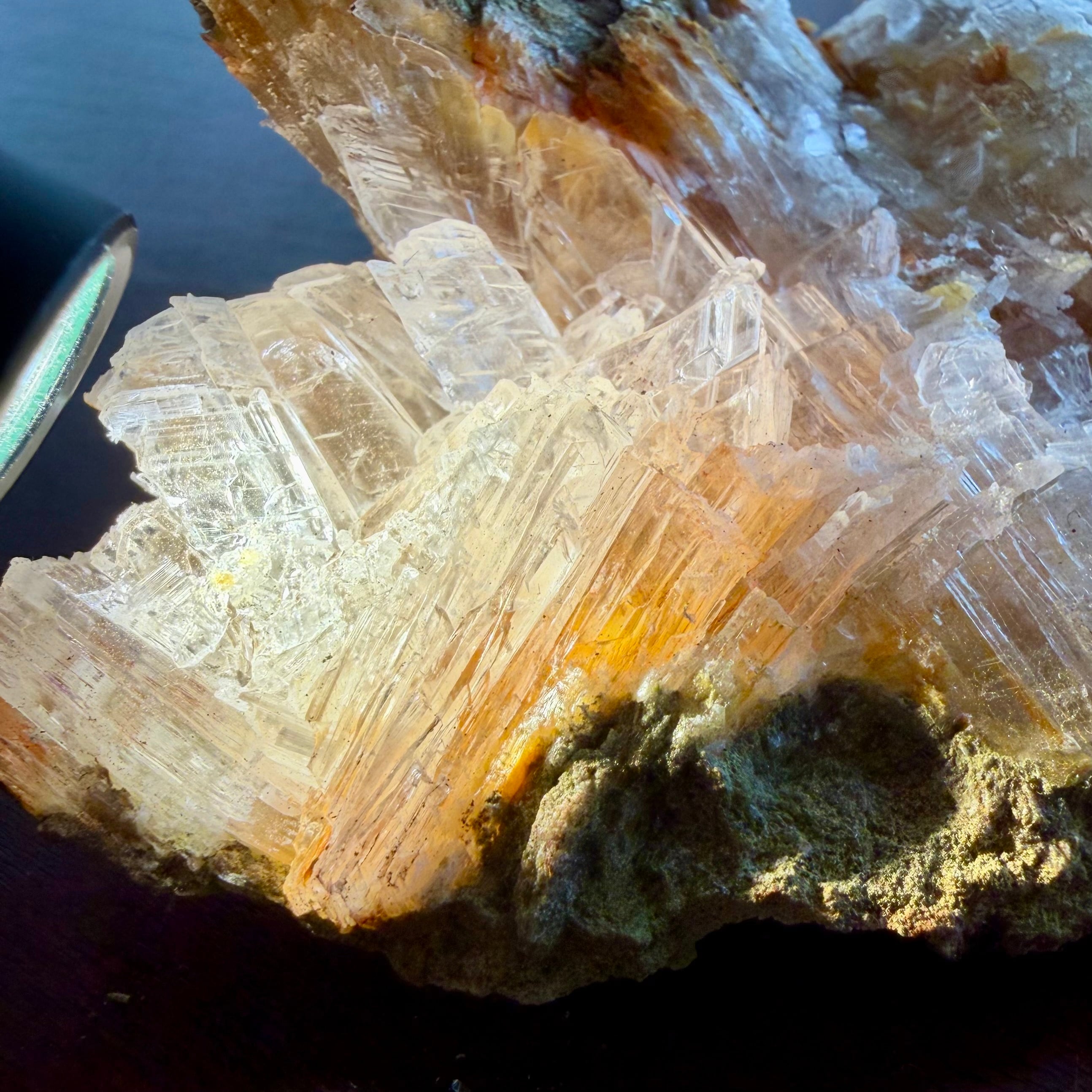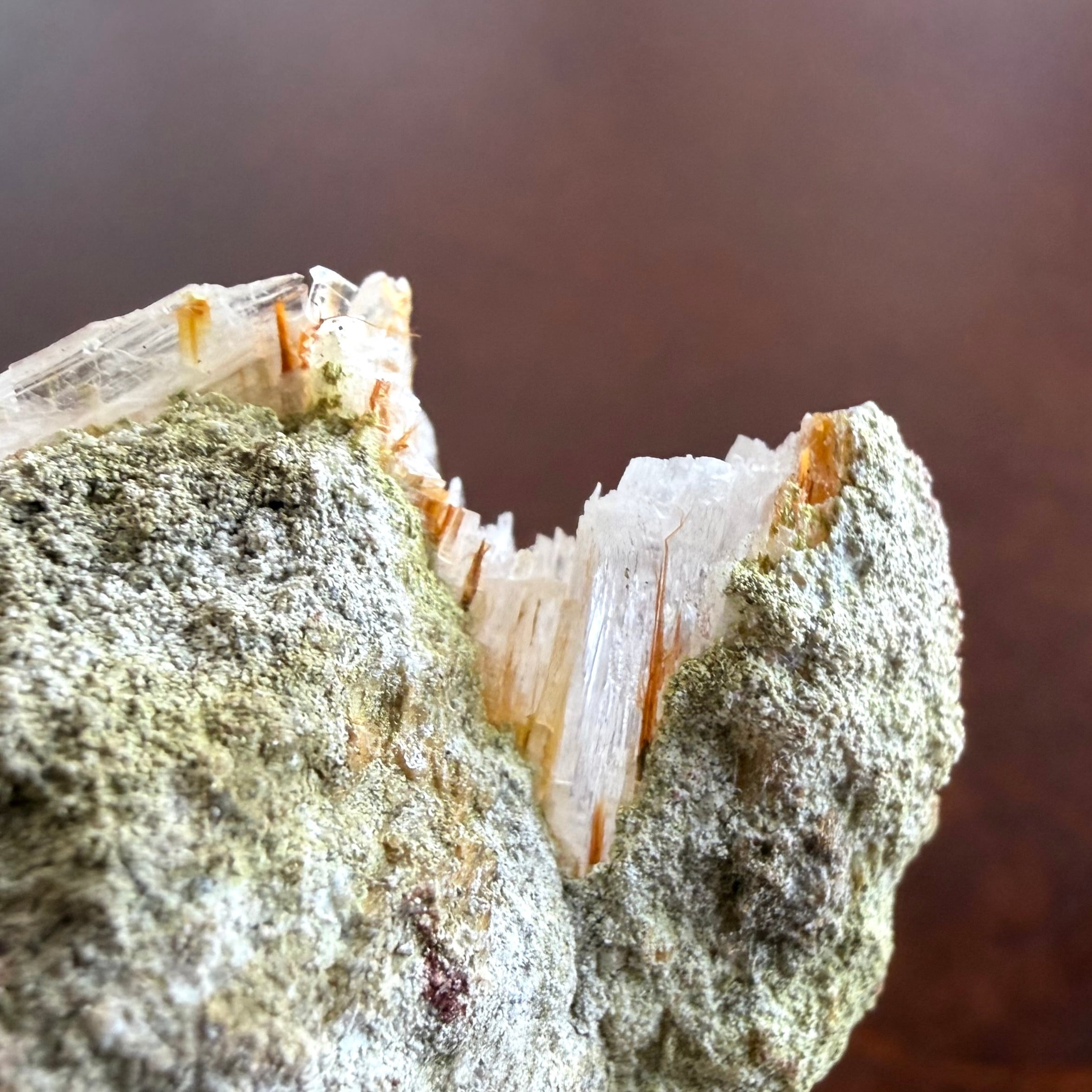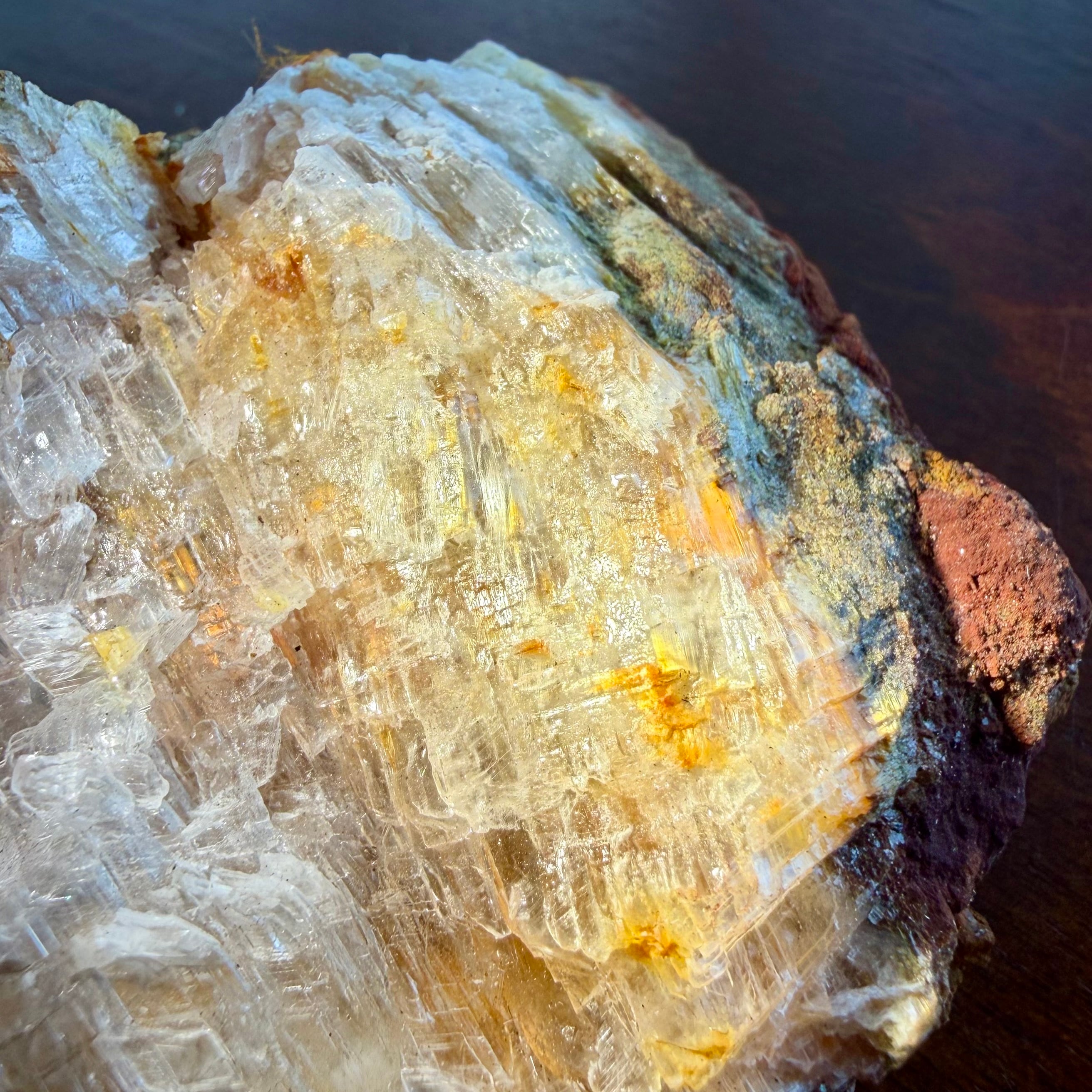 クリアなジプサムとオレンジ色のラドロッカイトのコンビネーションです。