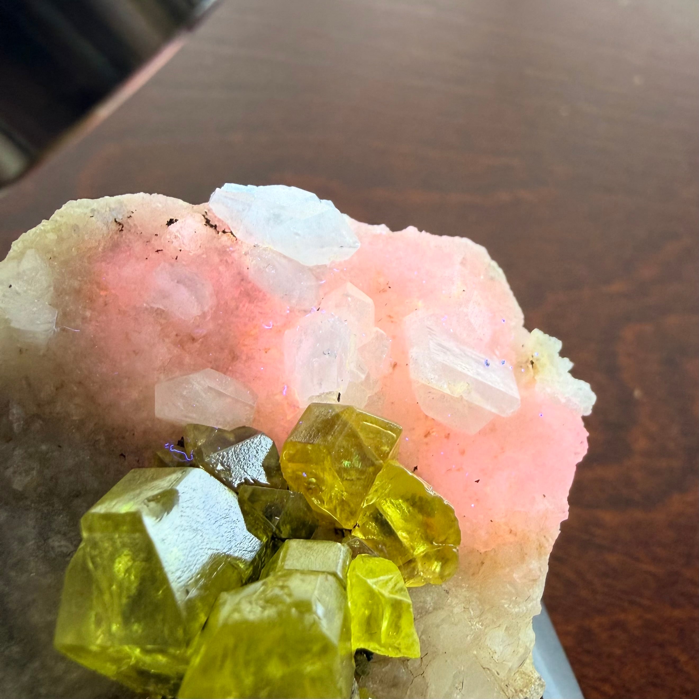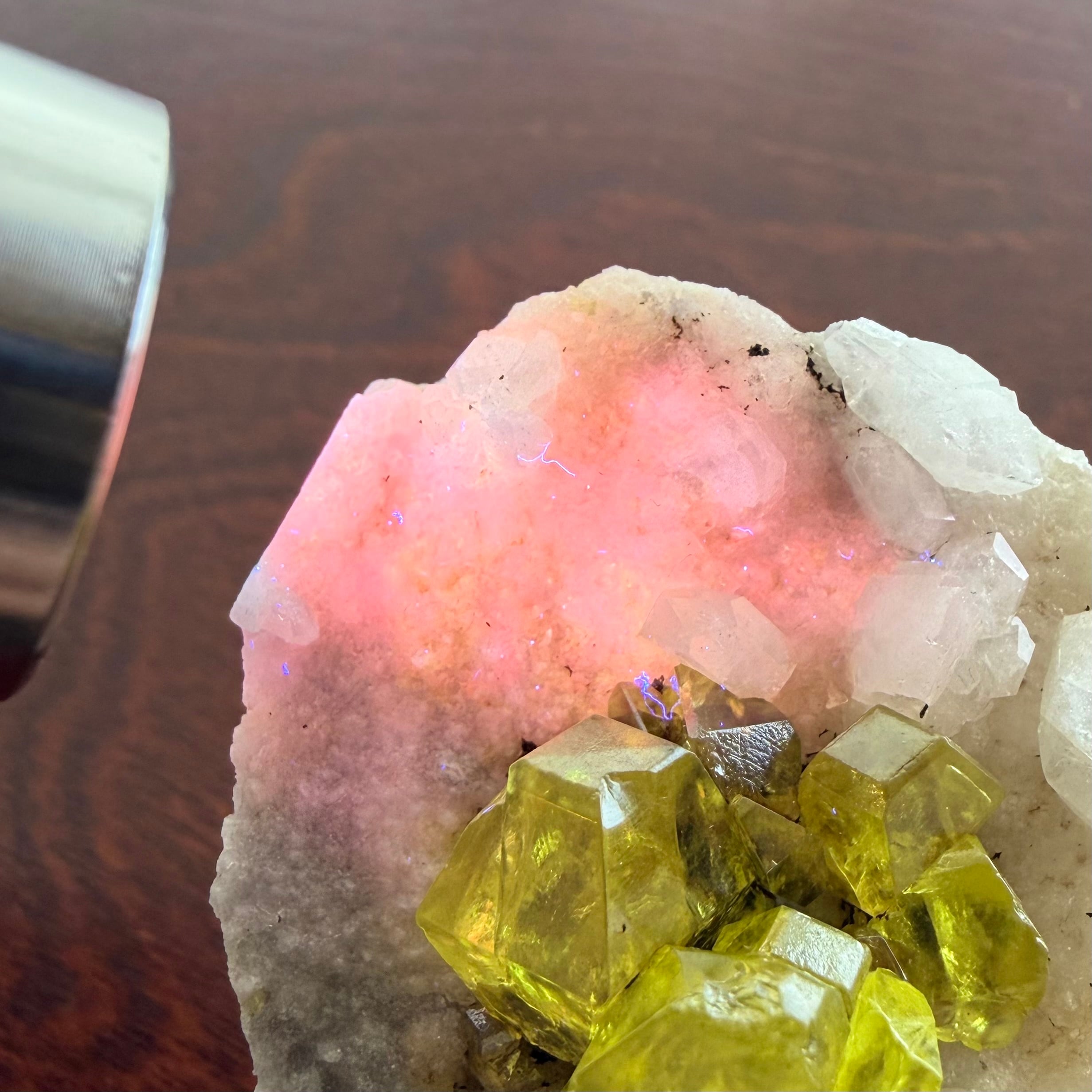 結晶周りの白い部分がアラゴナイトでピンクの傾向が見られ、蛍光しない白い結晶はセレスティン等が考えられそうです。
