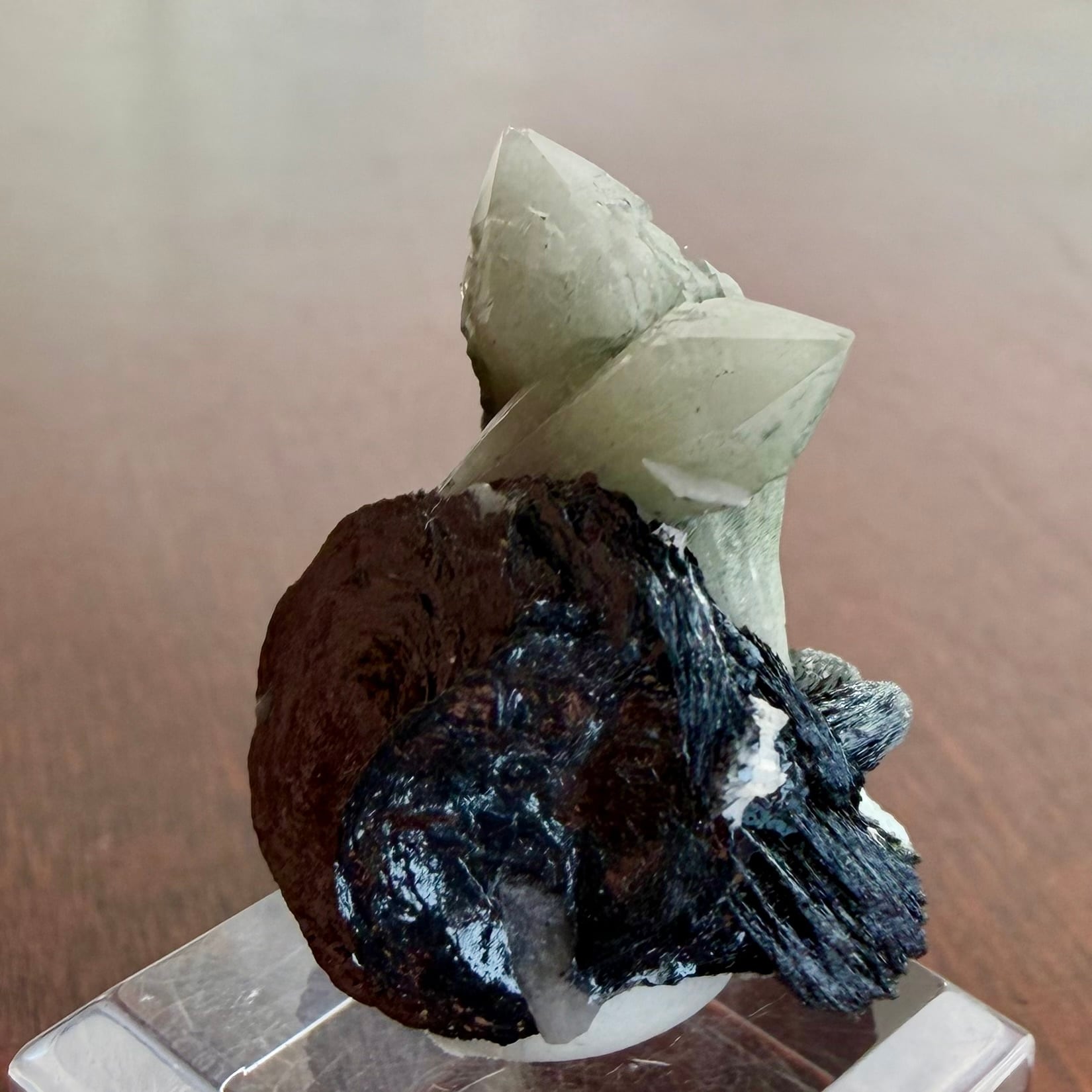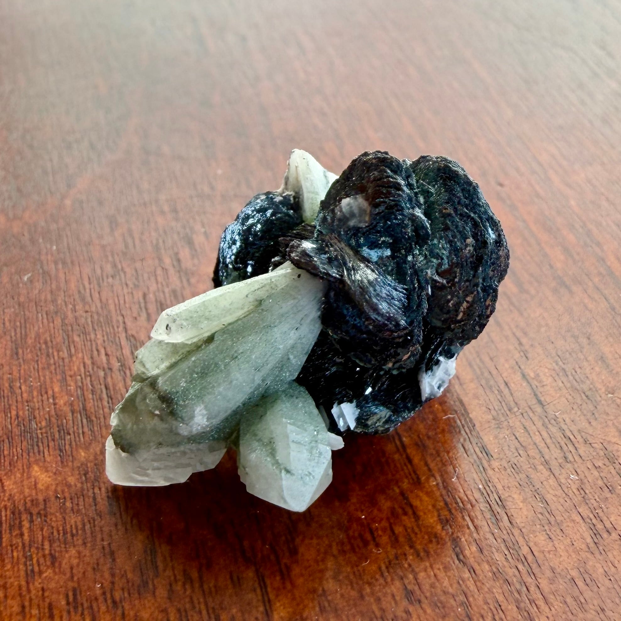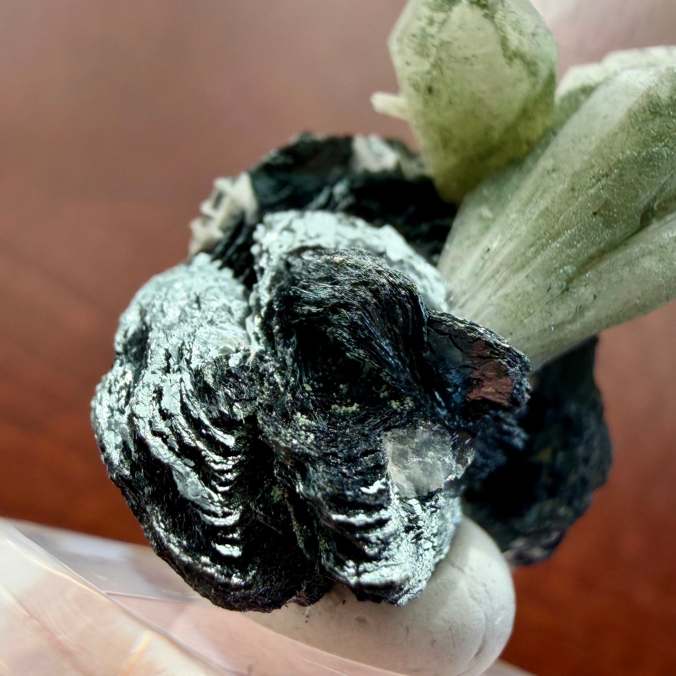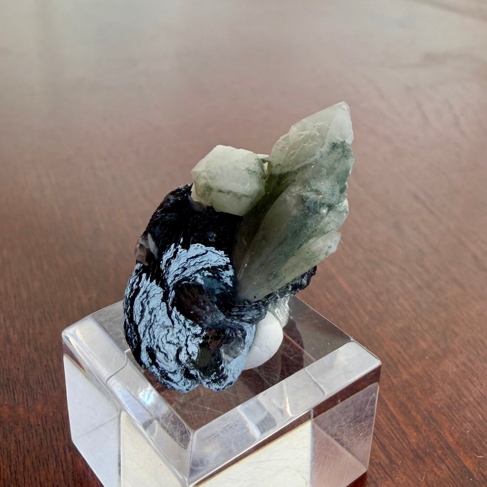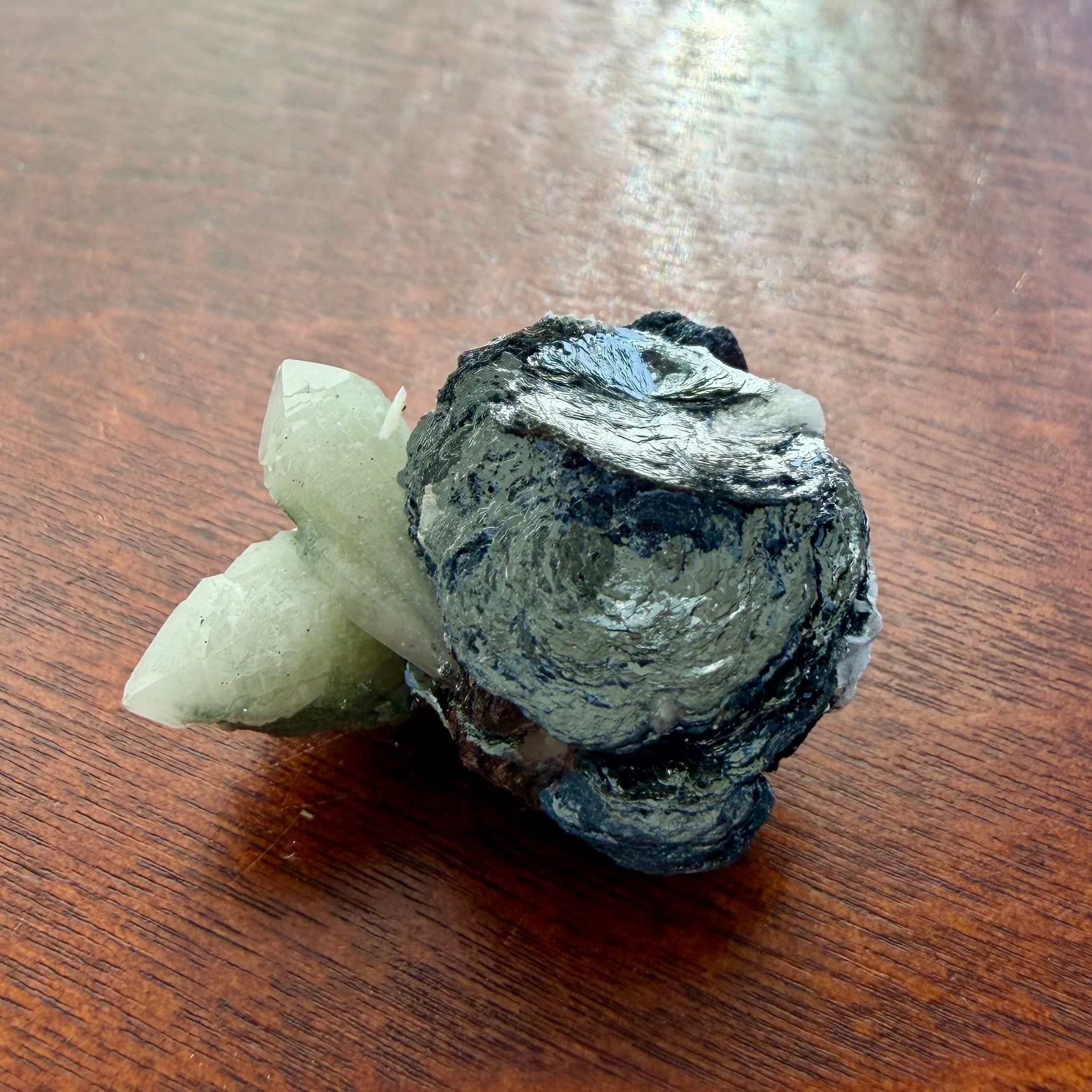 クローライト付着・内包由来と思われるグリーン発色のクォーツと、テリが強く折り重なった層状のヘマタイトとのバランスが非常にいい標本で、ぎりぎりサムネイルサイズに収まる座りの良い標本です。