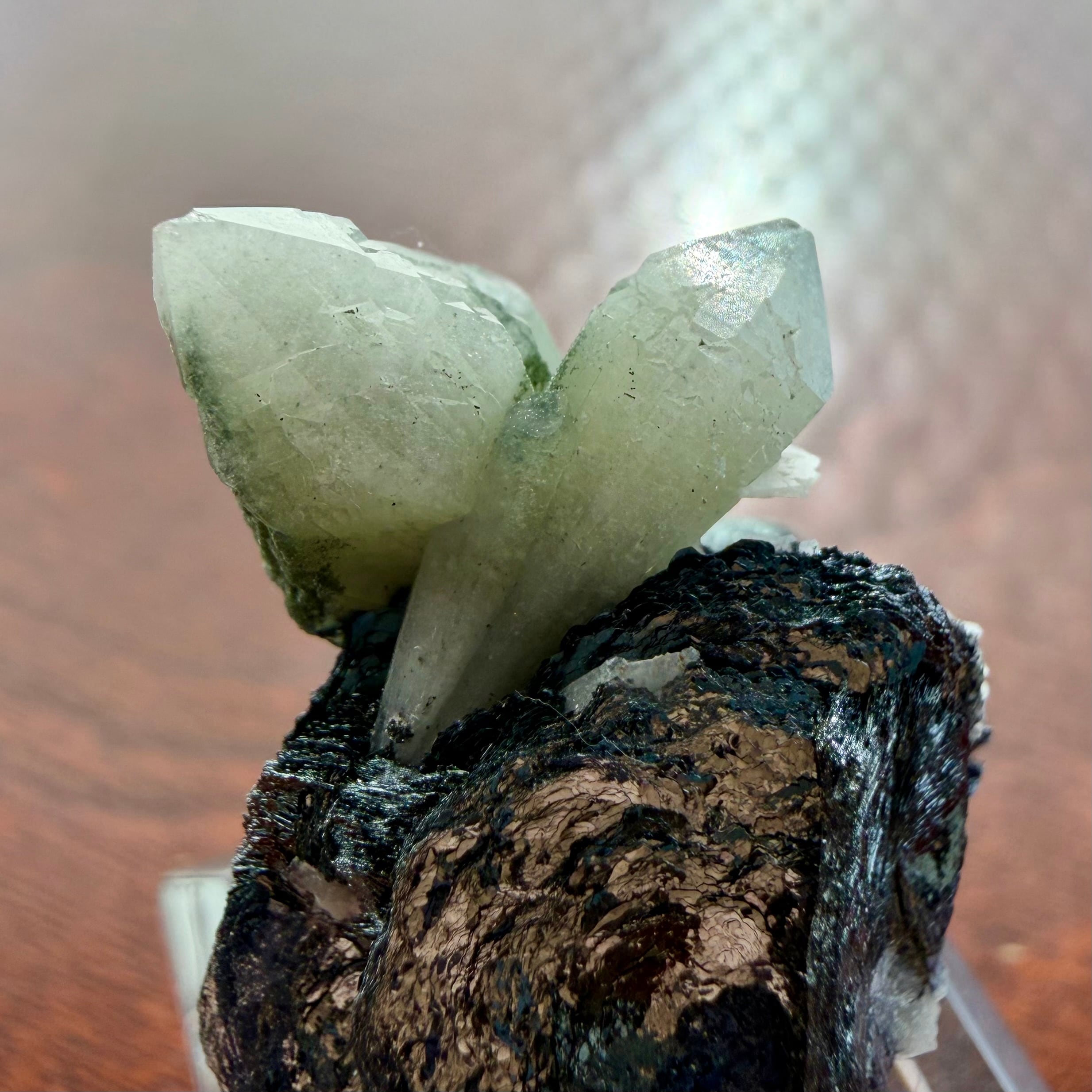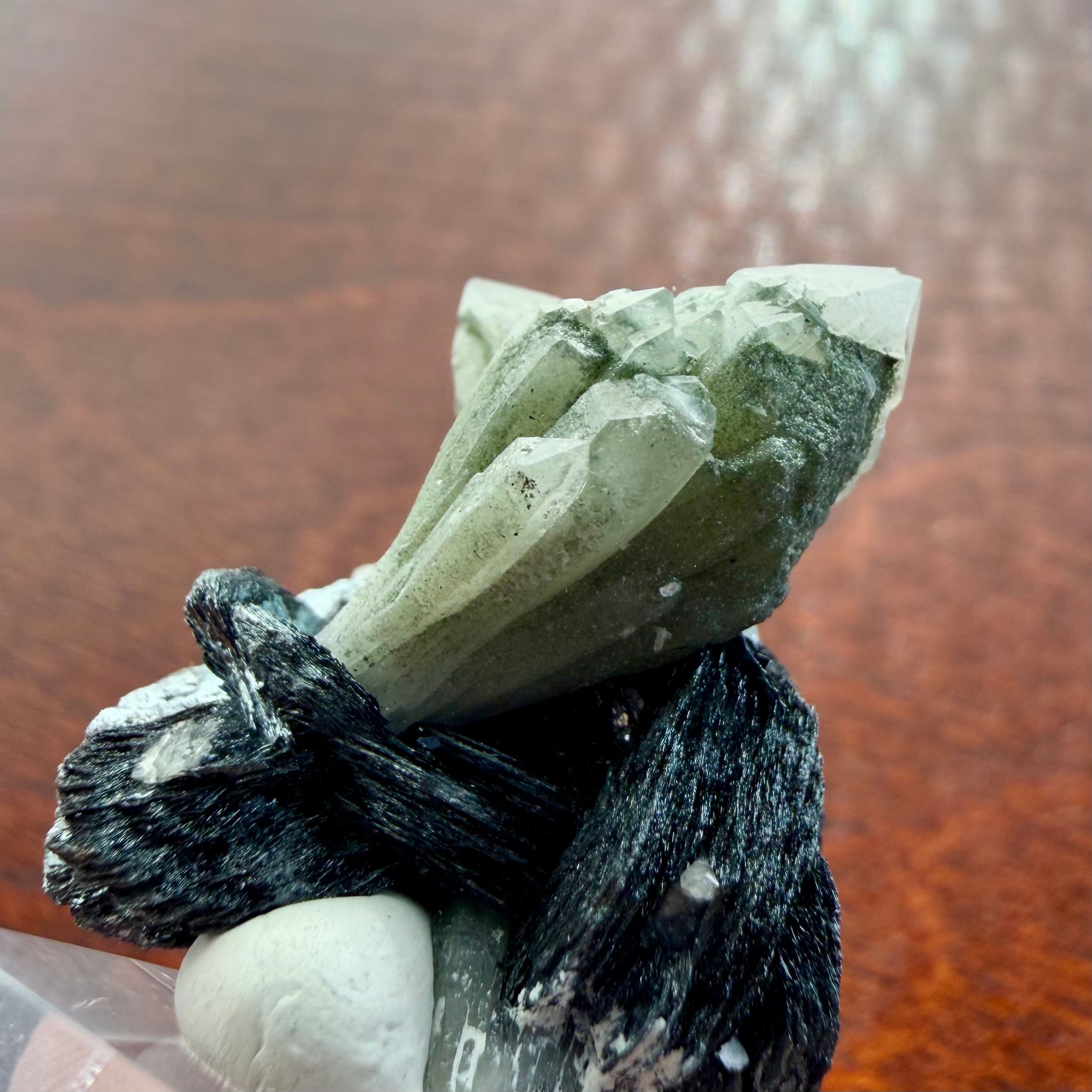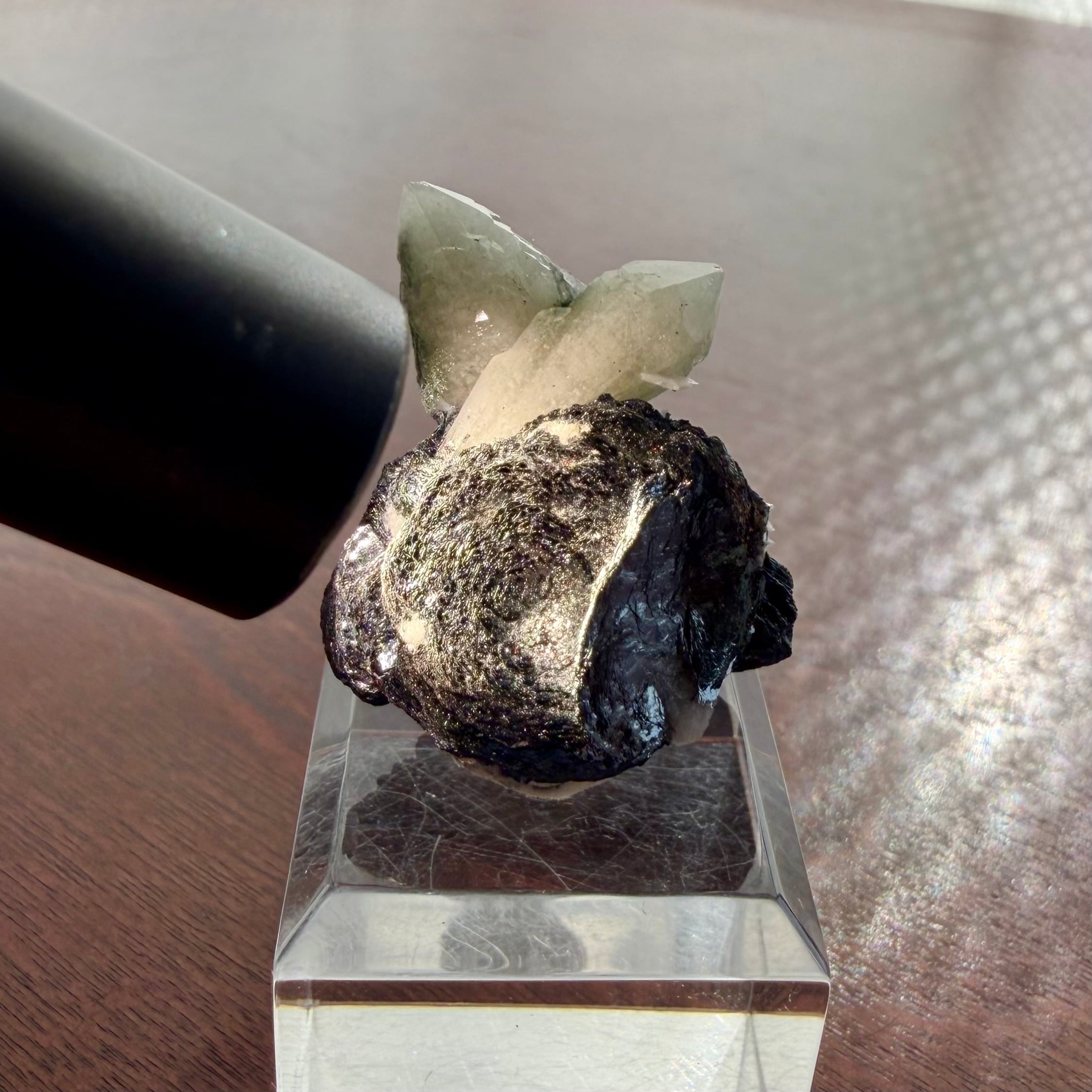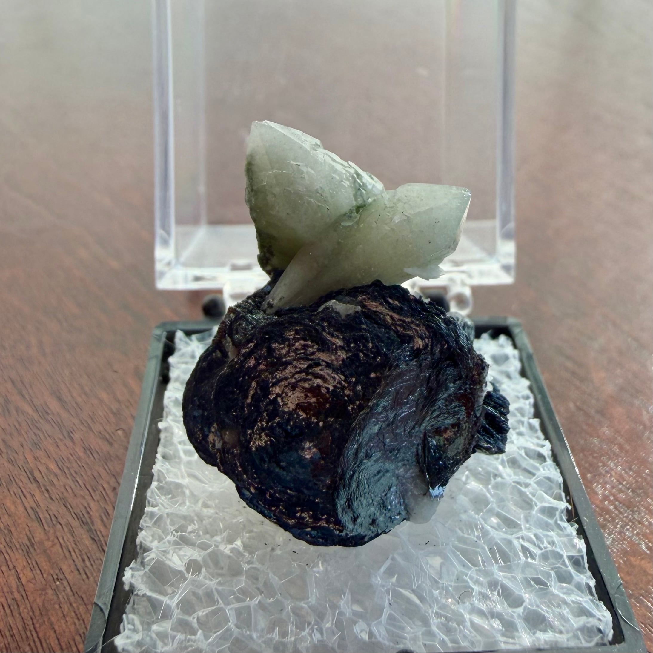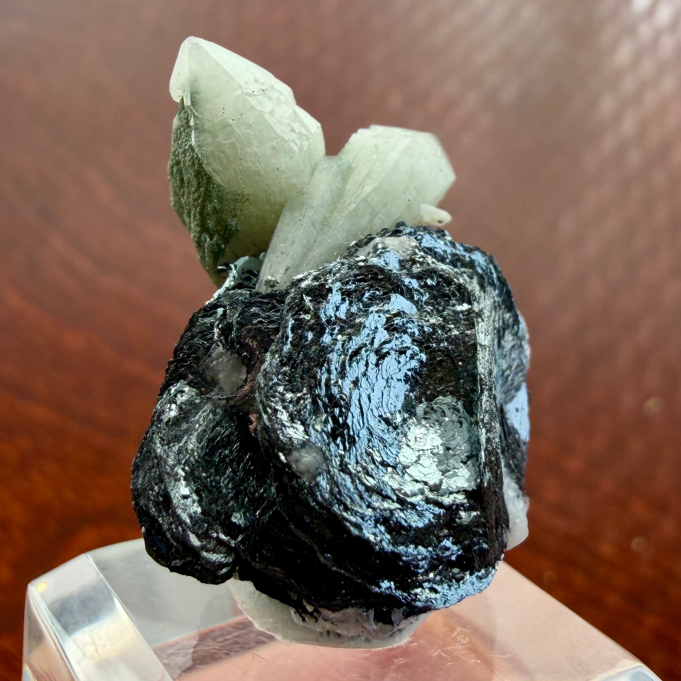 クローライト付着・内包由来と思われるグリーン発色のクォーツと、テリが強く折り重なった層状のヘマタイトとのバランスが非常にいい標本で、ぎりぎりサムネイルサイズに収まる座りの良い標本です。