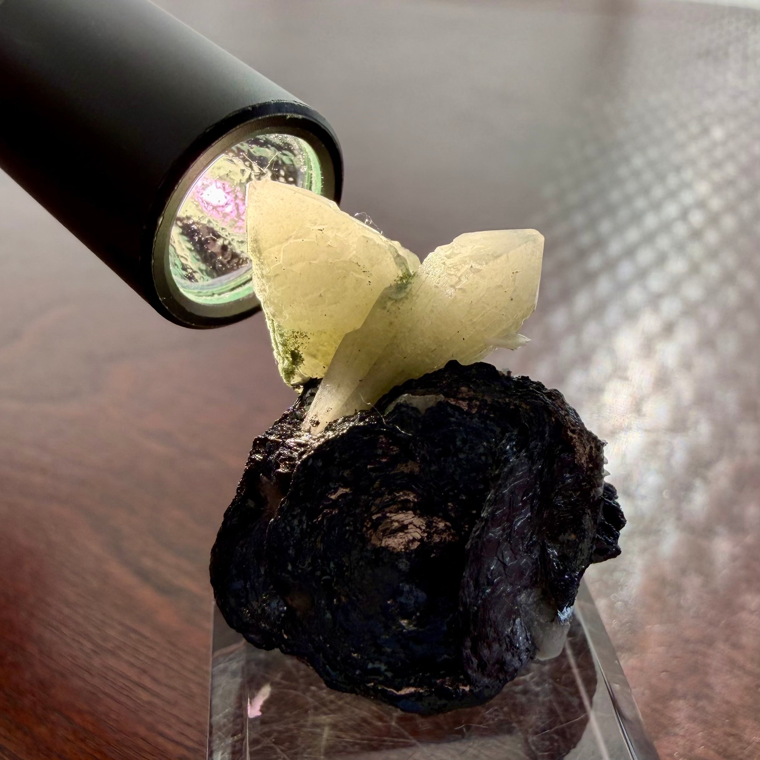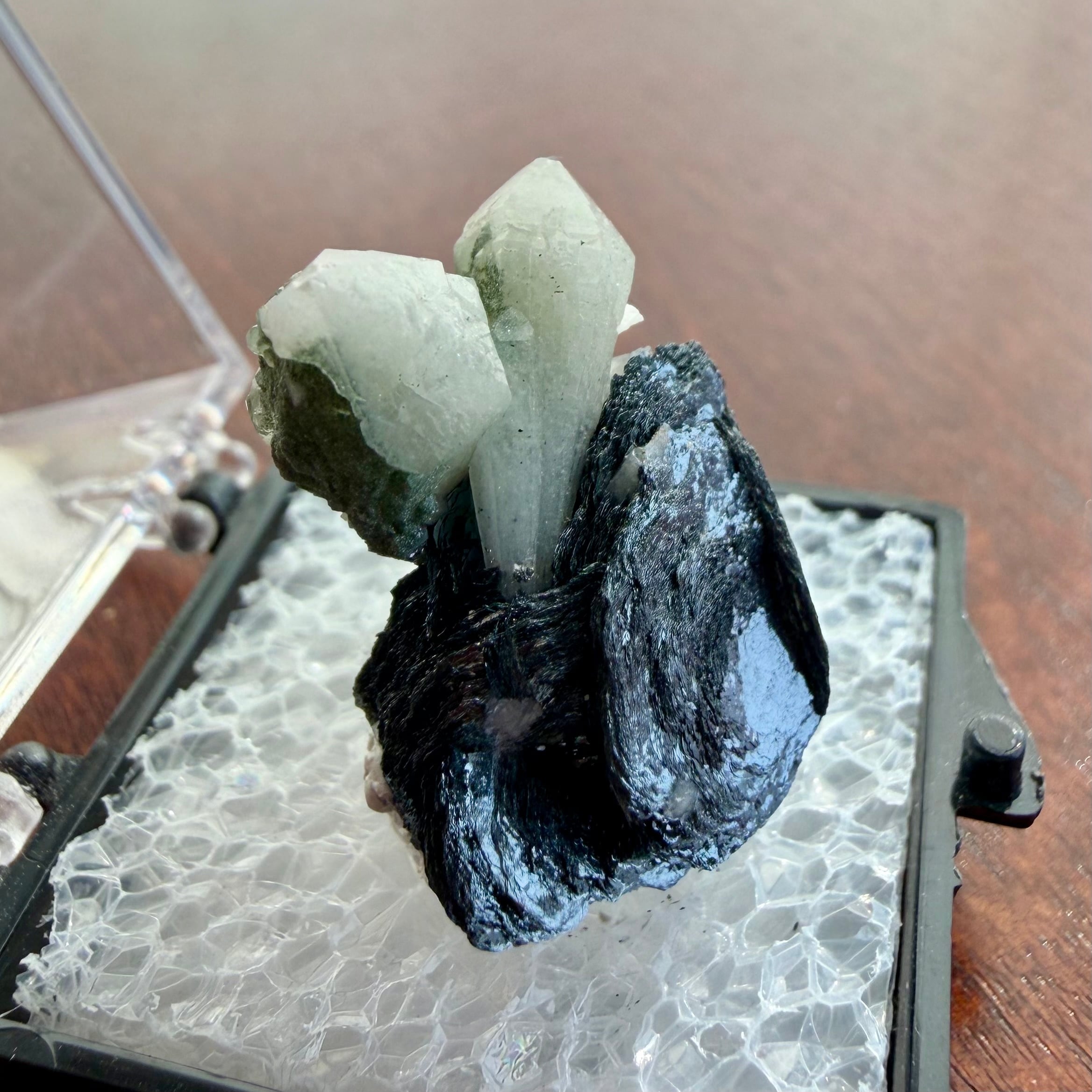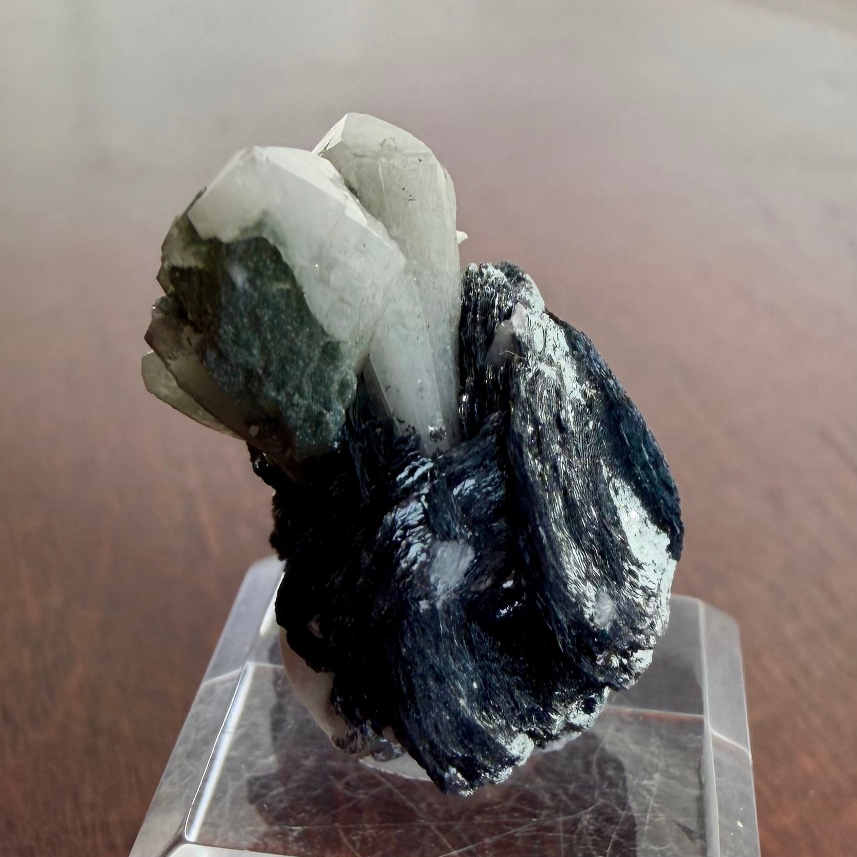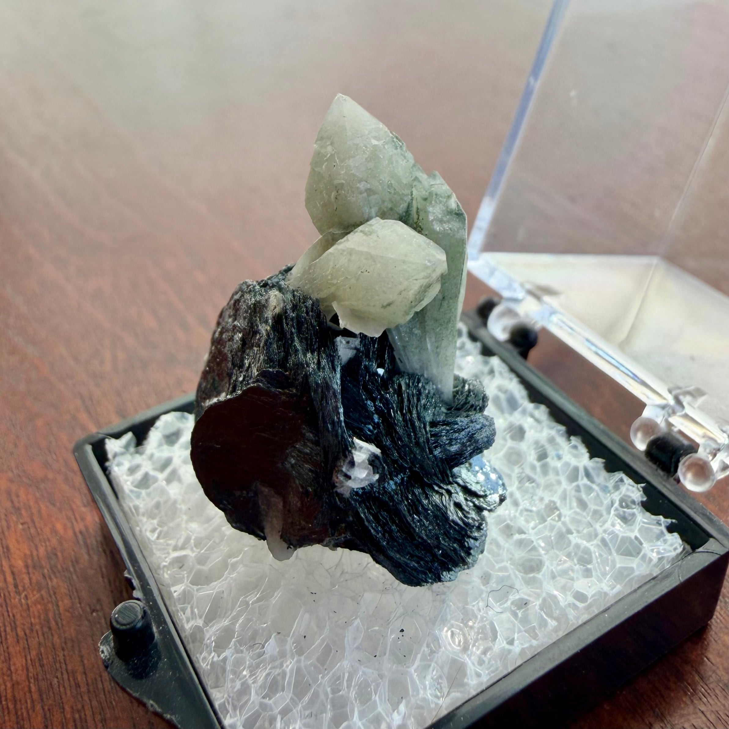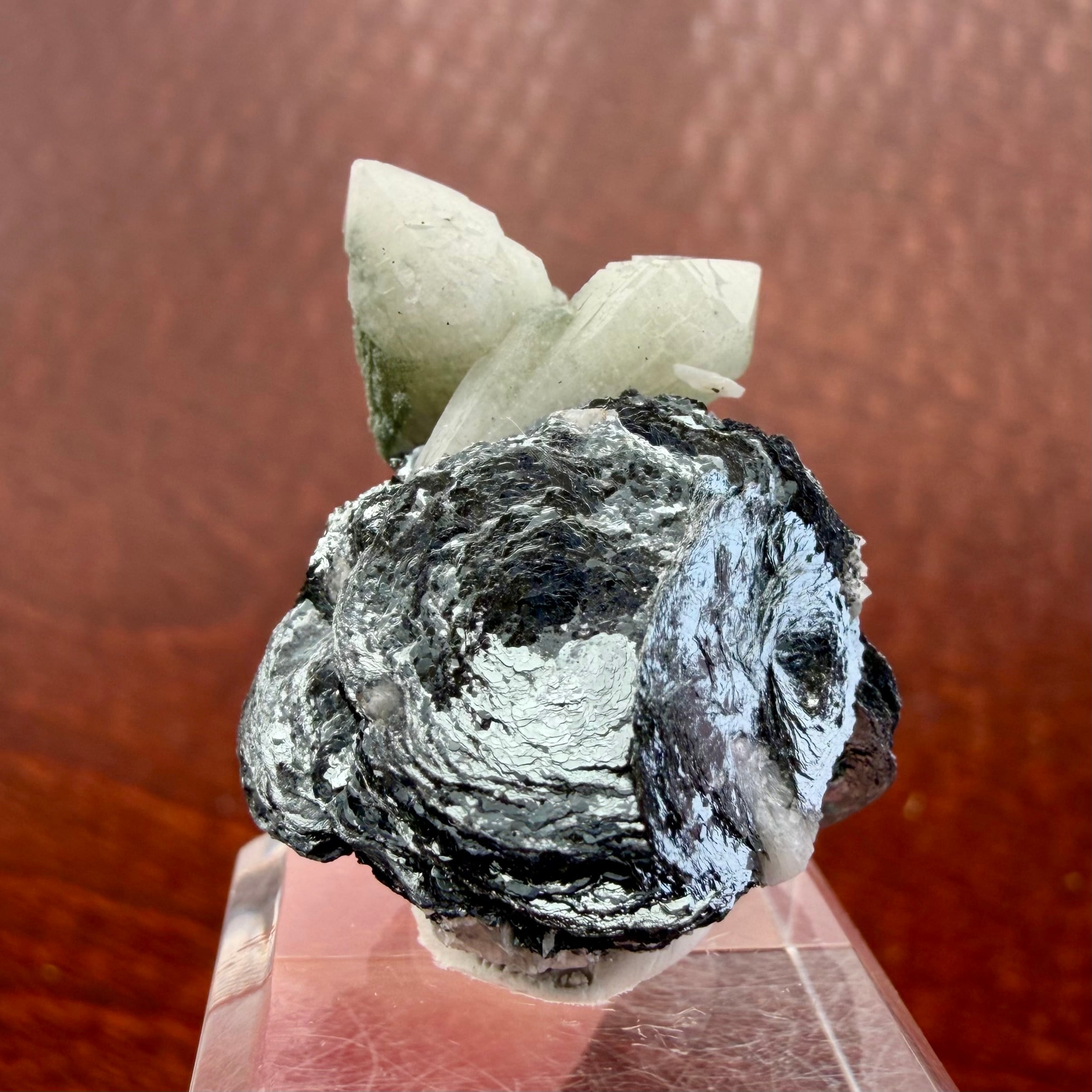 クローライト付着・内包由来と思われるグリーン発色のクォーツと、テリが強く折り重なった層状のヘマタイトとのバランスが非常にいい標本で、ぎりぎりサムネイルサイズに収まる座りの良い標本です。
