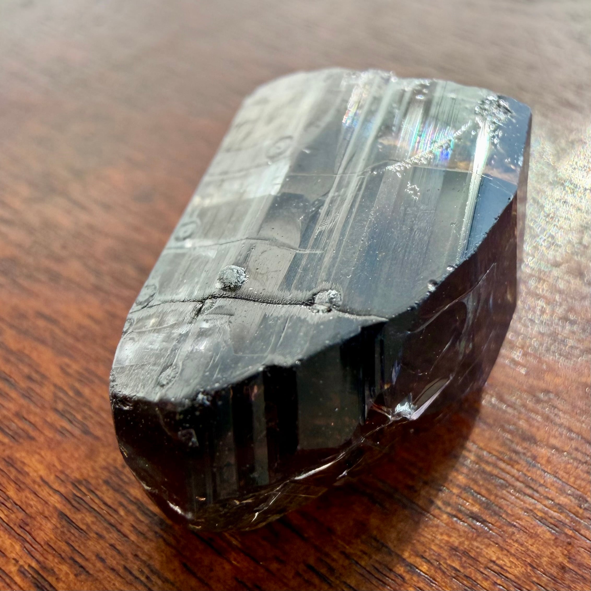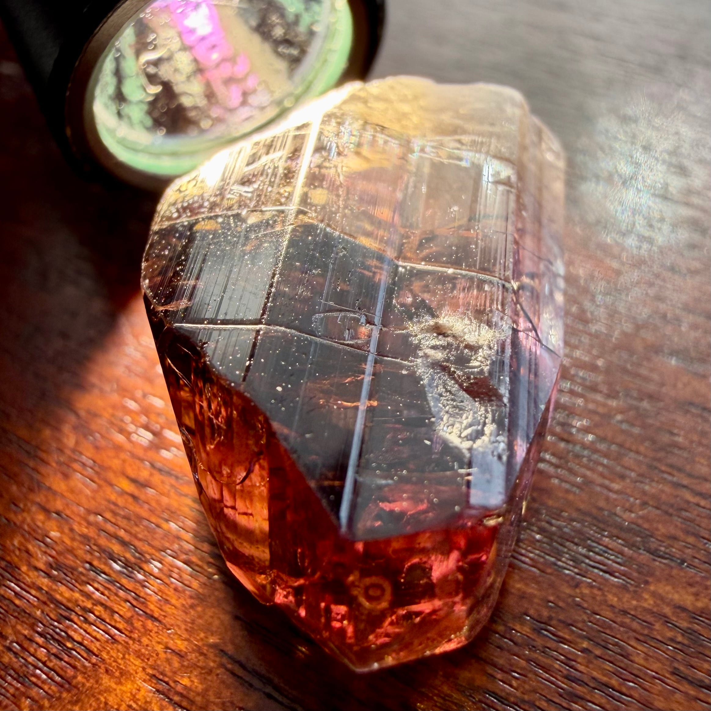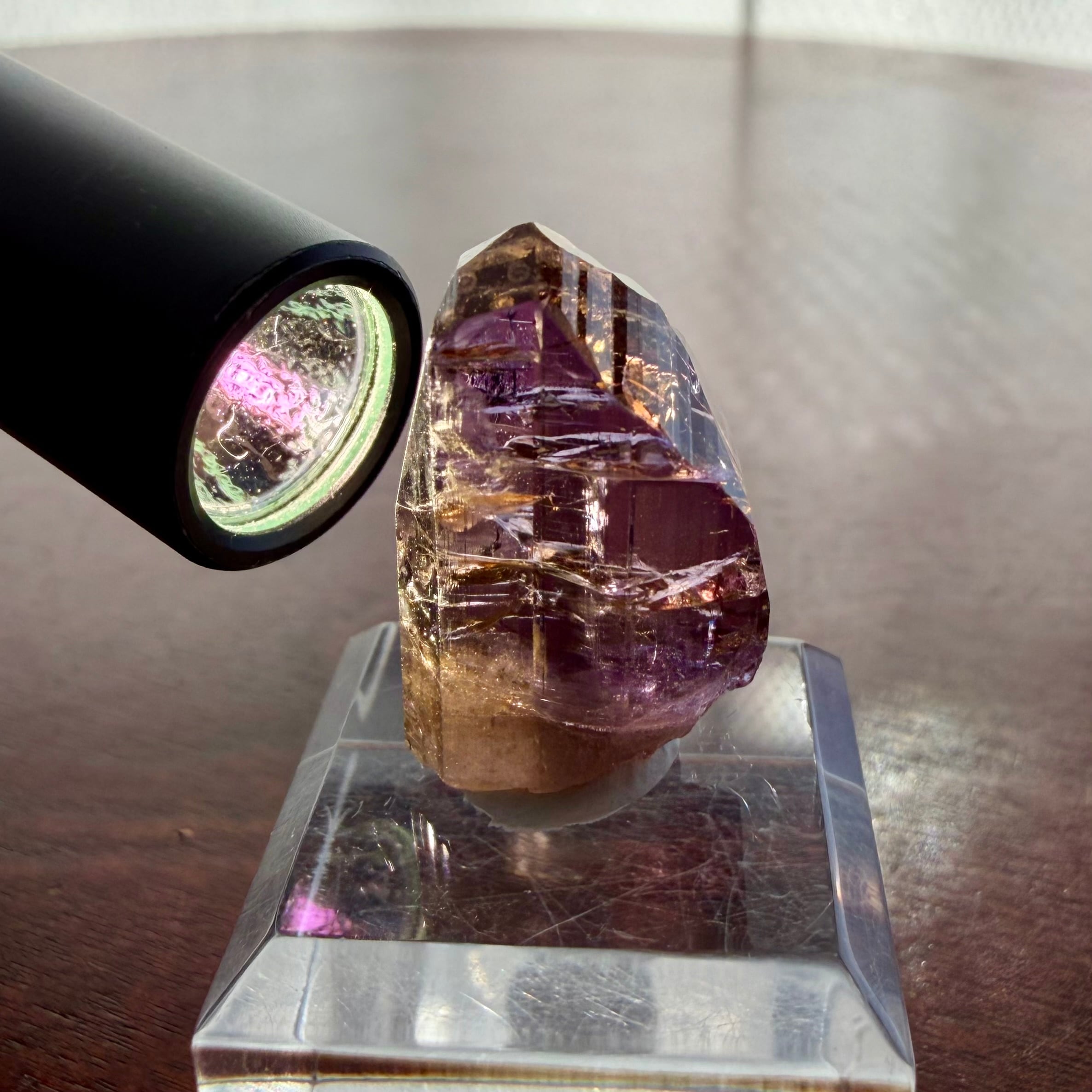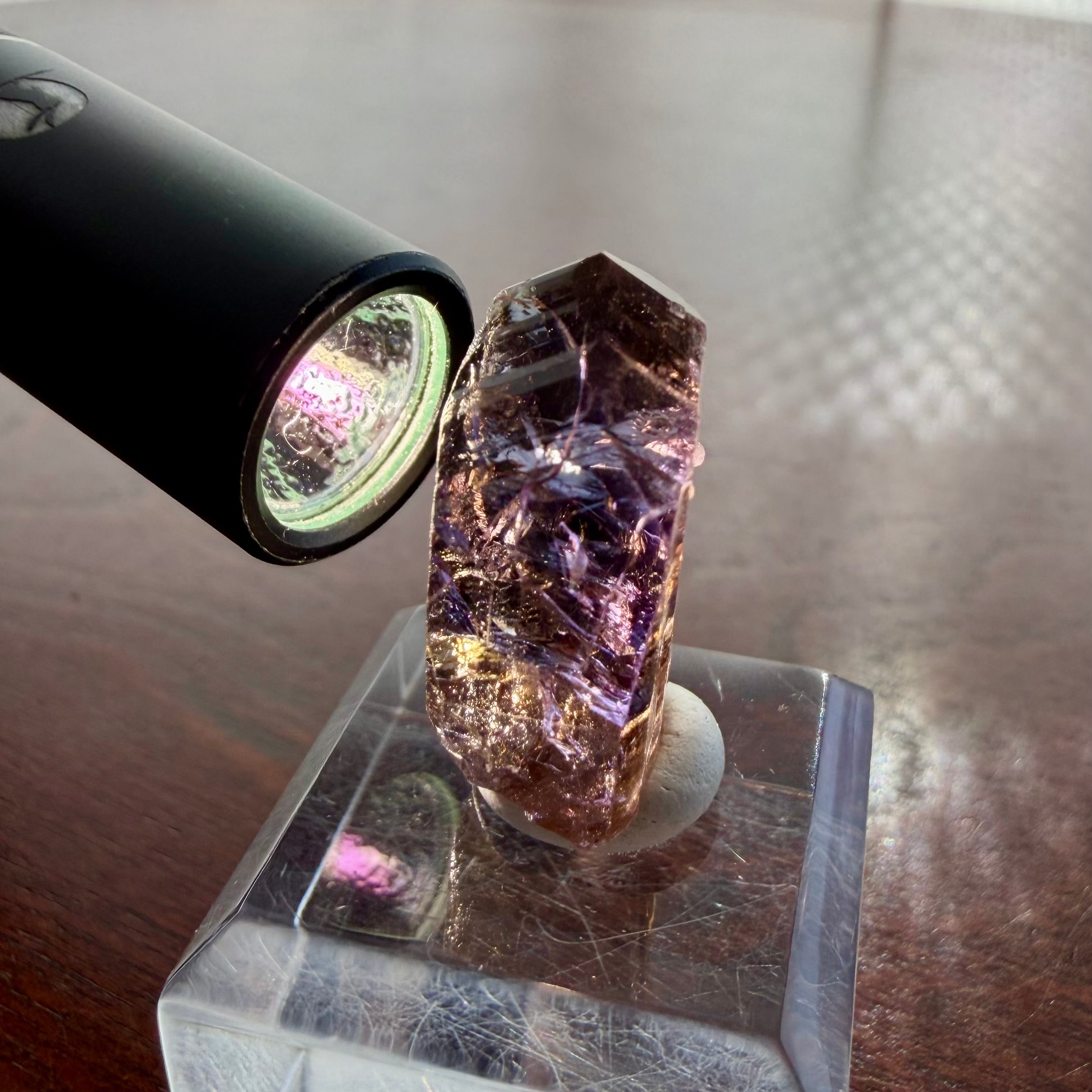 結晶片面に小さな丸い凹みがあり、これが何らか人為的なものなのか、自然の凹凸なのかが判別付きかねる点、そして紫外線光下でクラックに沿った蛍光がわずかに見られる点(画像16枚目・無水エタノールに少し漬けてみたのですが特に剥がれたりしていない状態です)があり、こちらでの不明点が残るため、通常この結晶の状態でお付けする価格より大きく下げて出品いたしました。
