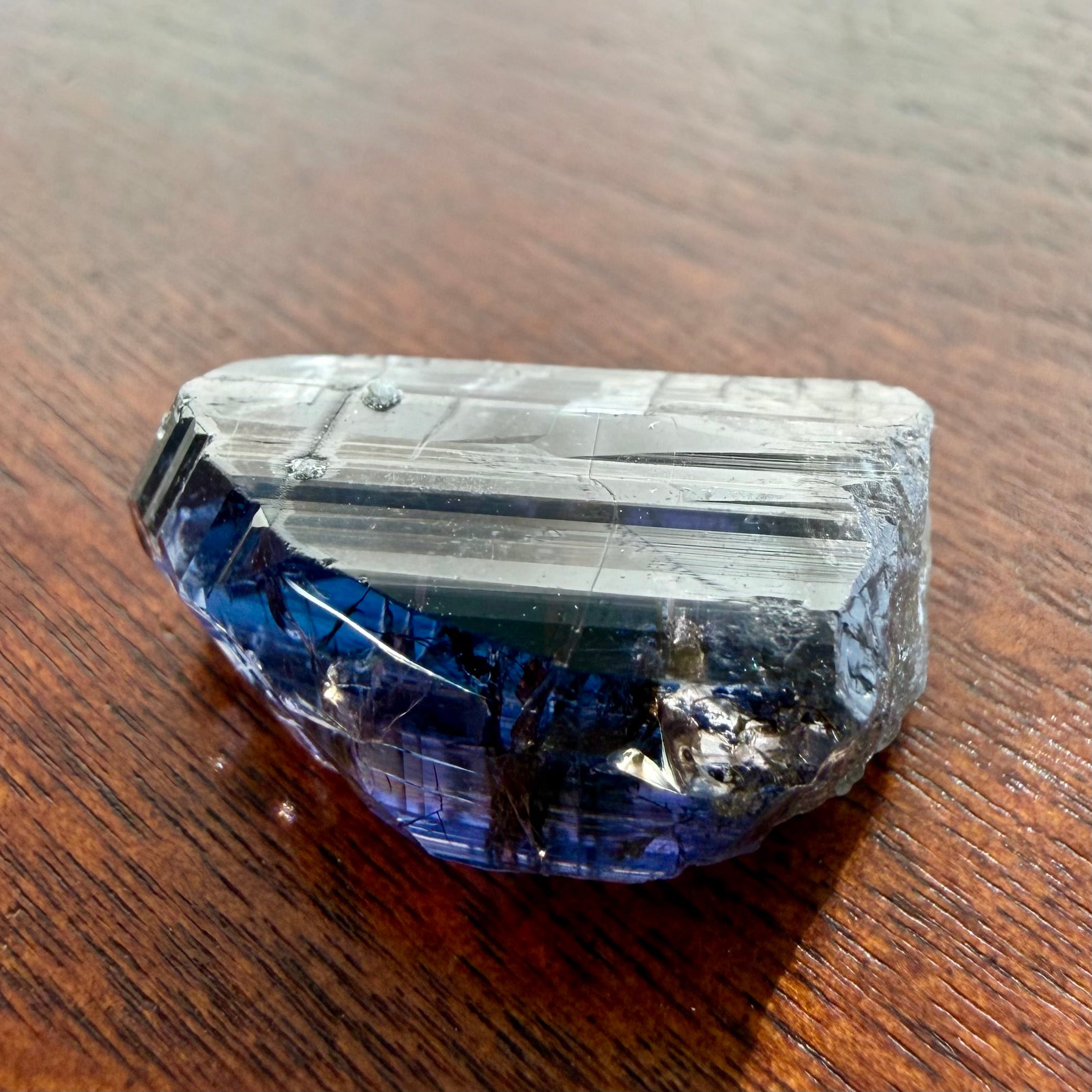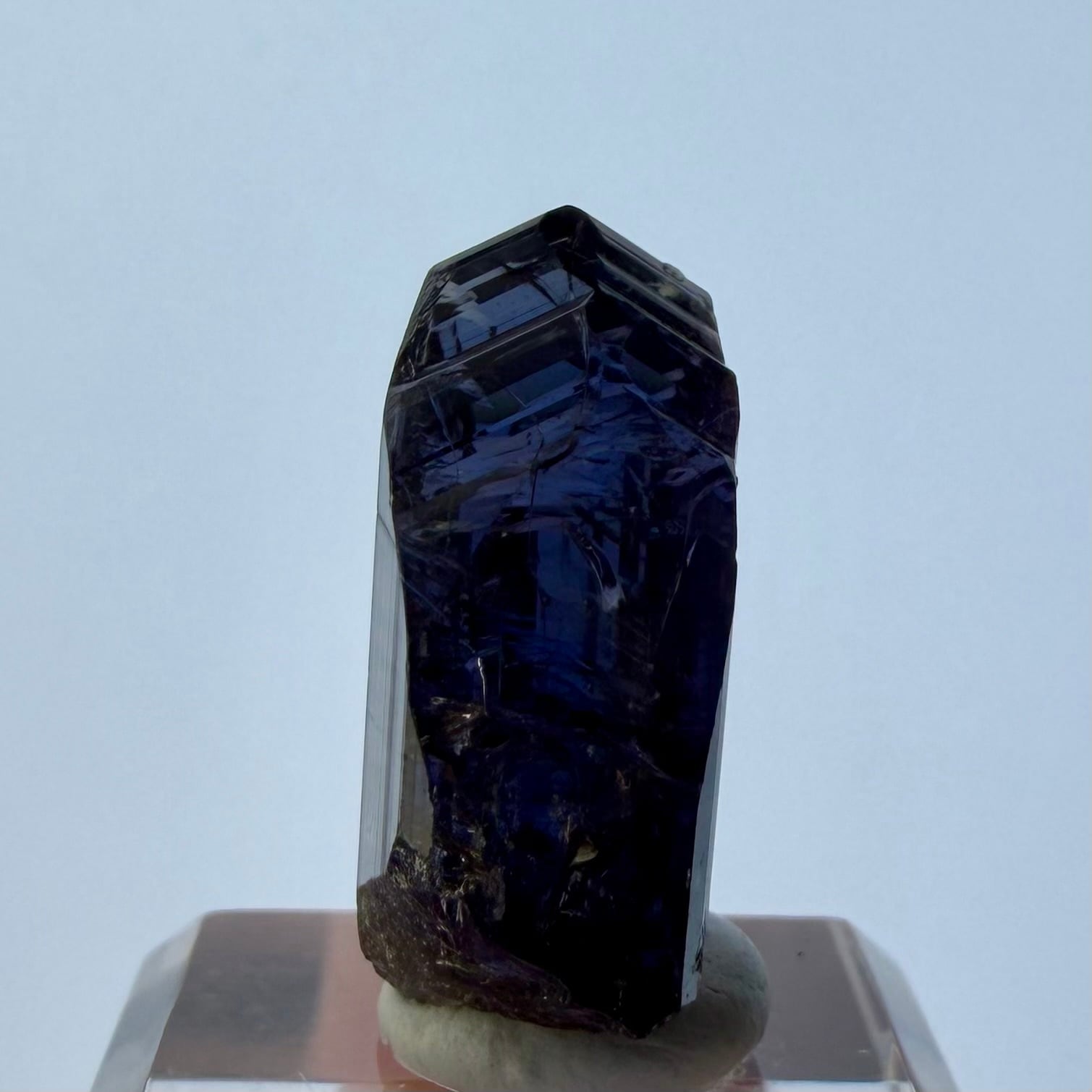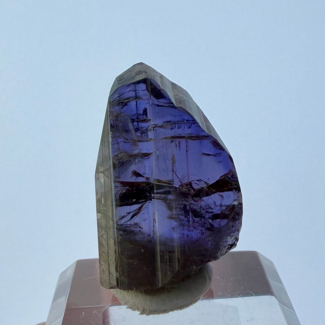 タンザナイトの結晶、サムネイルサイズですが厚みのある結晶は比較的クラックが少なめのためしっかりと透過し、美しい発色を楽しめます。