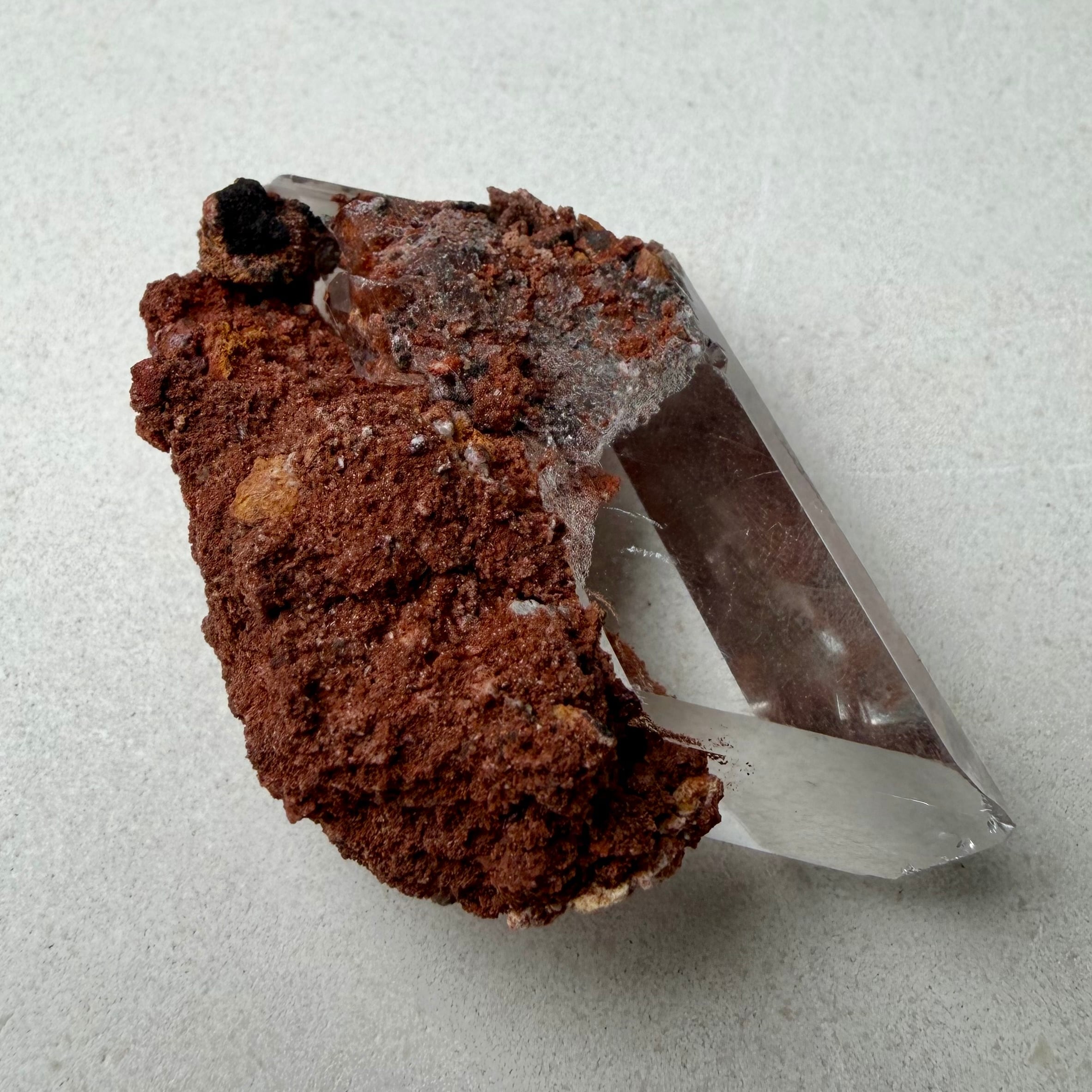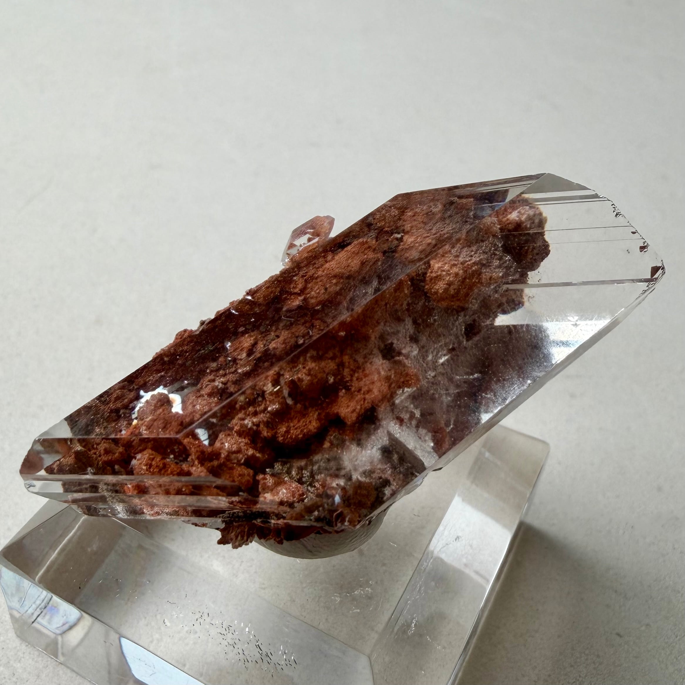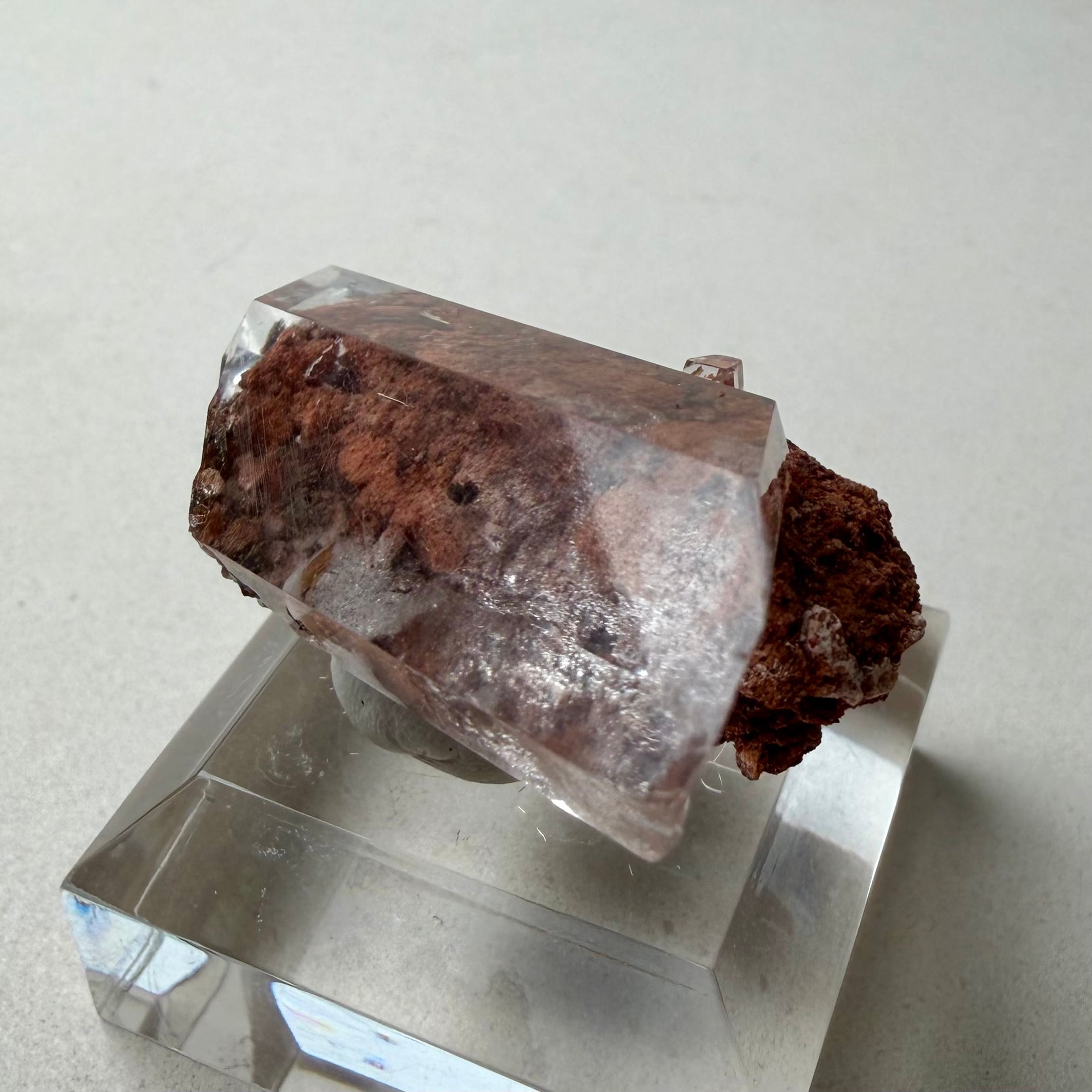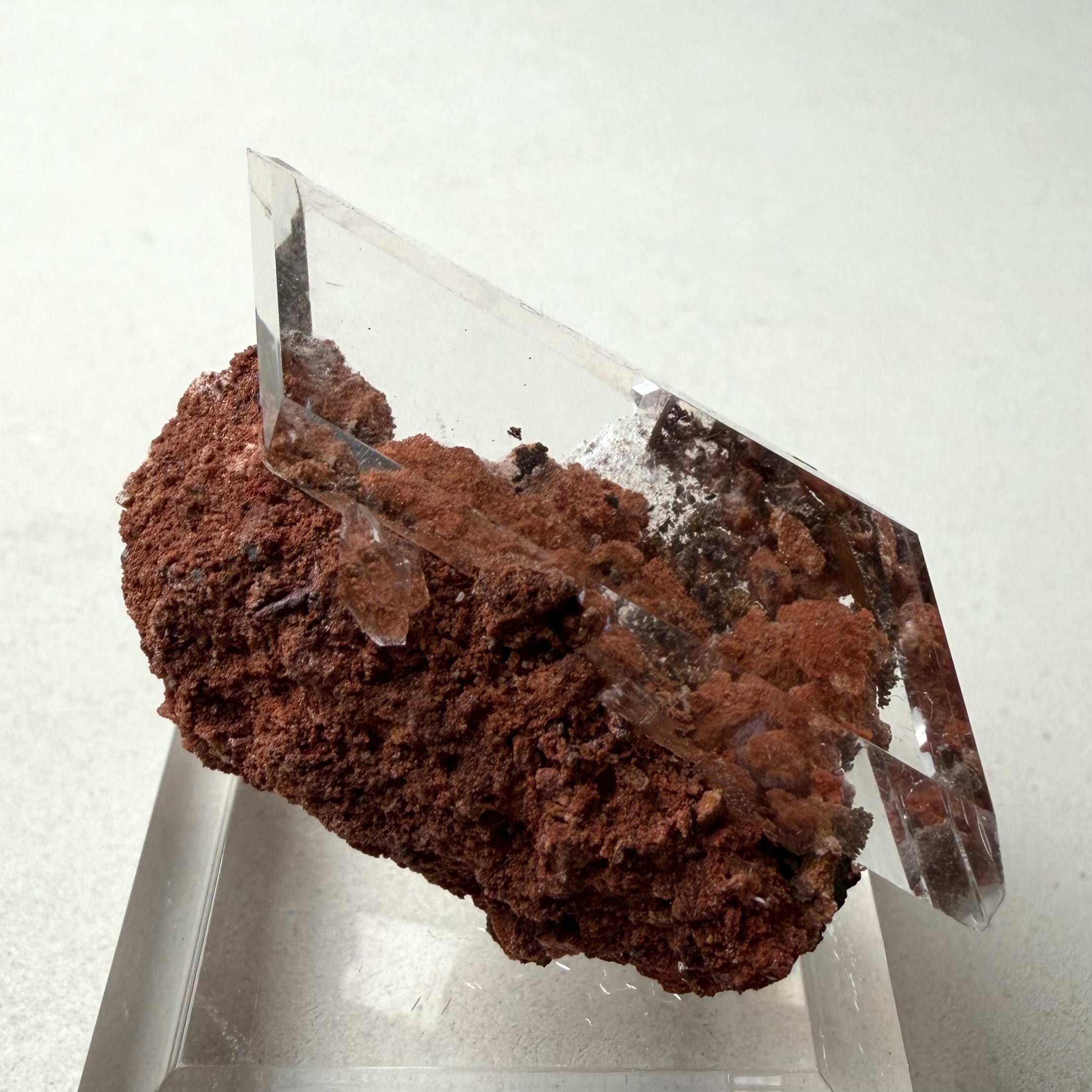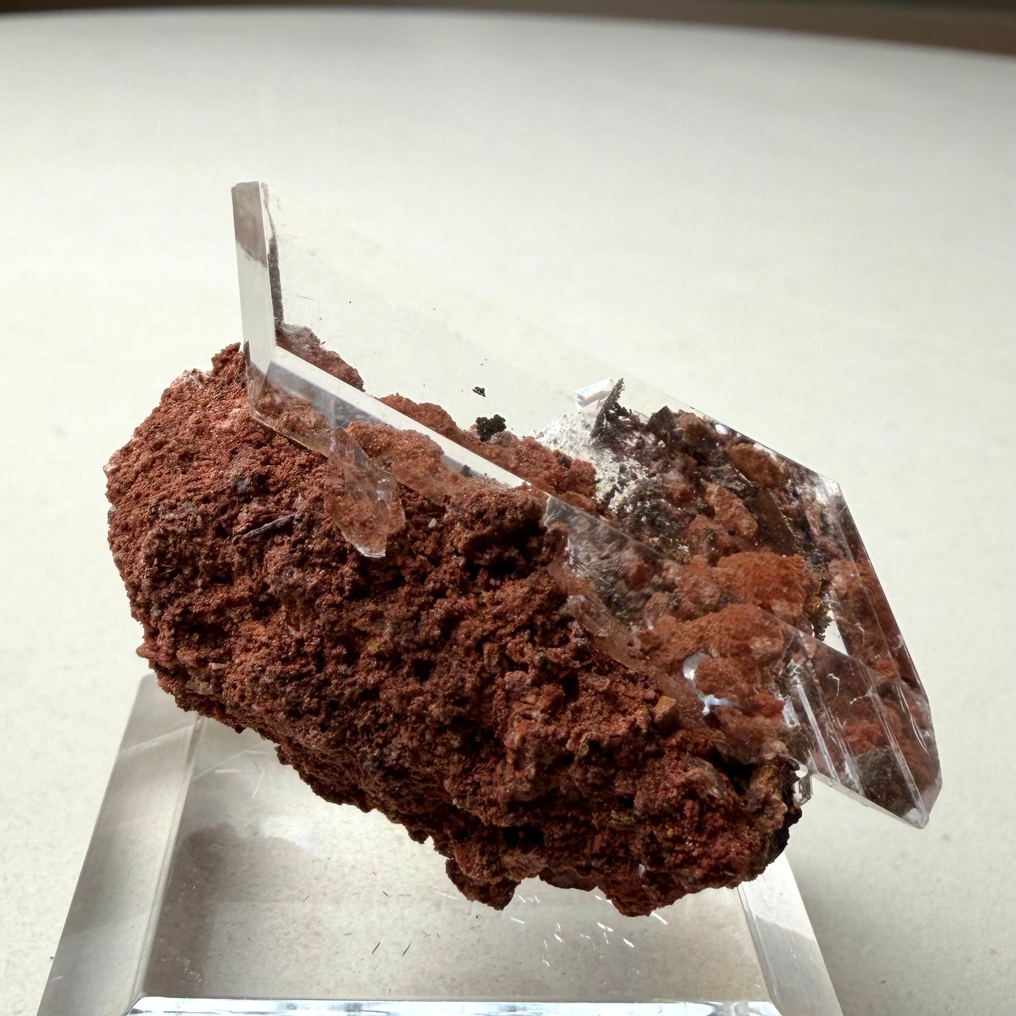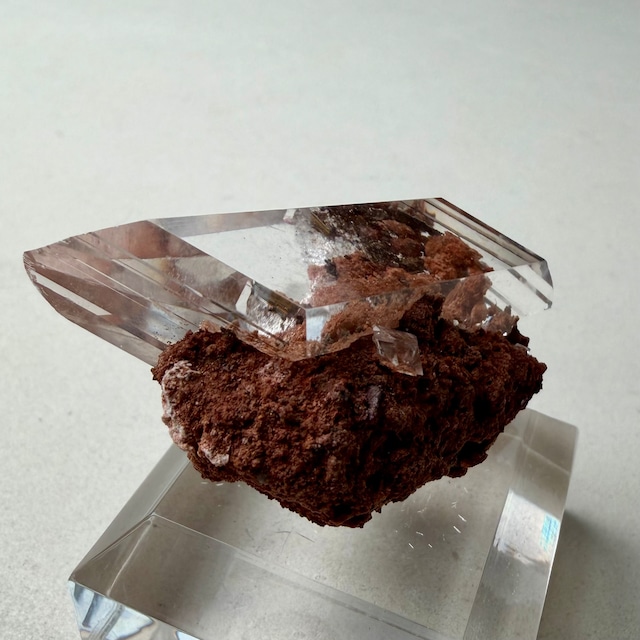 赤茶色の母岩と強烈な透明感を持ったセレナイトとのバランスが魅力的な標本です。