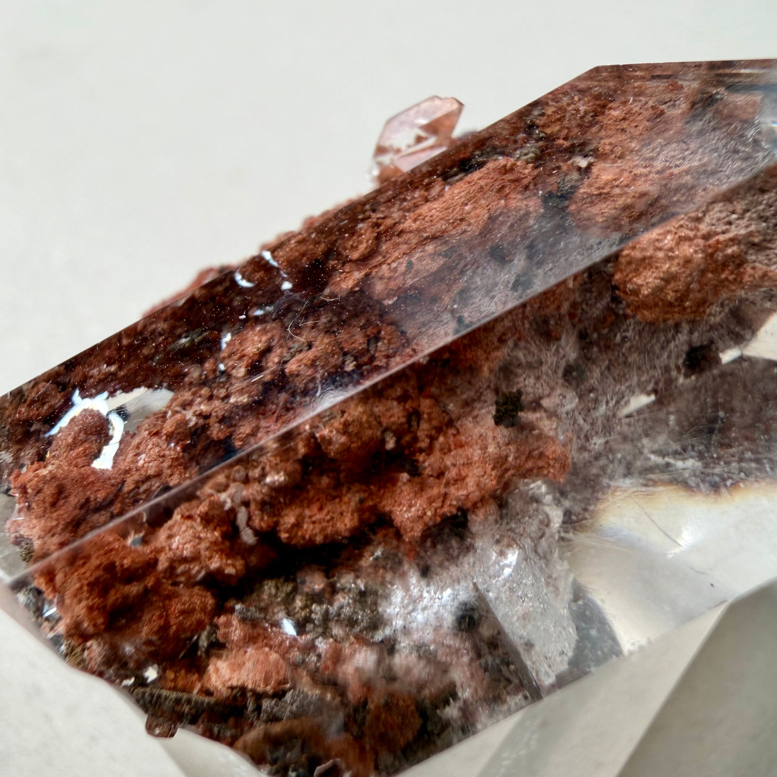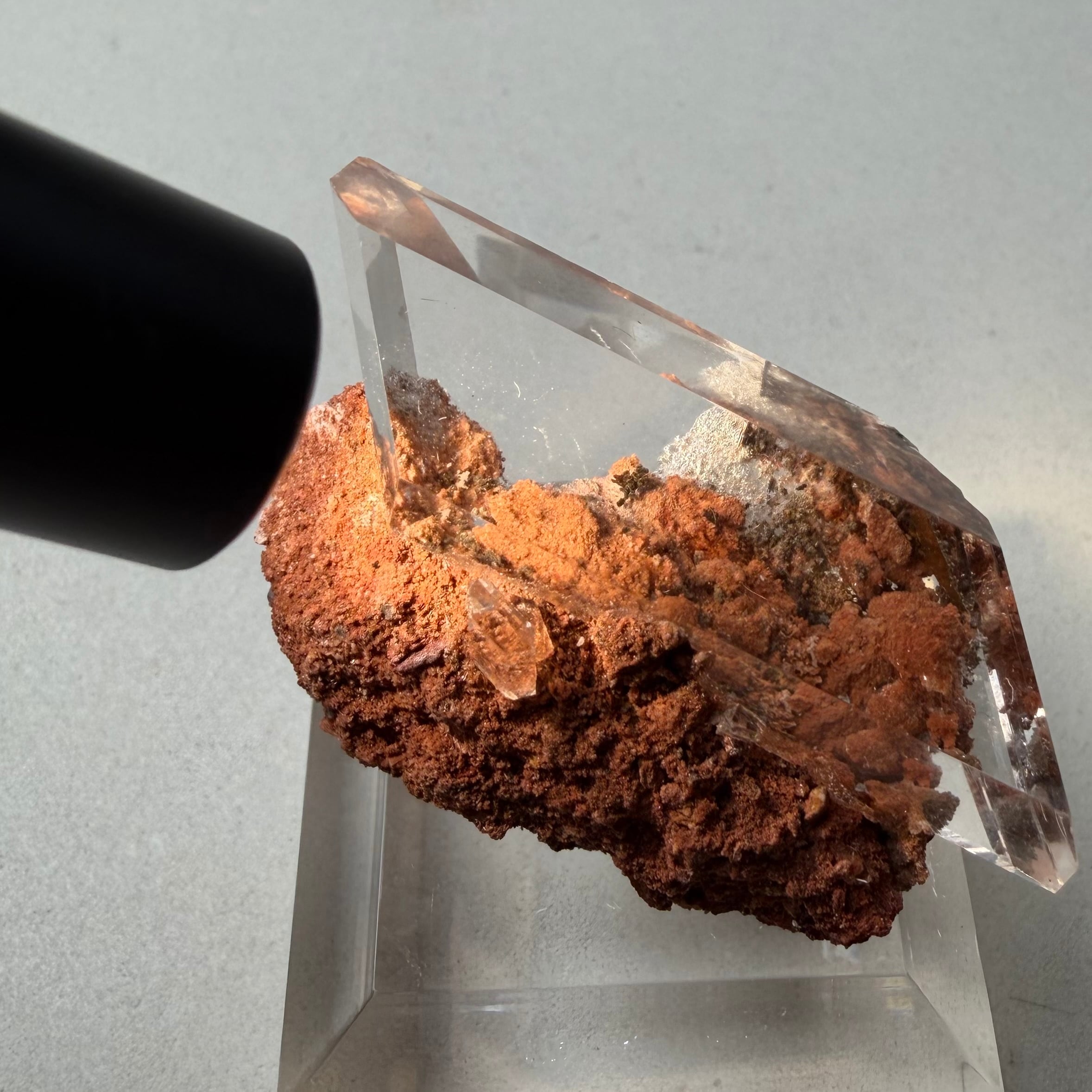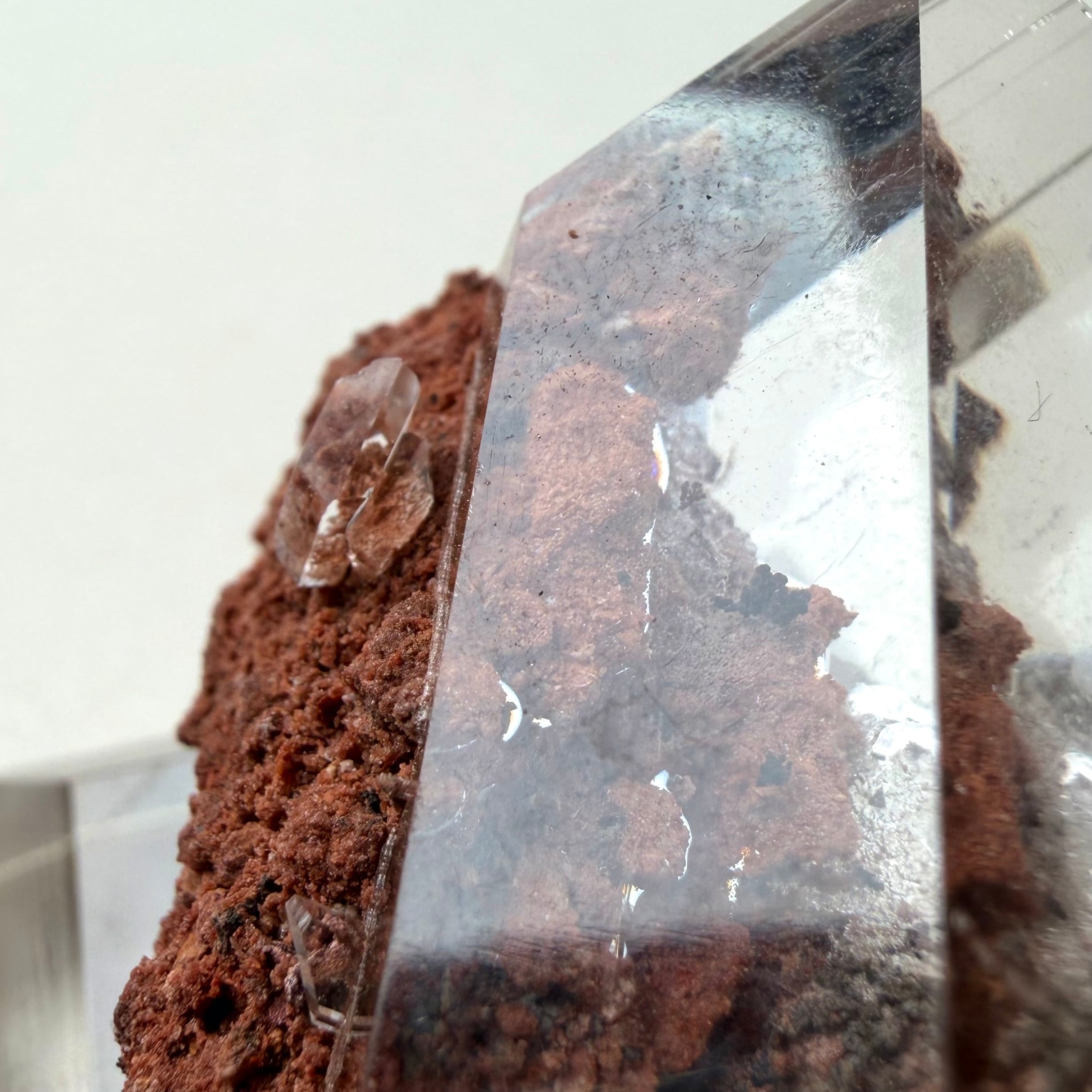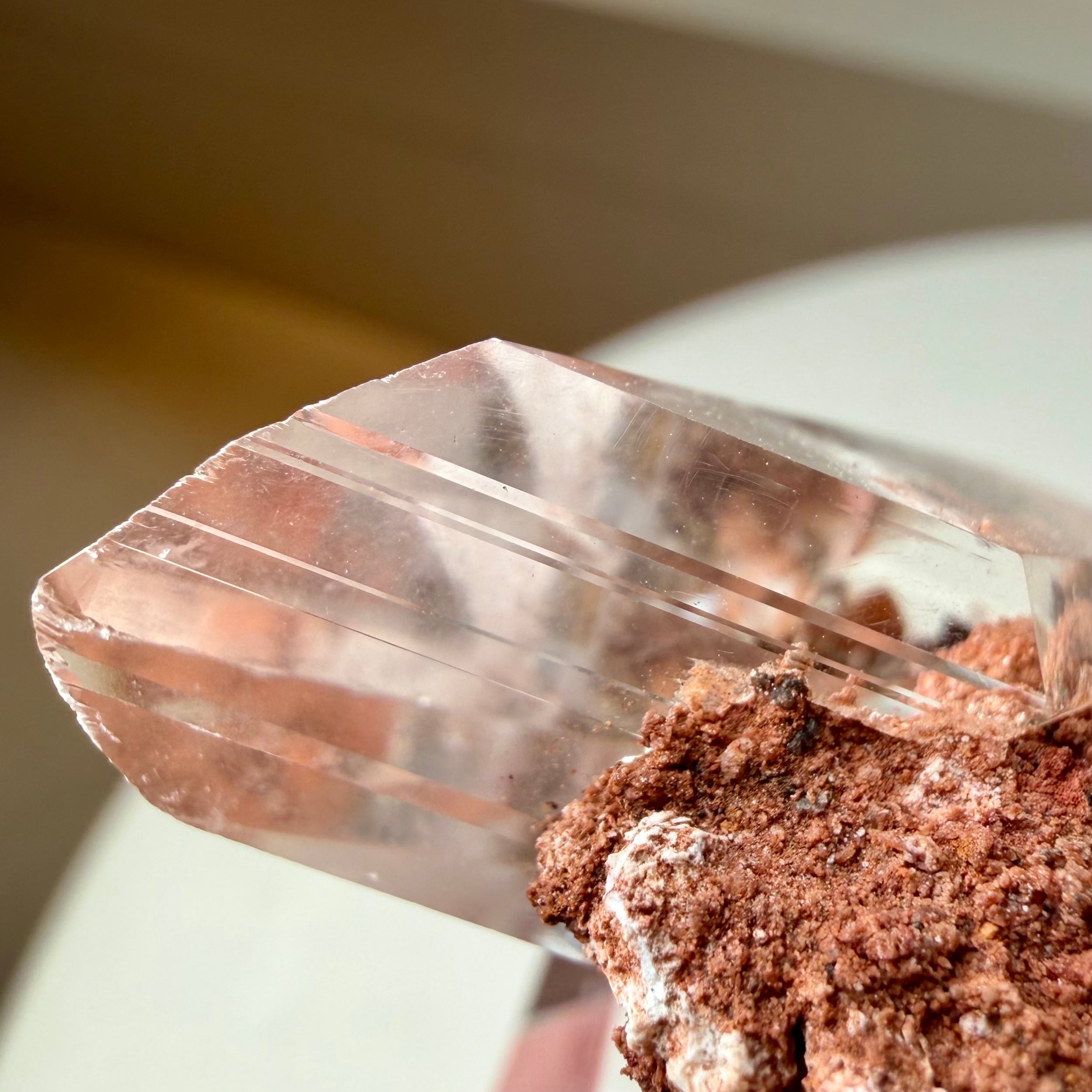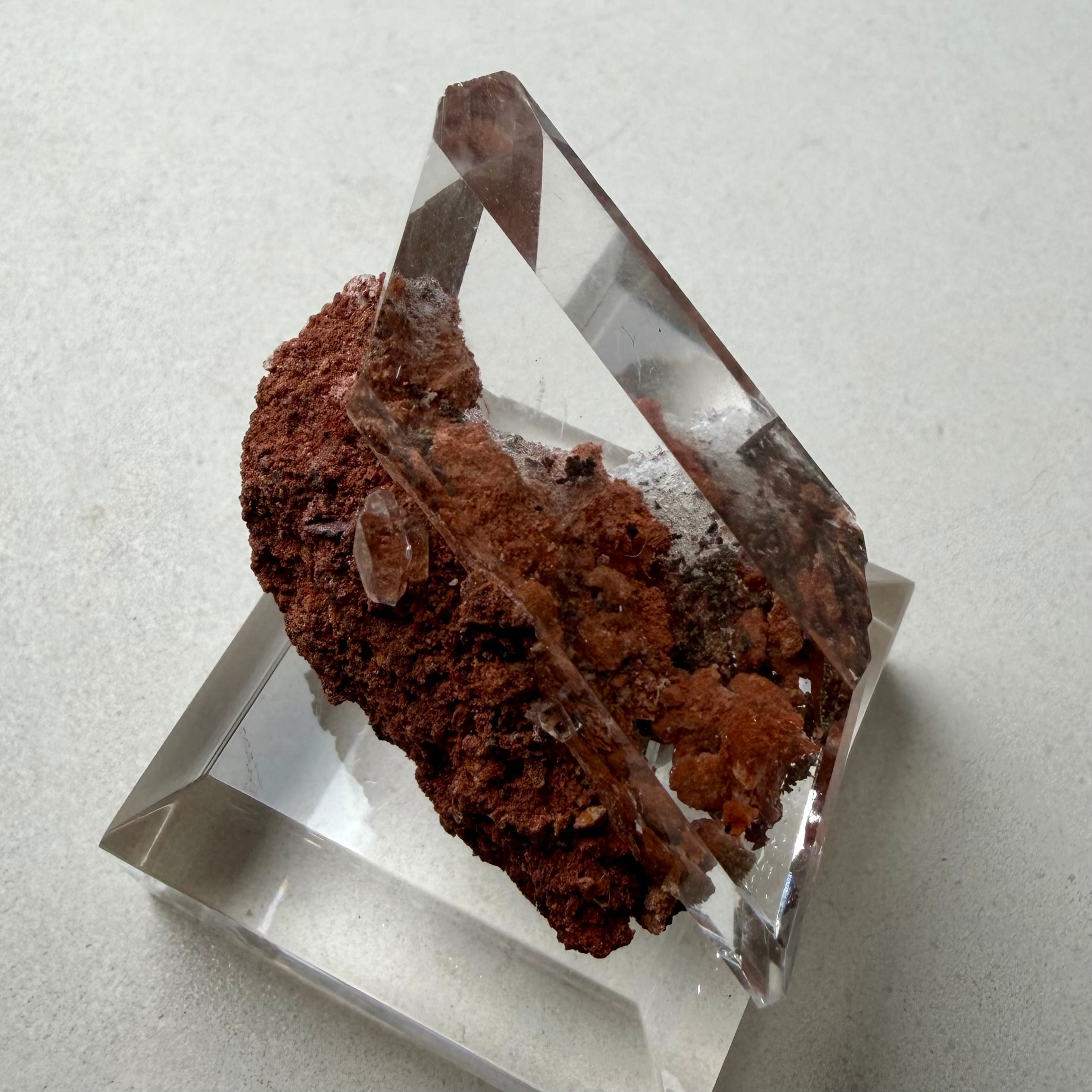 赤茶色の母岩と強烈な透明感を持ったセレナイトとのバランスが魅力的な標本です。