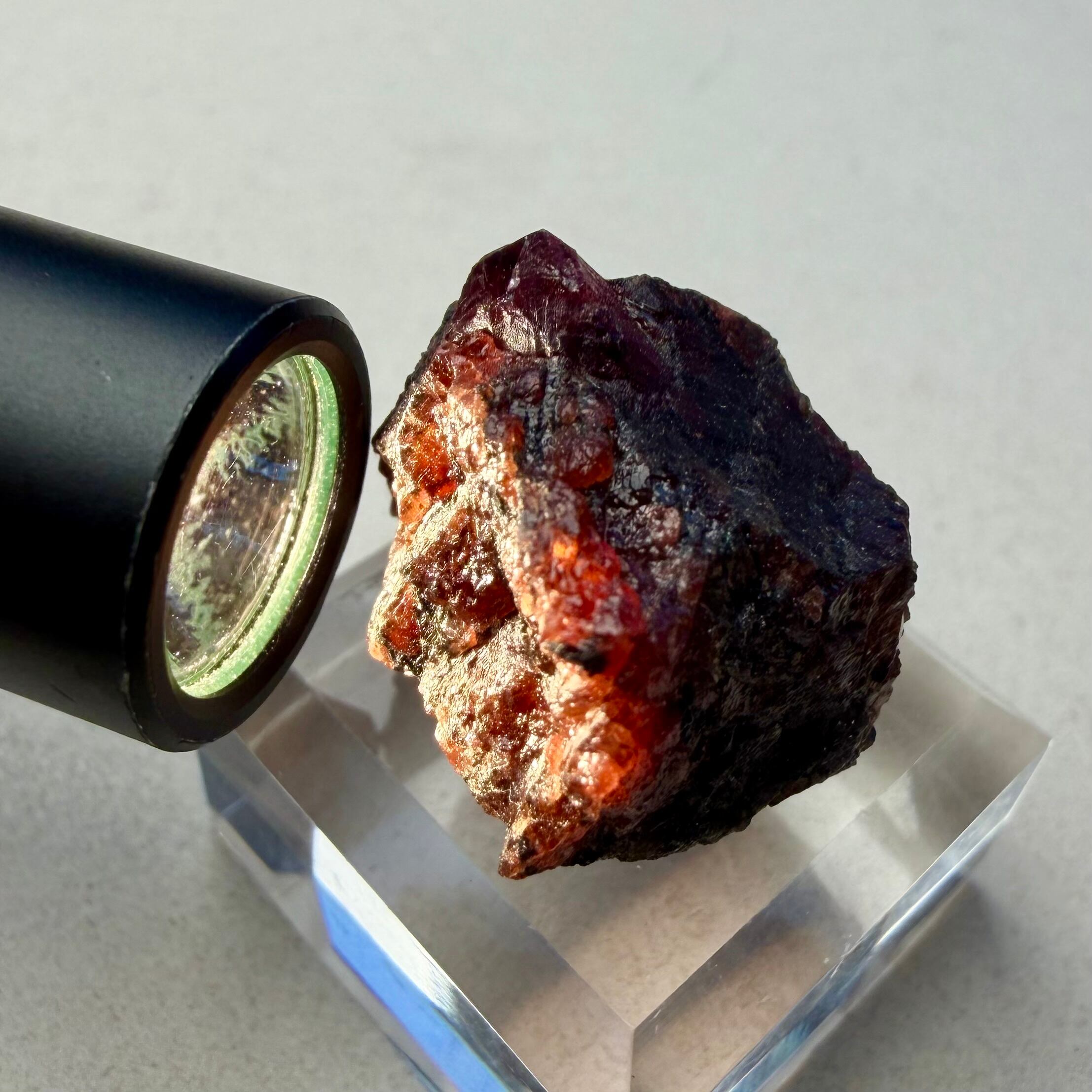 ガーネットは表層部のみがオレンジに透ける程度で、採掘先に確認しましたがアルマンディンやパイロープ、スペサルティンが混在すると思う、といった回答で、こちらの方では追加で鑑別等は行っておりません。