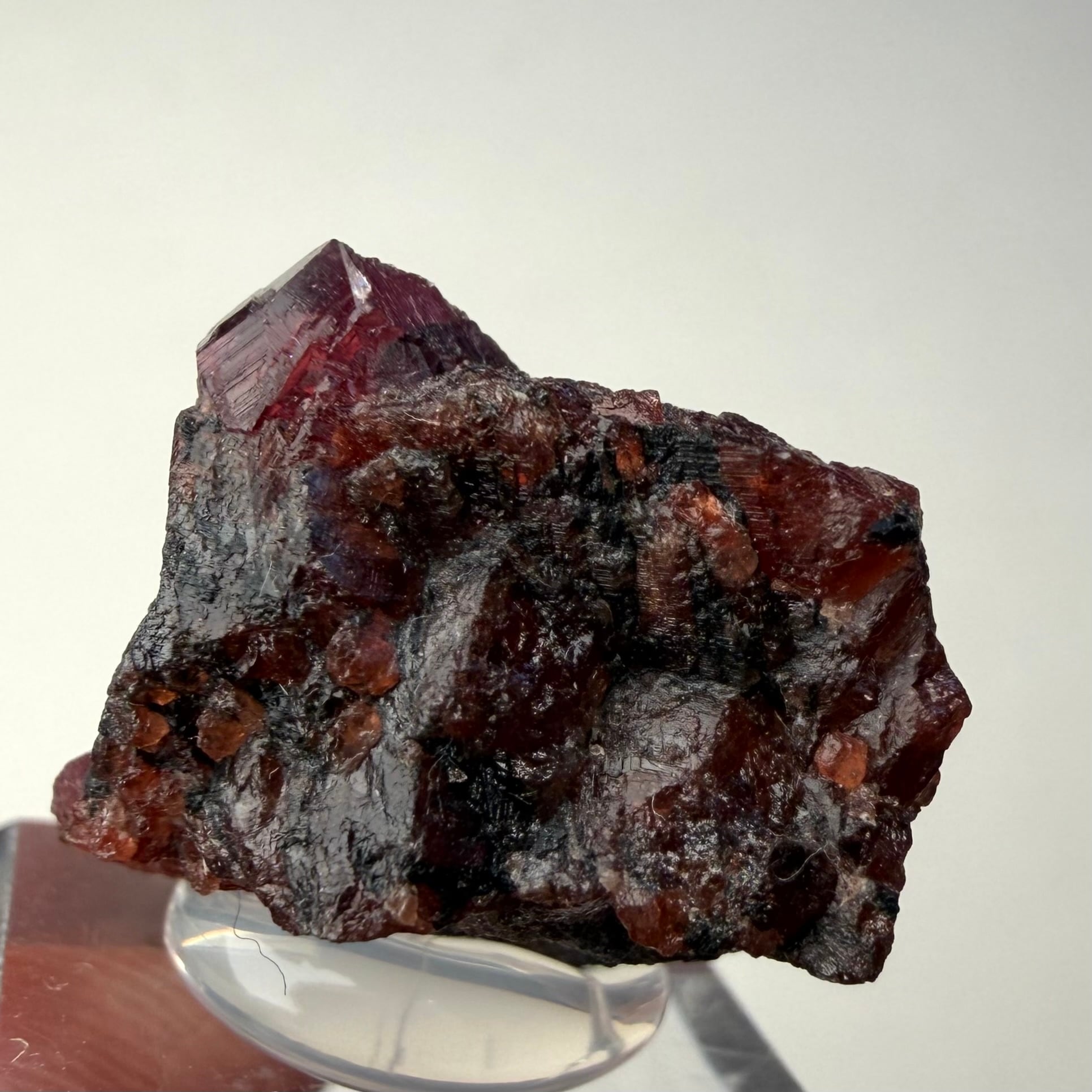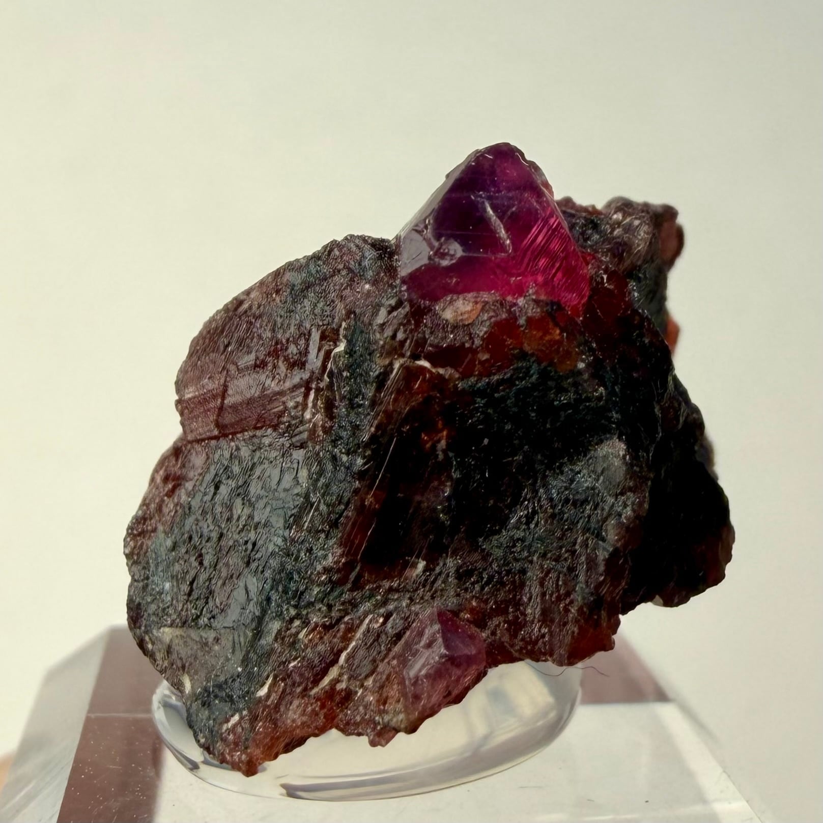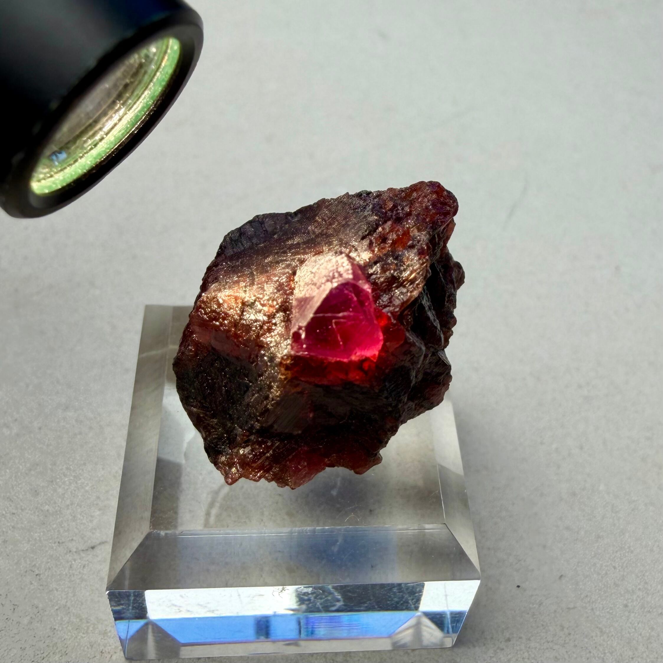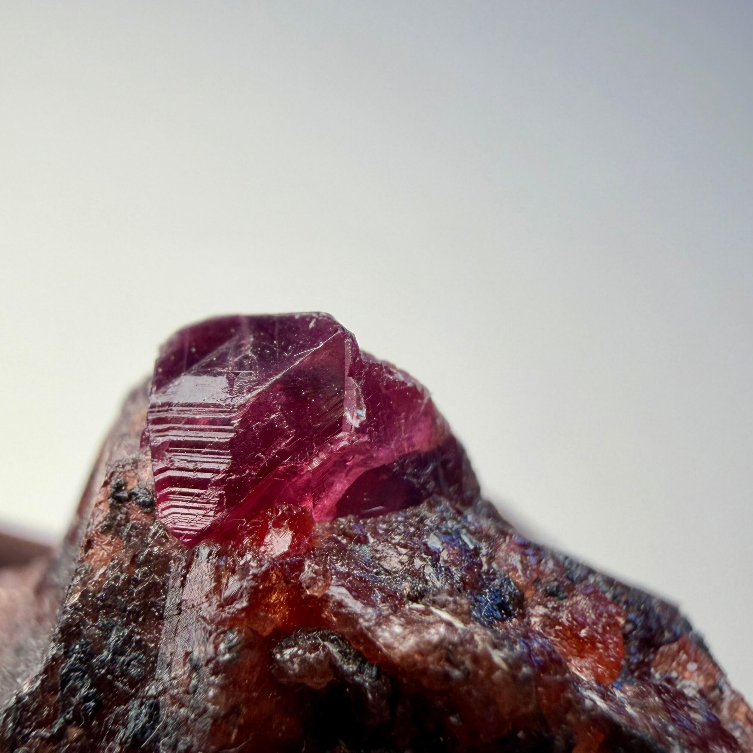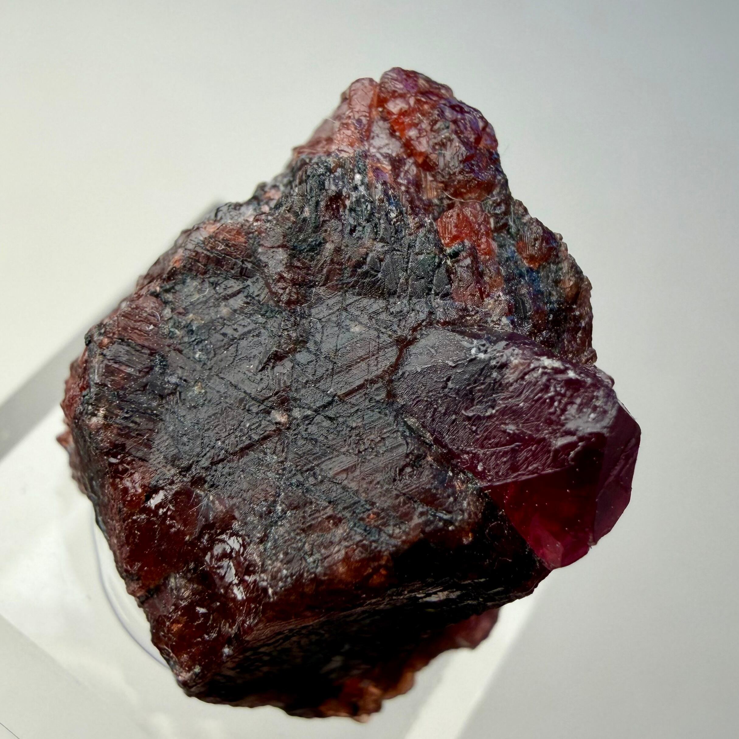 ルビーとは言い切れない、ある意味ウィンザ産らしいパープル混じりの発色が見られるサファイアと、ガーネットとのコンビネーション、特にメイン結晶はしっかりと宝石質な部分が見て取れます。