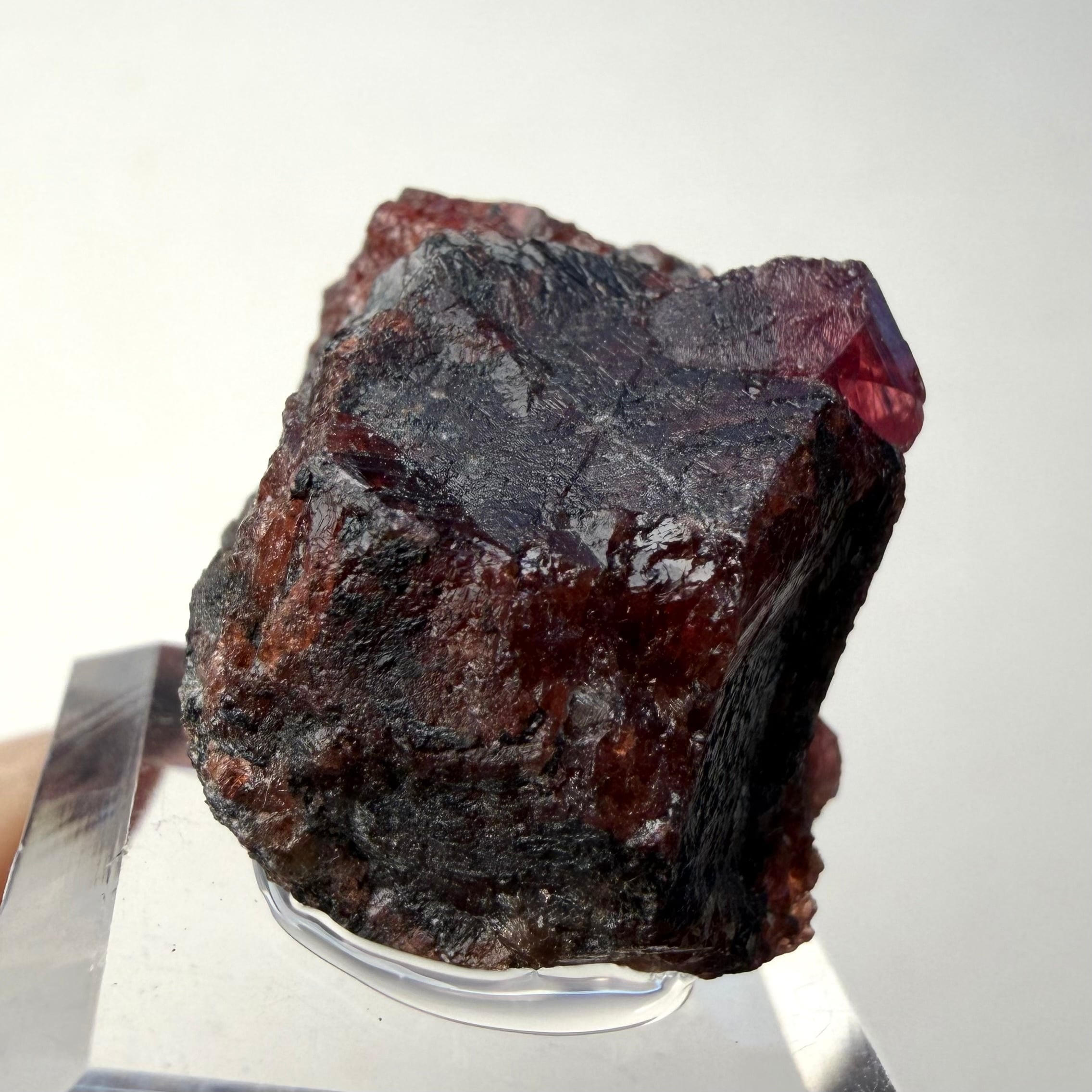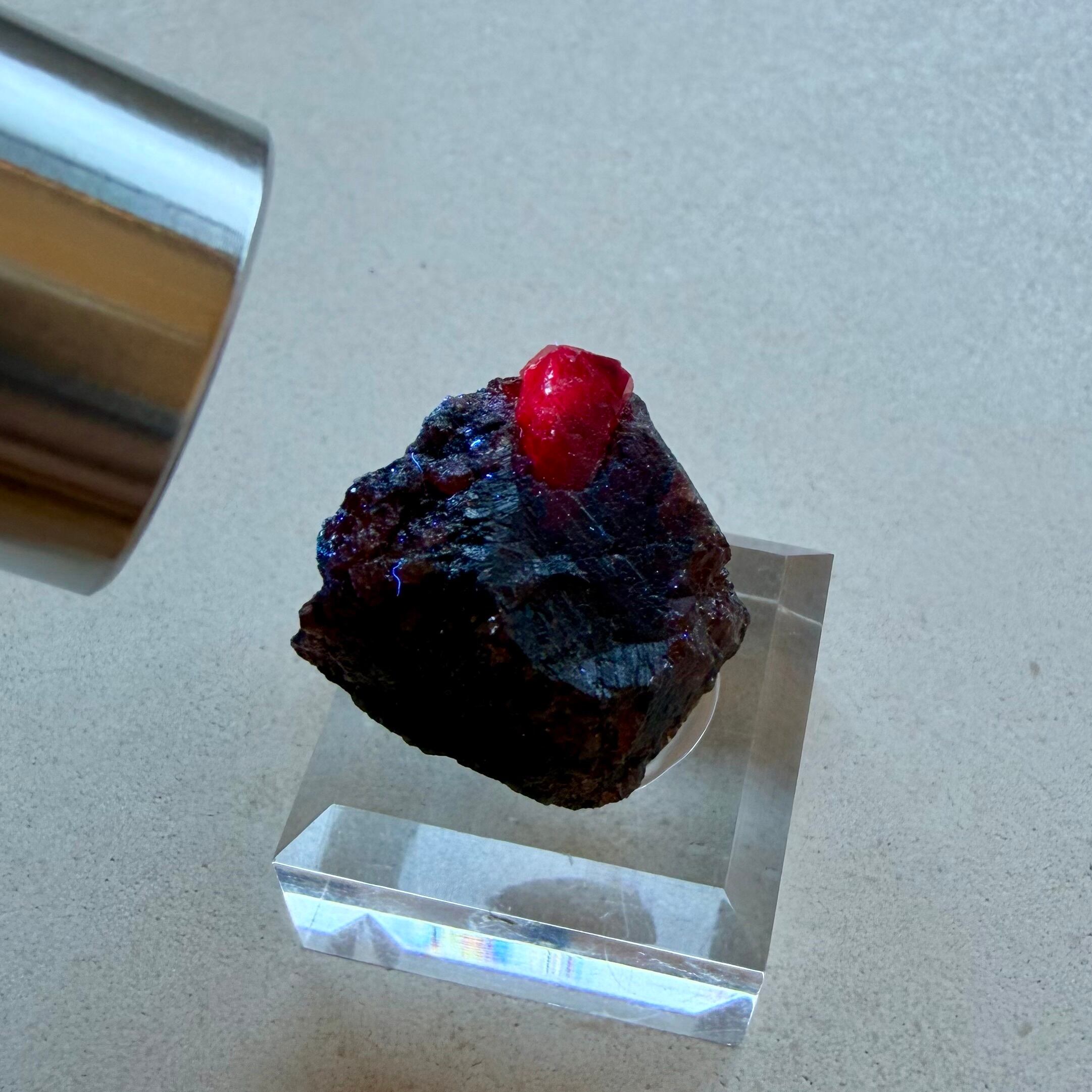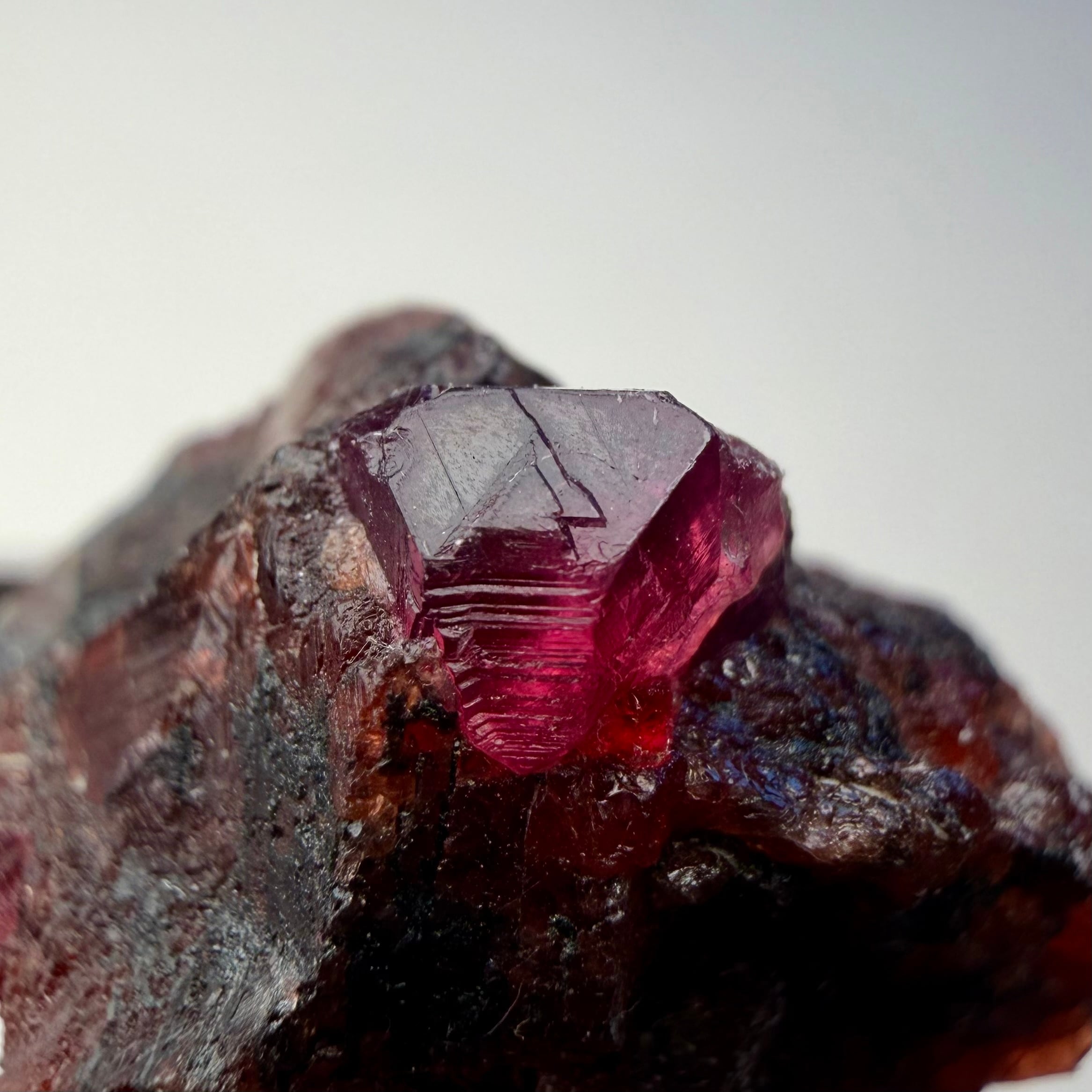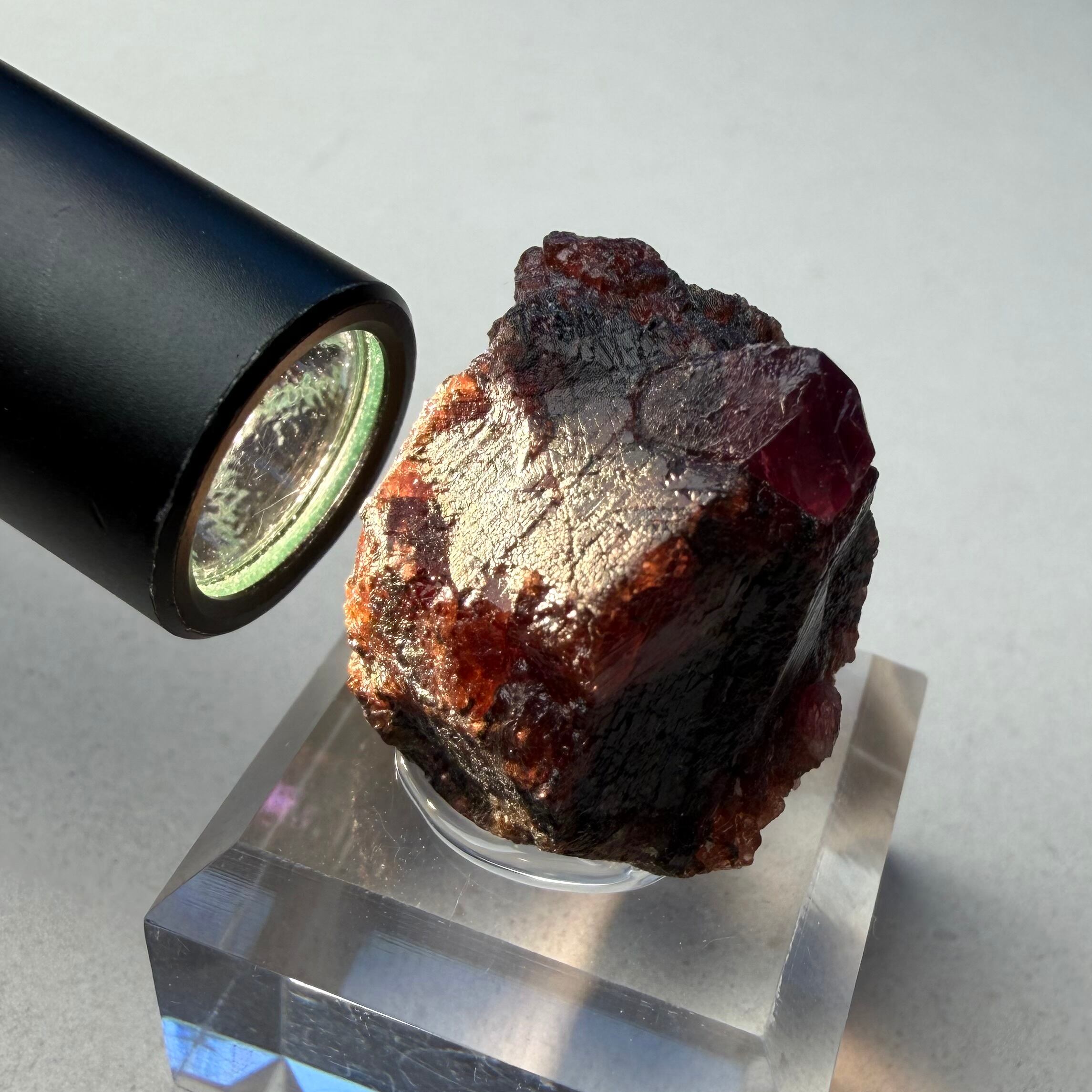 ルビーとは言い切れない、ある意味ウィンザ産らしいパープル混じりの発色が見られるサファイアと、ガーネットとのコンビネーション、特にメイン結晶はしっかりと宝石質な部分が見て取れます。