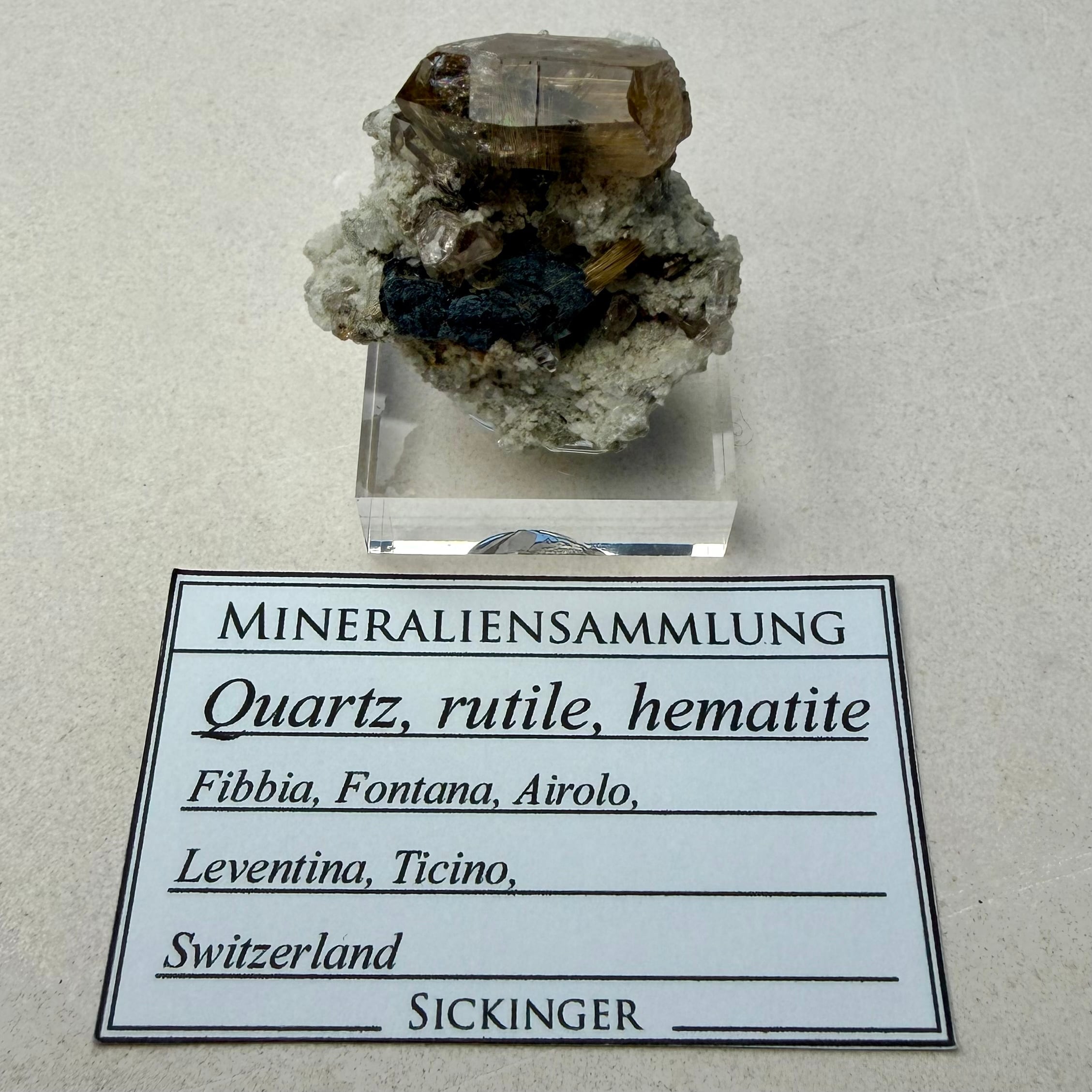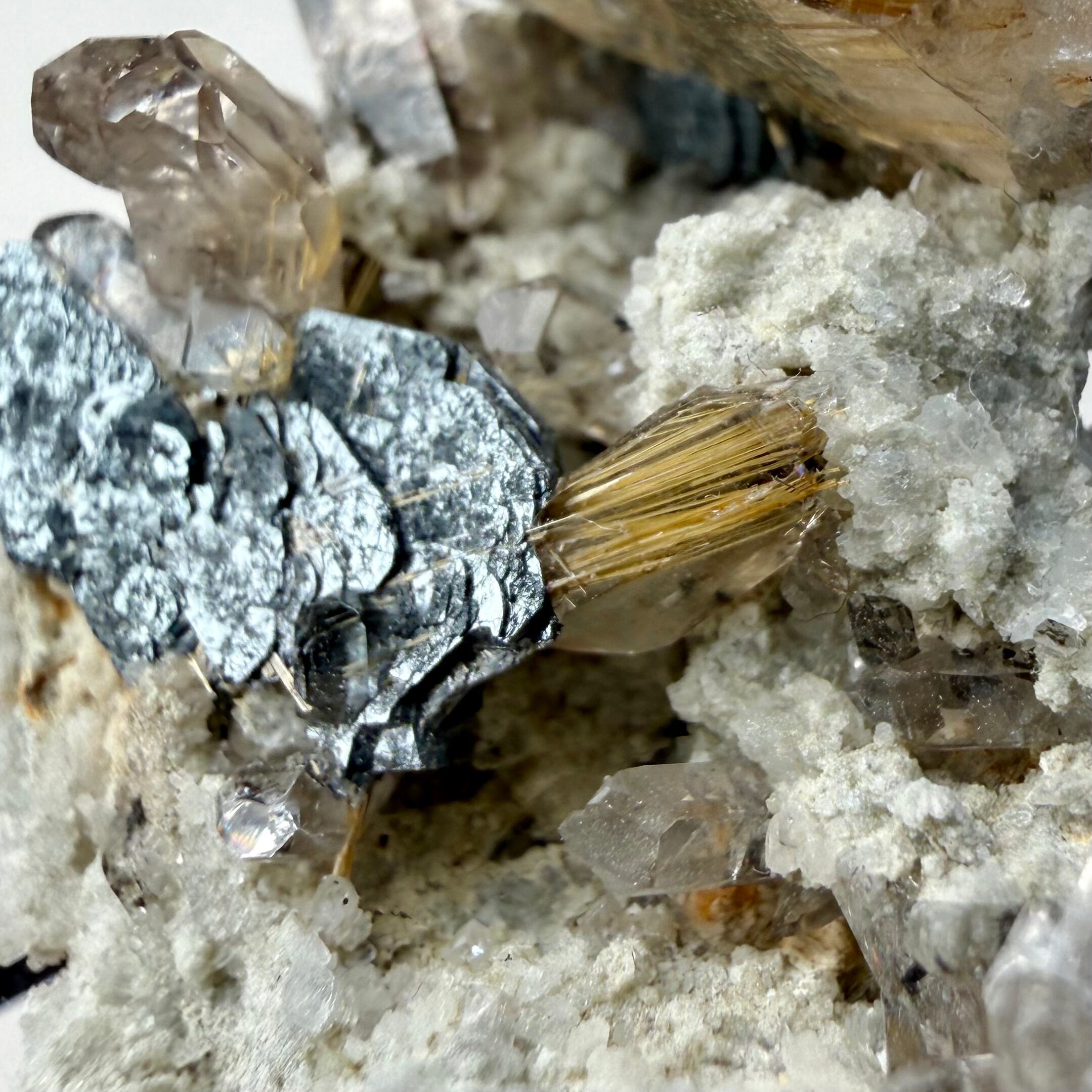 また、ヘマタイトとルチルとのコンビネーションも見られ、全体的なサイズ感は控えめながら見応えのある標本です。