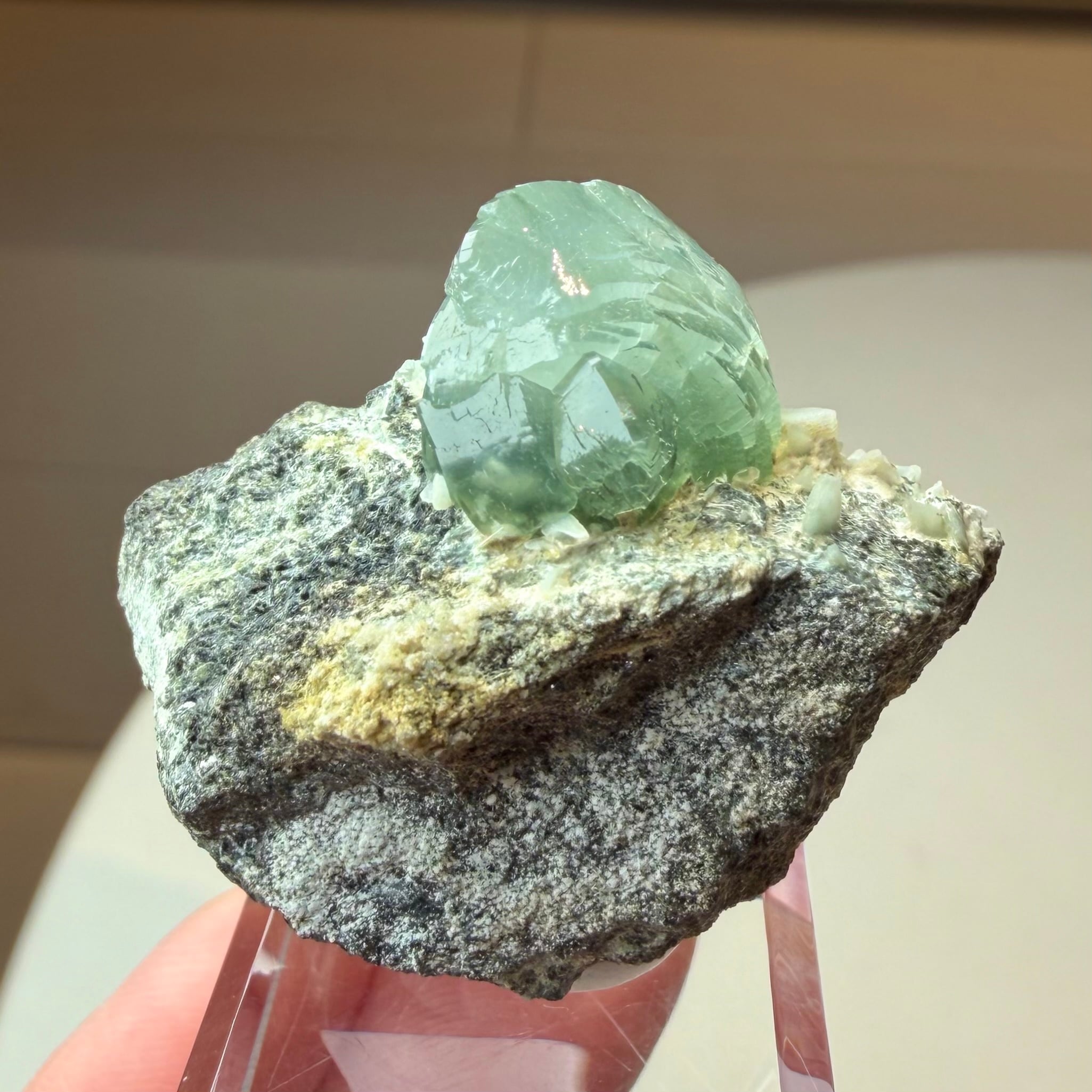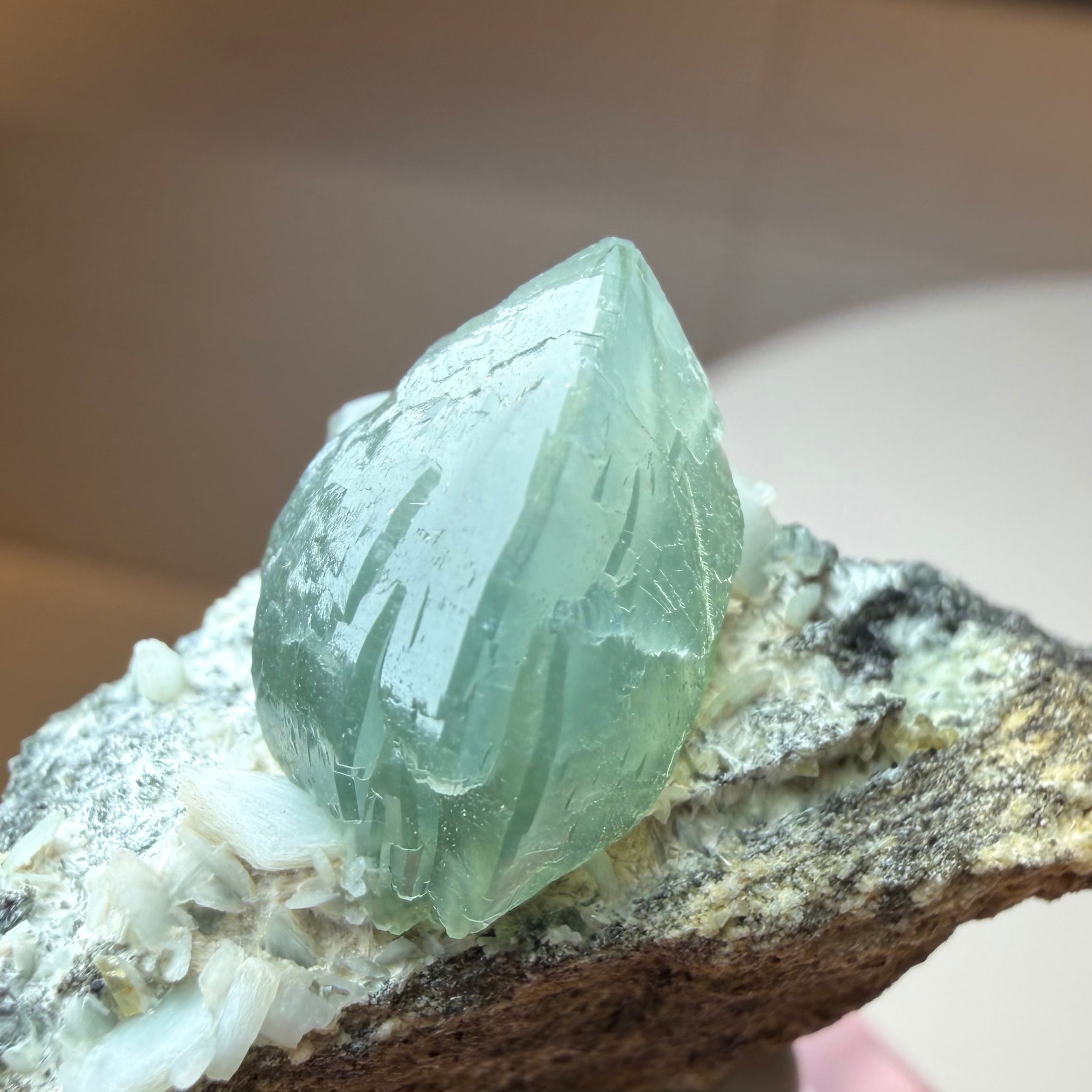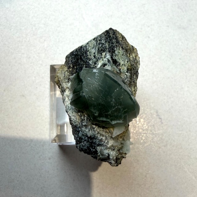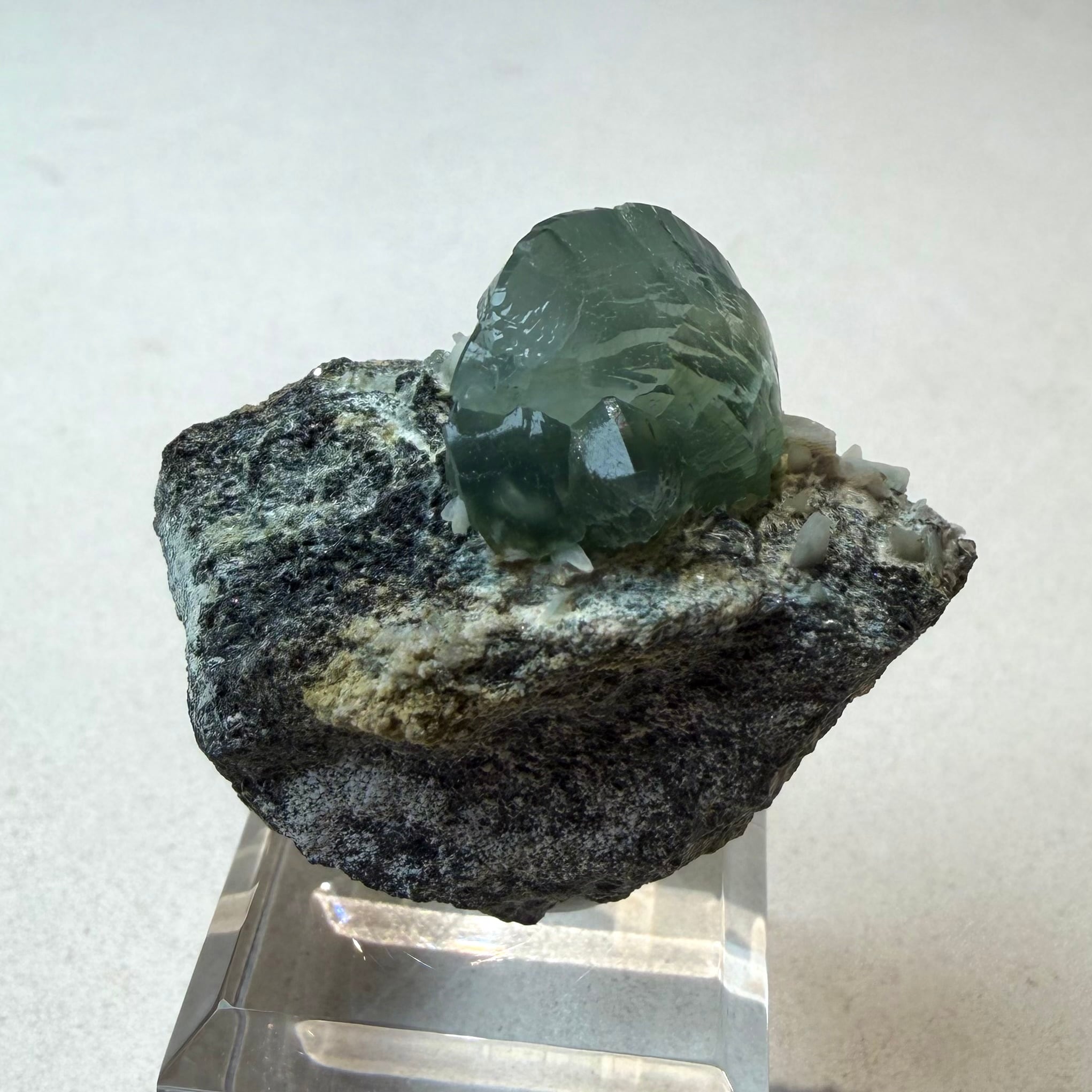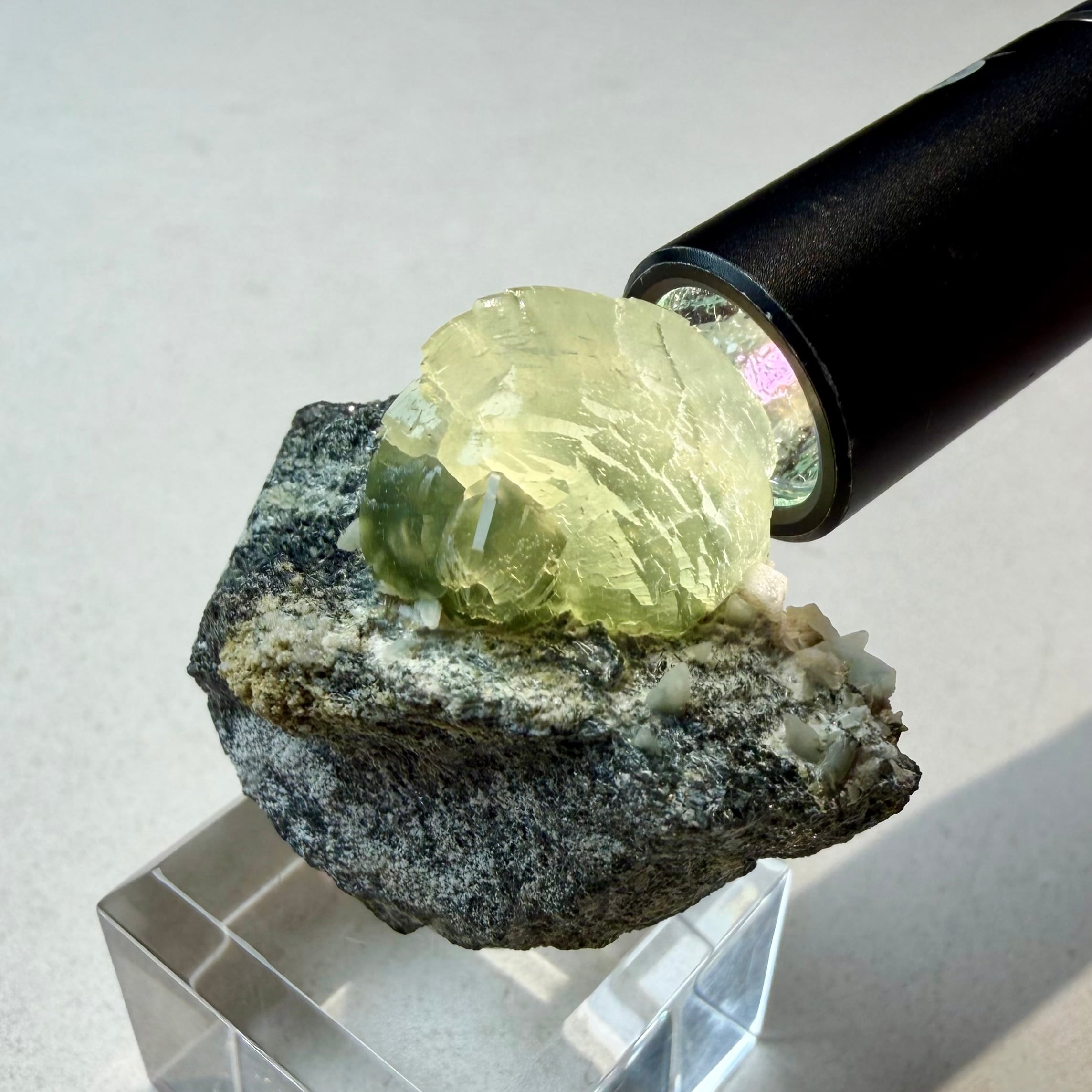 プレナイトとしては透明感がしっかりと残る結晶は、その光源によってモスグリーンの発色、濃淡に結構な違いが出ます。