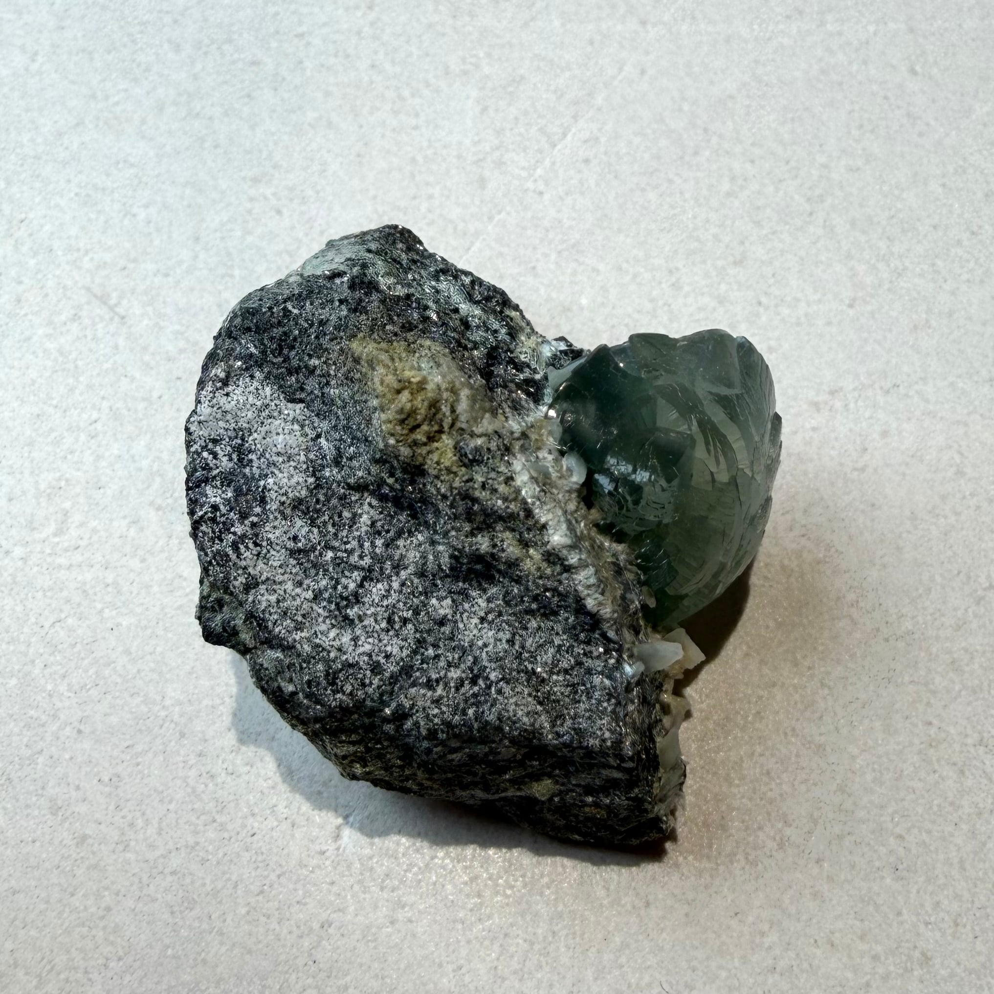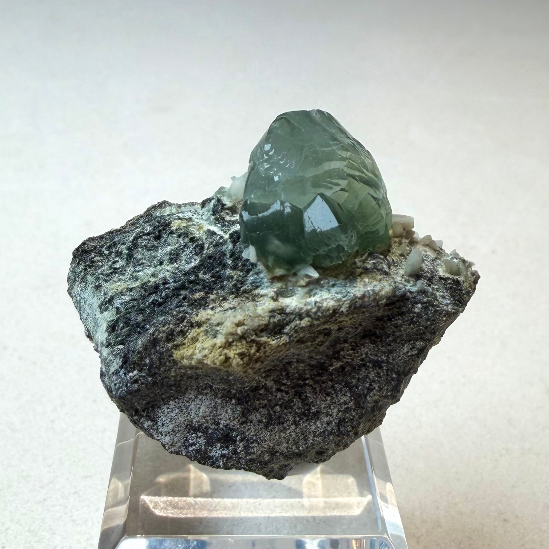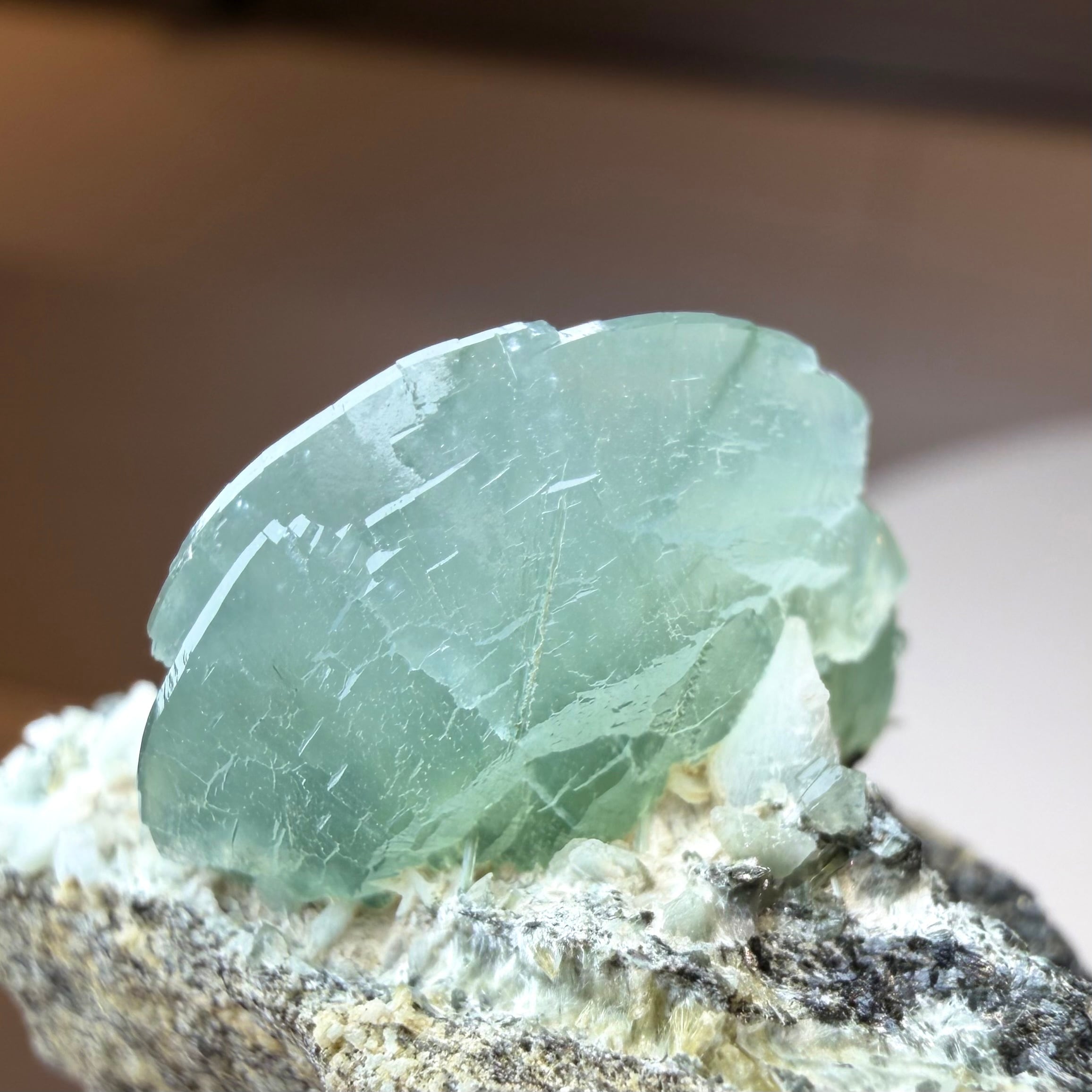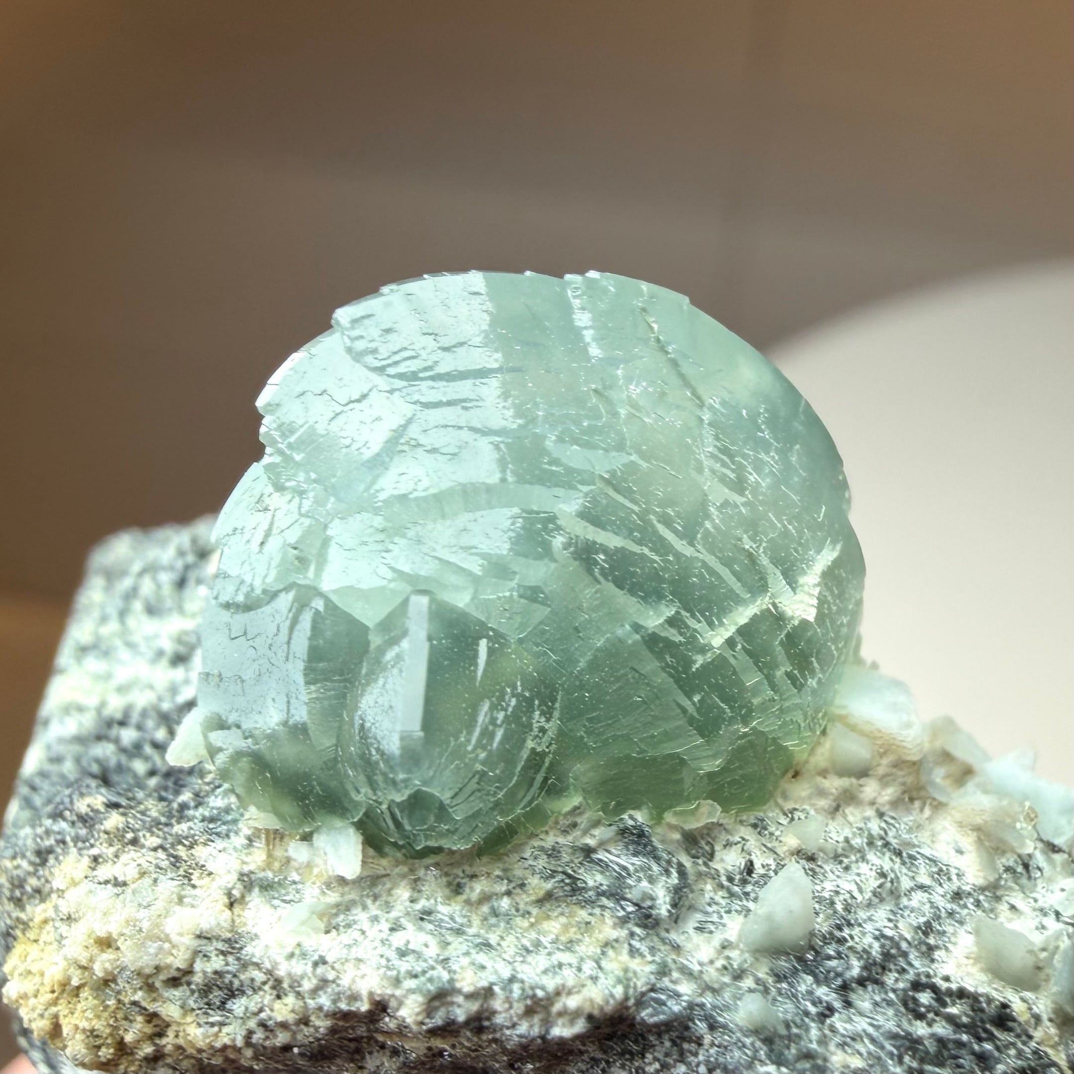 プレナイトとしては透明感がしっかりと残る結晶は、その光源によってモスグリーンの発色、濃淡に結構な違いが出ます。