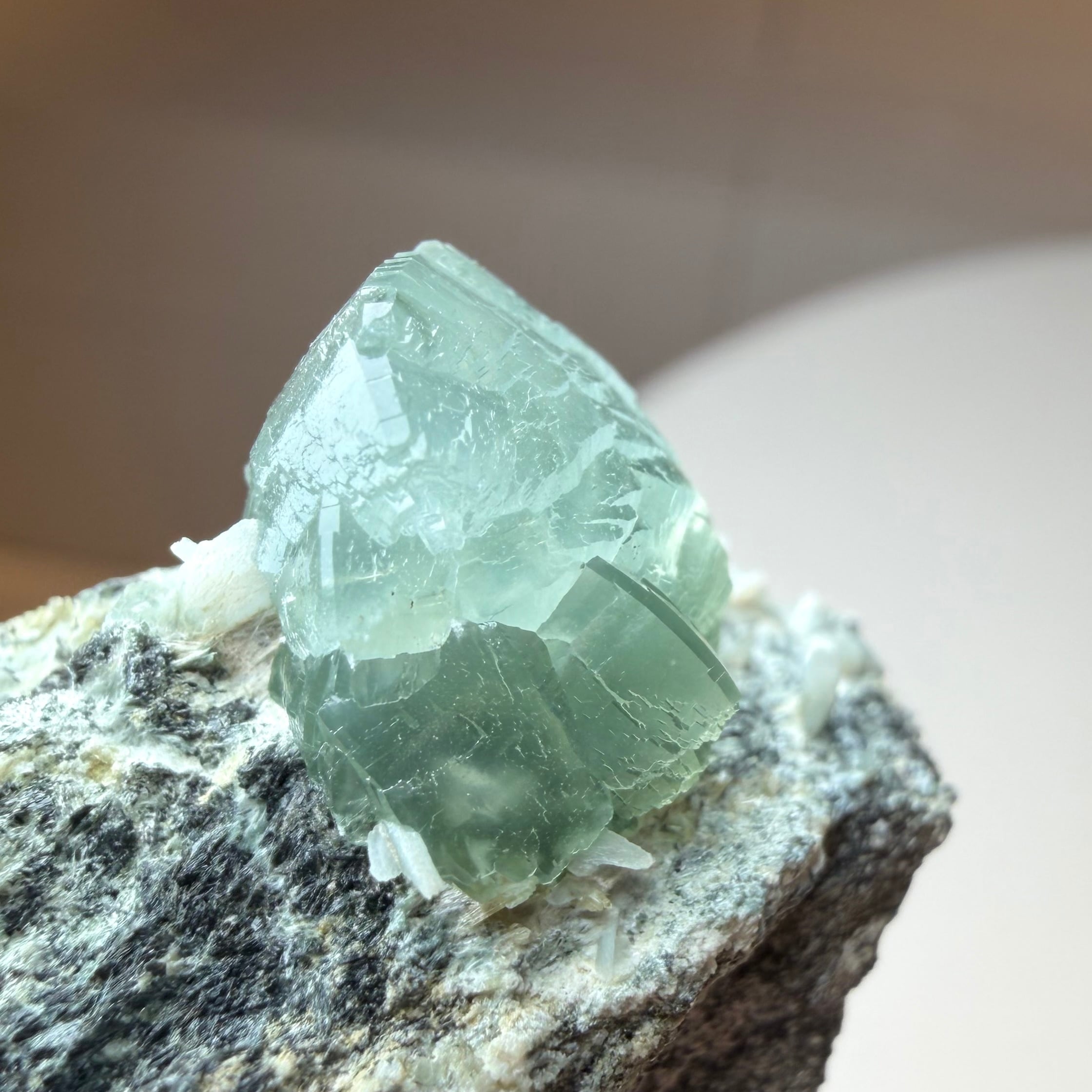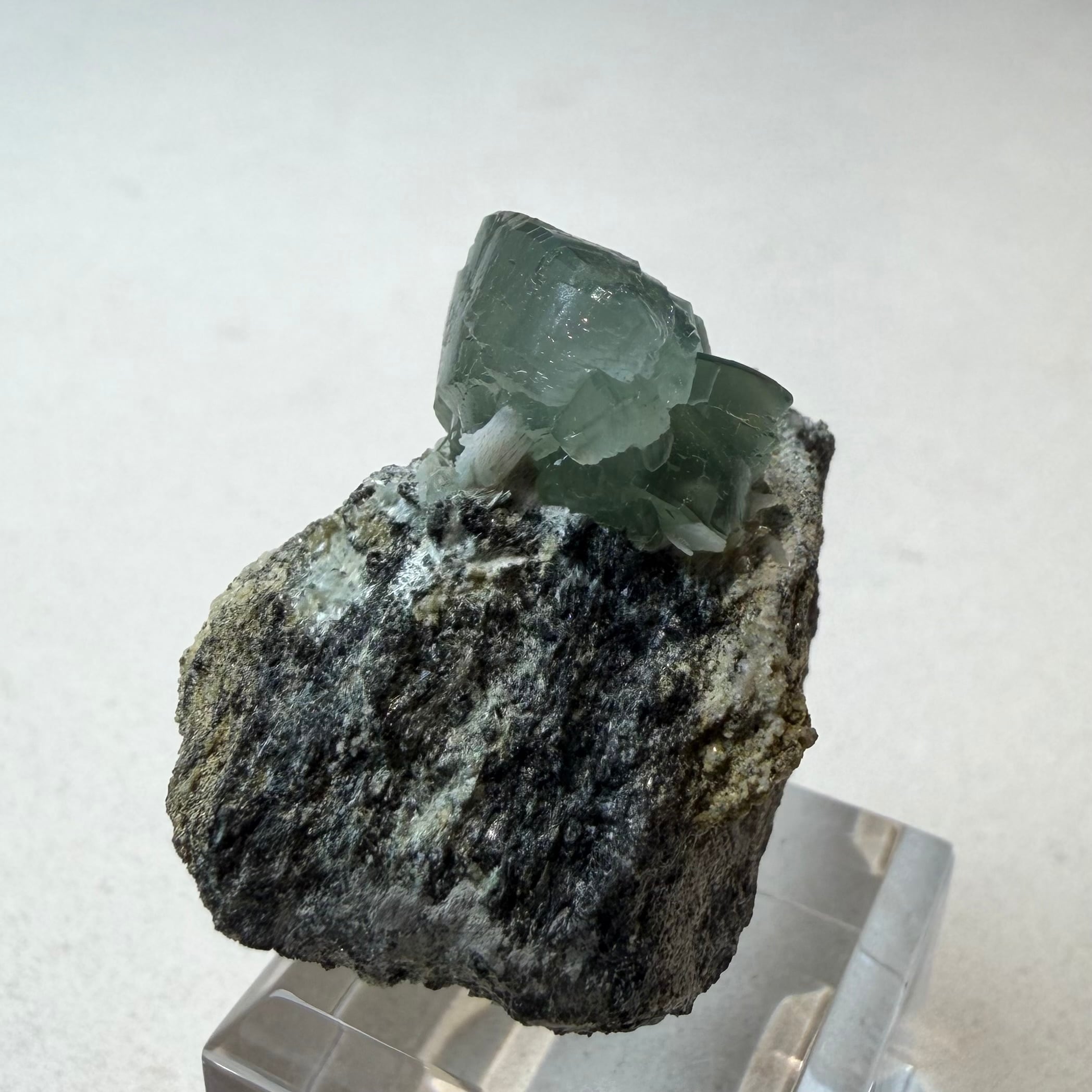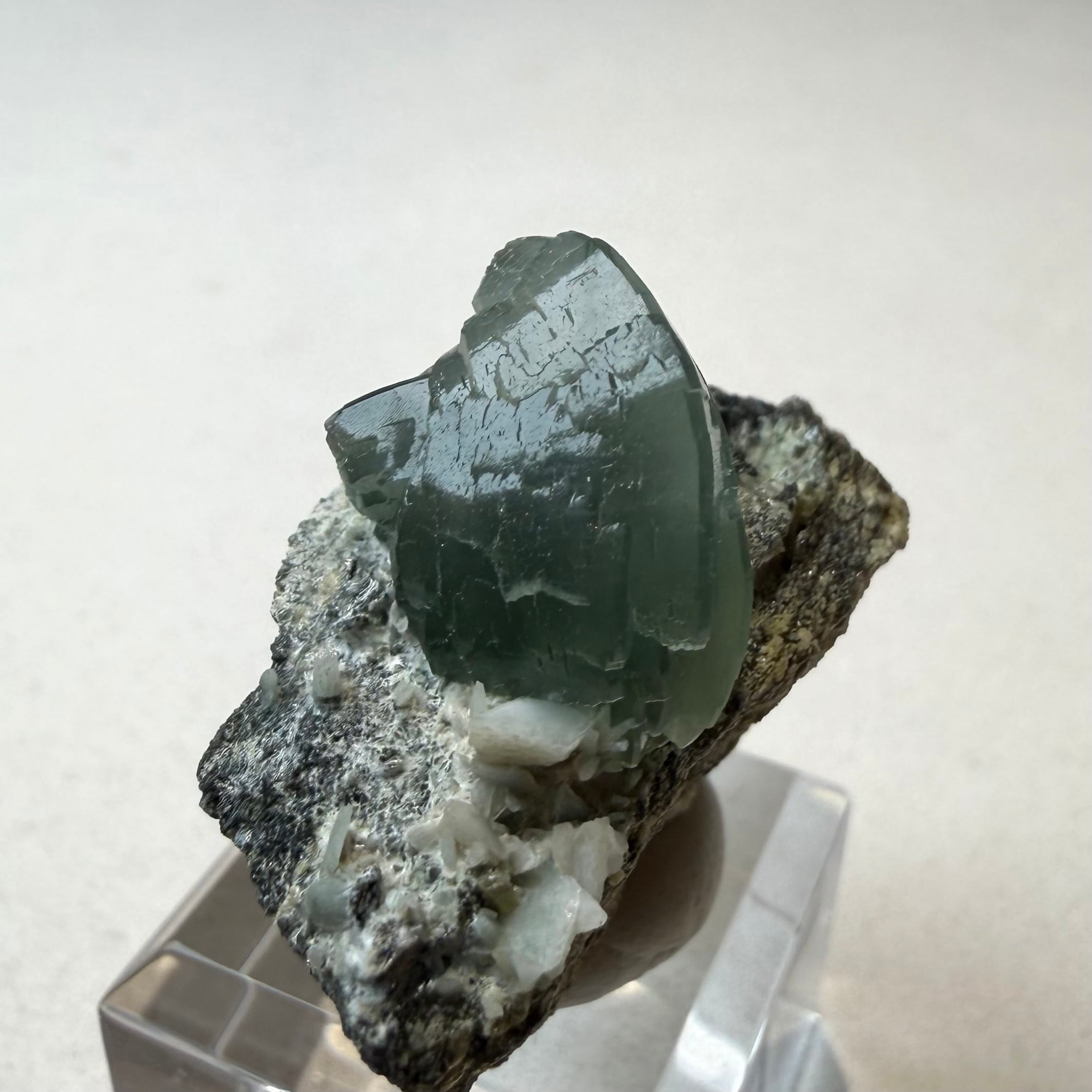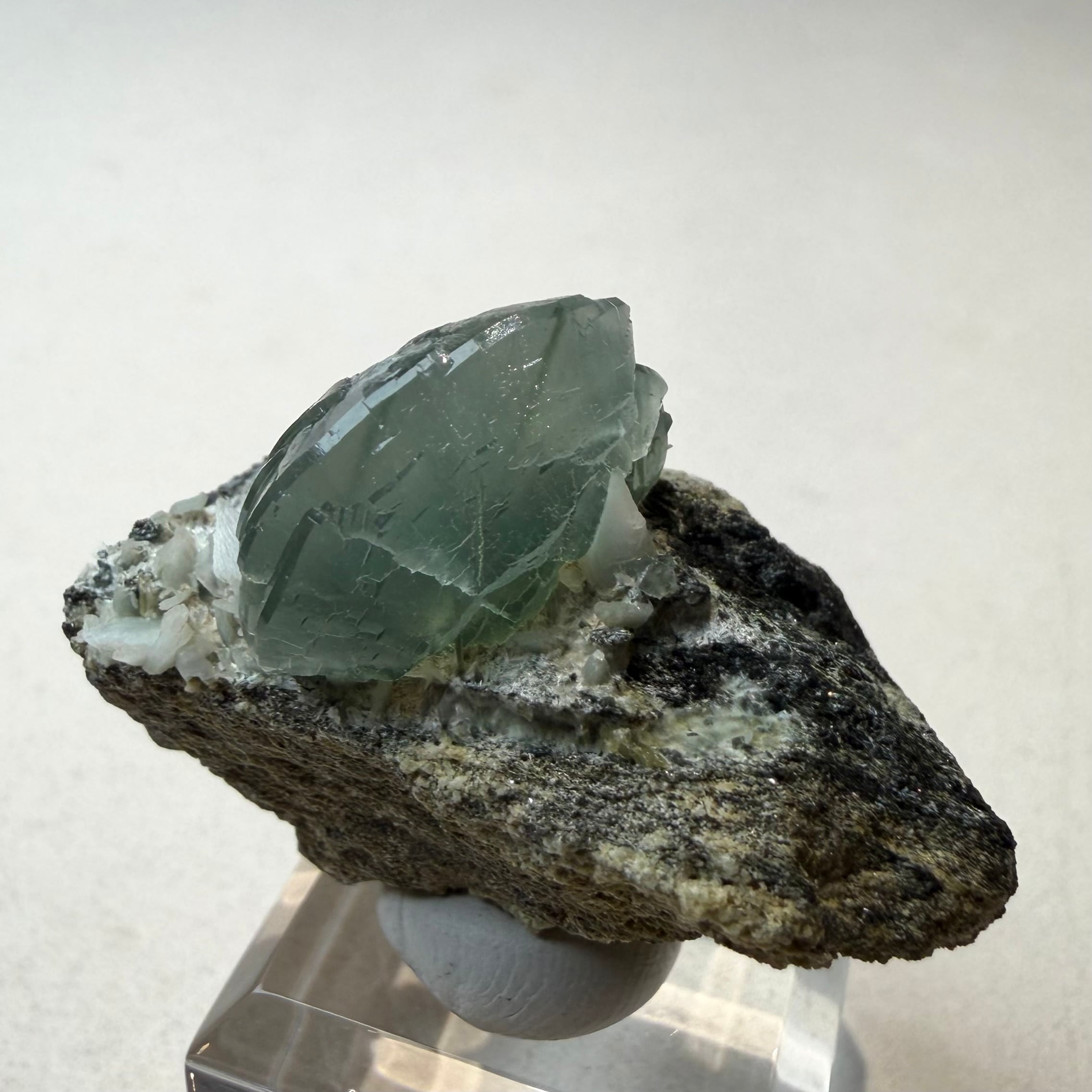プレナイトとしては透明感がしっかりと残る結晶は、その光源によってモスグリーンの発色、濃淡に結構な違いが出ます。