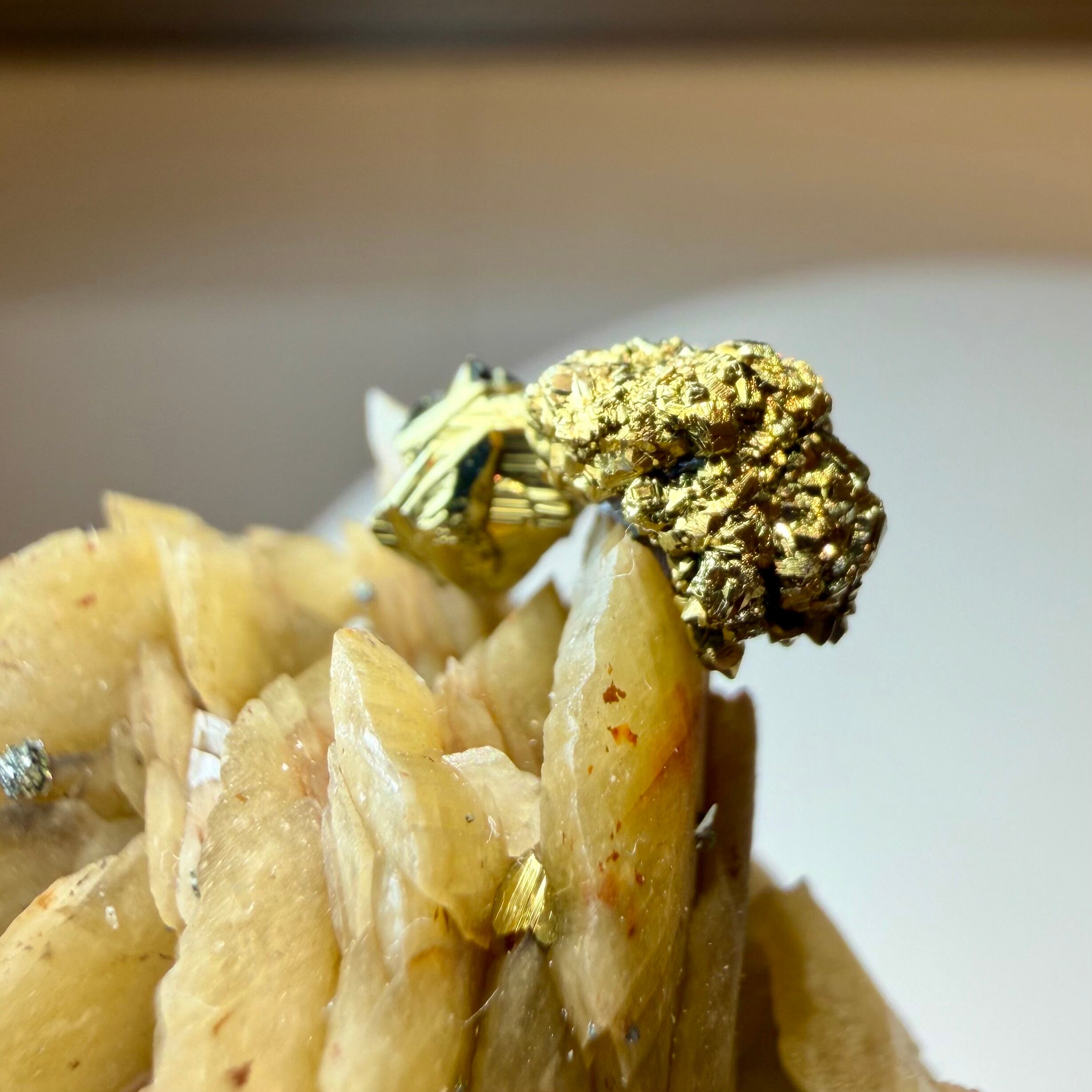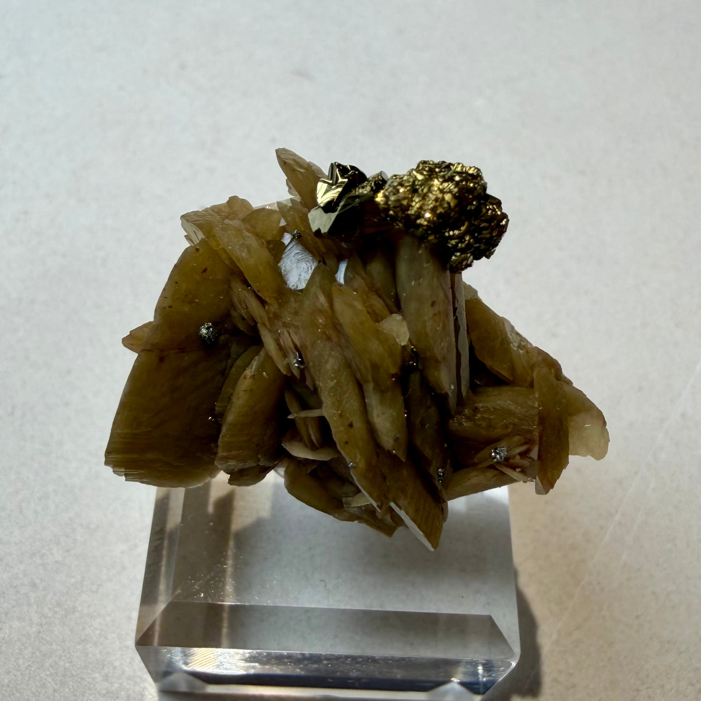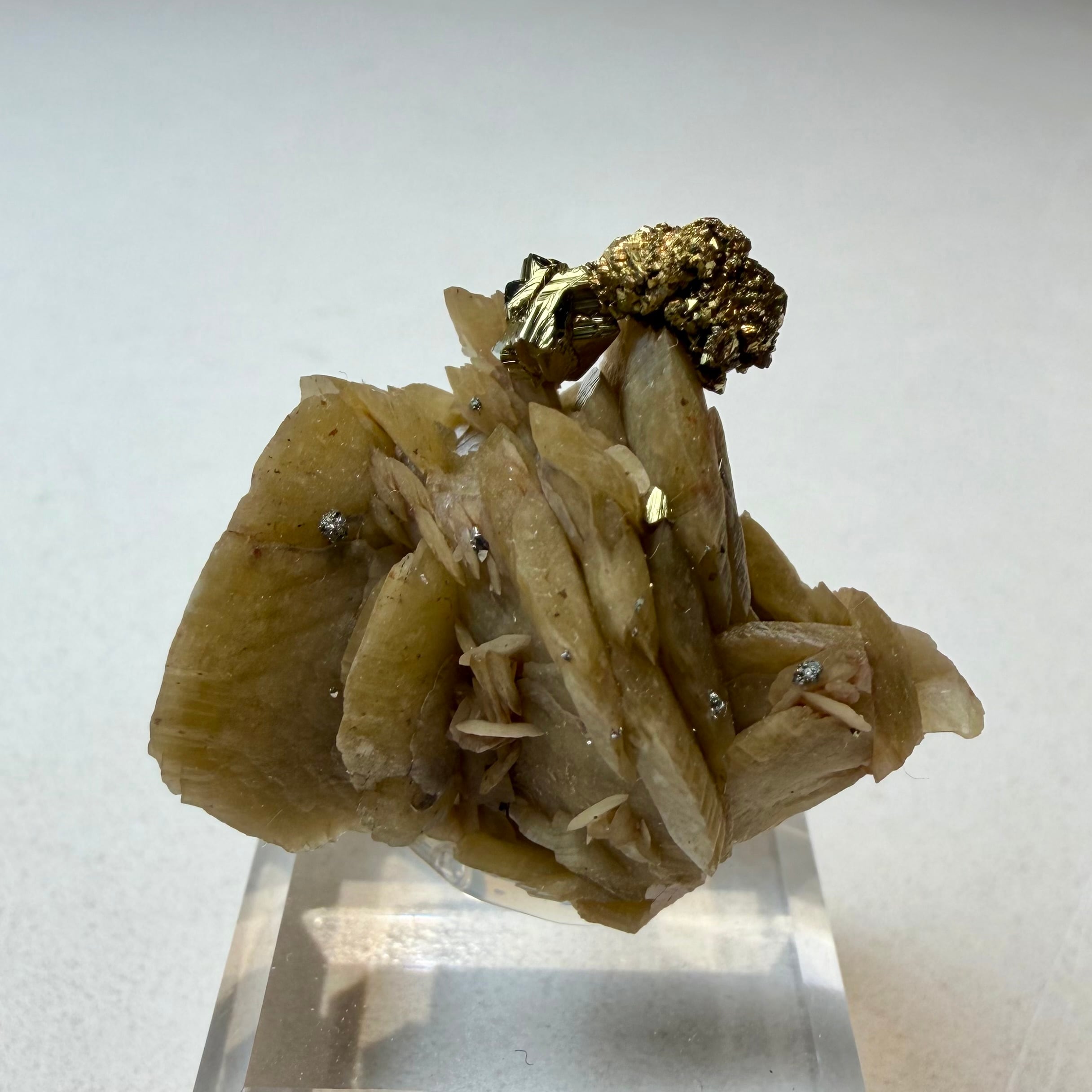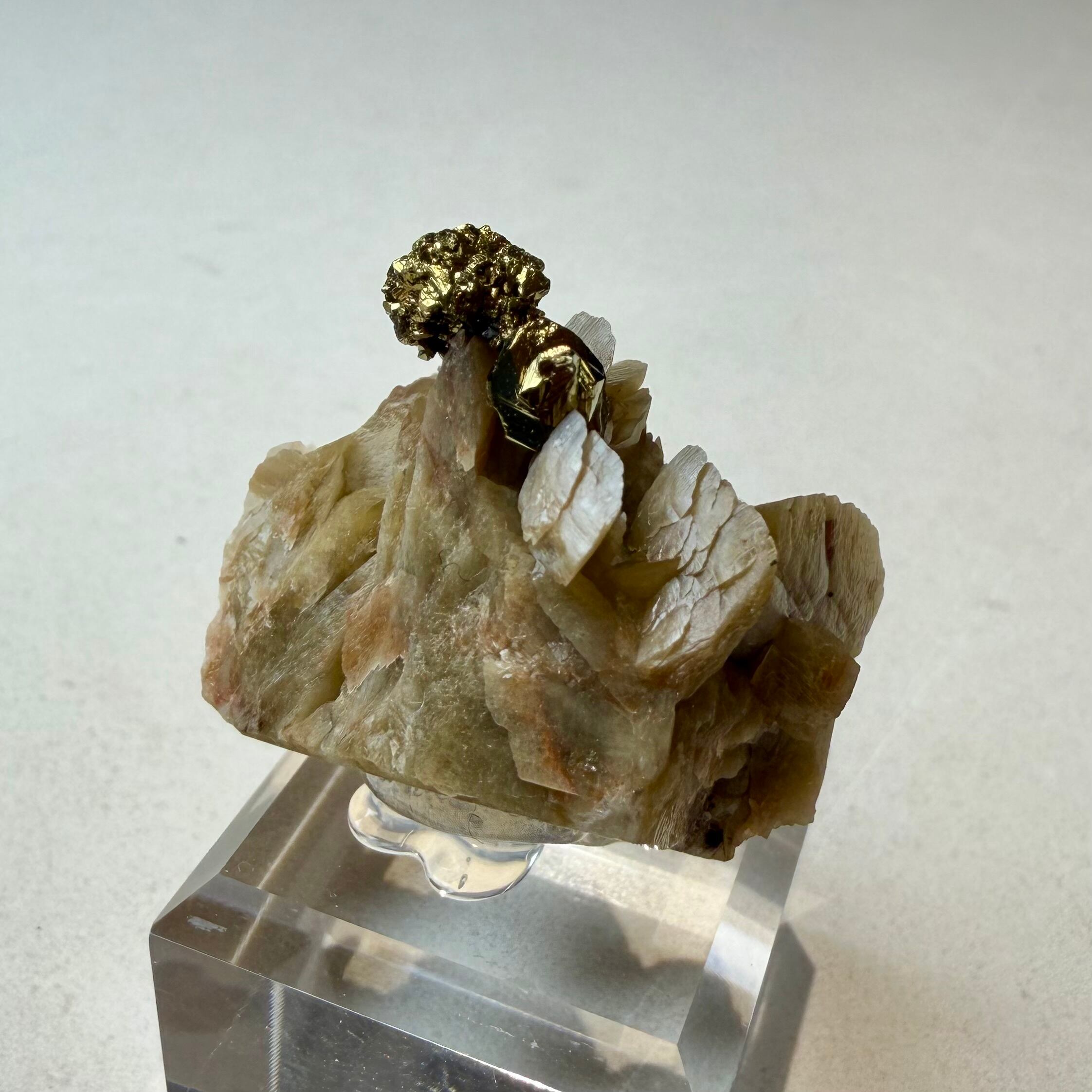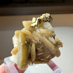 板状の結晶が重なり合ったシデライトと、その上方のちょうどバランスのいい場所にキャルコパイライトが結晶し、非常にユニークで纏まりのある景色が楽しめます。