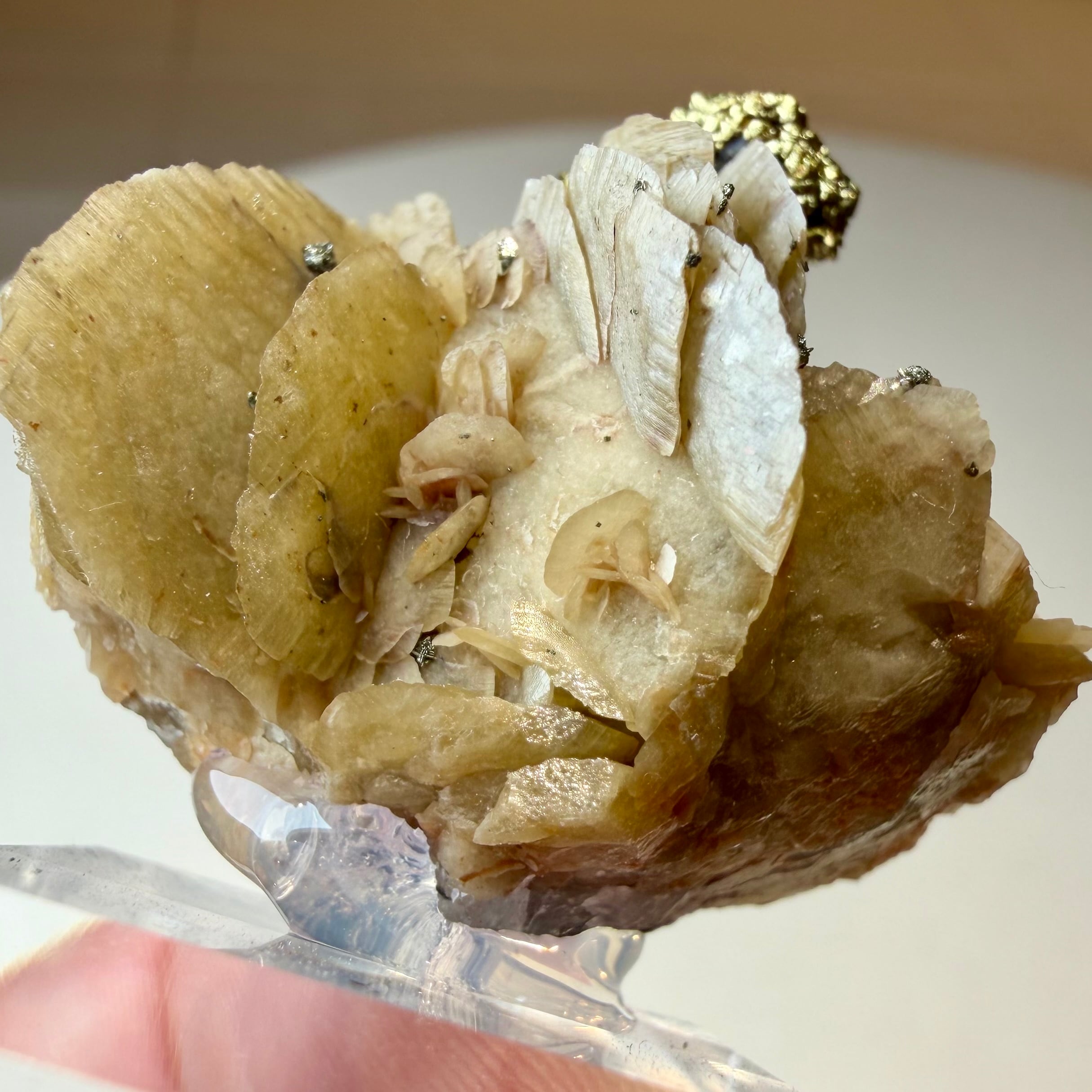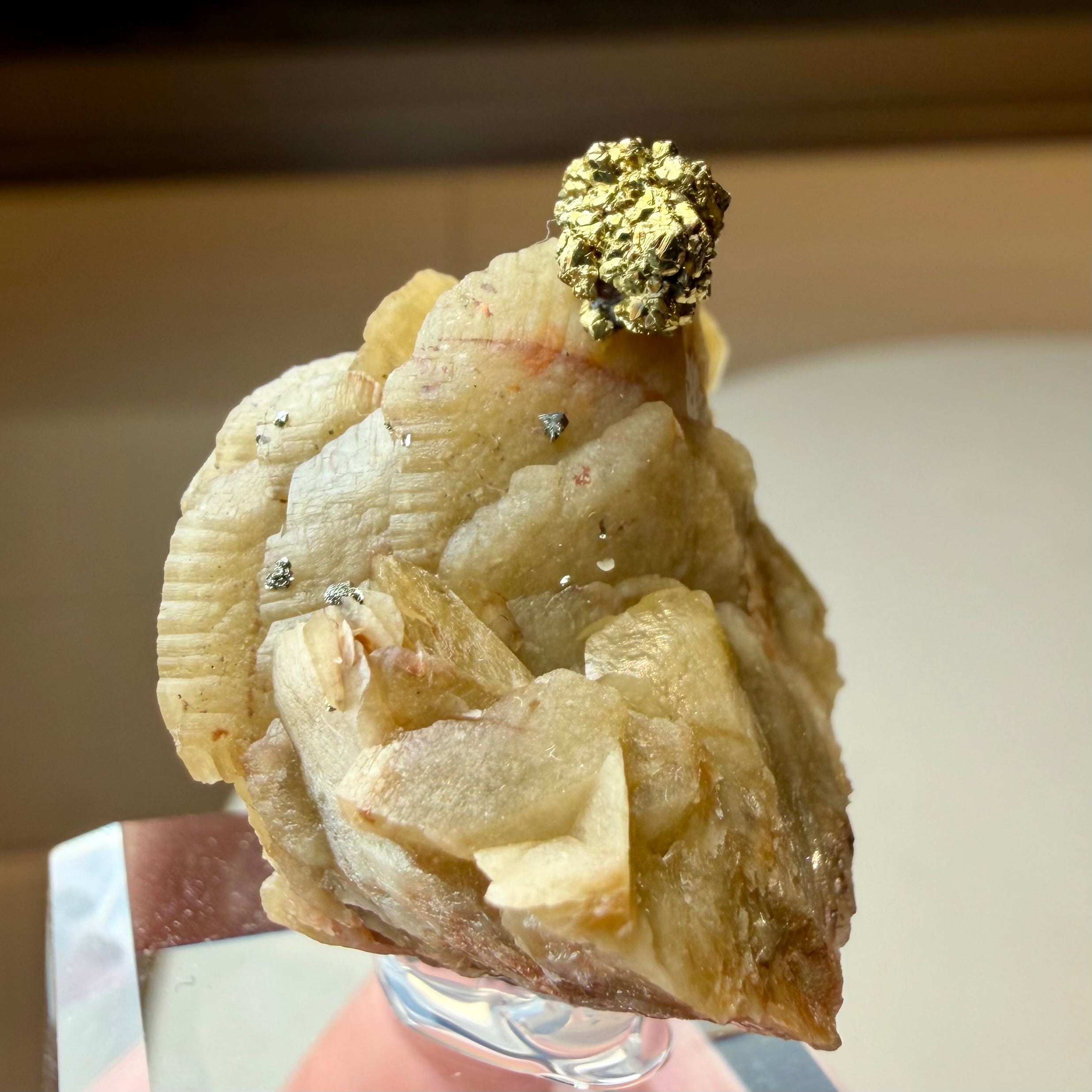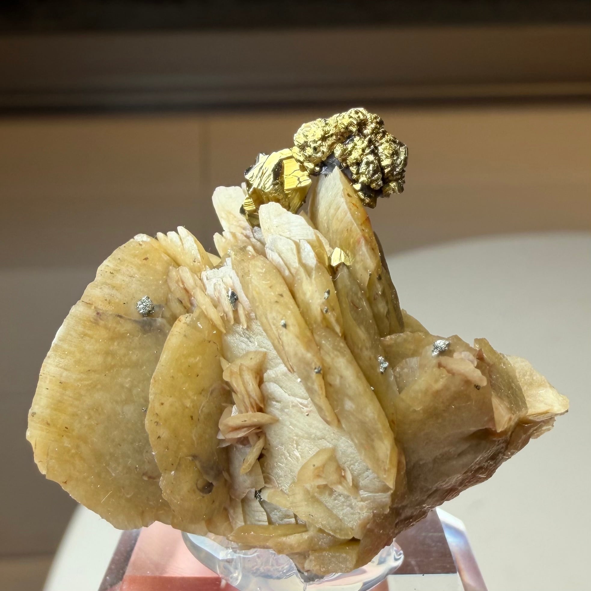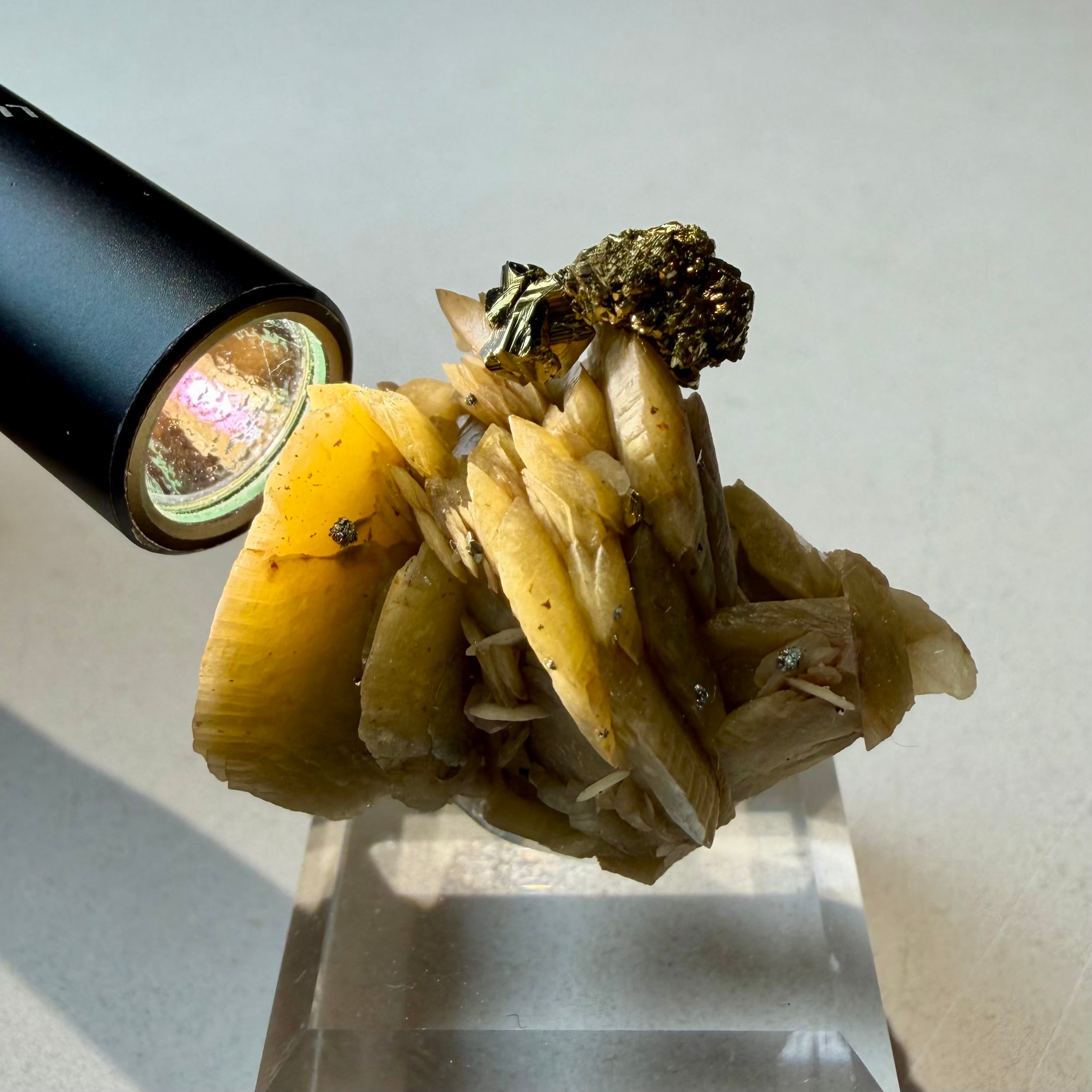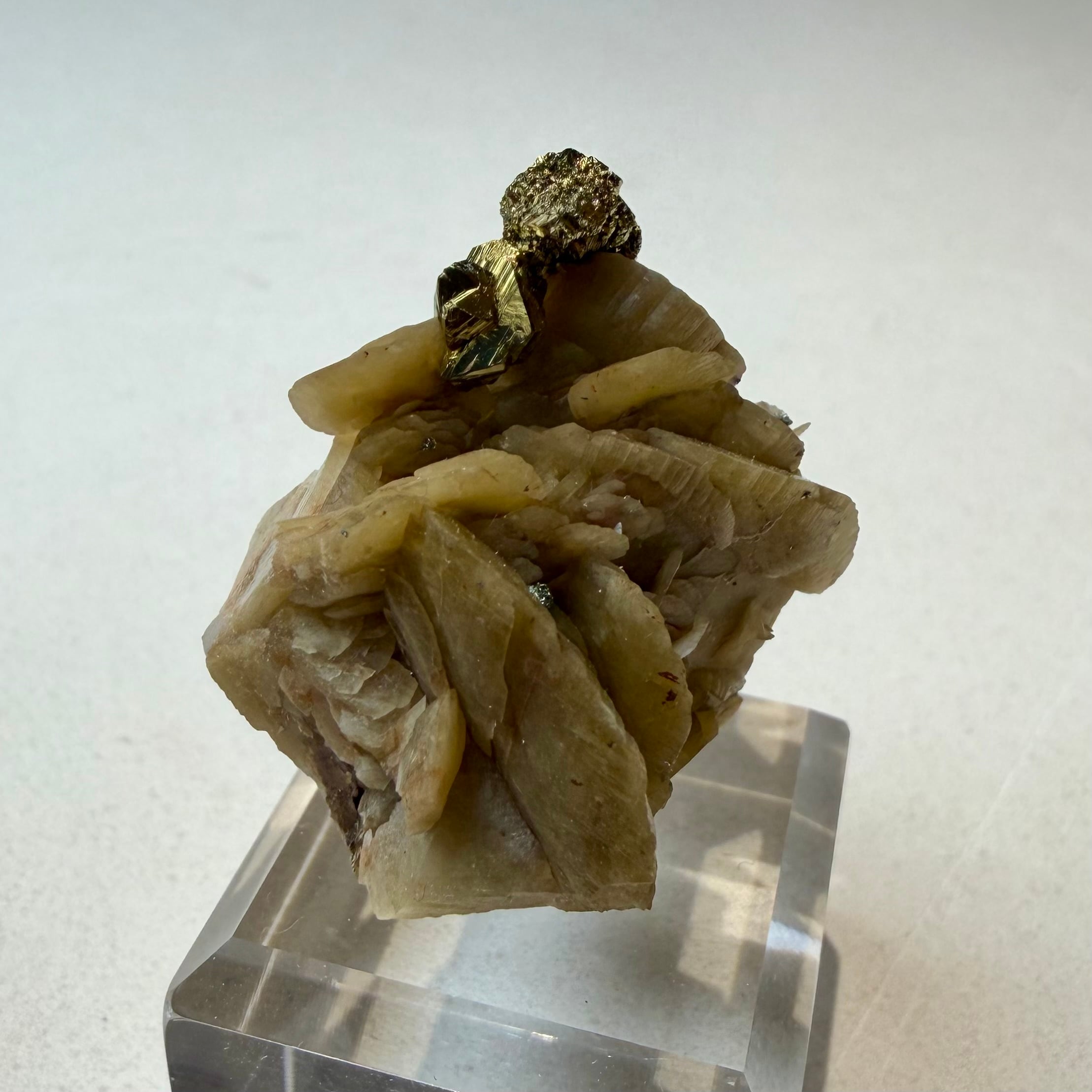 板状の結晶が重なり合ったシデライトと、その上方のちょうどバランスのいい場所にキャルコパイライトが結晶し、非常にユニークで纏まりのある景色が楽しめます。