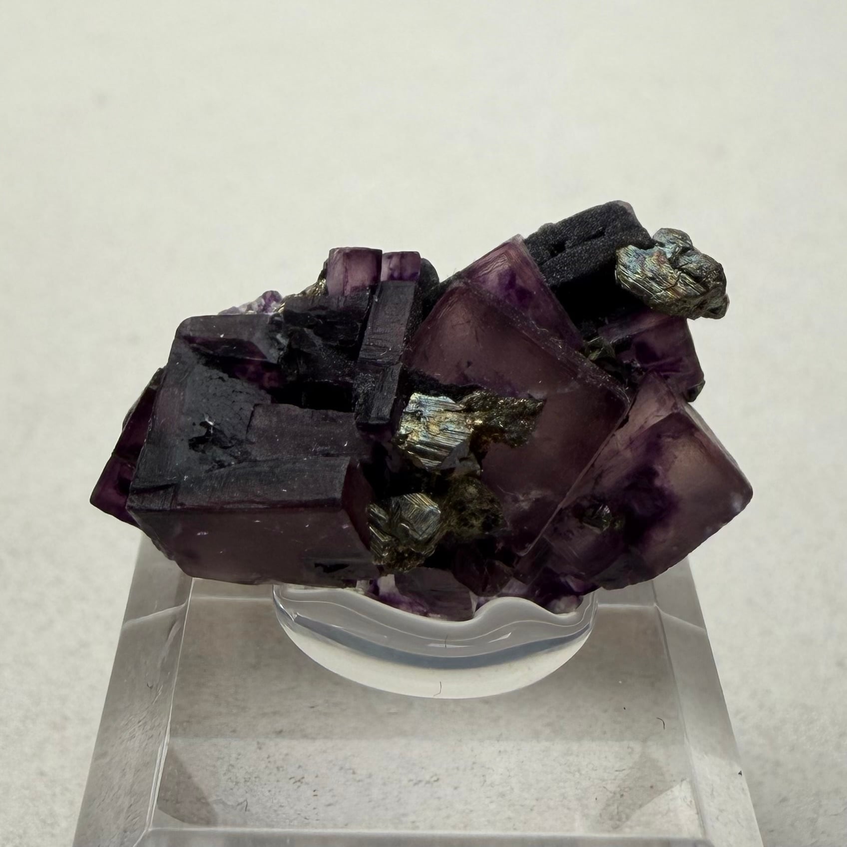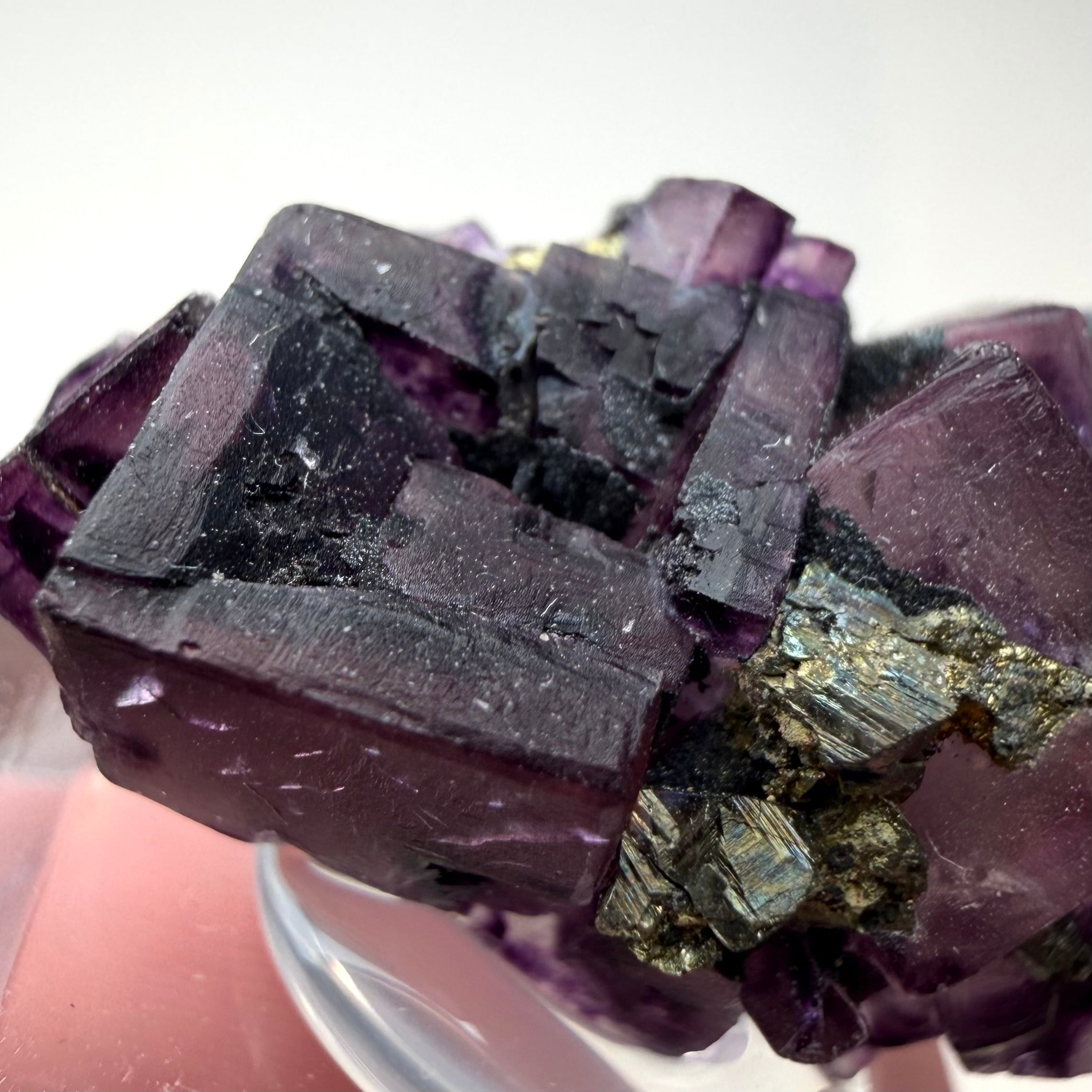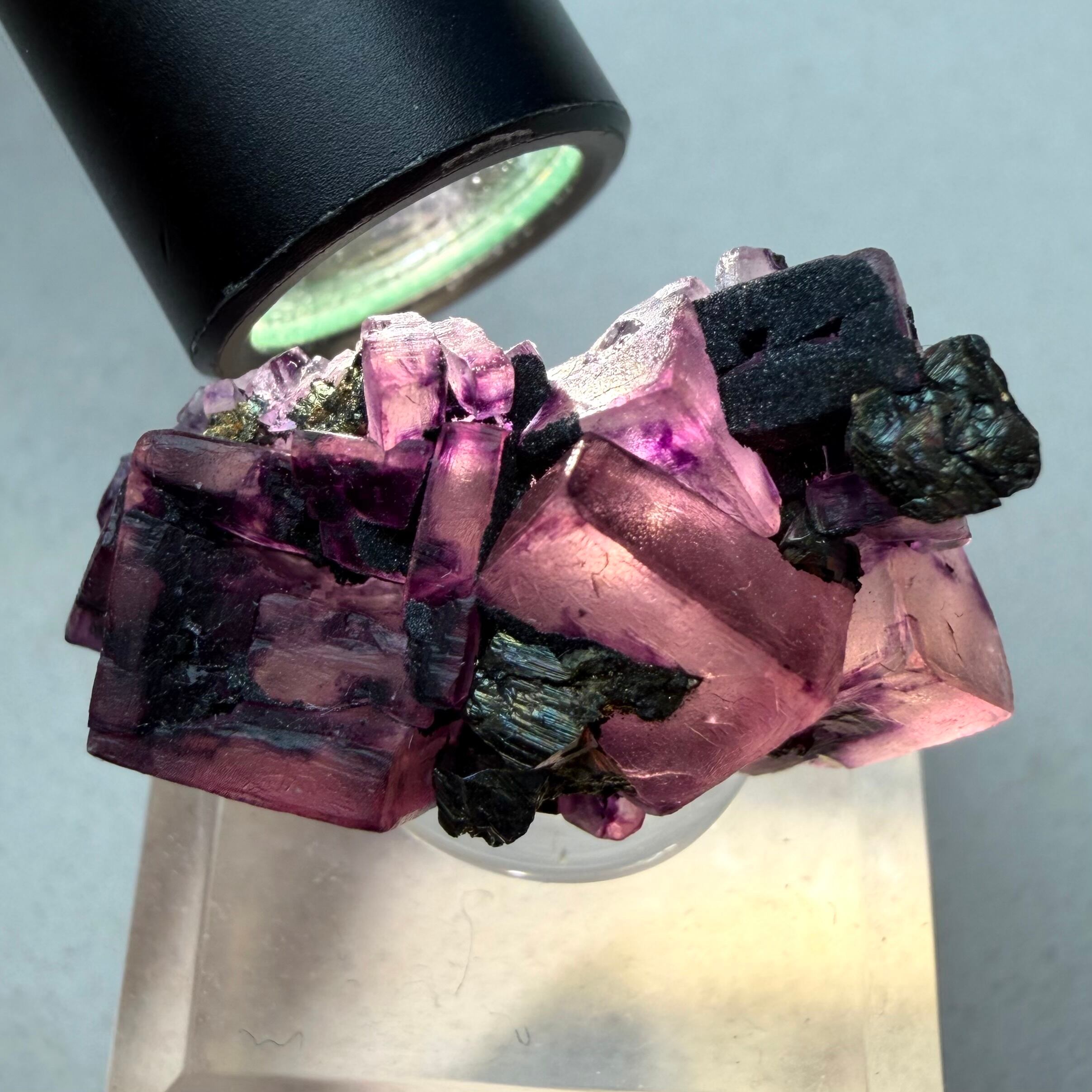 一部をヘマタイトが覆いますがフローライトが露出した部分の方が多く、透過光下では美しい発色が見られます。