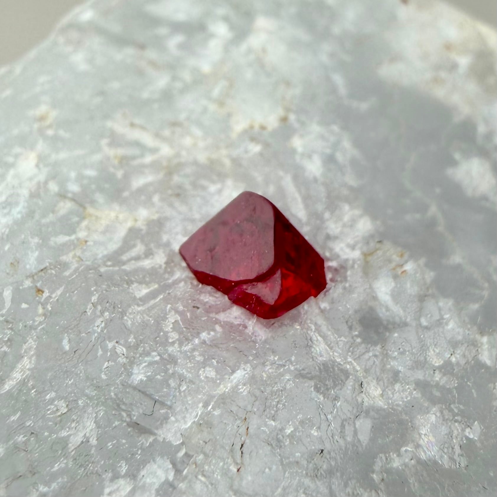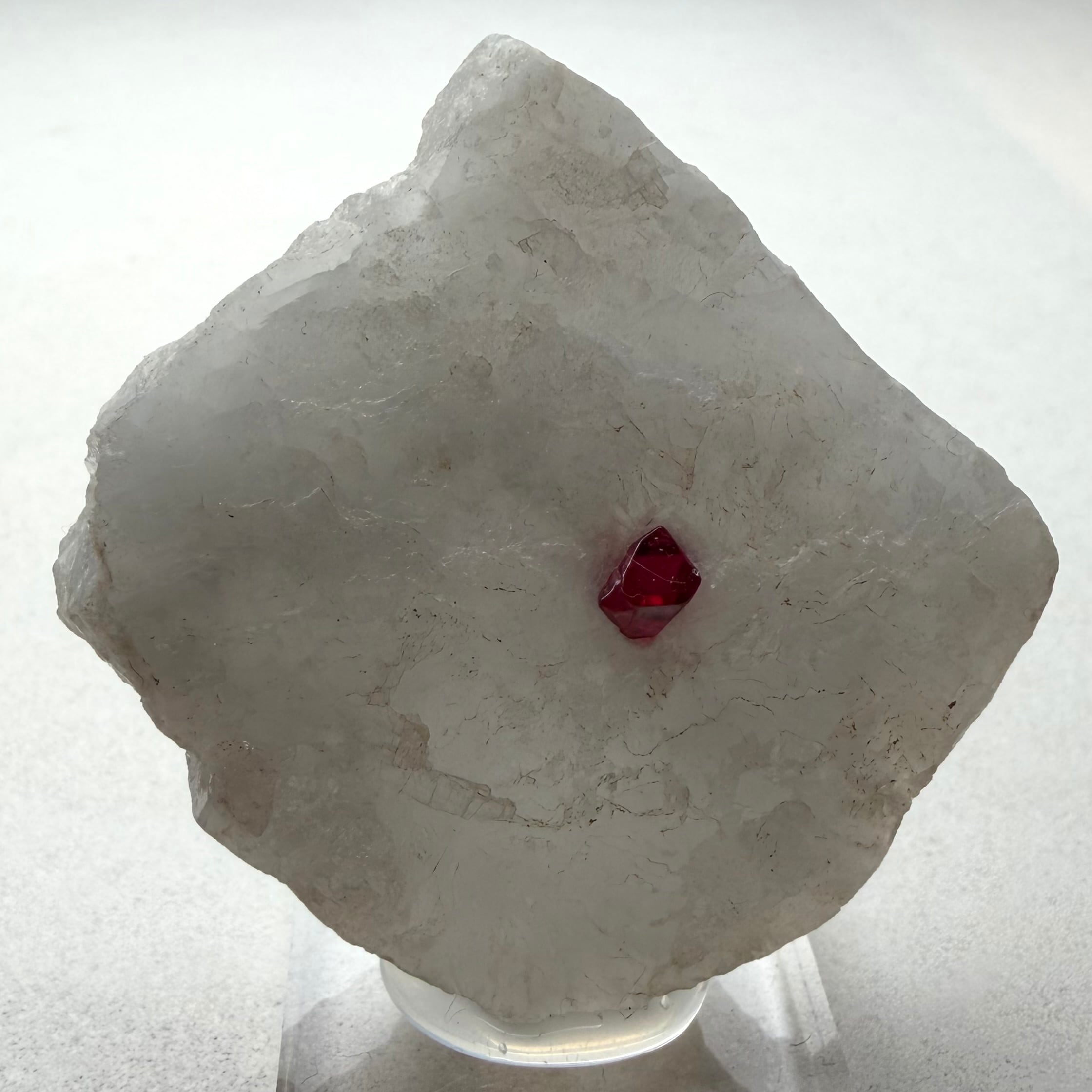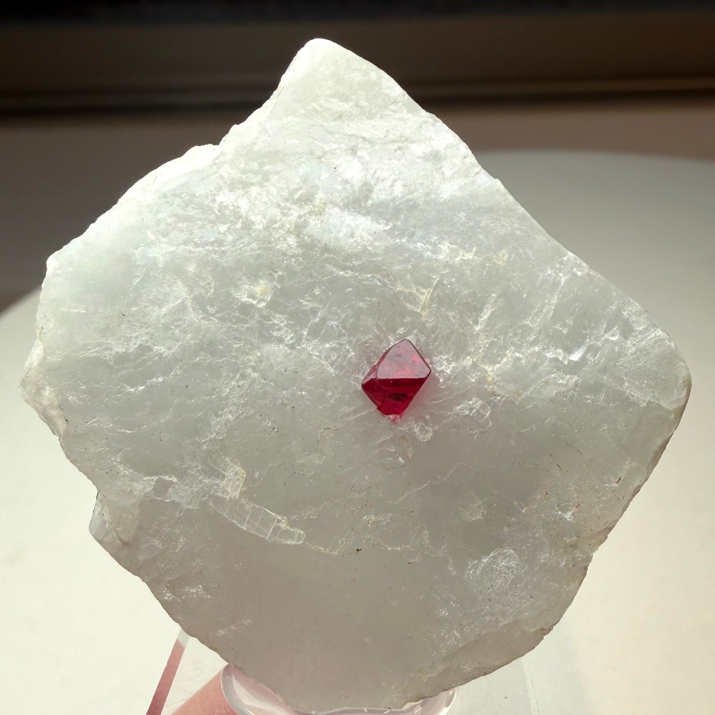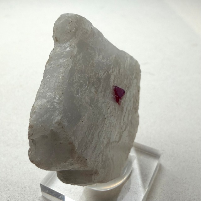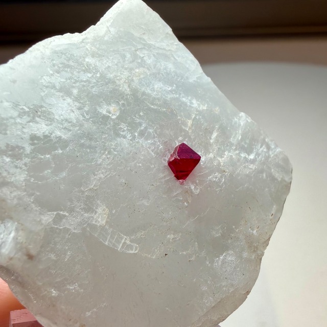 真っ白な母岩との対比が印象的な景色で、スピネルのサイズ感は小さめですが、結晶の形状、透明度、テリ、真紅の発色、その全てが揃う標本です。