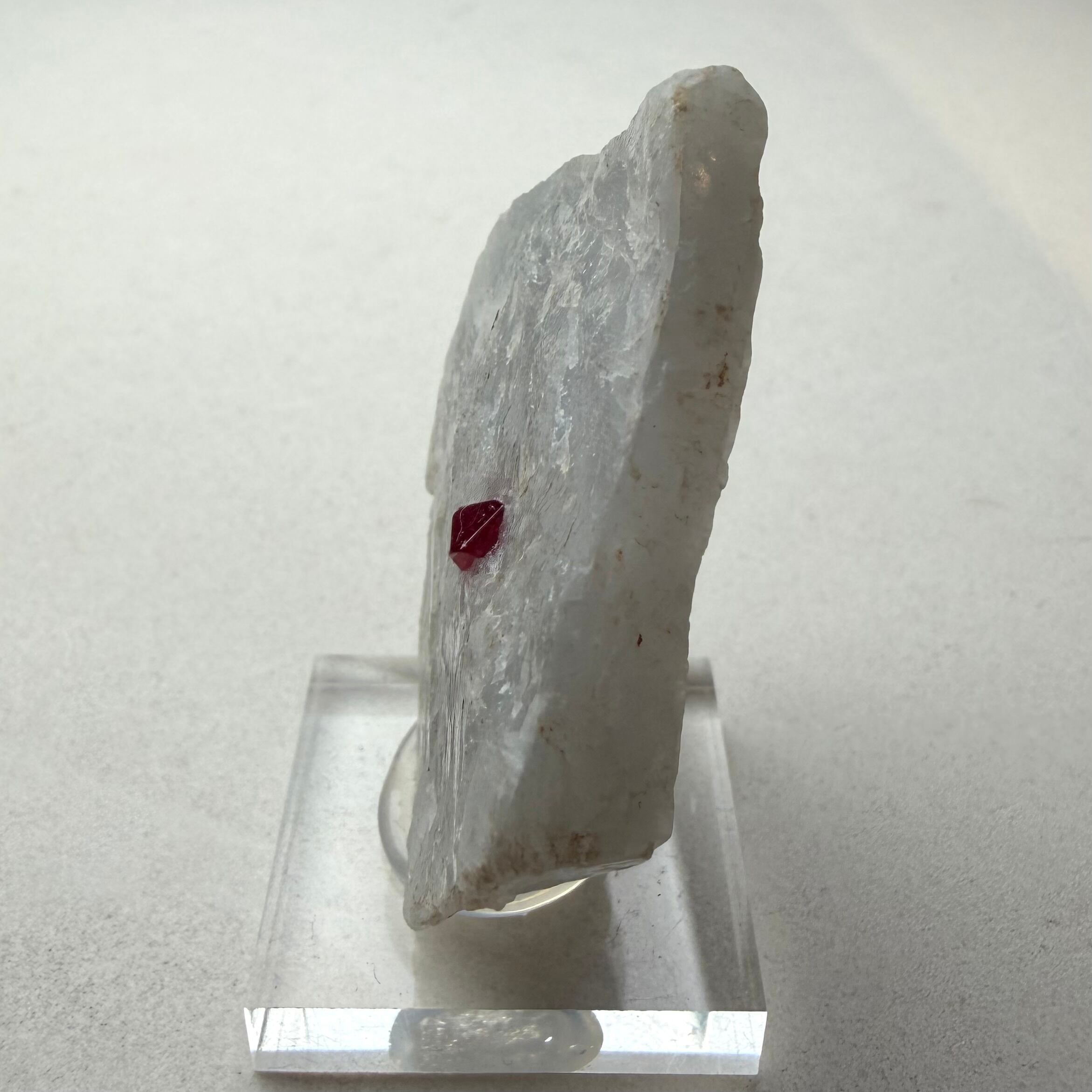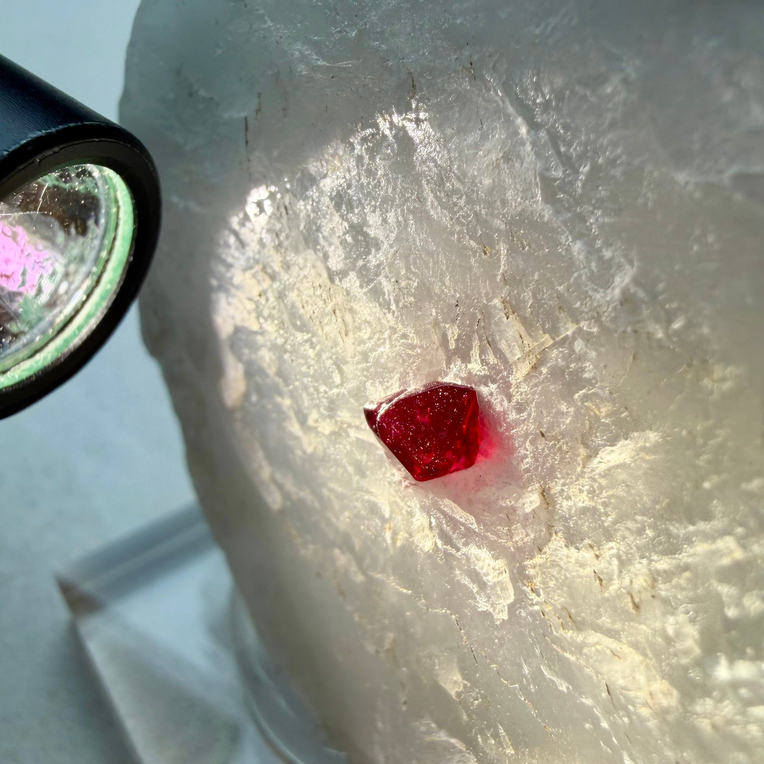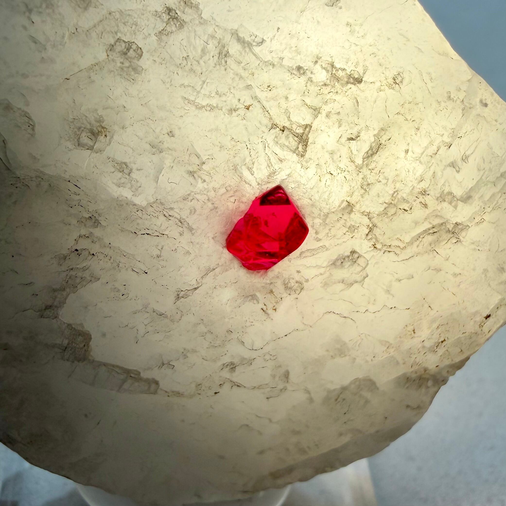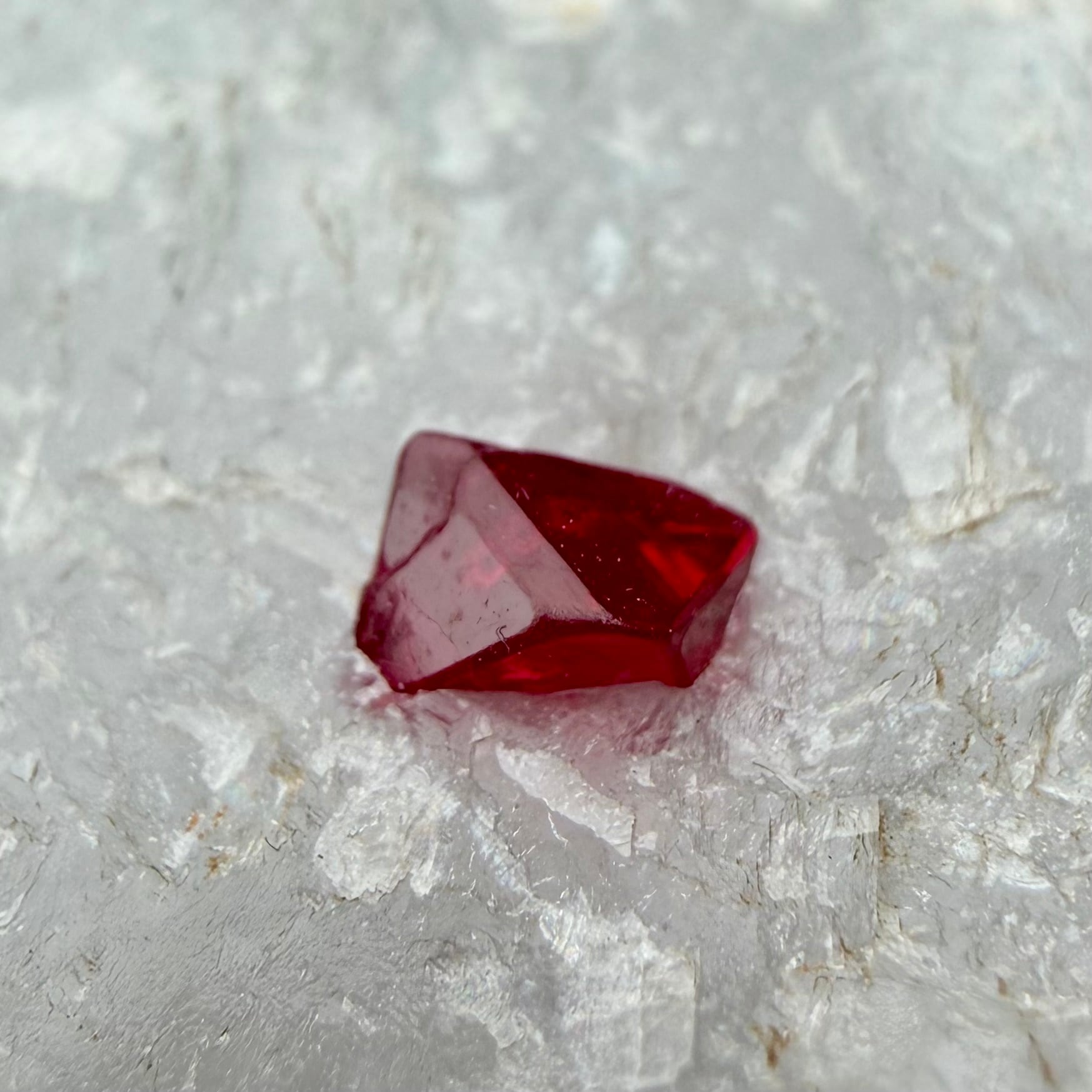 真っ白な母岩との対比が印象的な景色で、スピネルのサイズ感は小さめですが、結晶の形状、透明度、テリ、真紅の発色、その全てが揃う標本です。