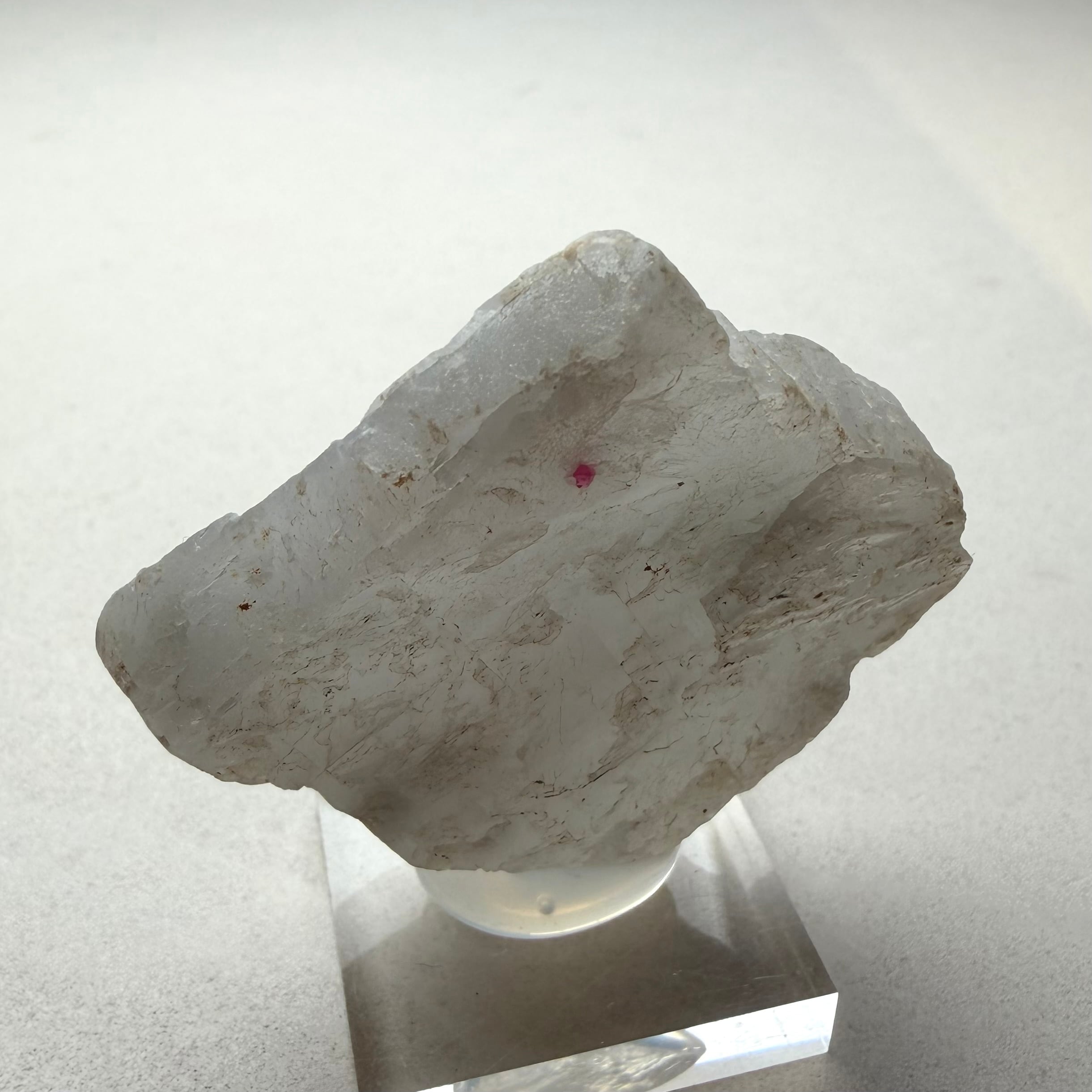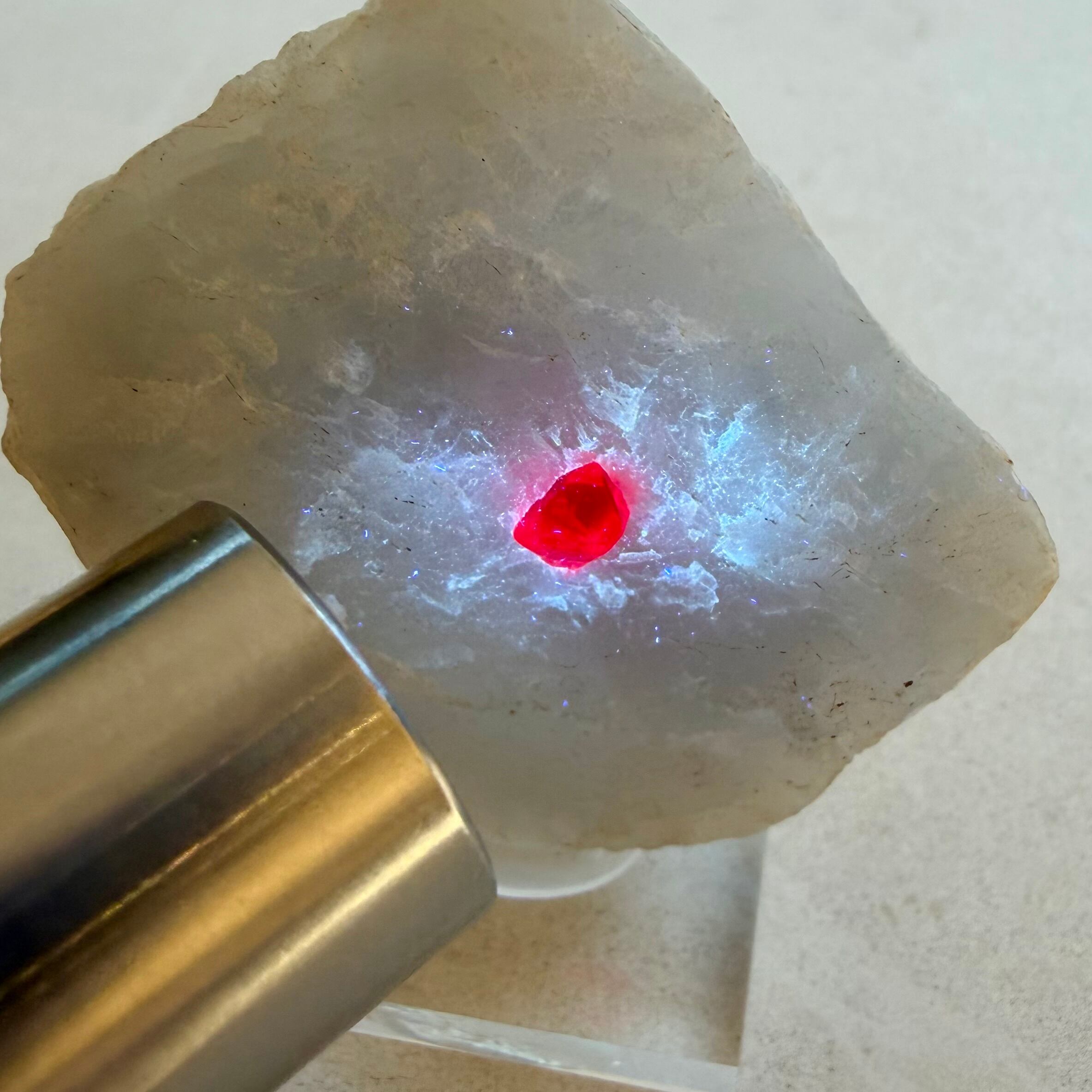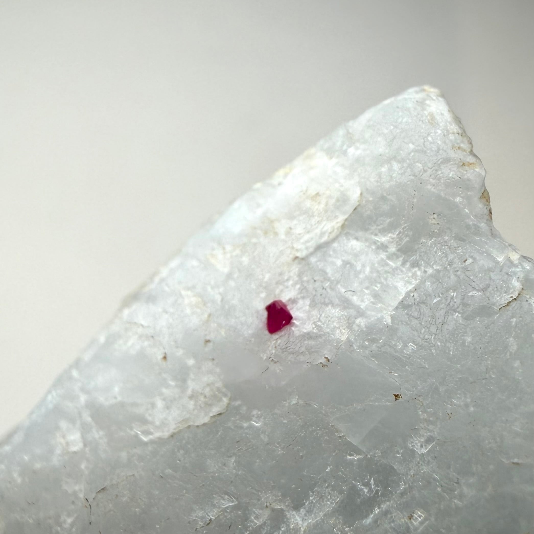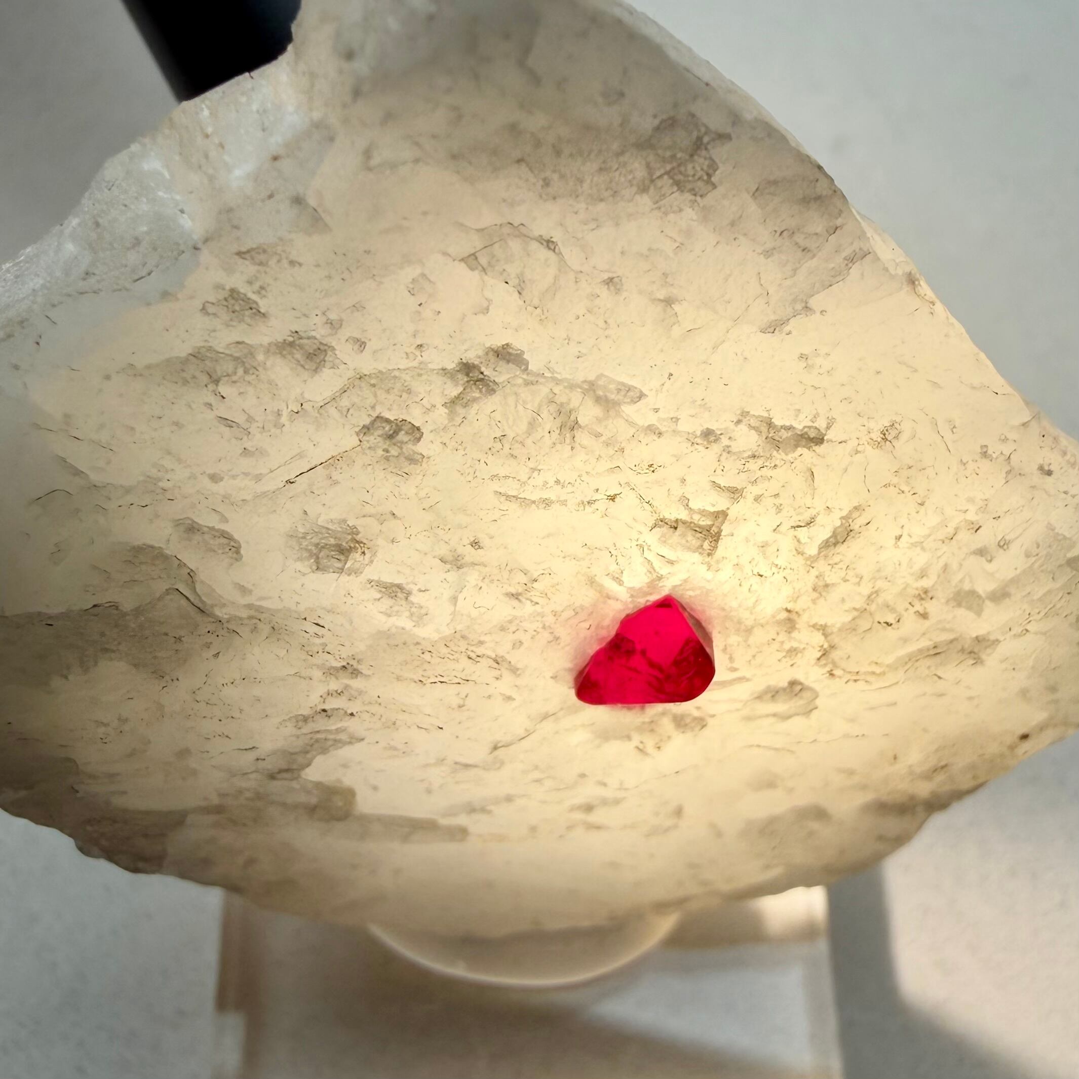 真っ白な母岩との対比が印象的な景色で、スピネルのサイズ感は小さめですが、結晶の形状、透明度、テリ、真紅の発色、その全てが揃う標本です。